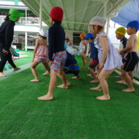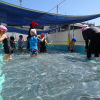 年中さんのプール遊びが始まりました。今日は小雨が降り水温も低かったので、年中さんのプール遊びは時間を短縮して実施しました。アヒルさん歩きやうさぎさん歩きをしたり、友達と水かけしたりして遊びました。7月15日(火)までプー …