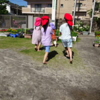 年少々ちゅうりっぷ1組さんの初めての水遊びが始まりました。今日(6月5日)は夏を思わせるような快晴。朝からちゅうりっぷ組さんは水着に着替え、水遊びの準備をしました。ホースで水をかけられたり、容器に入れた水をかけっこしたり …