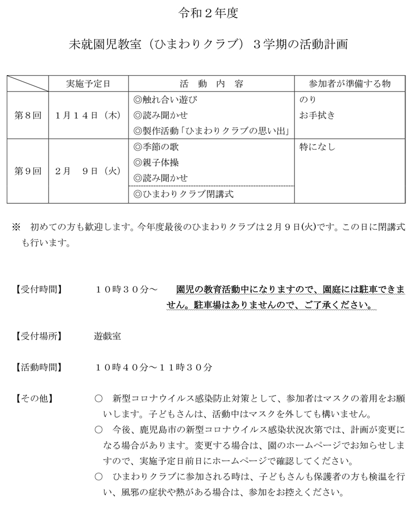 未就園児教室(ひまわりクラブ)3学期の活動計画について