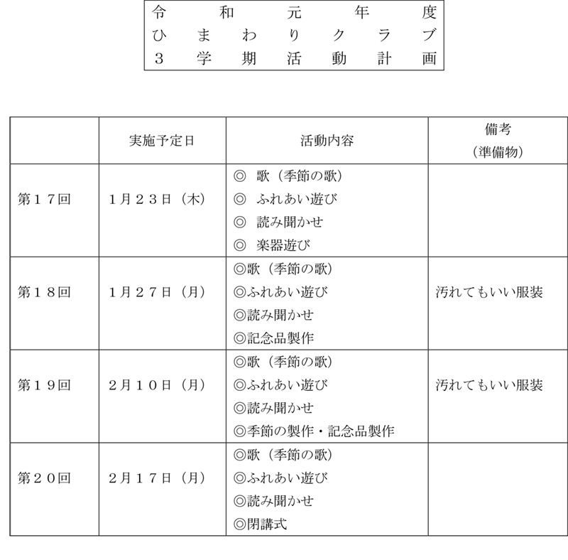 未就園児教室(ひまわりクラブ)3学期活動計画は上記のとおりです。