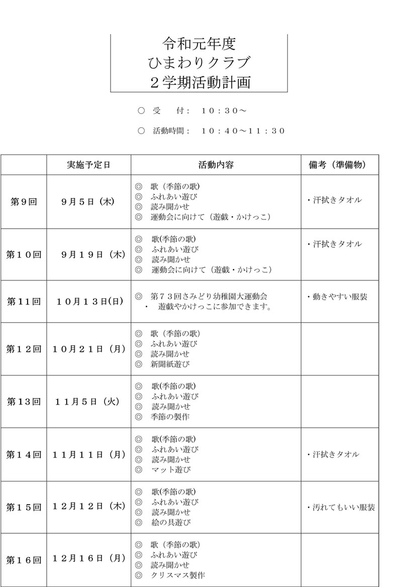 未就園児教室(ひまわりクラブ)2学期活動計画