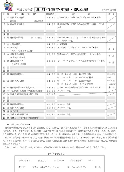 3月の行事予定表・献立表