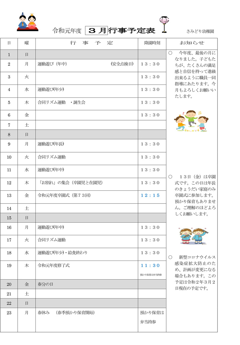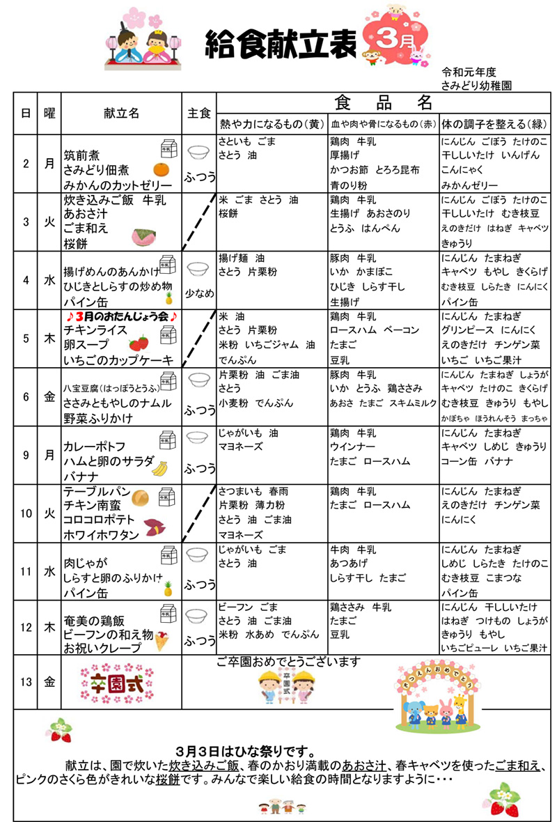 3月の行事予定表・献立表