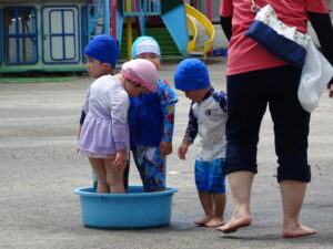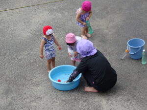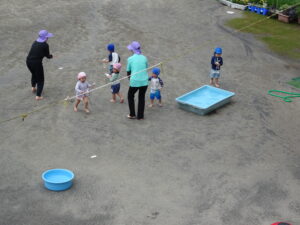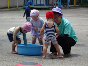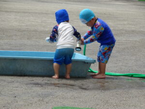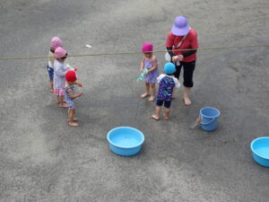 6月12日(金)は朝は強い雨が降り、今日の水遊びは中止かなと思っていると、急に晴れ間が覗く天気に急変。ちゅうりっぷ2組さんの園庭での水遊びができるようになりました。2組だけの水遊びでたっぷり水遊びができました。