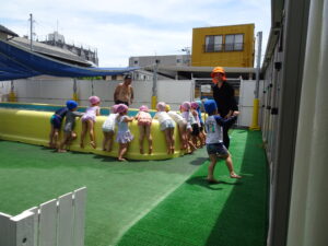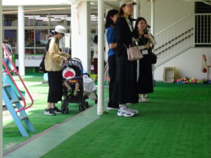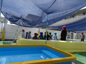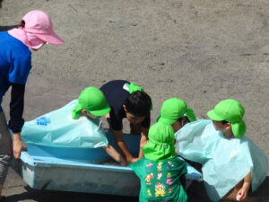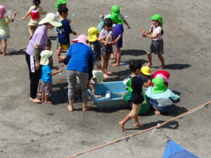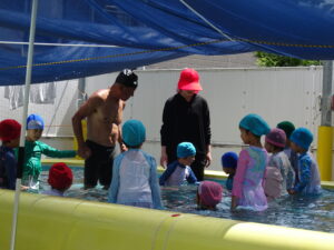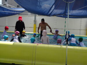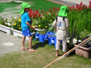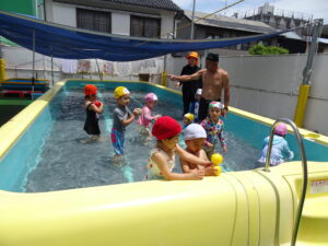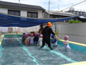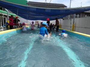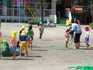 プール遊びを始める朝、その日の気温とプールの水温を測定することになっています。水温と気温の合計が50以上だとプール遊びには最適の時間になります。50に届かないときは、プール遊びの時間を短縮したり、中止にしたりしなければなりませんが、今日みたいな最適な日には30分泳ぐことができます。今日は、年長うめ組さんと年少のすみれ組さんのプールでした。園庭でも水遊びが行われています。