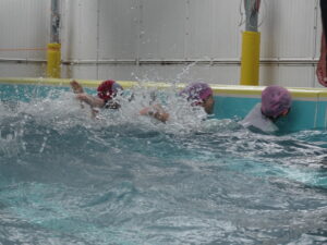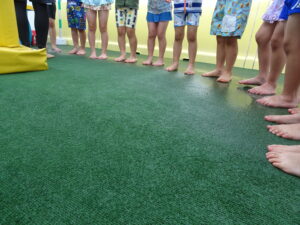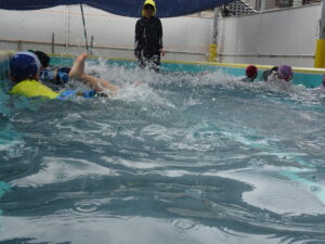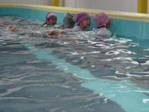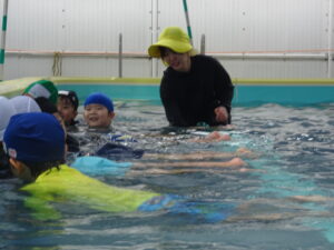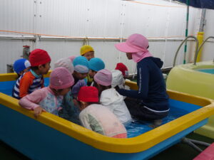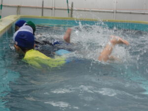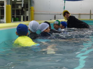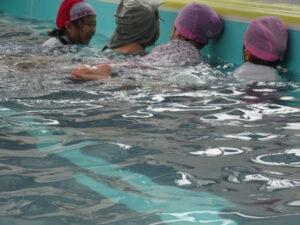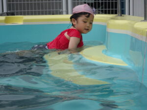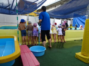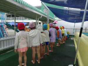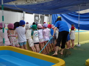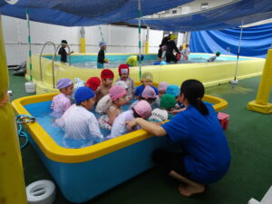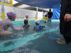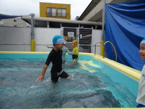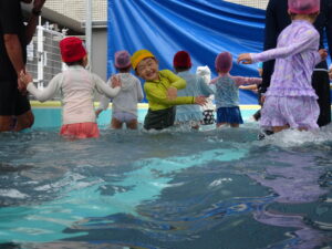 少し小雨が降る中、年中組さんの3回目のプール遊びがありました。だいぶ水にもなれ、顔を水につけたり水かけっこをしたりとはしゃぐ子どもの姿がありました。保護者の方も参観もありました。