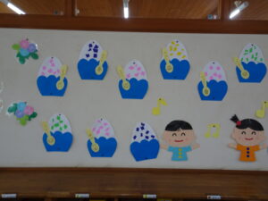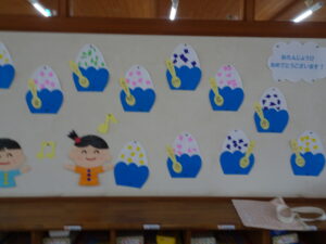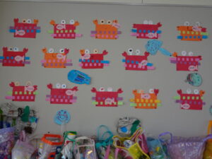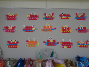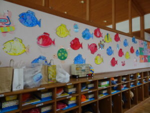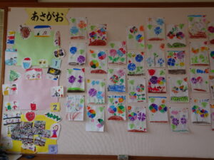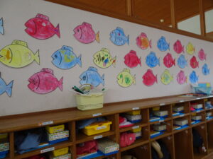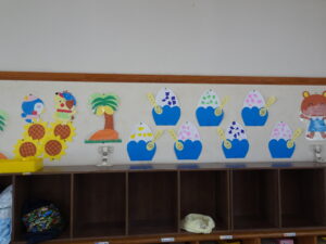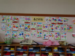 7月の壁面が出来上がりました。年少々さんはかき氷、年少さんはお魚、年中さんはかに、年長さんは朝顔絵のです。教育参観の時に詳しくはご覧ください。