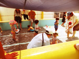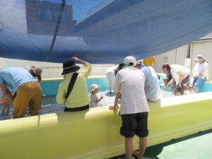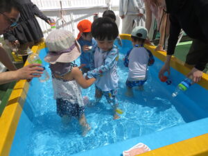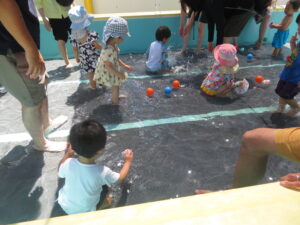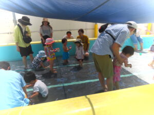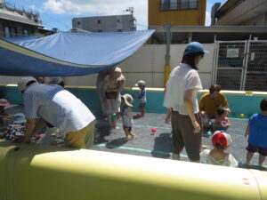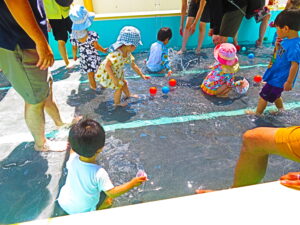 7月30日(水)、第4回ひまわりクラブが開かれました。今回は水遊びの活動です。保護者や先生、お友達と一緒に水遊びを楽しみました。今日は17組のお友達が参加され、プールの中は、にぎやかな水遊びになりました。また、皆さんが育てているさつまいもも大きく生長しています。次は、8月6日(水)に2回目の水遊びがあります。初めの方もどうぞご参加ください。