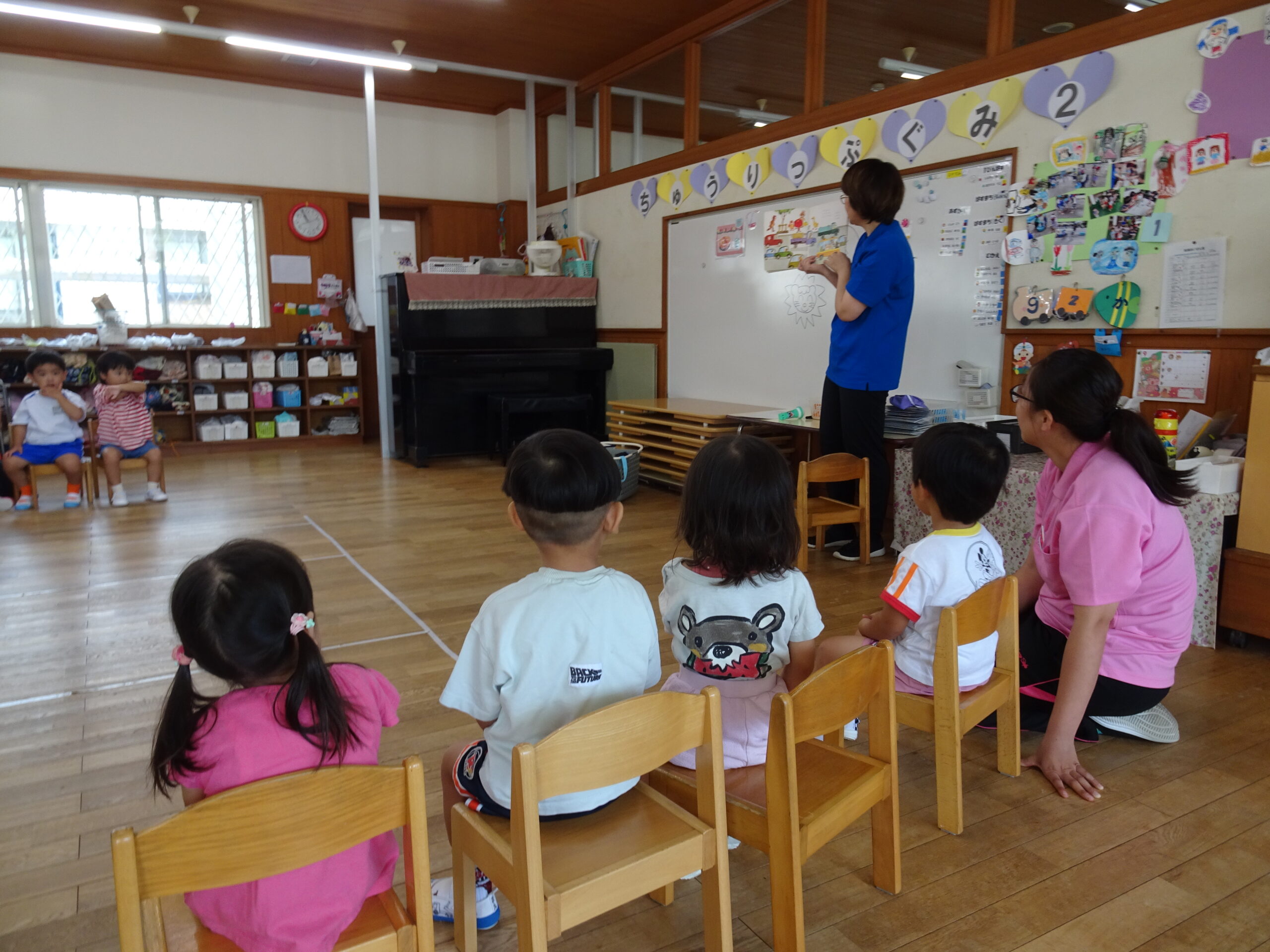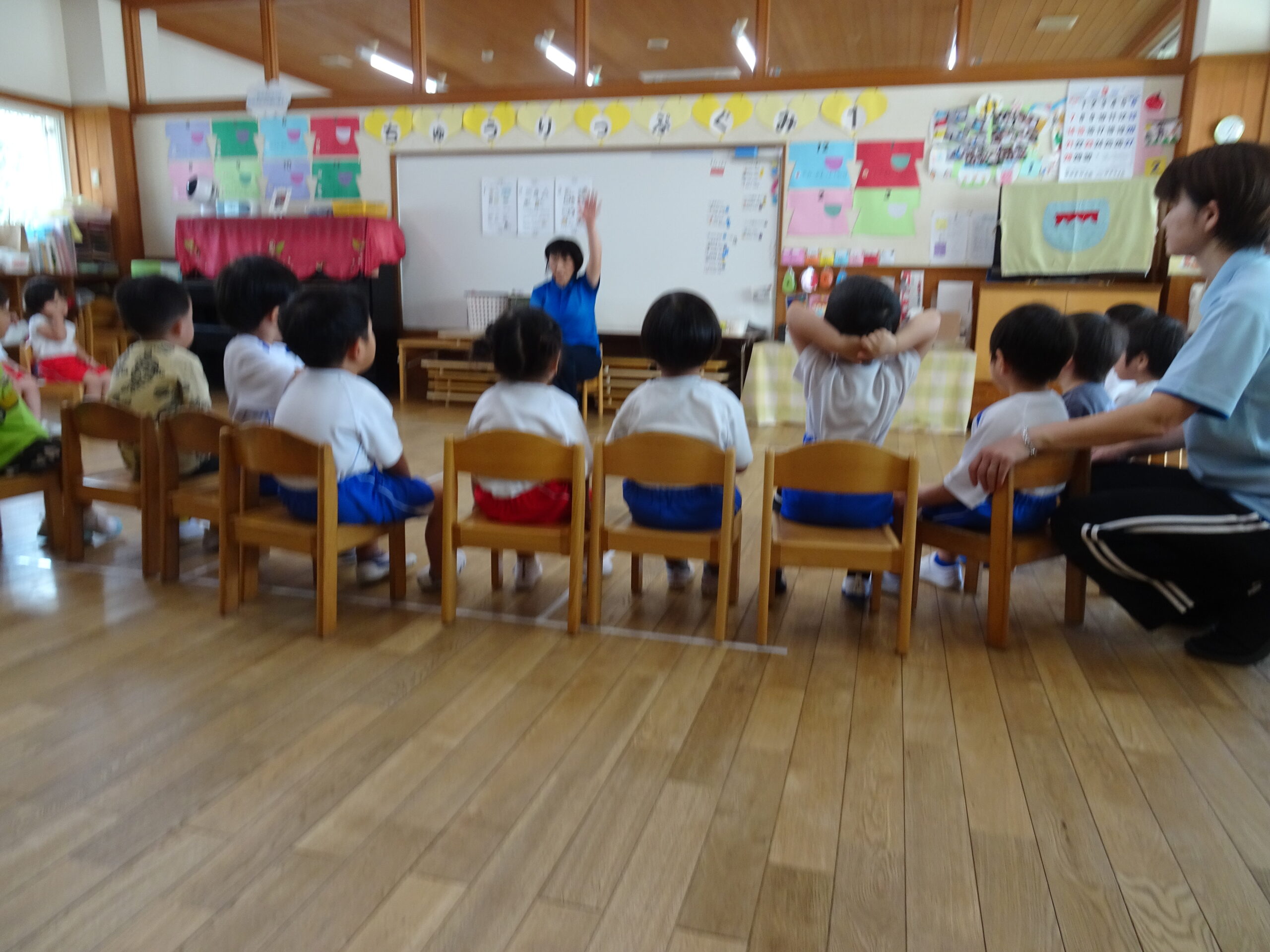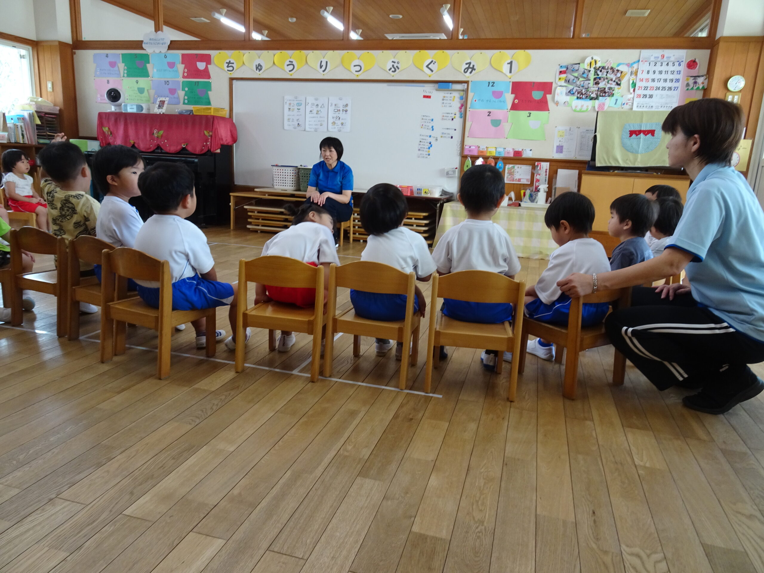年少々・ちゅうりっぷ組さんの2日目(火)です。先生のお話を聞いている様子です。お話しの中身は、2組は絵本のお話しや歌、1組は帰りの会の後の帰り方コースについてでした。