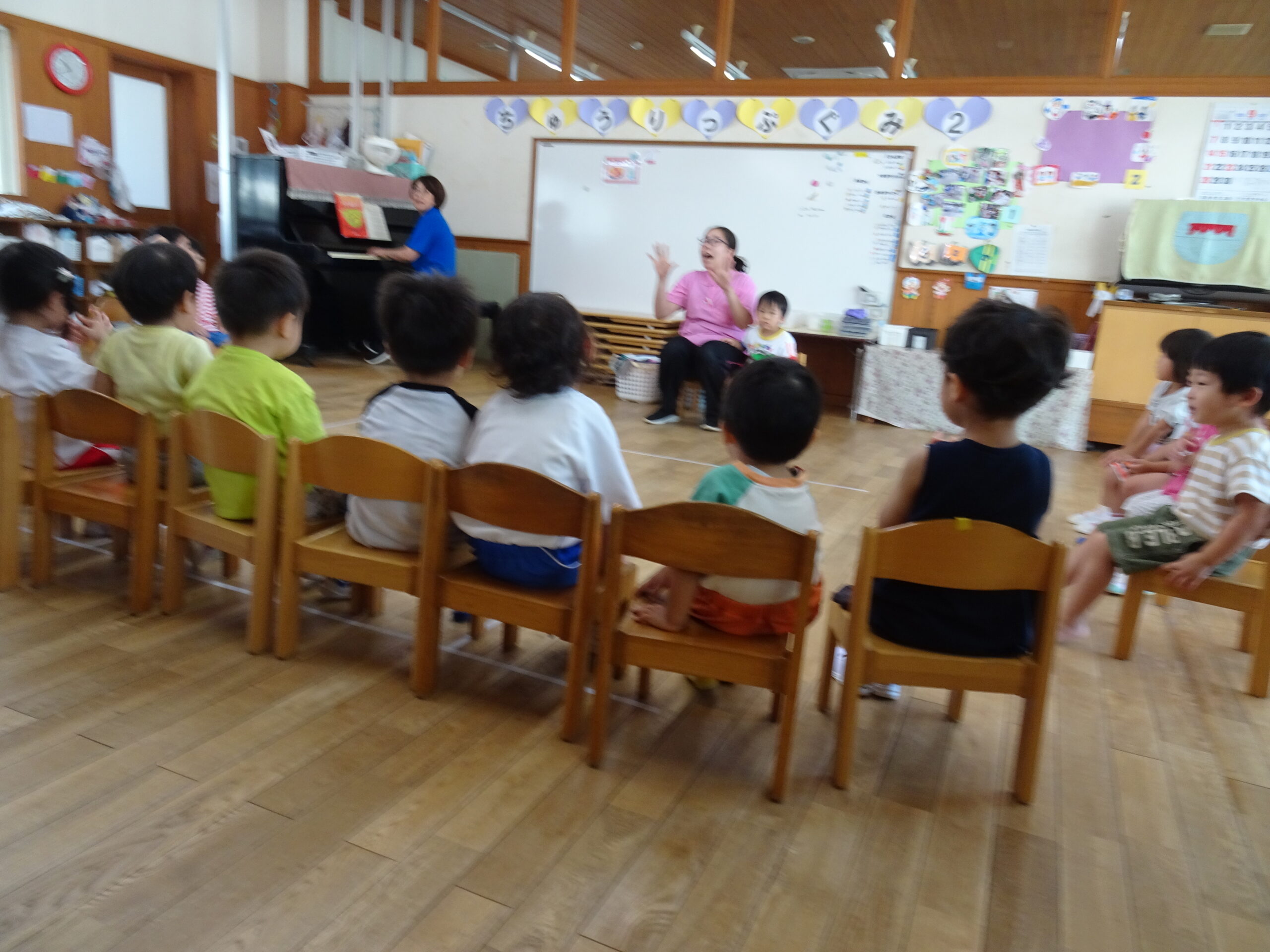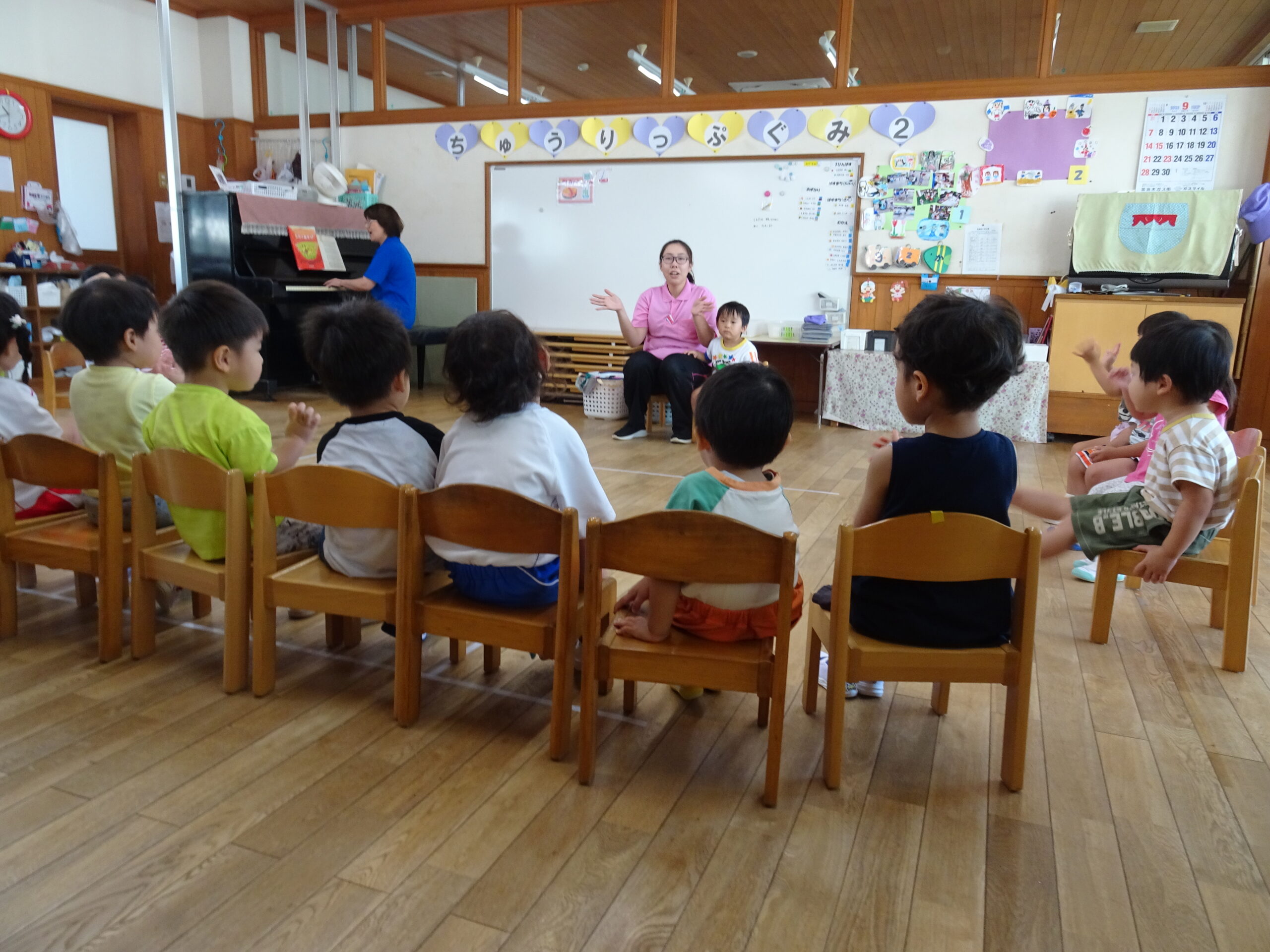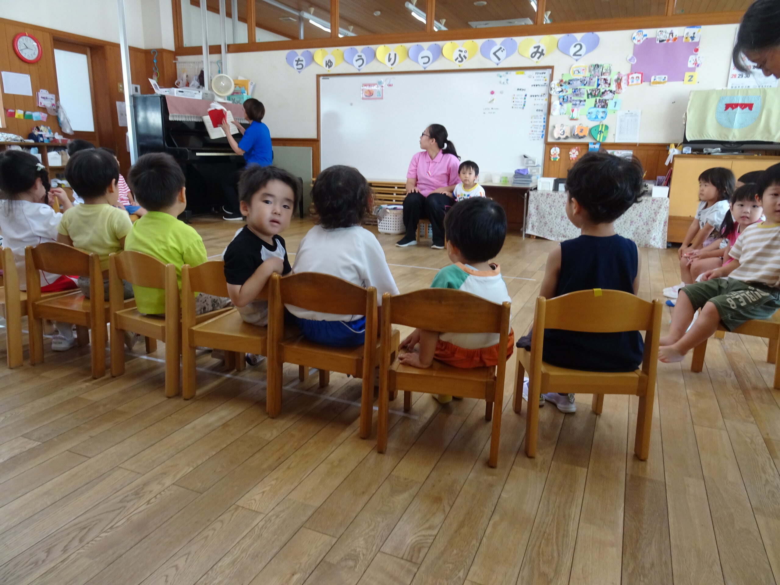 年少々・ちゅうりっぷ組さんの2日目(火)です。先生のお話を聞いている様子です。お話しの中身は、2組は絵本のお話しや歌、1組は帰りの会の後の帰り方コースについてでした。