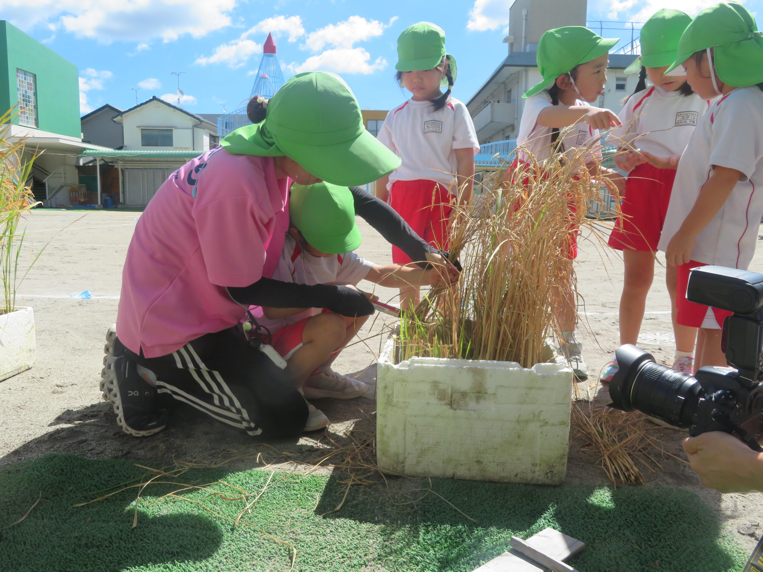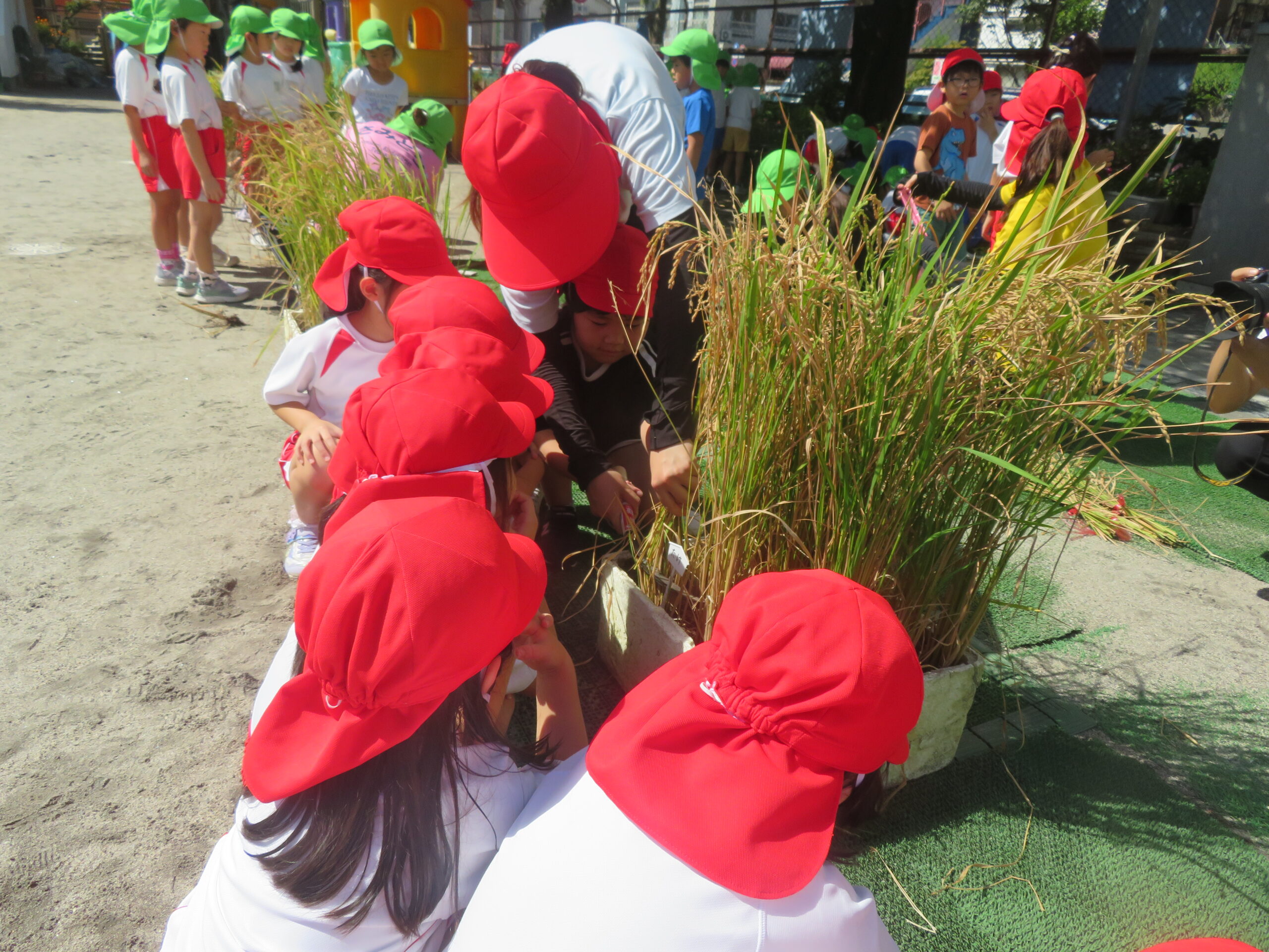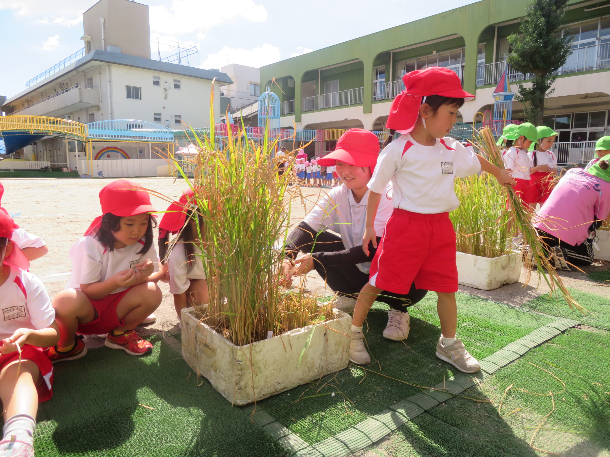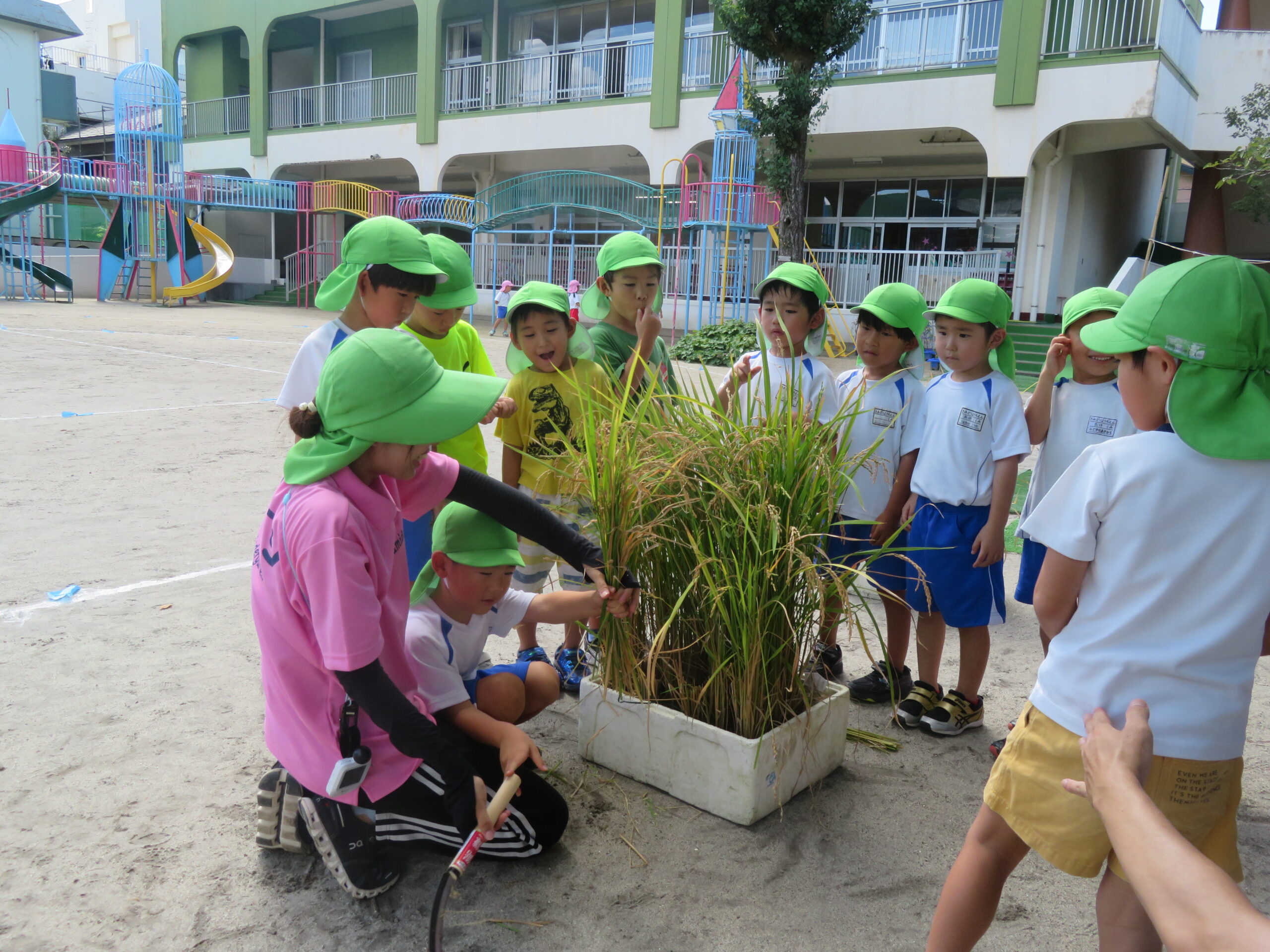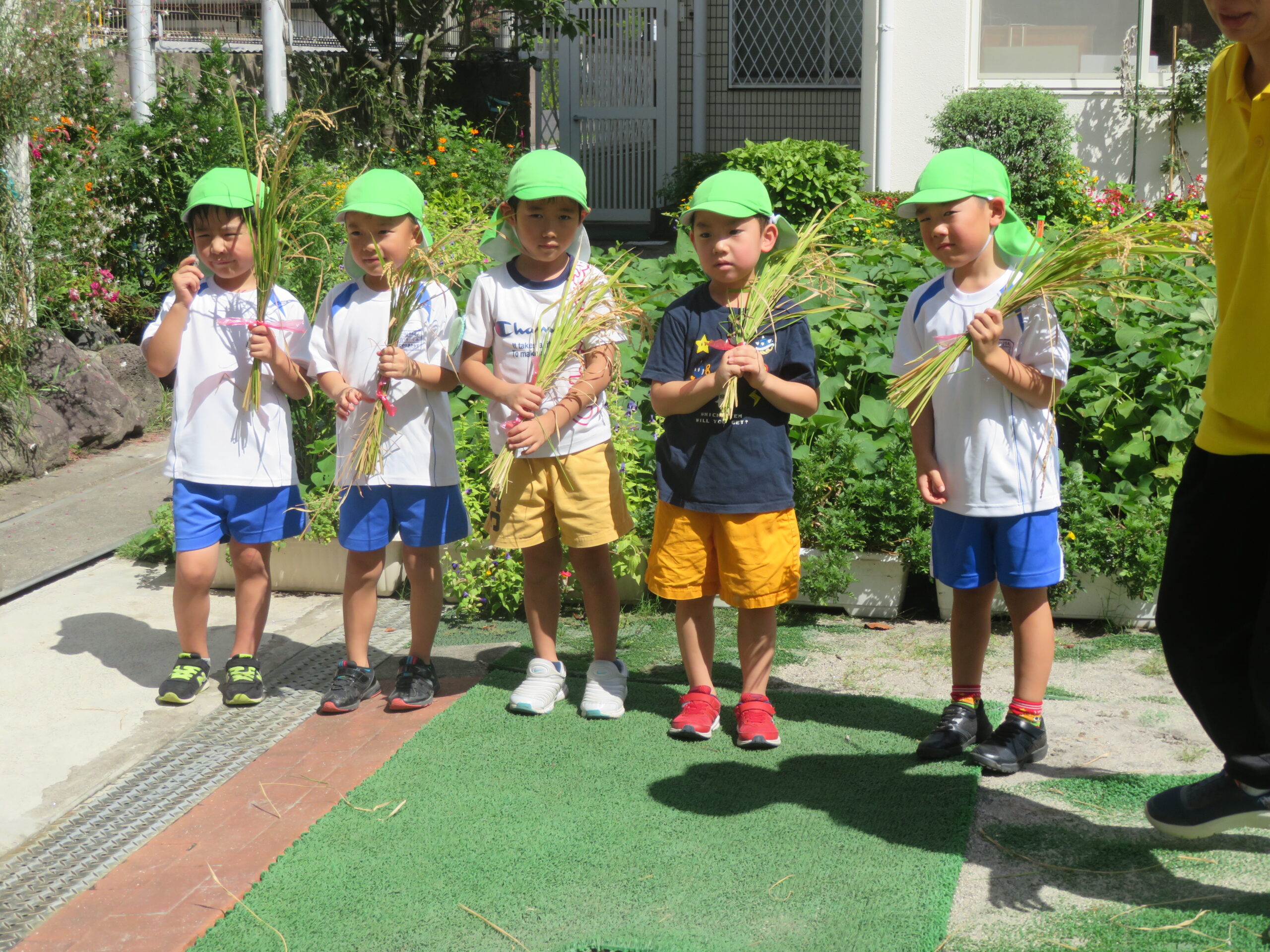 年長さんが5月7日(水)に田植えした稲が実り、今日、稲刈りをしました。田植えから4ヶ月経っています。各クラス、3箱ずつを先生と子どもたちが鎌で刈り取りました。刈り取った稲は、この後、日干し、脱穀と続きます。