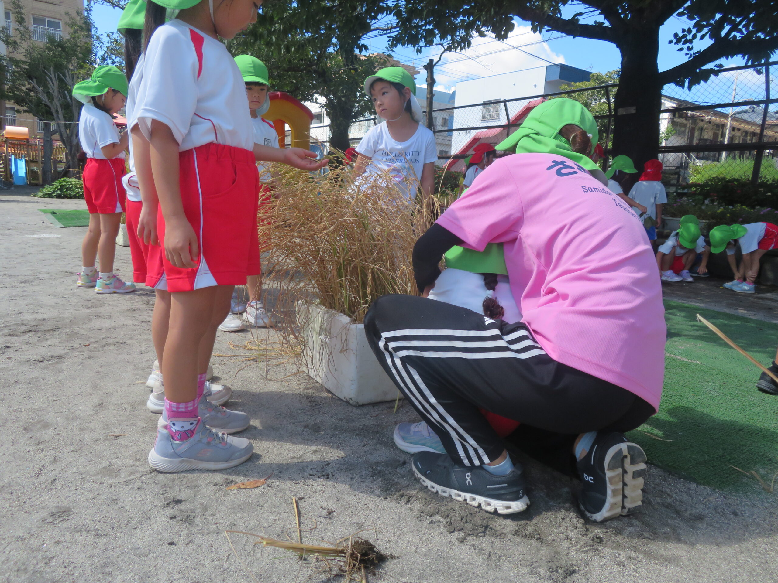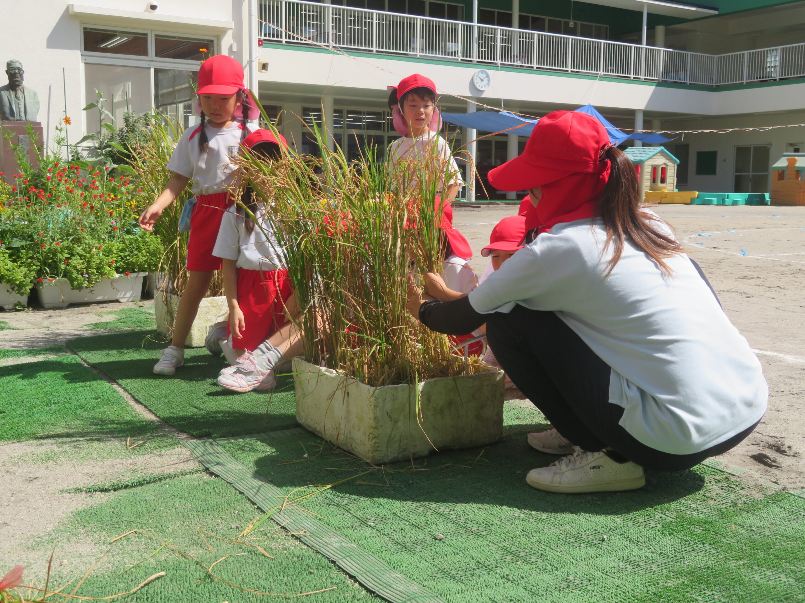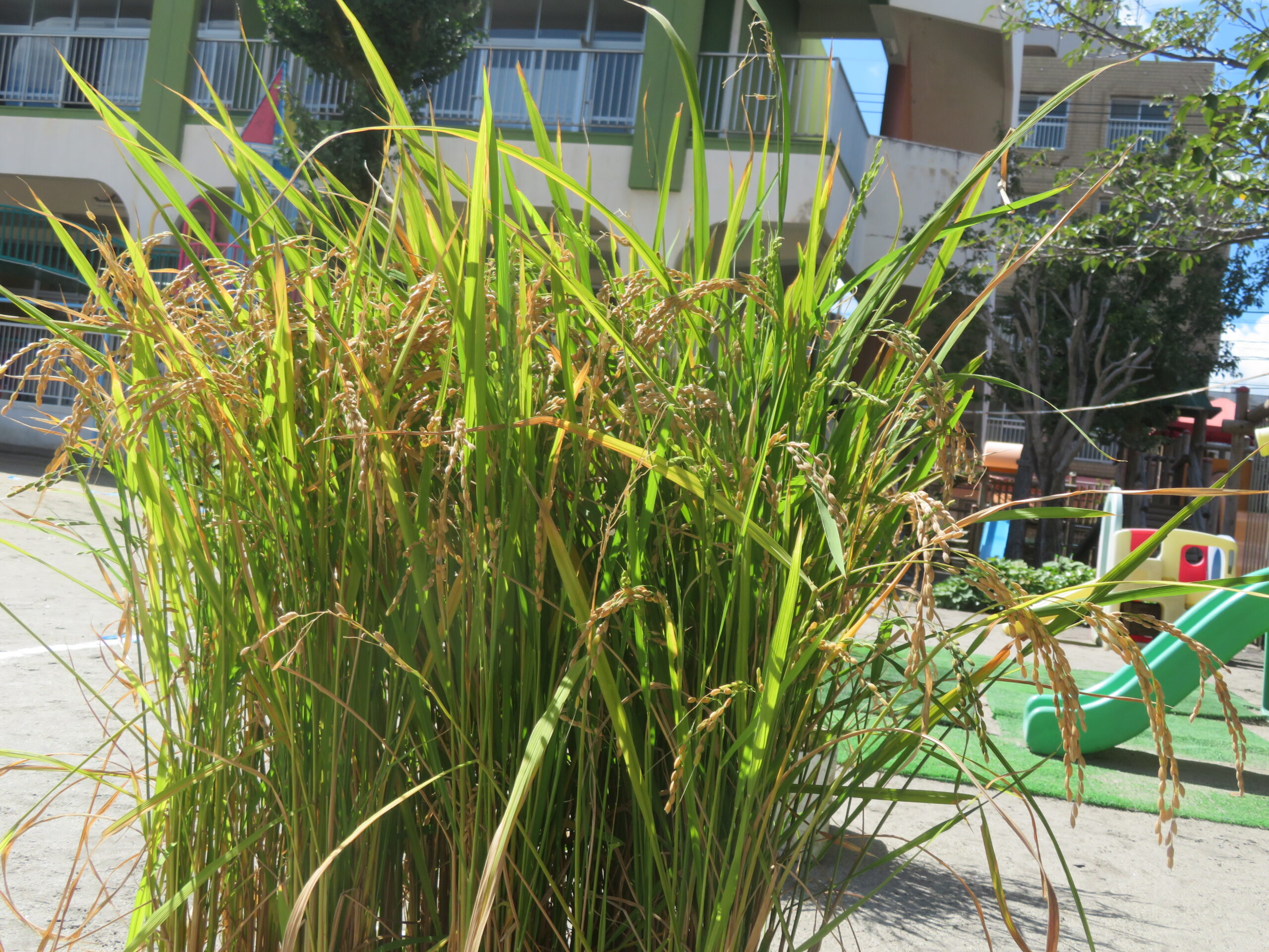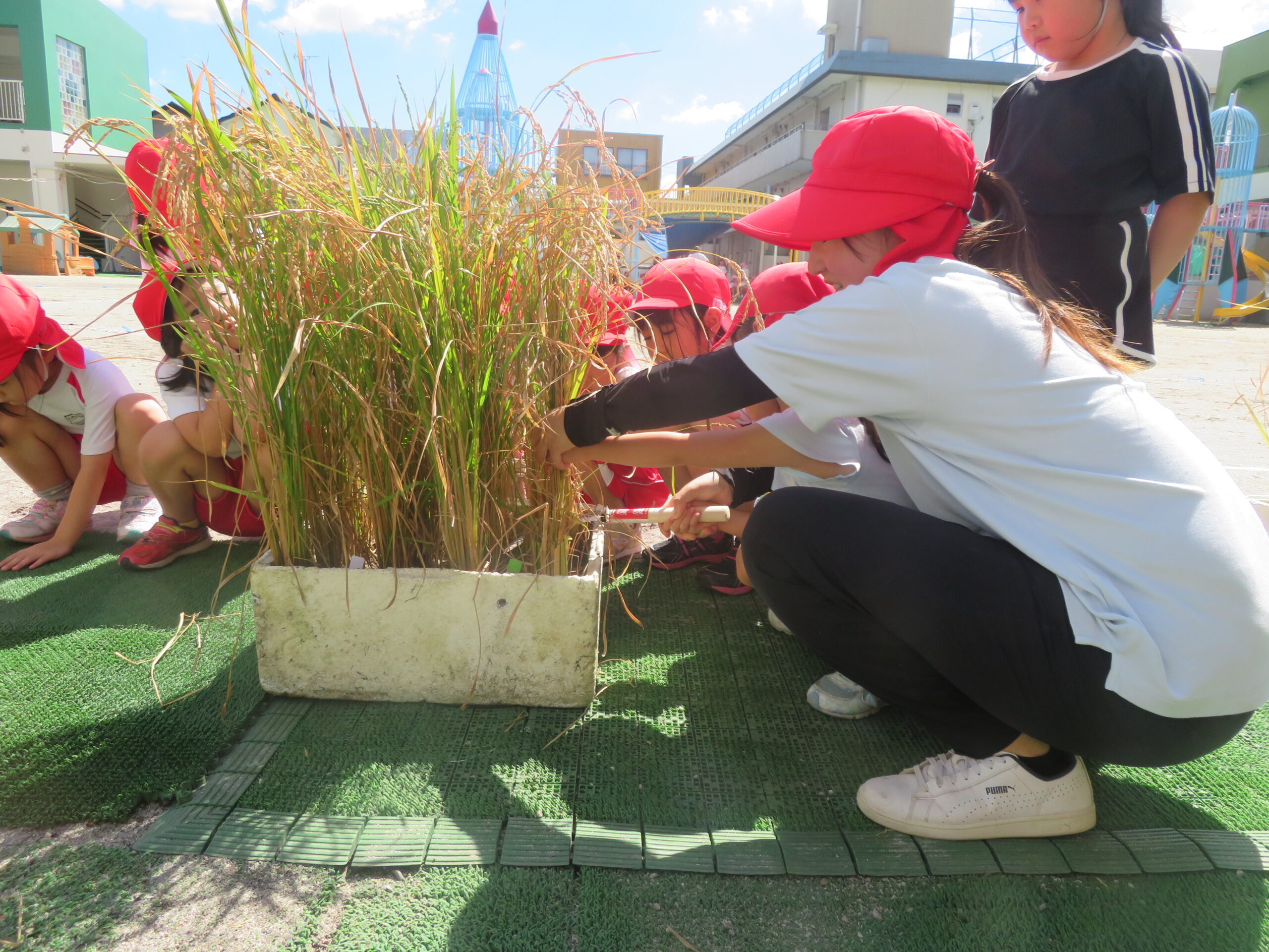年長さんが5月7日(水)に田植えした稲が実り、今日、稲刈りをしました。田植えから4ヶ月経っています。各クラス、3箱ずつを先生と子どもたちが鎌で刈り取りました。刈り取った稲は、この後、日干し、脱穀と続きます。