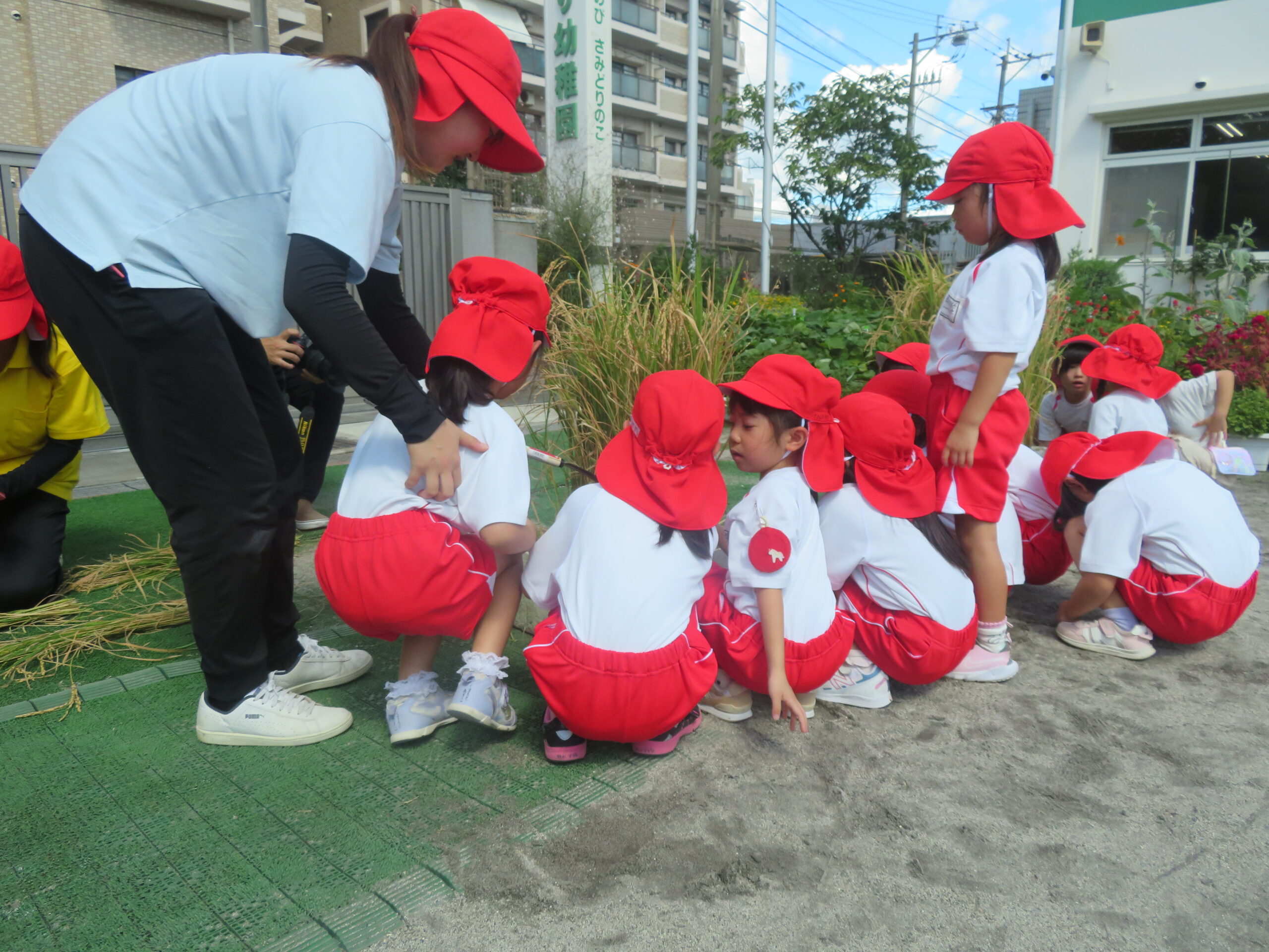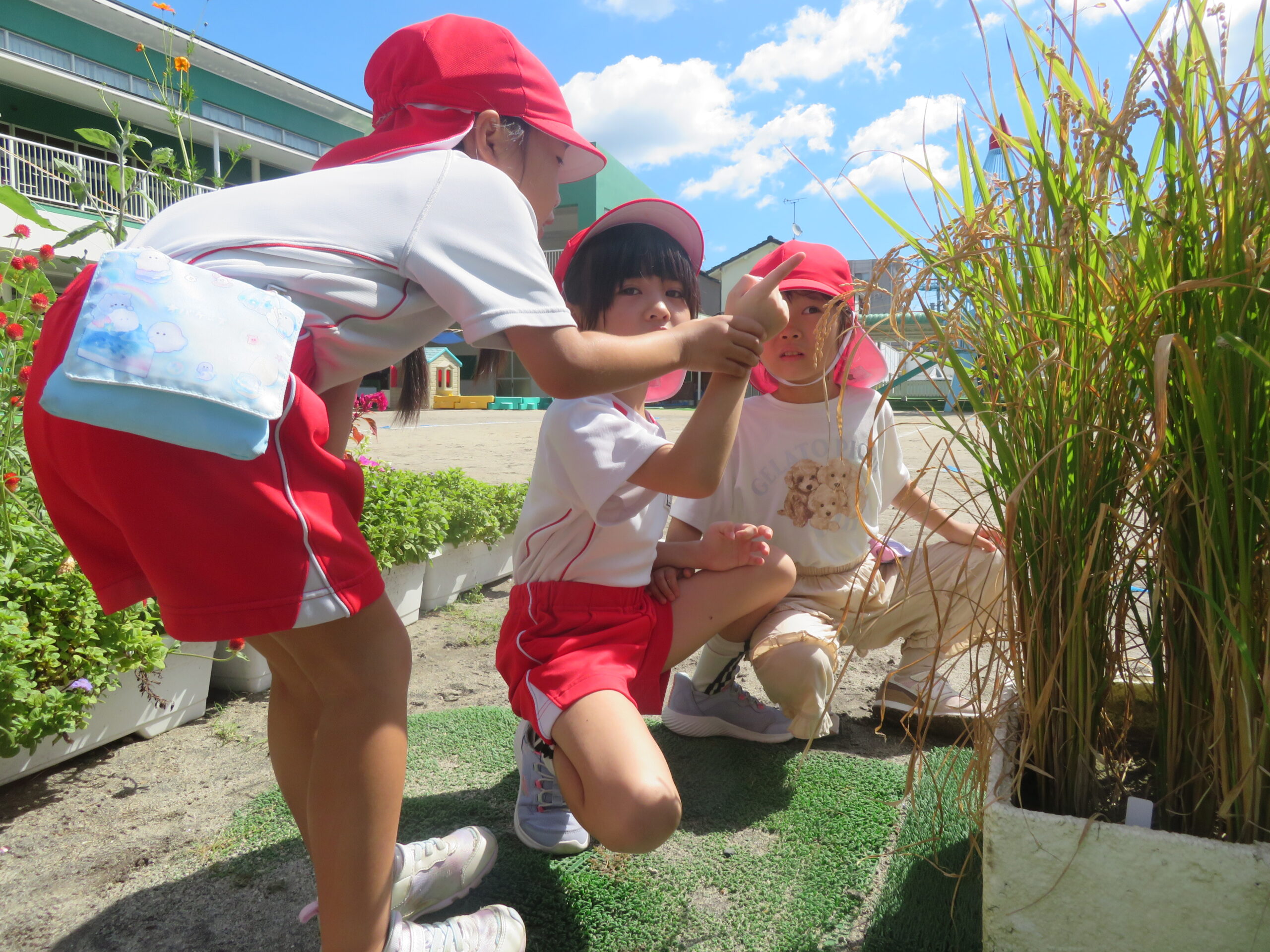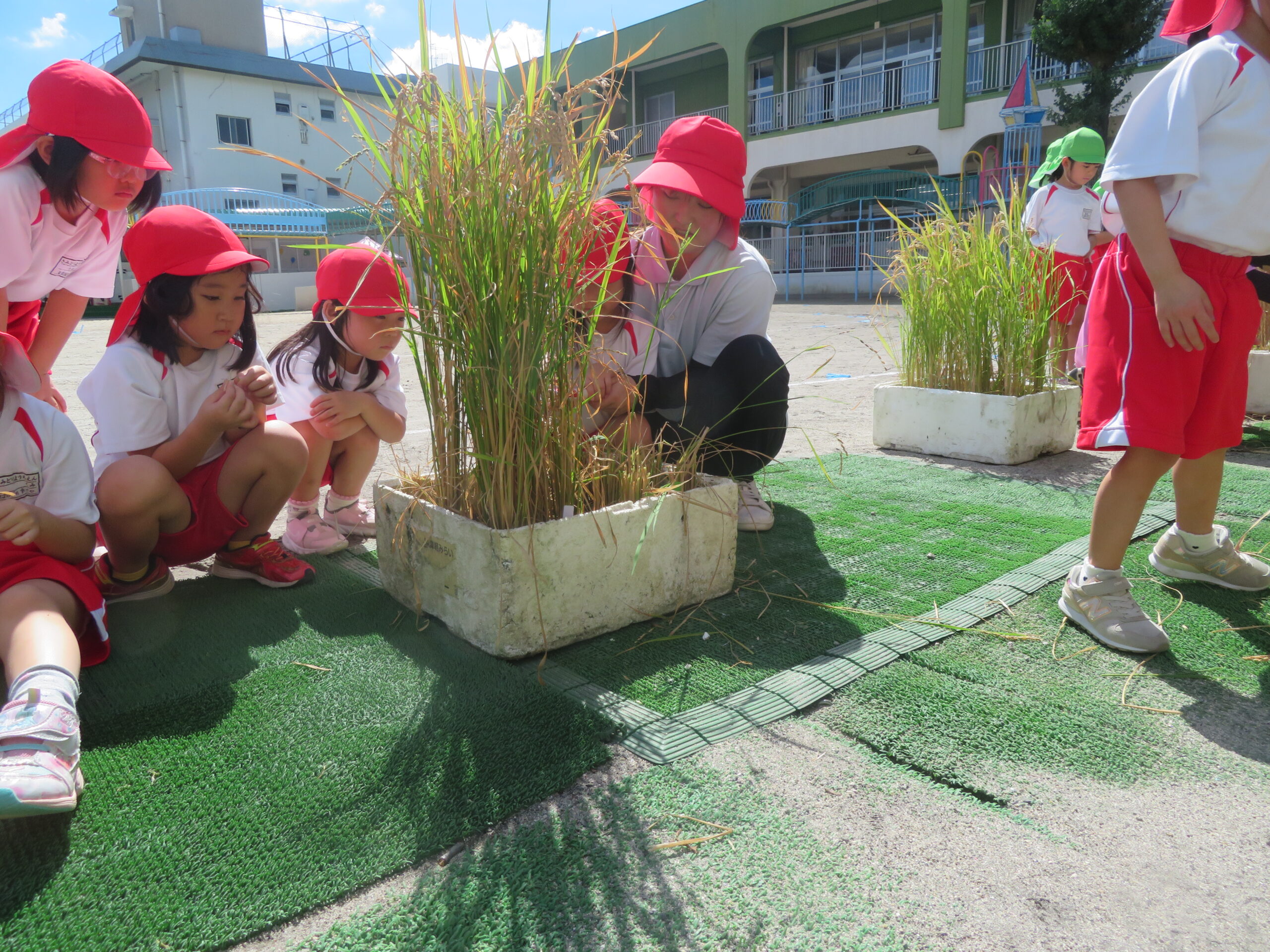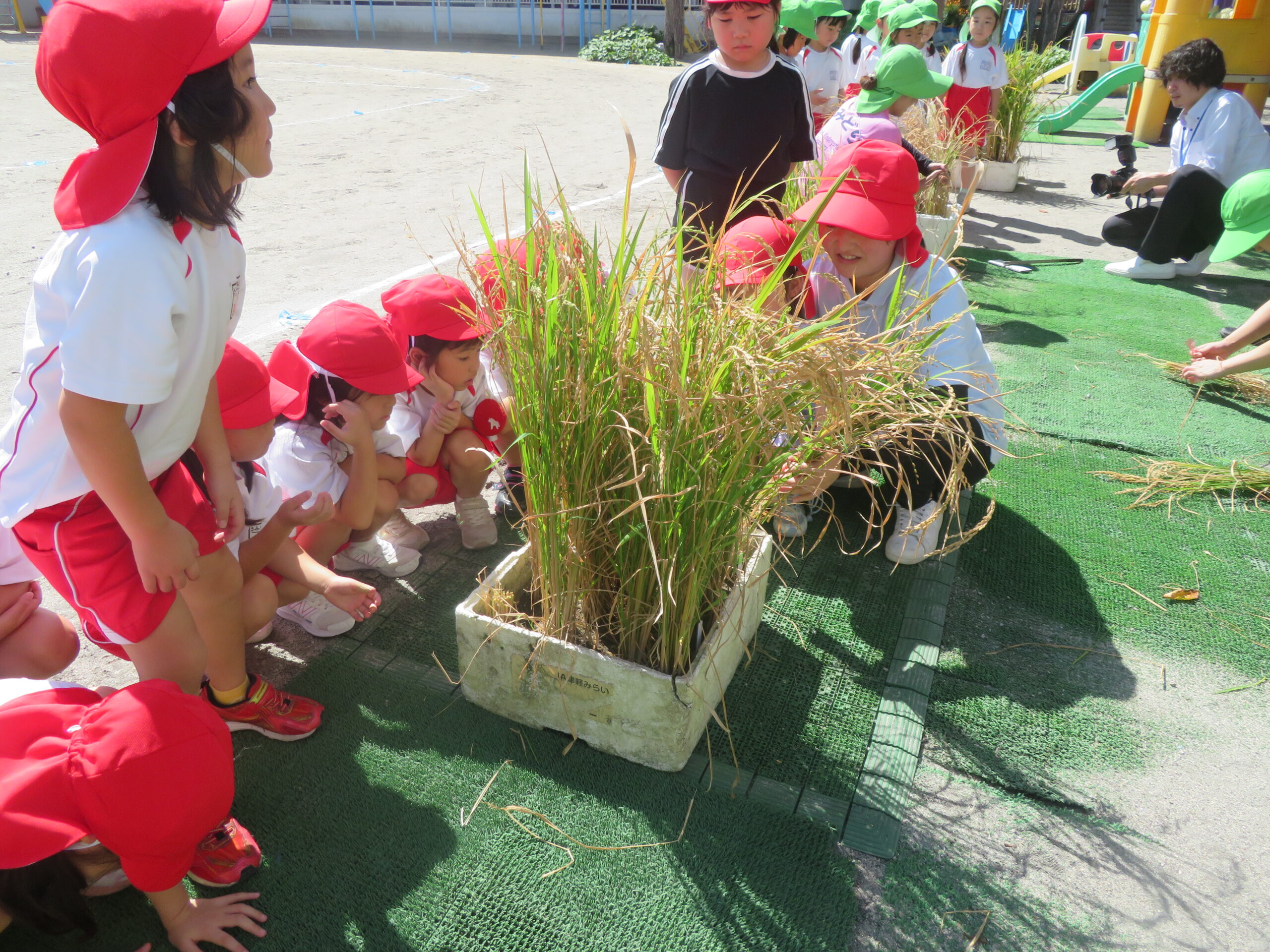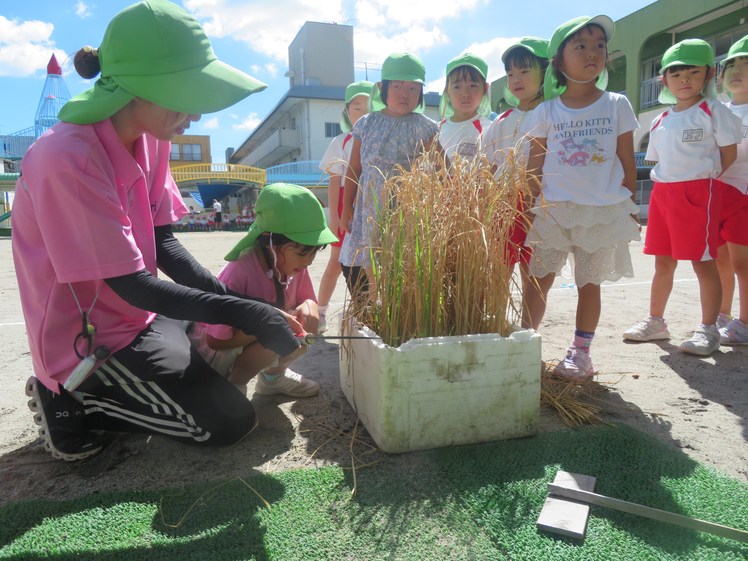 年長さんが5月7日(水)に田植えした稲が実り、今日、稲刈りをしました。田植えから4ヶ月経っています。各クラス、3箱ずつを先生と子どもたちが鎌で刈り取りました。刈り取った稲は、この後、日干し、脱穀と続きます。
