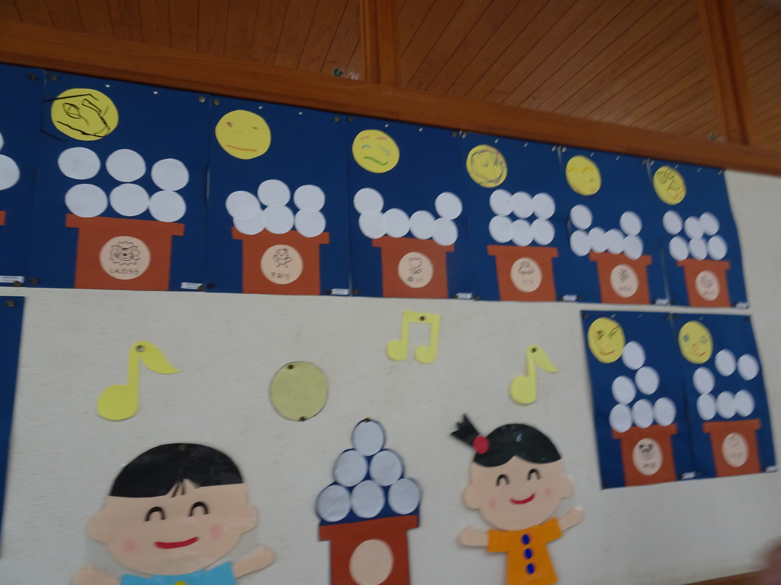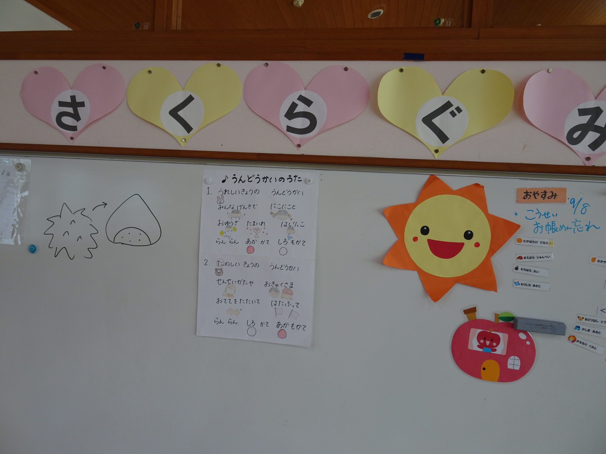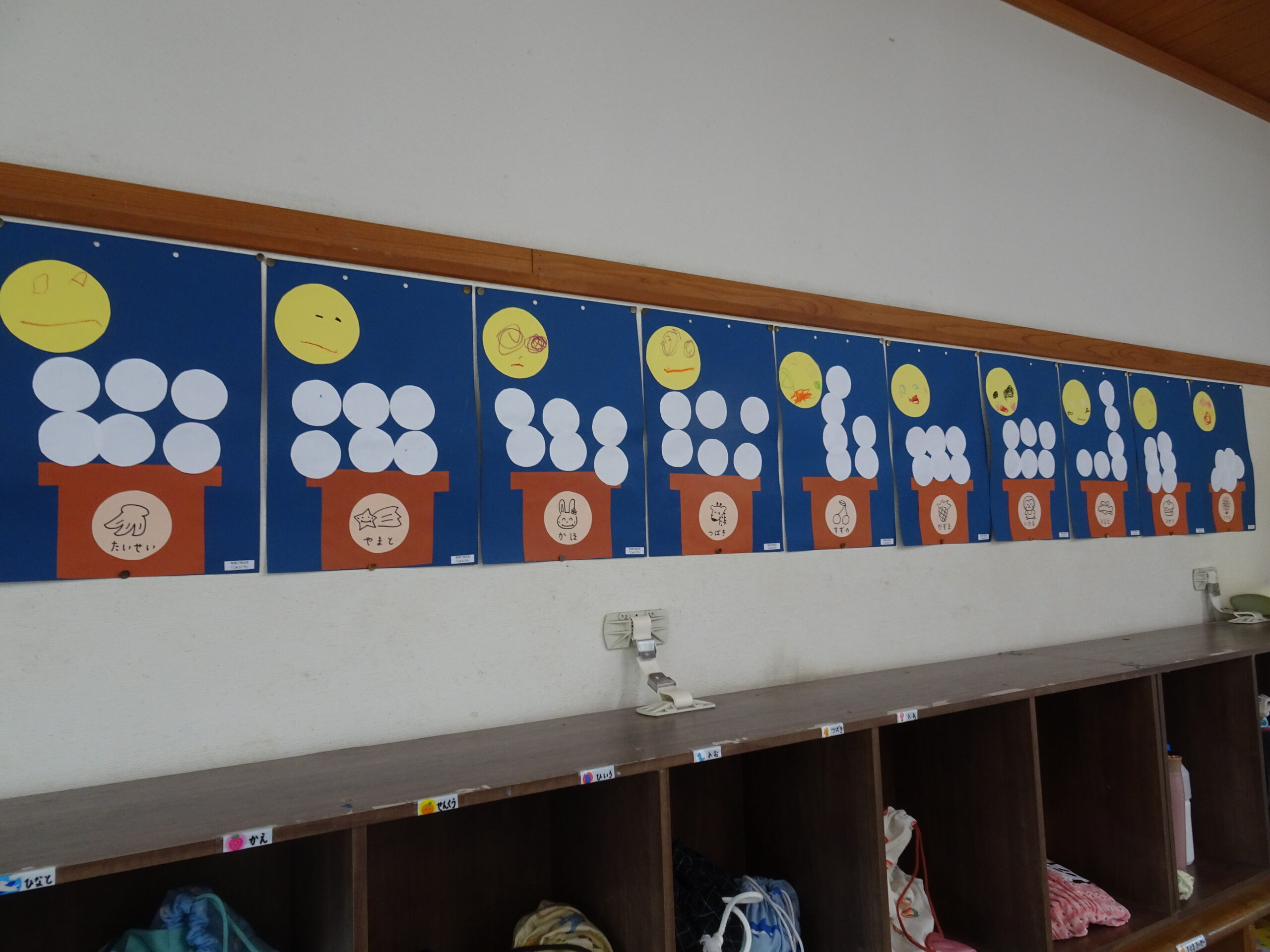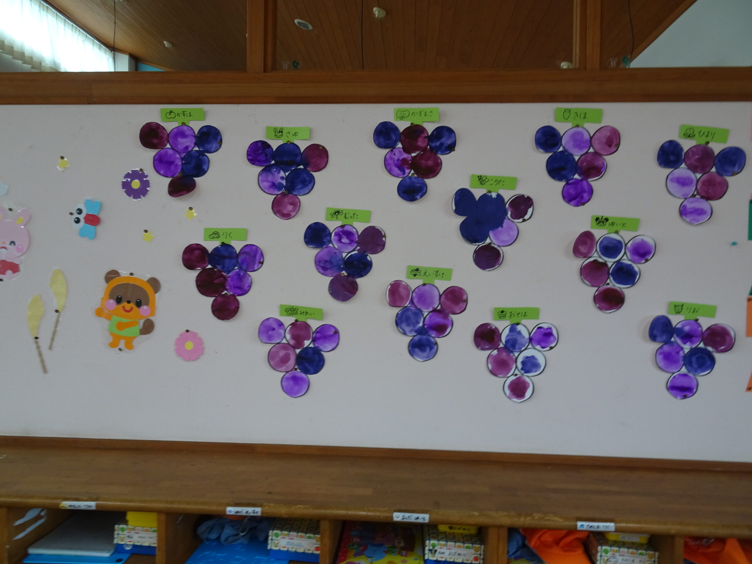 9月の各教室の壁面です。9月は、稲刈り、園内いも掘りなど実りの秋、祖父母との触れ合い会、吉野降園への園外保育など秋の季節にちなんだ壁面も見られます。
