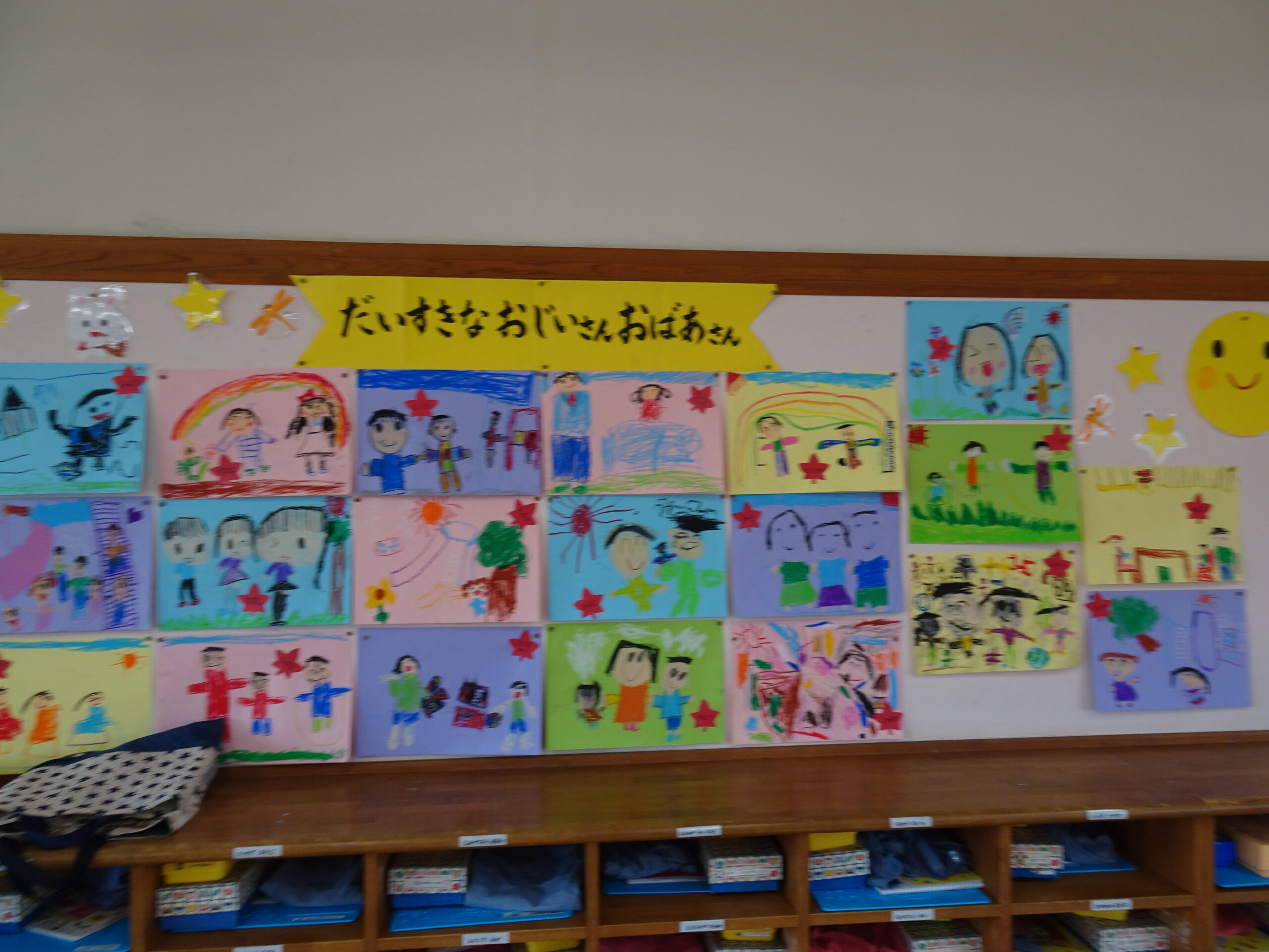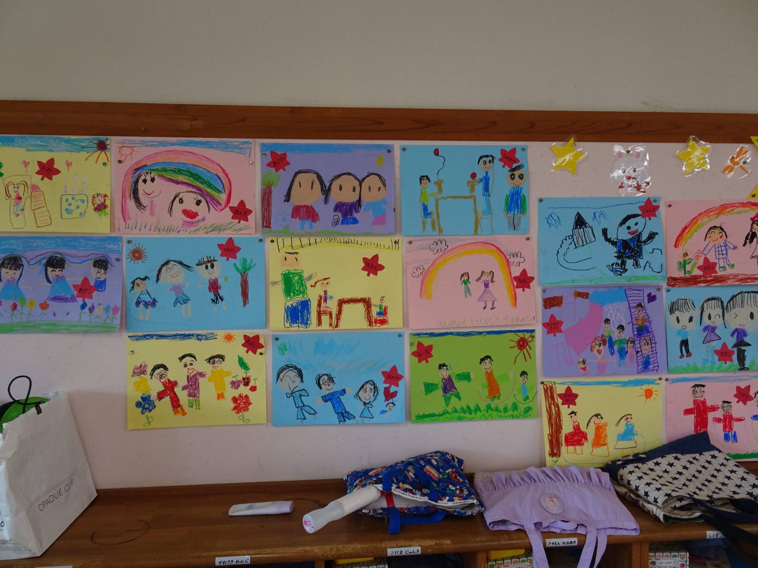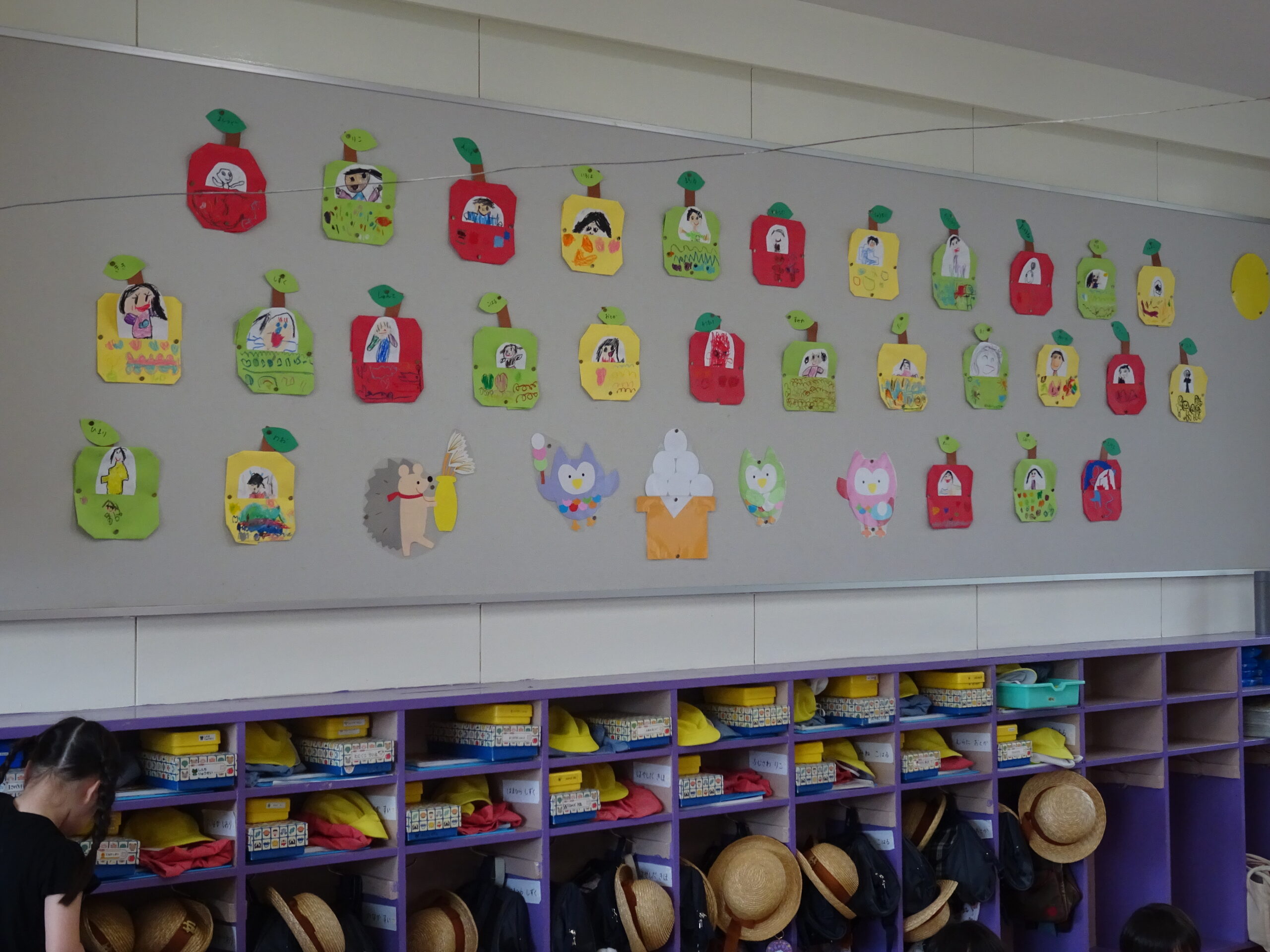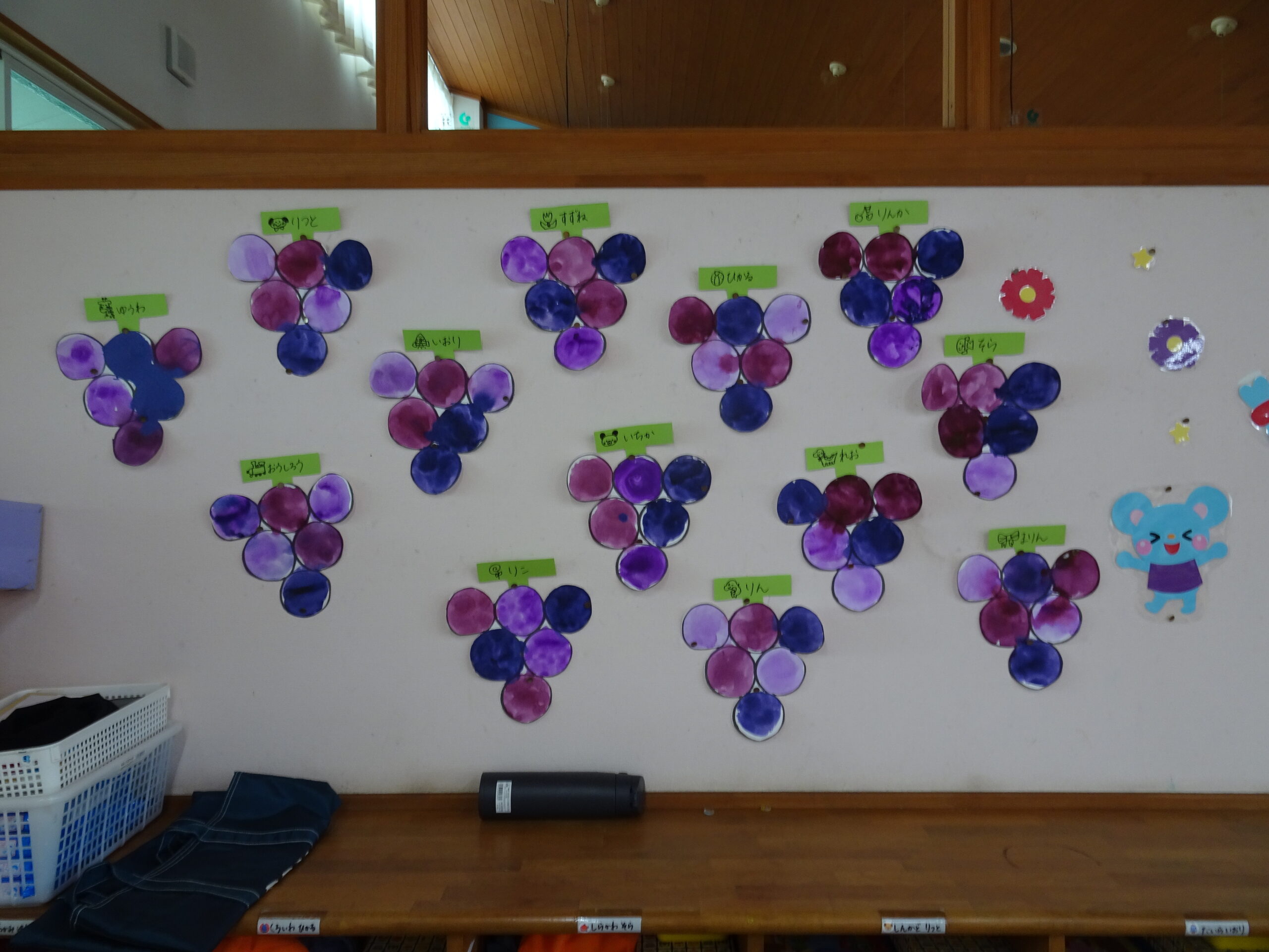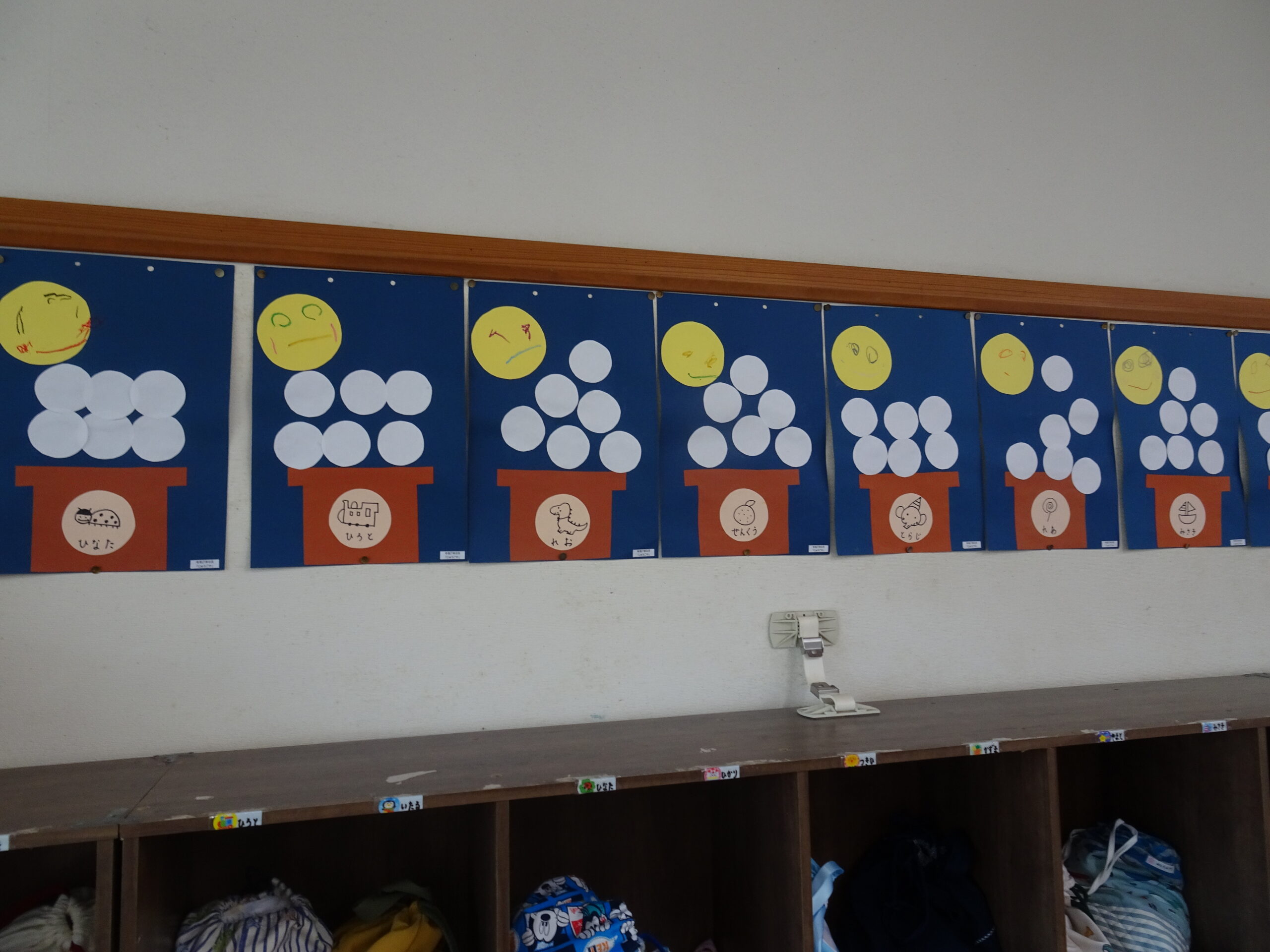9月の各教室の壁面です。9月は、稲刈り、園内いも掘りなど実りの秋、祖父母との触れ合い会、吉野降園への園外保育など秋の季節にちなんだ壁面も見られます。
