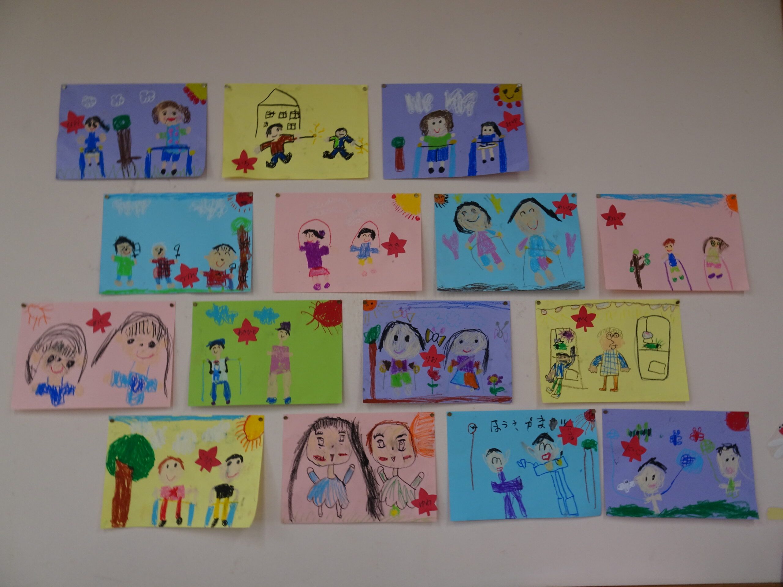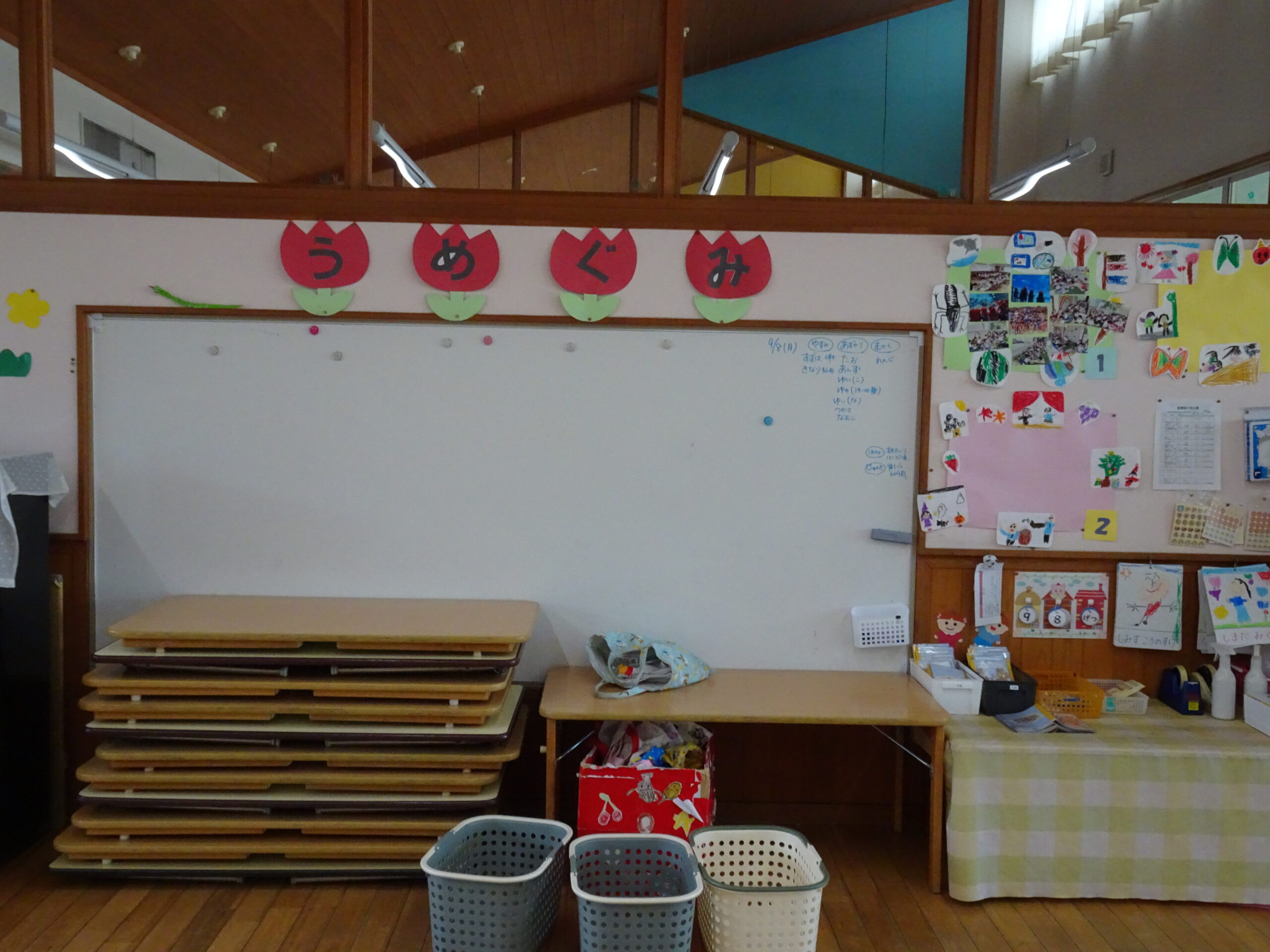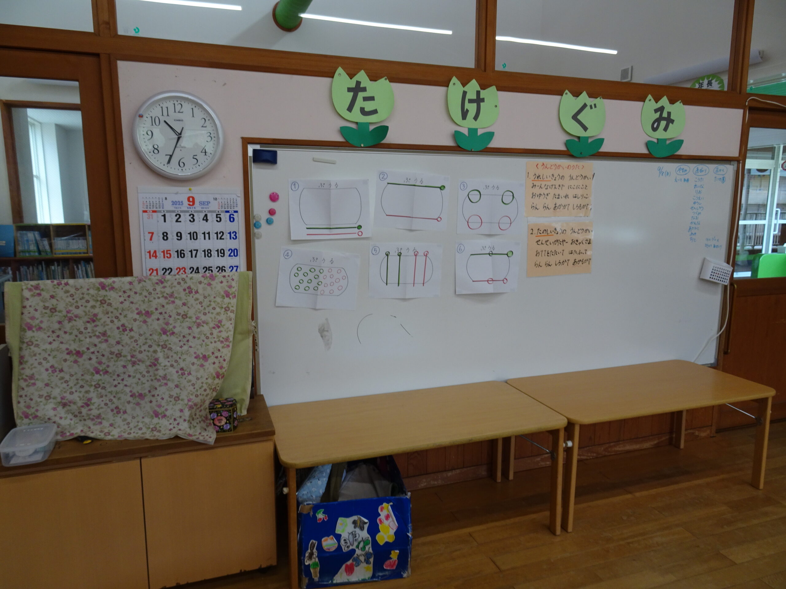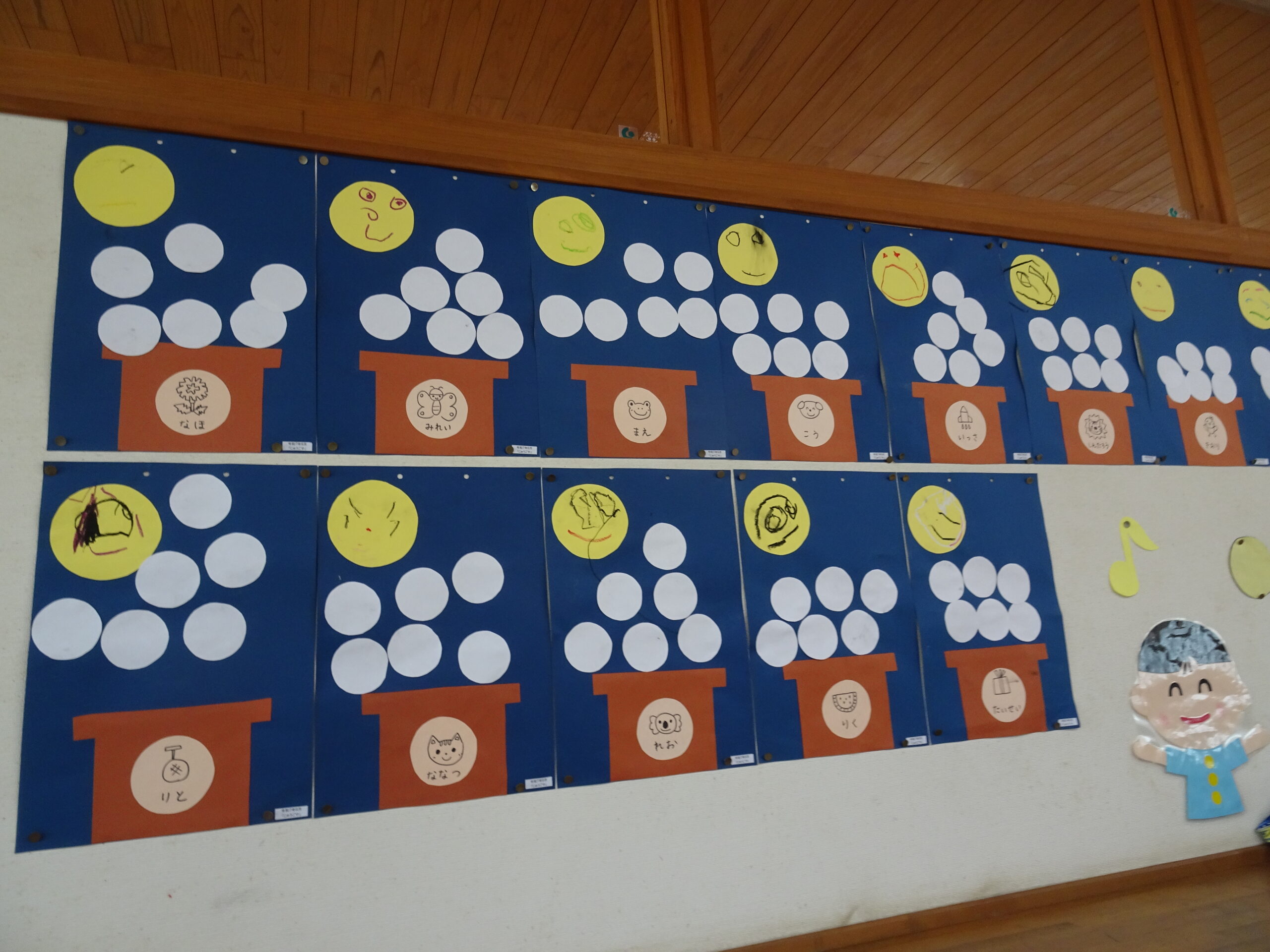 9月の各教室の壁面です。9月は、稲刈り、園内いも掘りなど実りの秋、祖父母との触れ合い会、吉野降園への園外保育など秋の季節にちなんだ壁面も見られます。