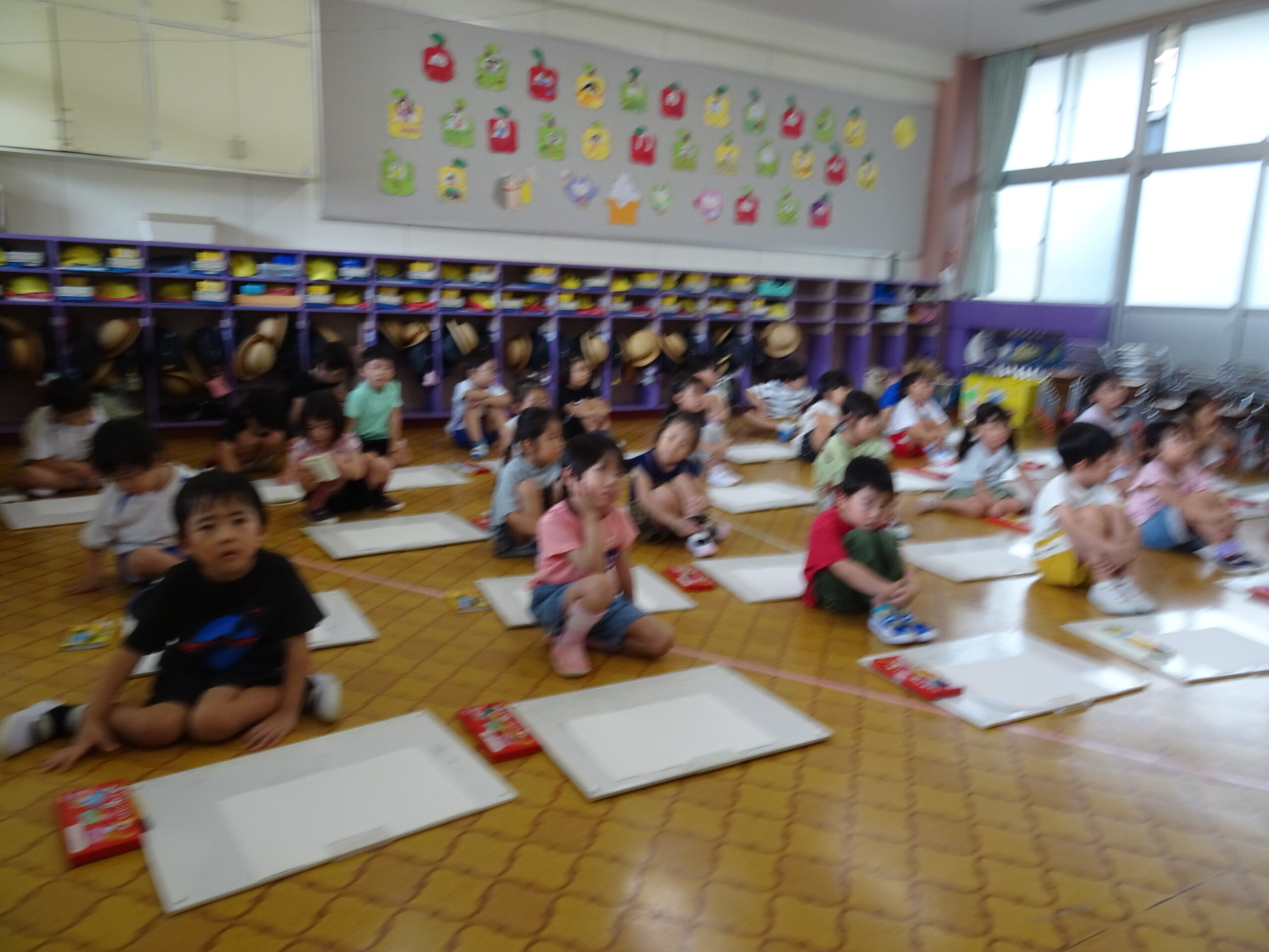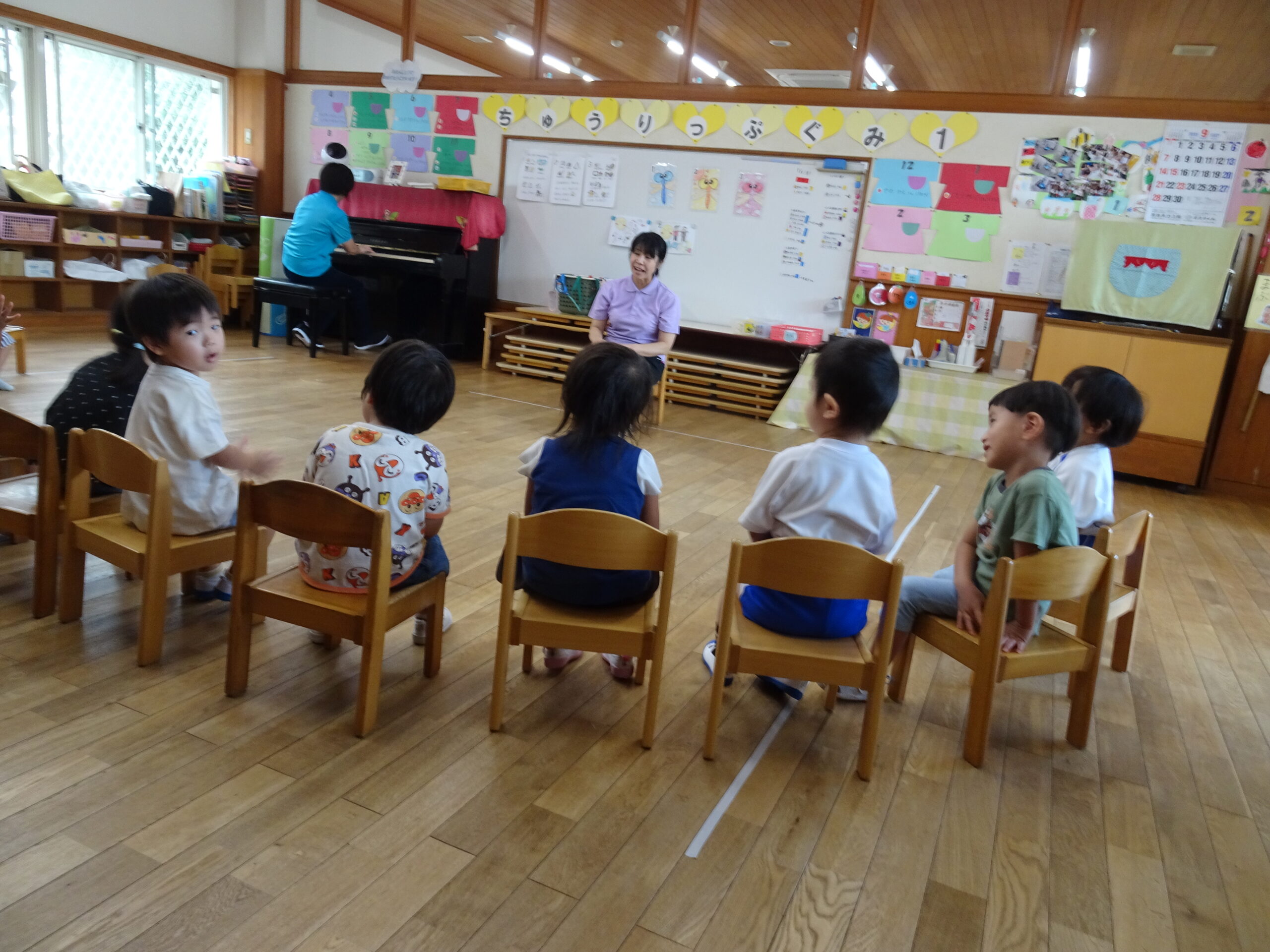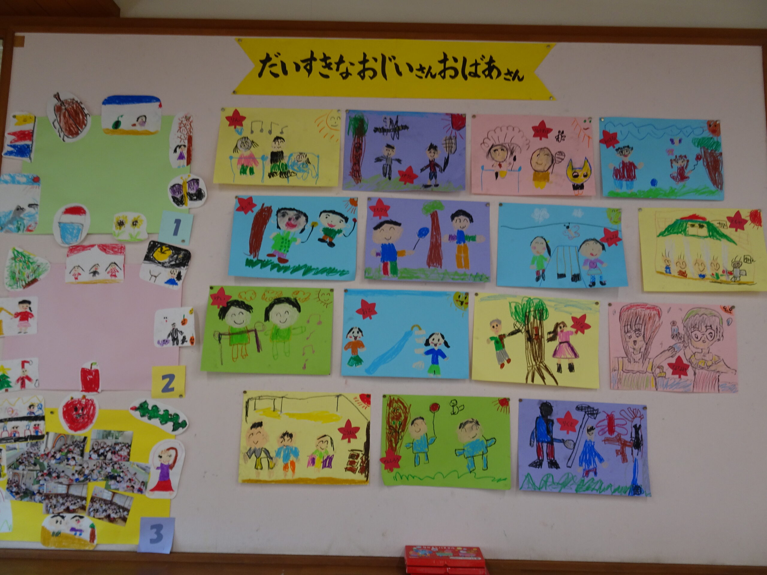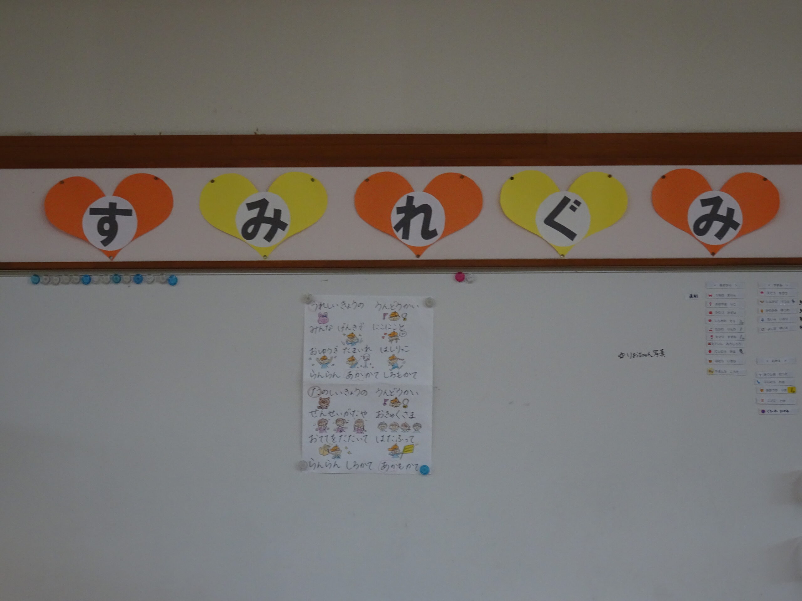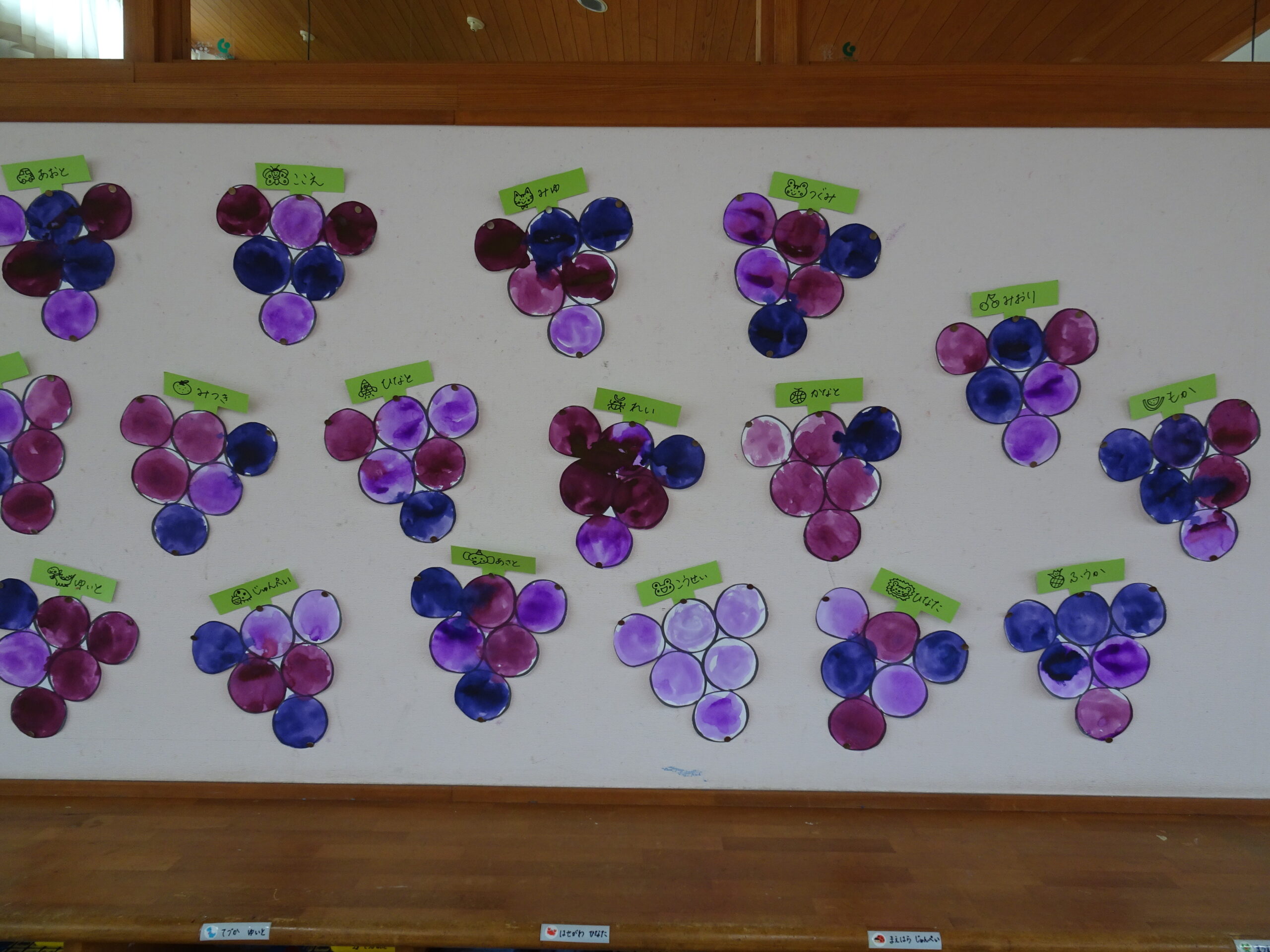 9月の各教室の壁面です。9月は、稲刈り、園内いも掘りなど実りの秋、祖父母との触れ合い会、吉野降園への園外保育など秋の季節にちなんだ壁面も見られます。