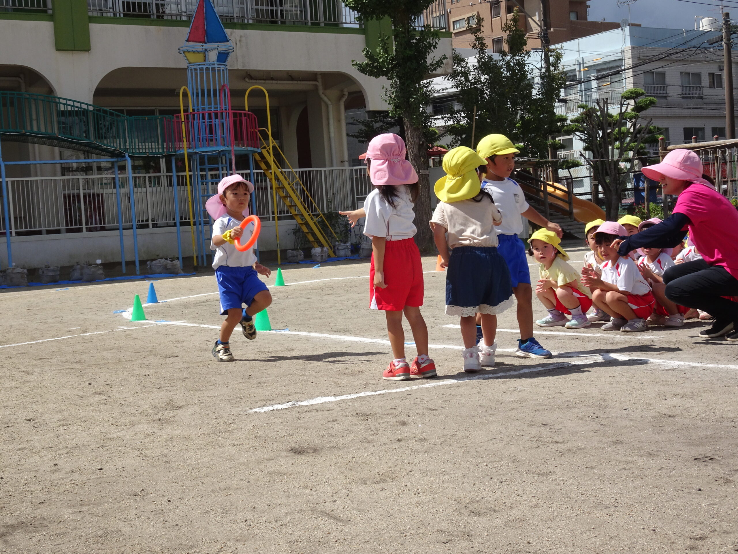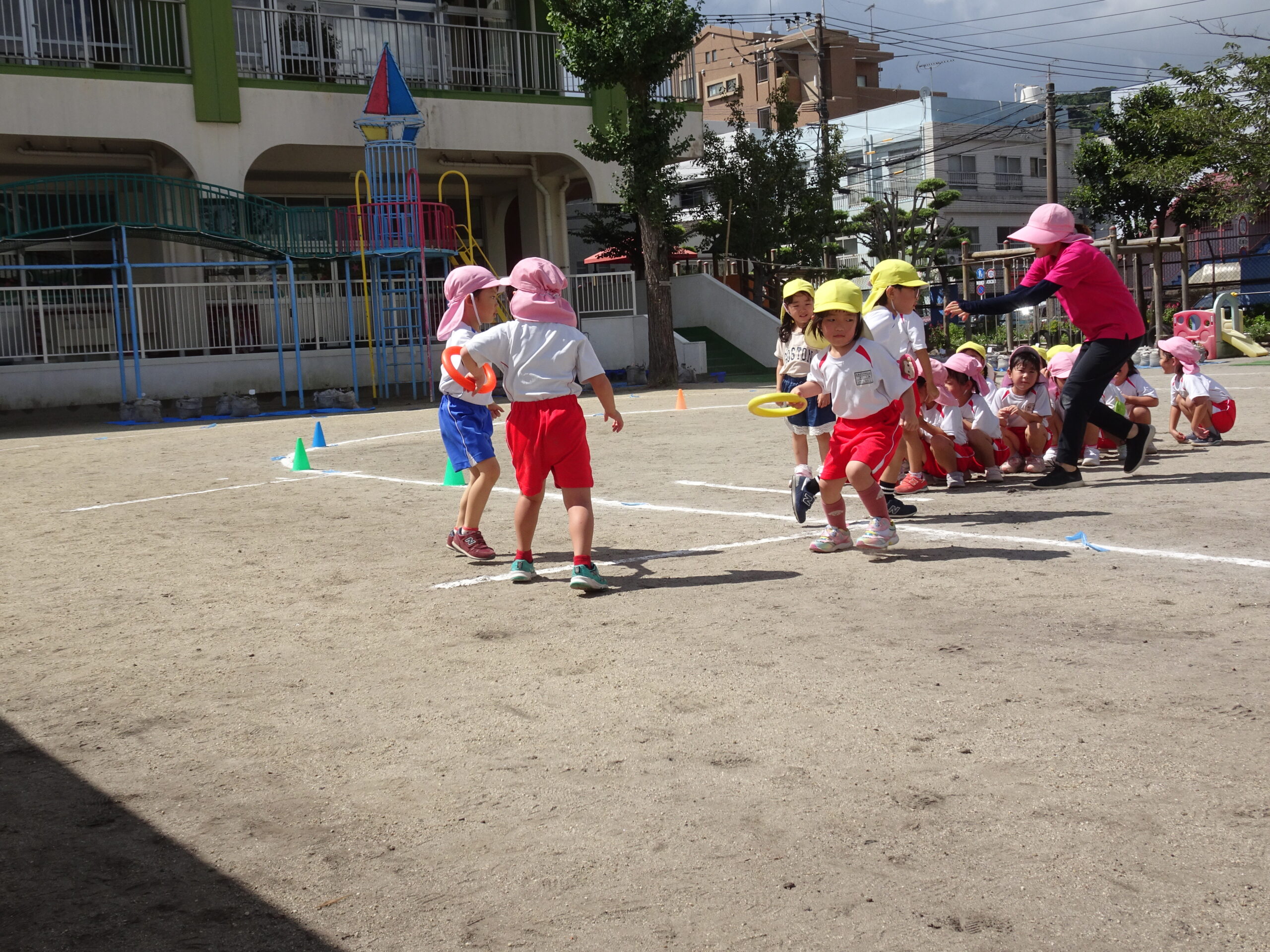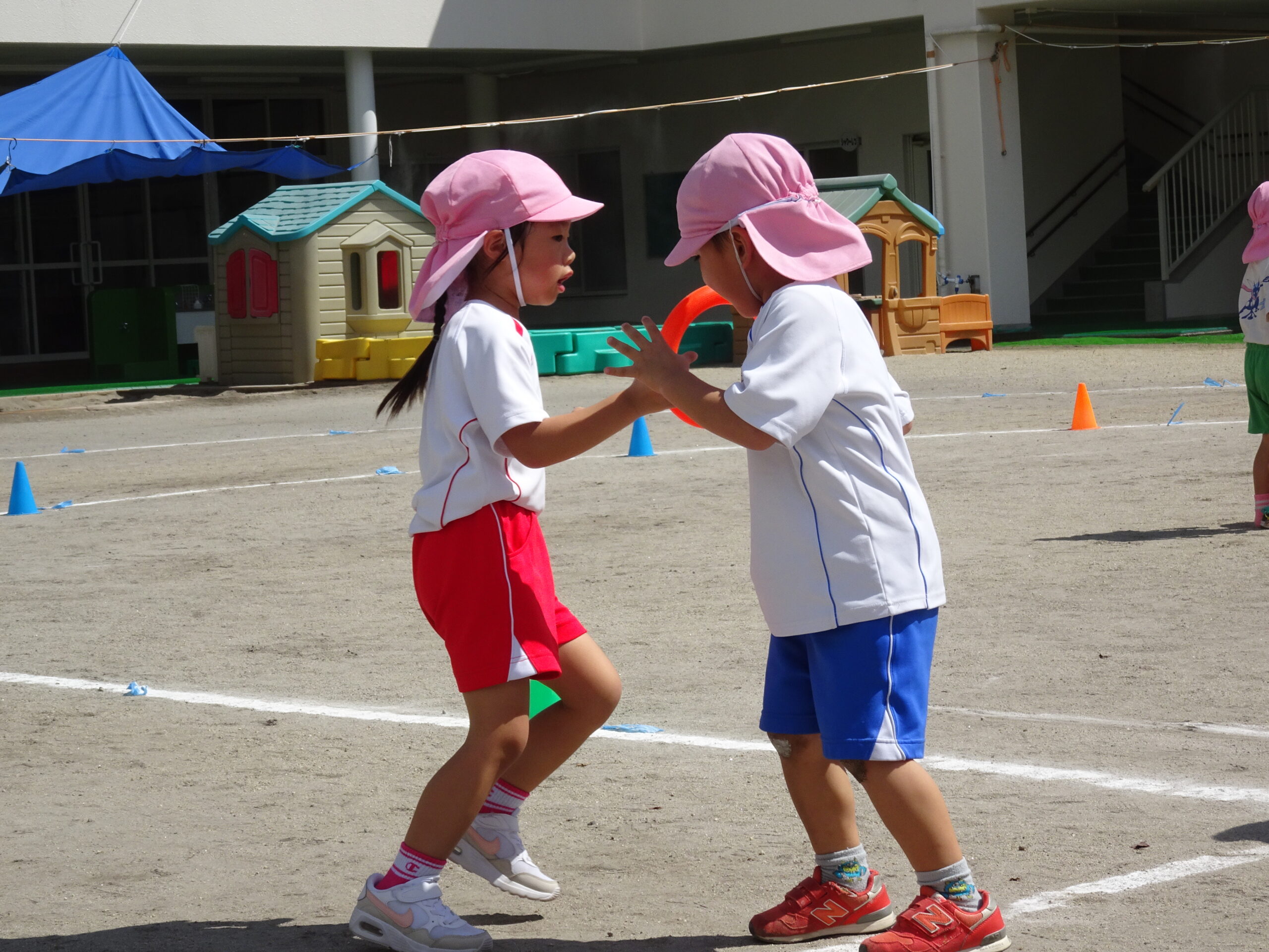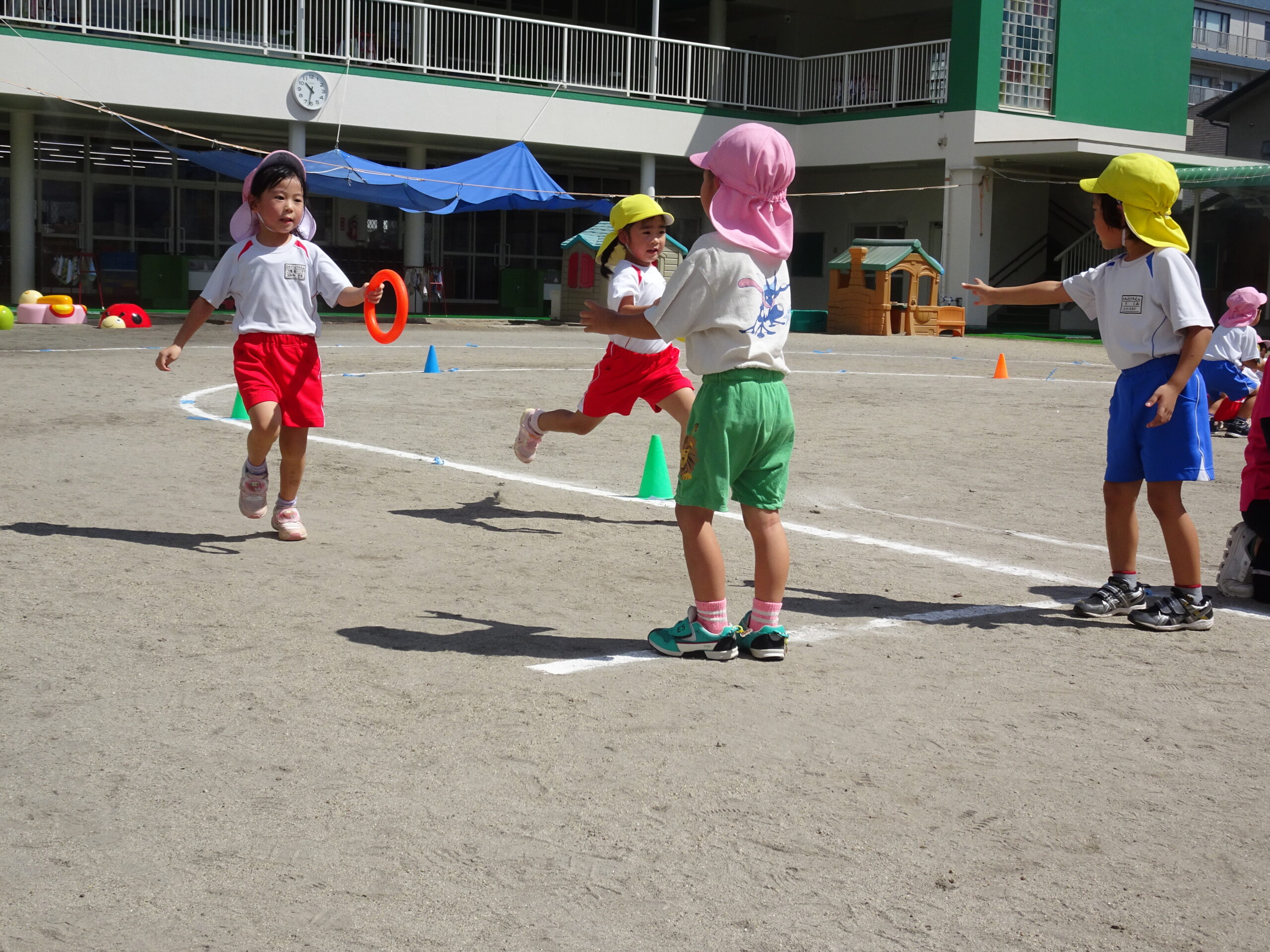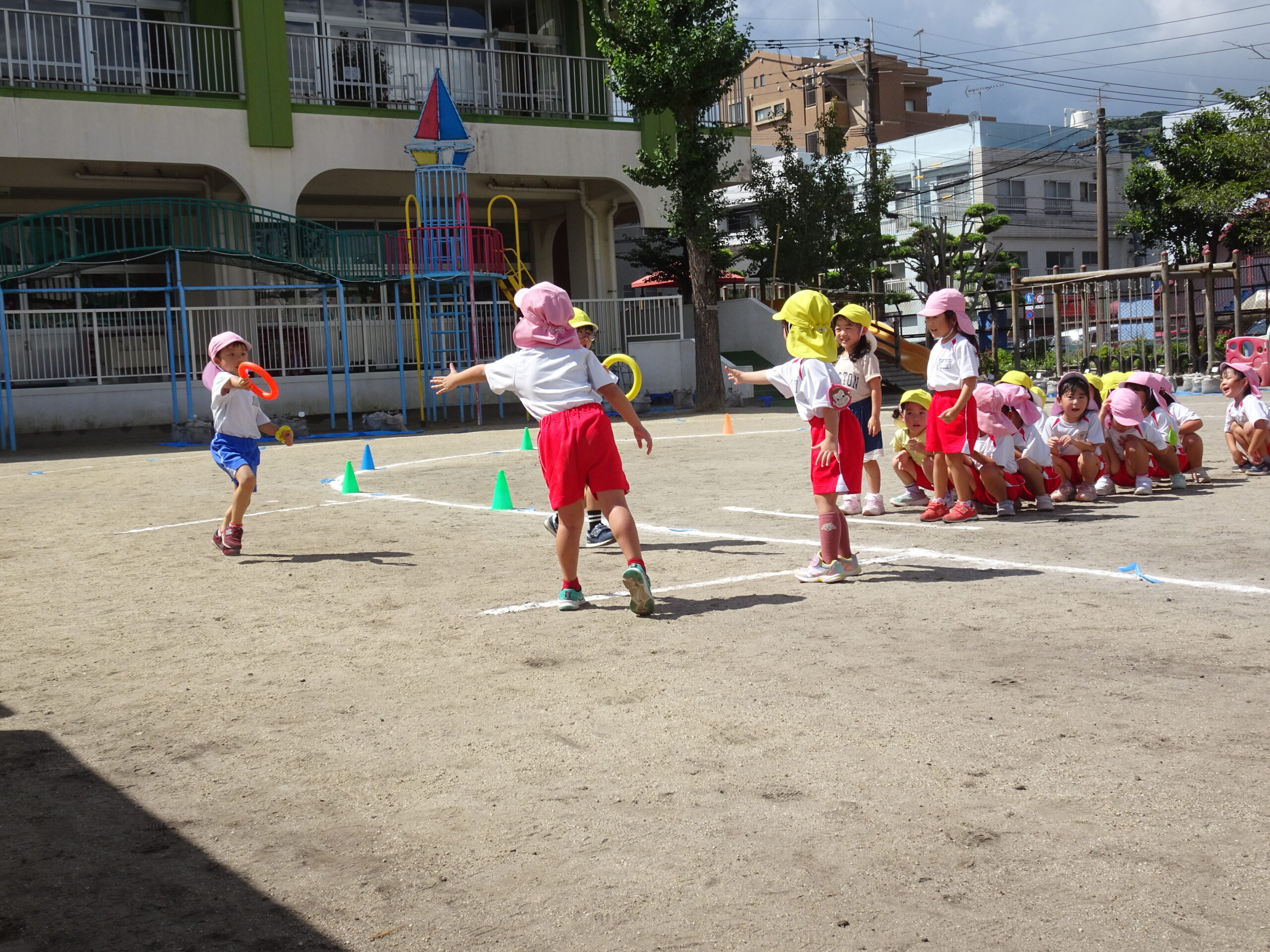 9月9日(火)、年中さんが初めてのリレーの練習をしました。バトンを渡すとき、ドキドキしながら受け渡ししている姿も見られました。
