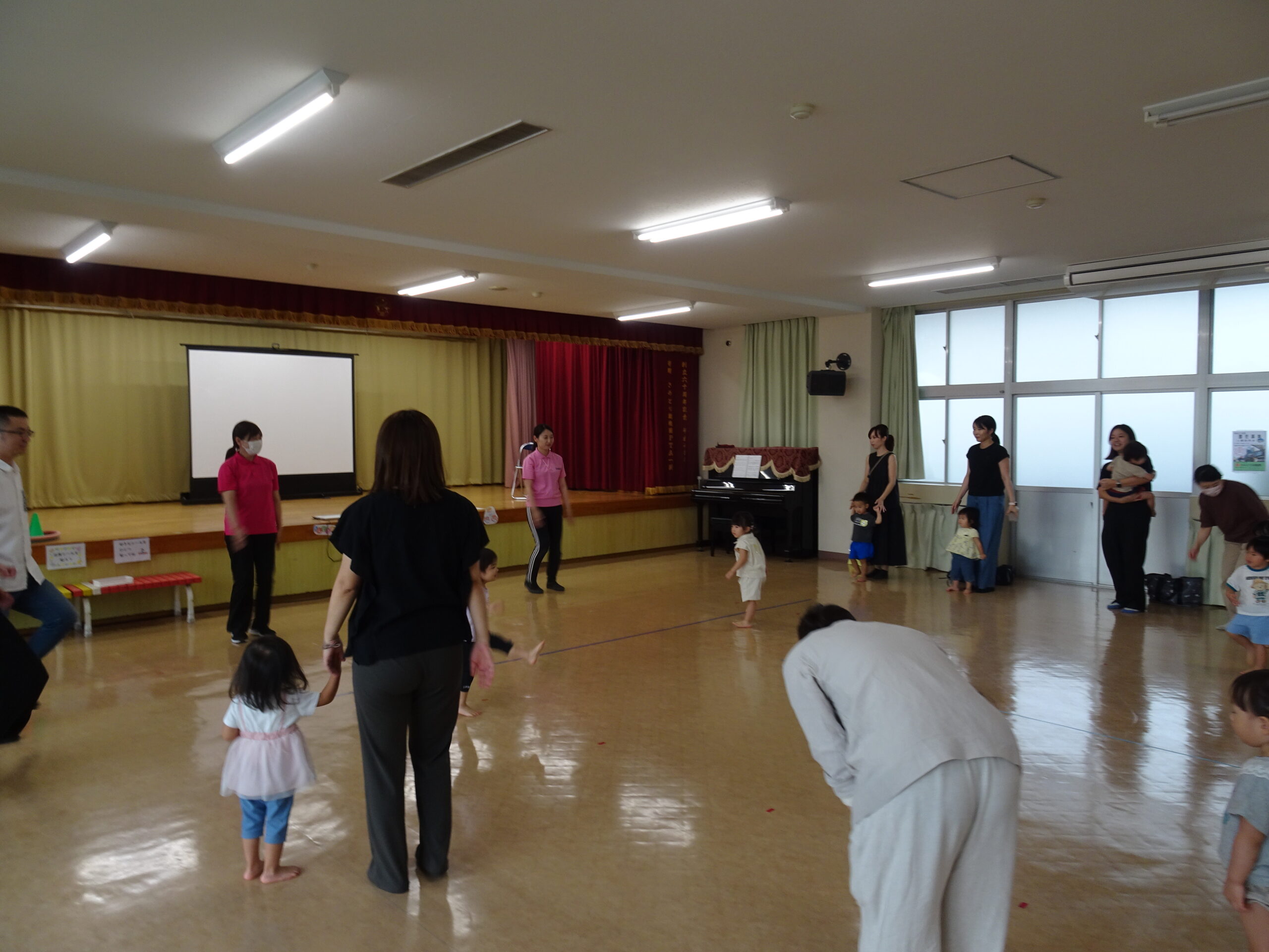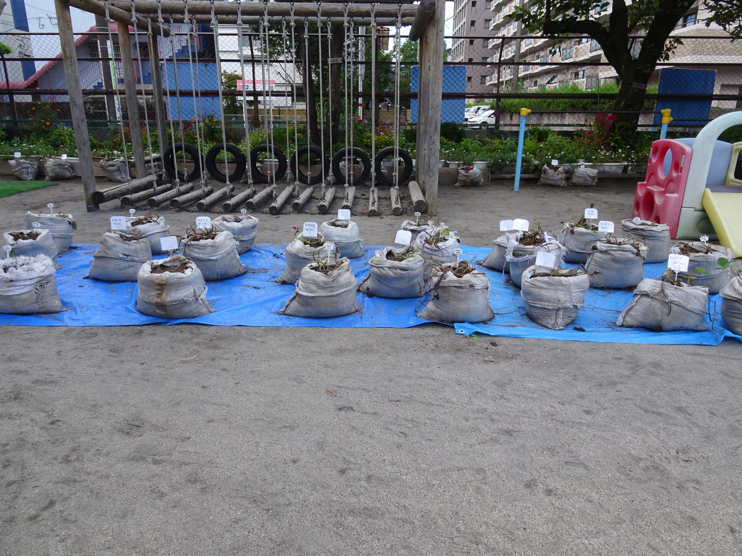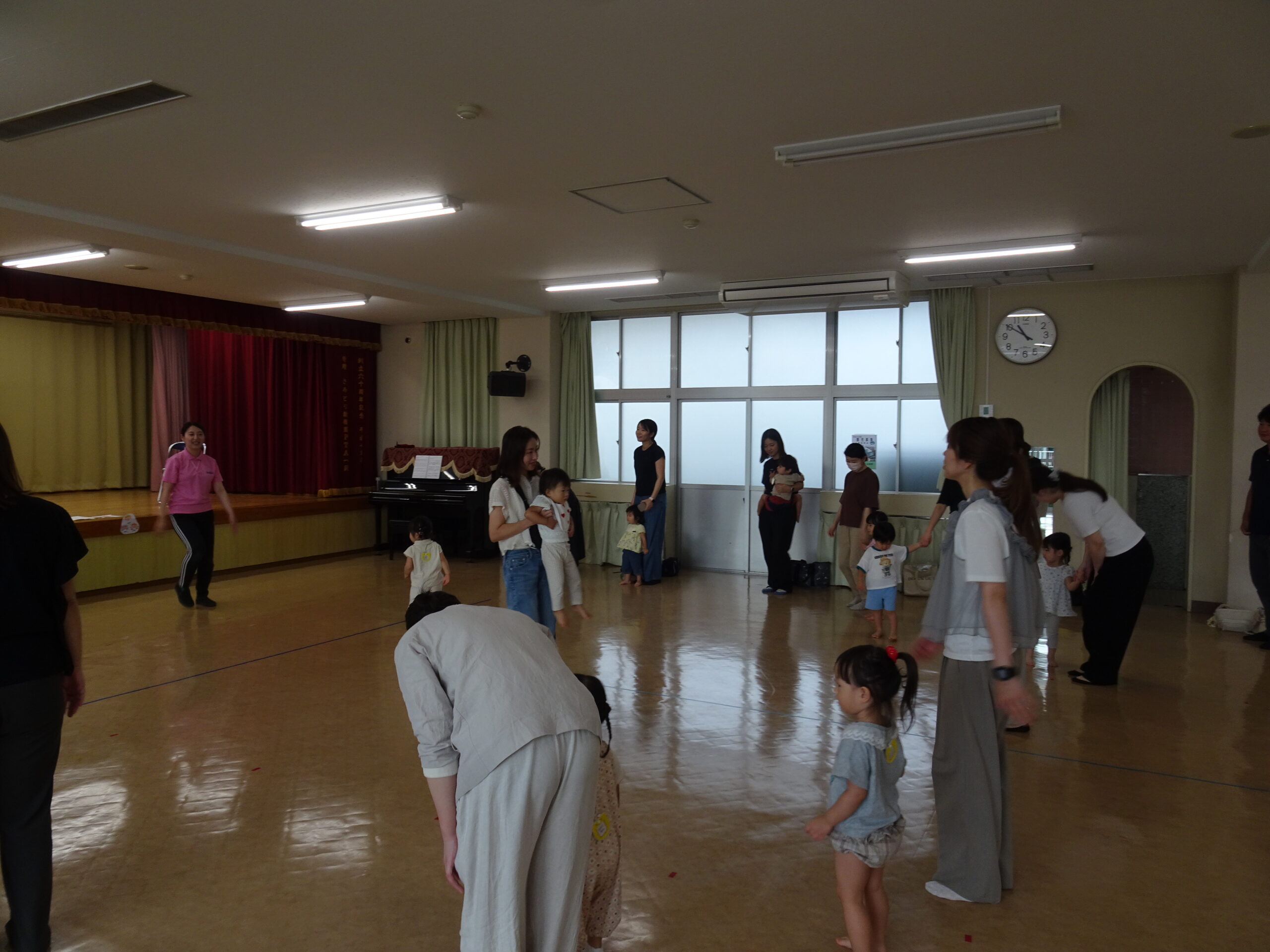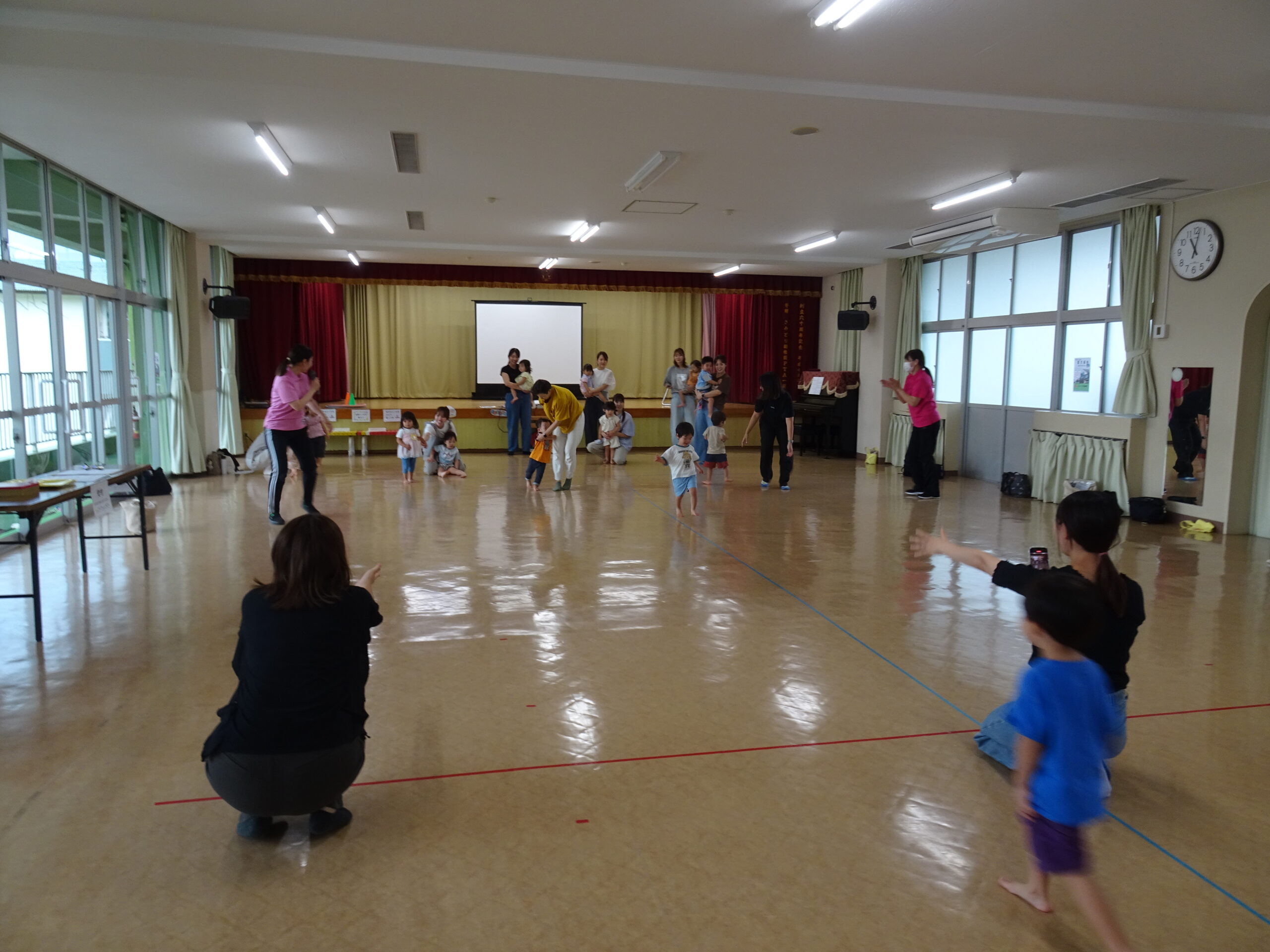 9月10日(水)第6回ひまわりクブが開催されました。「体を動かして遊ぼ う」の活動で、運動会ごっこの遊びを楽しみました。また、「あつかったらぬげばいい」の絵本の読みきかせもありました。最後は、4月24日に植えたいも掘りもありました。開始前は、強い雨が降りましたが、いも掘りの時は雨も上がり、自分の植えたいもを袋に入れて持ち帰りました。