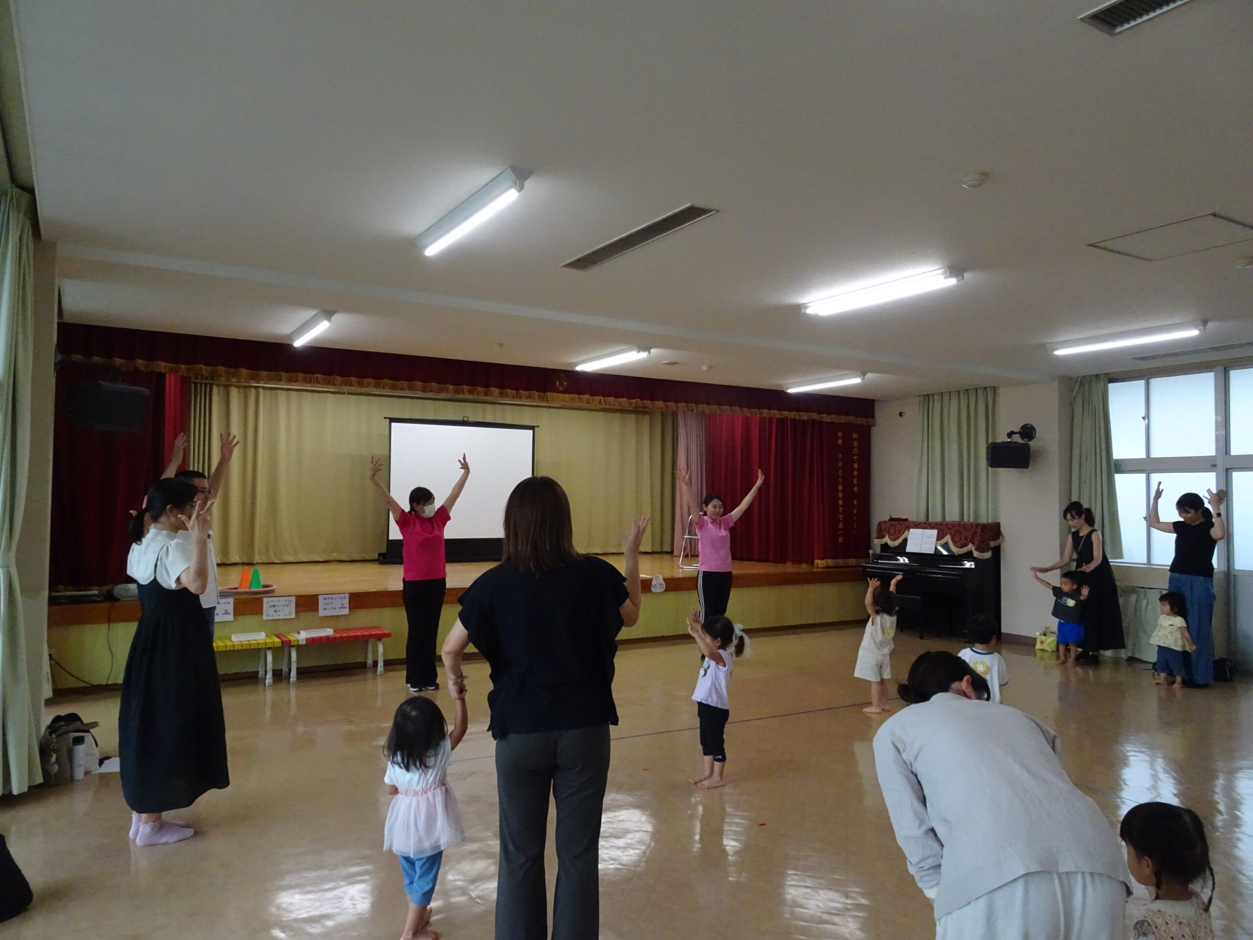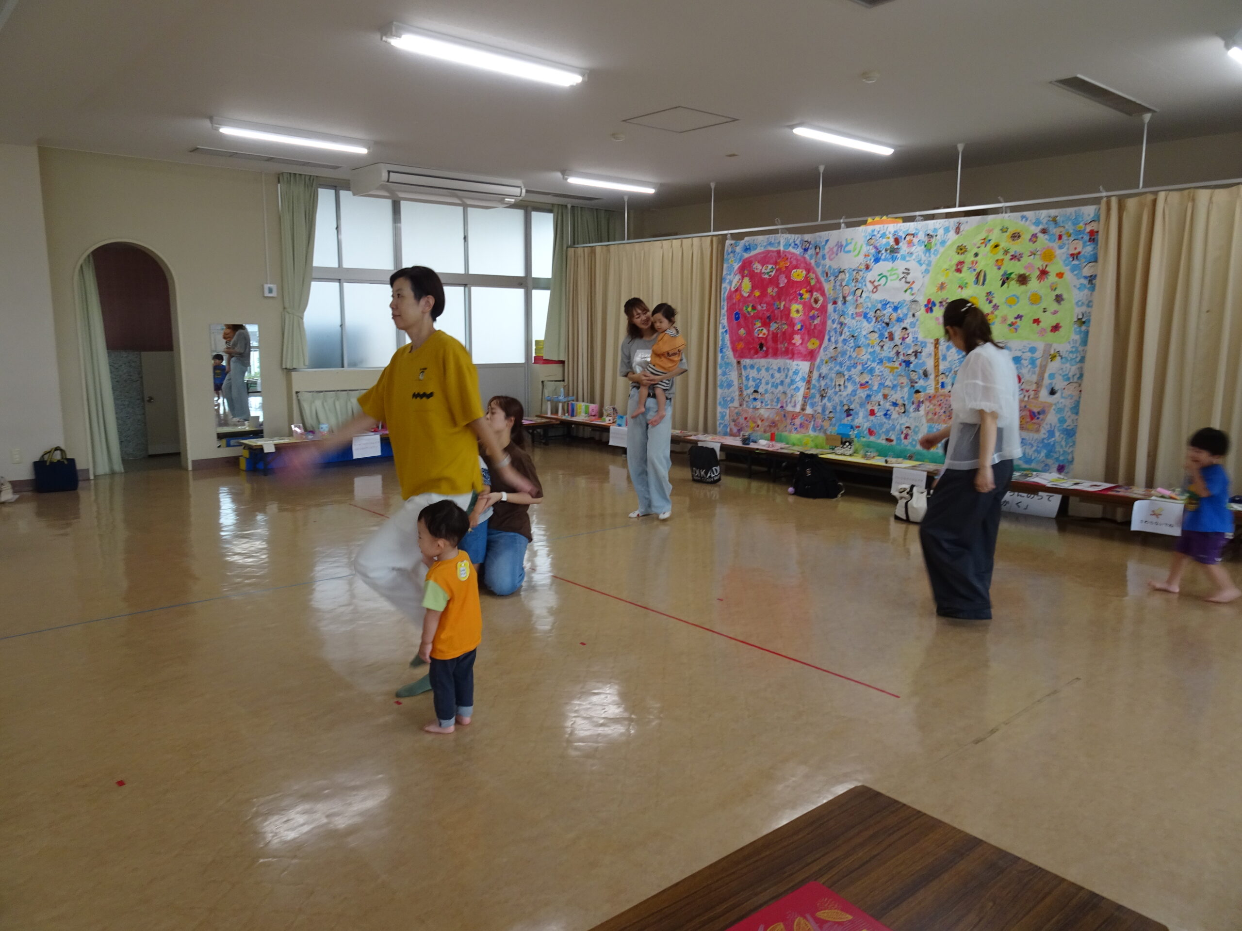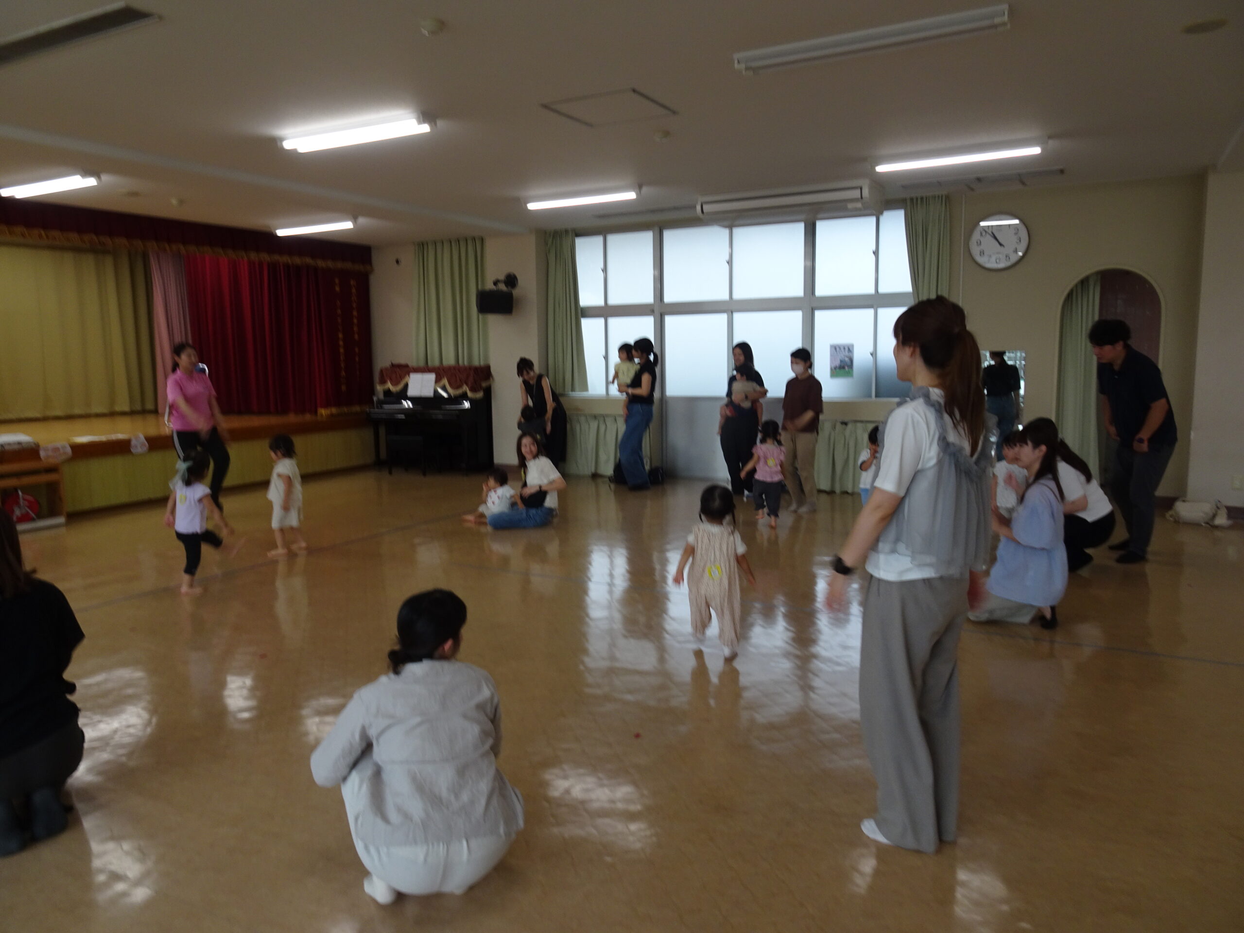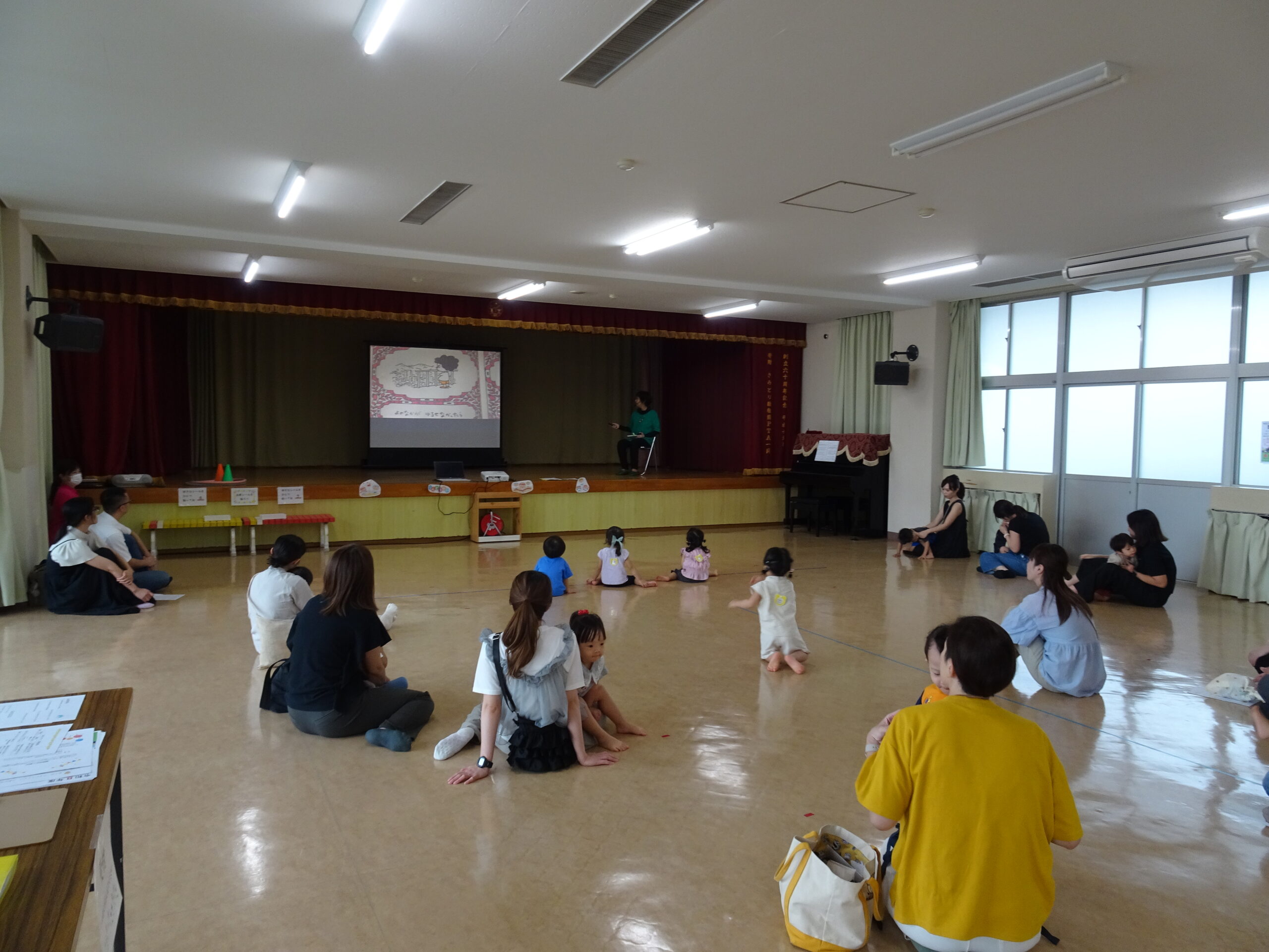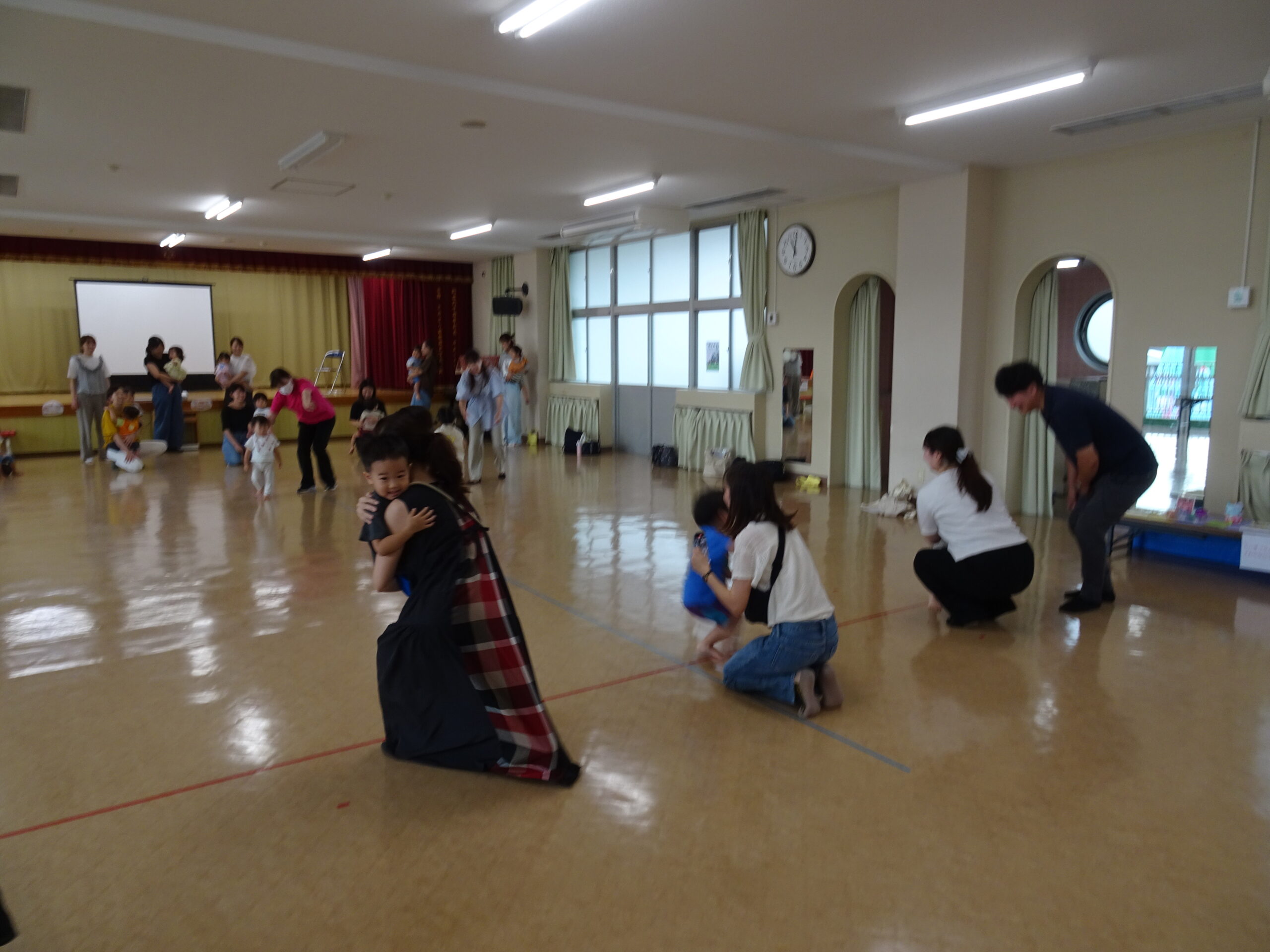 9月10日(水)第6回ひまわりクブが開催されました。「体を動かして遊ぼ う」の活動で、運動会ごっこの遊びを楽しみました。また、「あつかったらぬげばいい」の絵本の読みきかせもありました。最後は、4月24日に植えたいも掘りもありました。開始前は、強い雨が降りましたが、いも掘りの時は雨も上がり、自分の植えたいもを袋に入れて持ち帰りました。