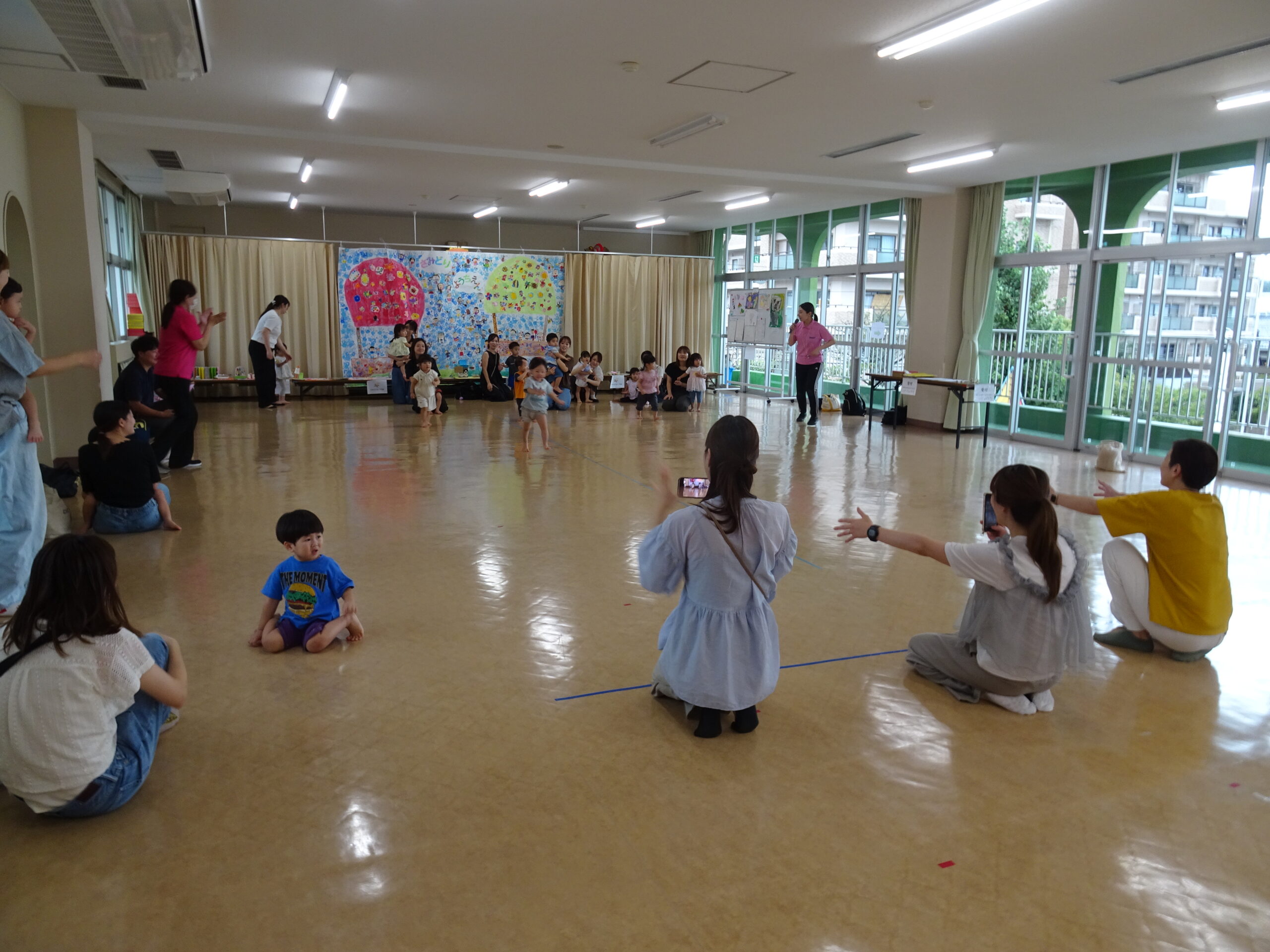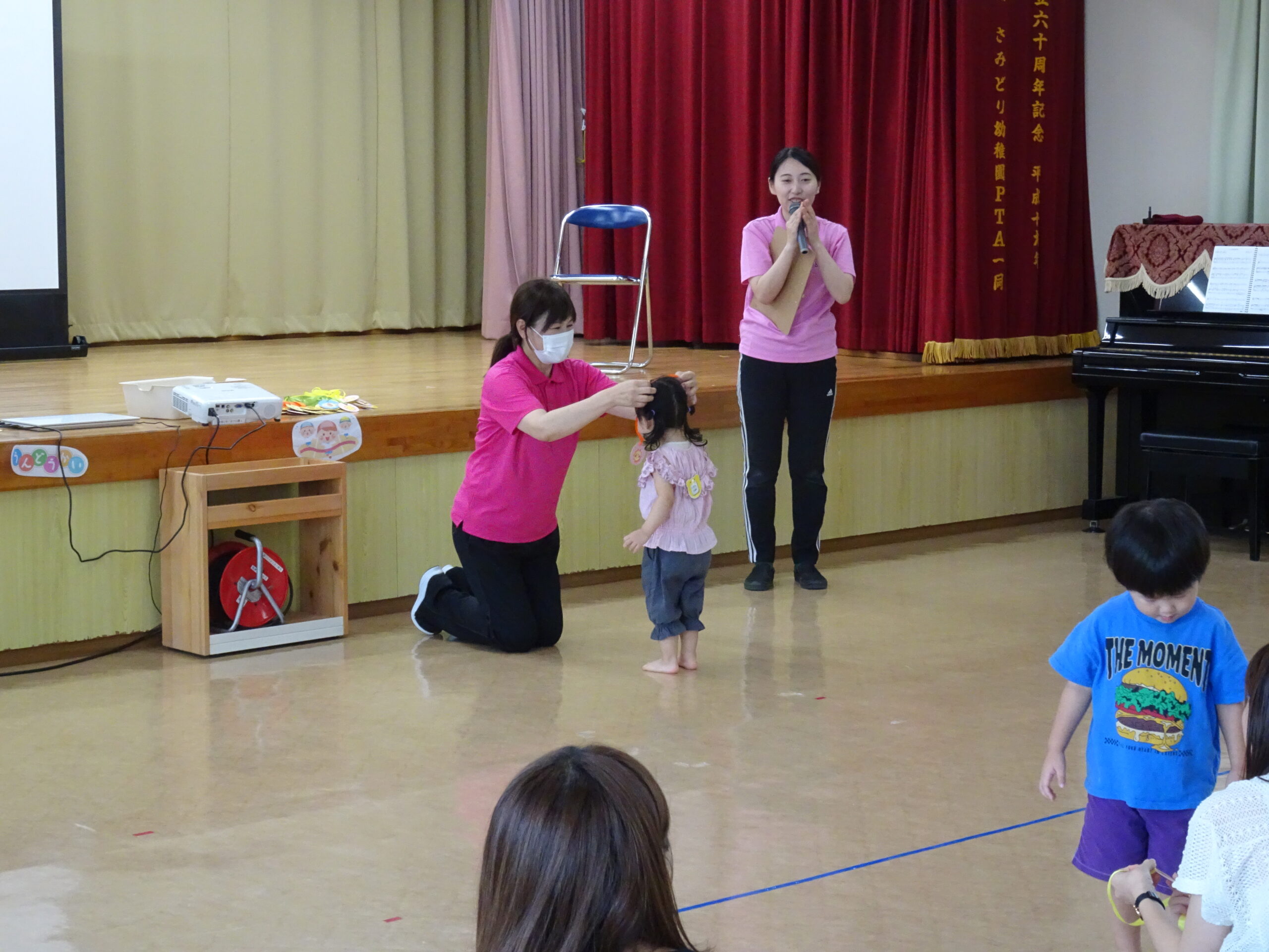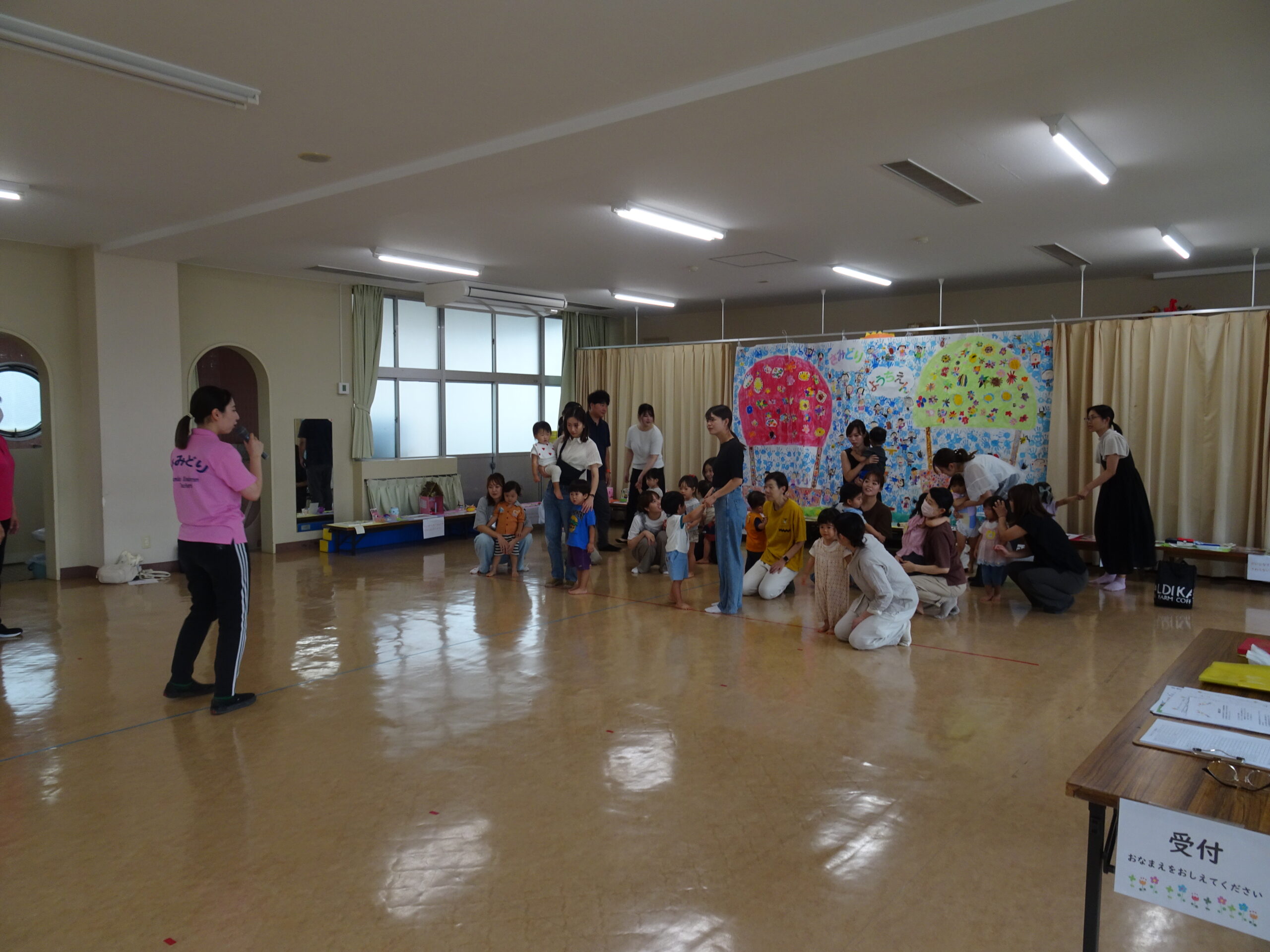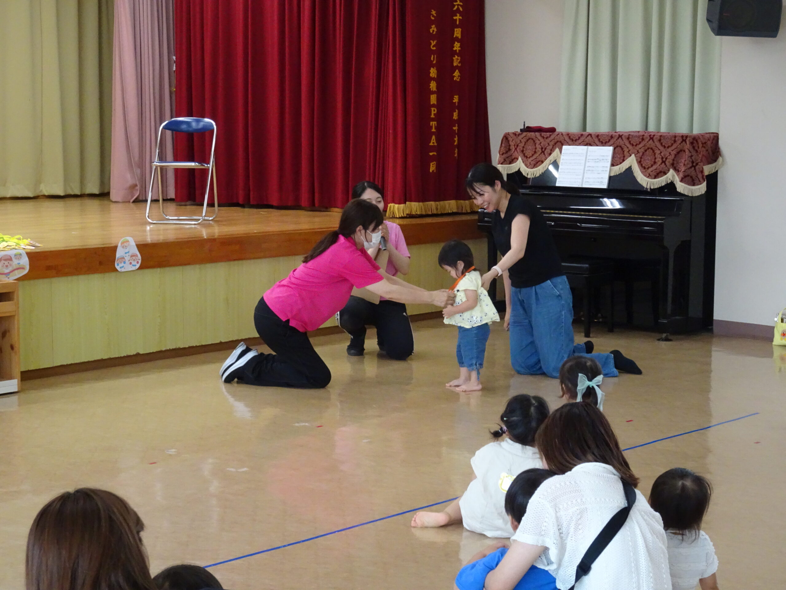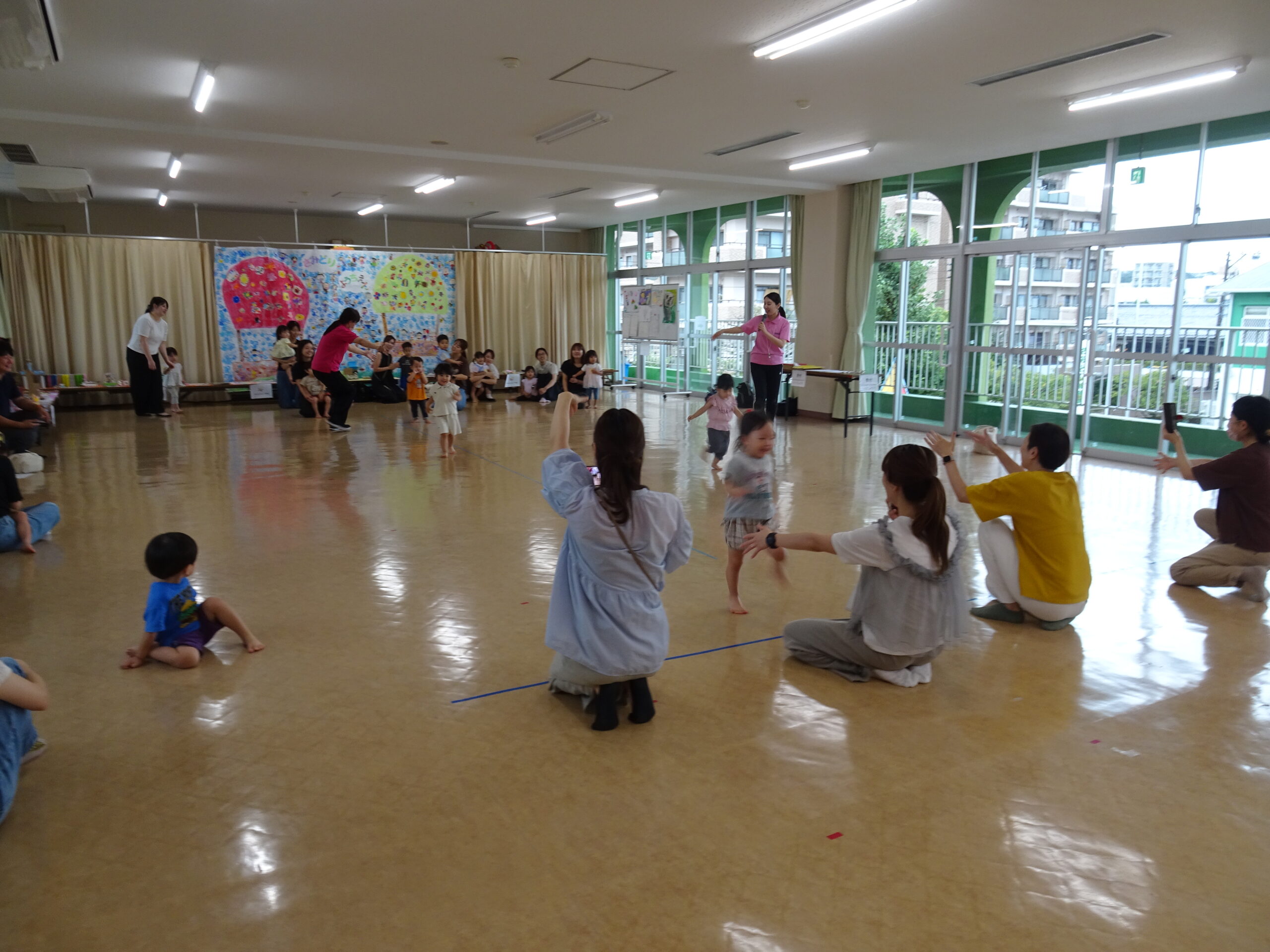 9月10日(水)第6回ひまわりクブが開催されました。「体を動かして遊ぼ う」の活動で、運動会ごっこの遊びを楽しみました。また、「あつかったらぬげばいい」の絵本の読みきかせもありました。最後は、4月24日に植えたいも掘りもありました。開始前は、強い雨が降りましたが、いも掘りの時は雨も上がり、自分の植えたいもを袋に入れて持ち帰りました。
