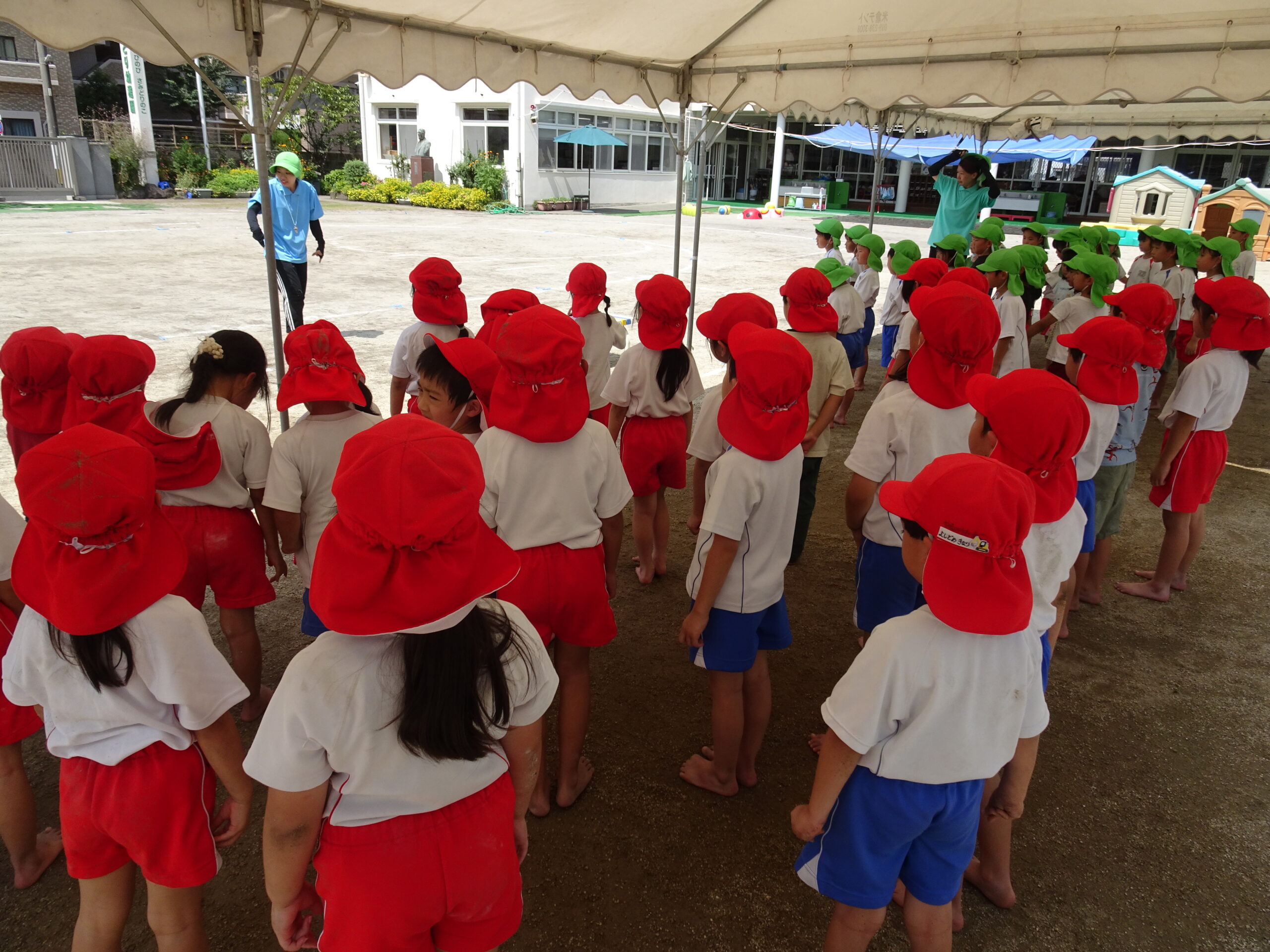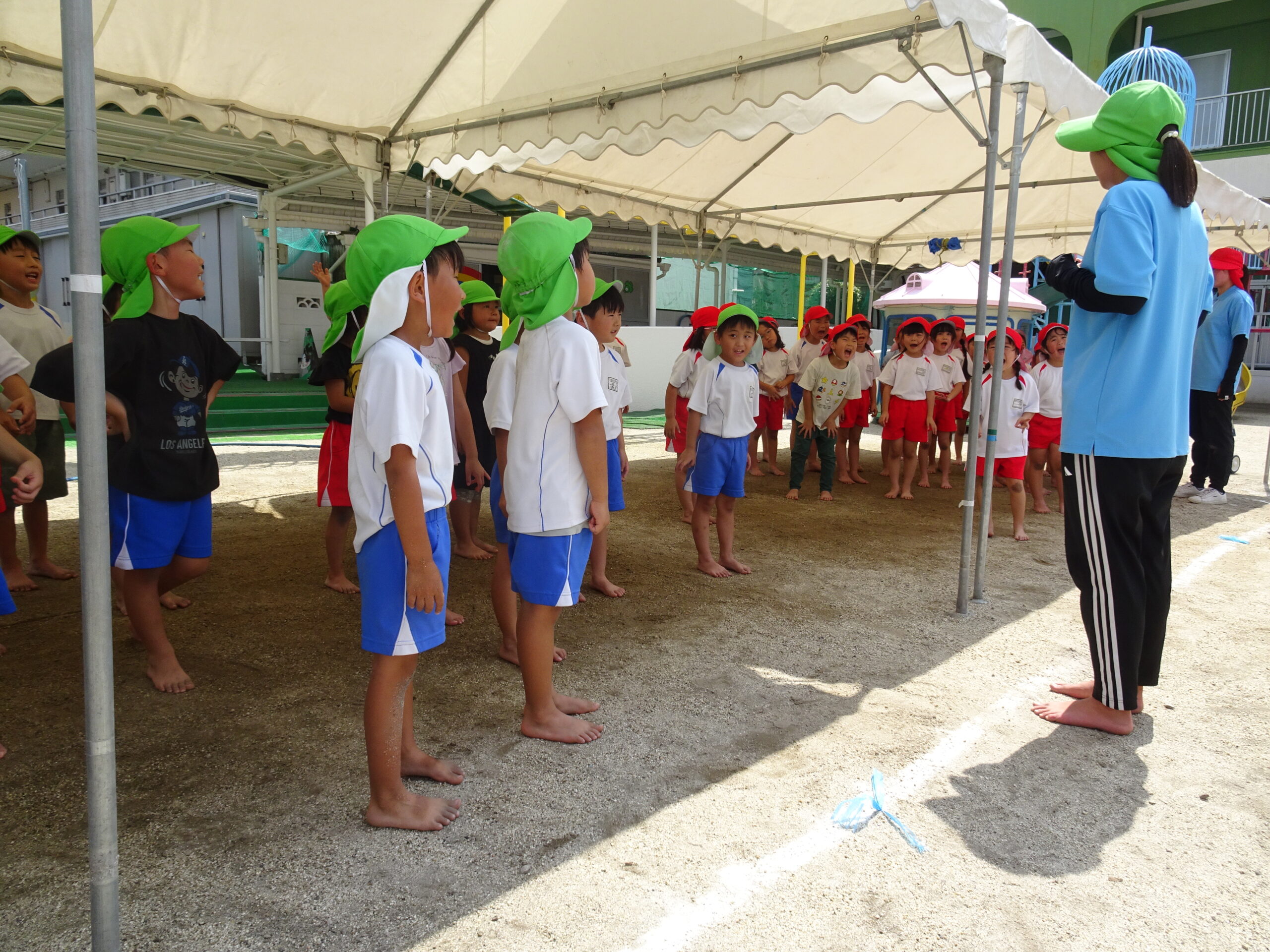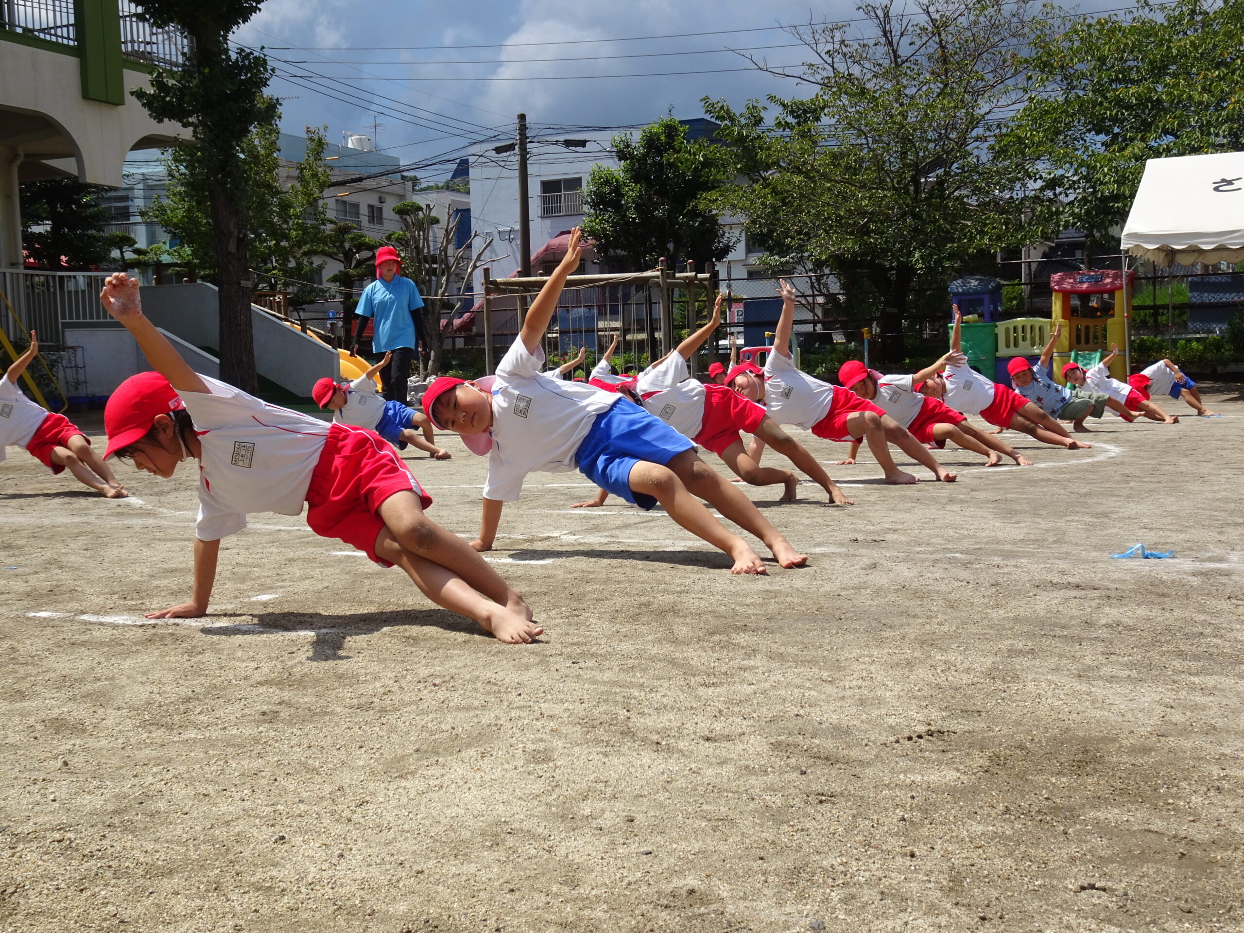 年長さんの組み体操の練習の様子です。給水・練習・日陰での練習の反省と。きびきびした動きで、練習に取り組んでいます。