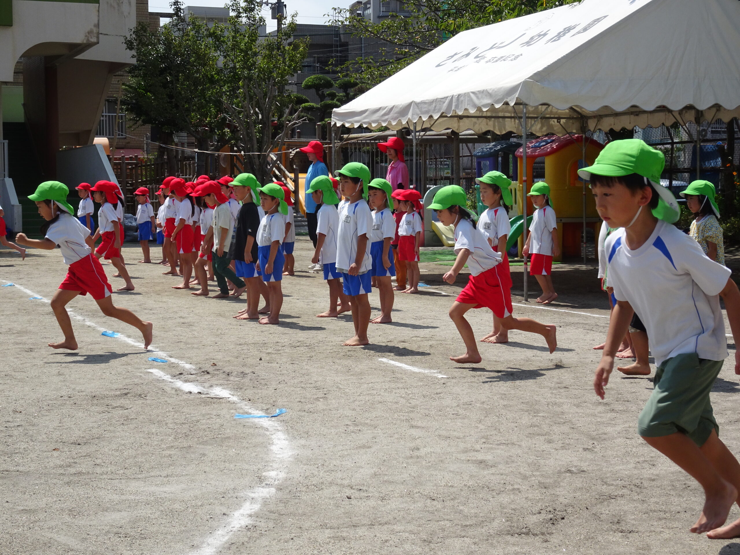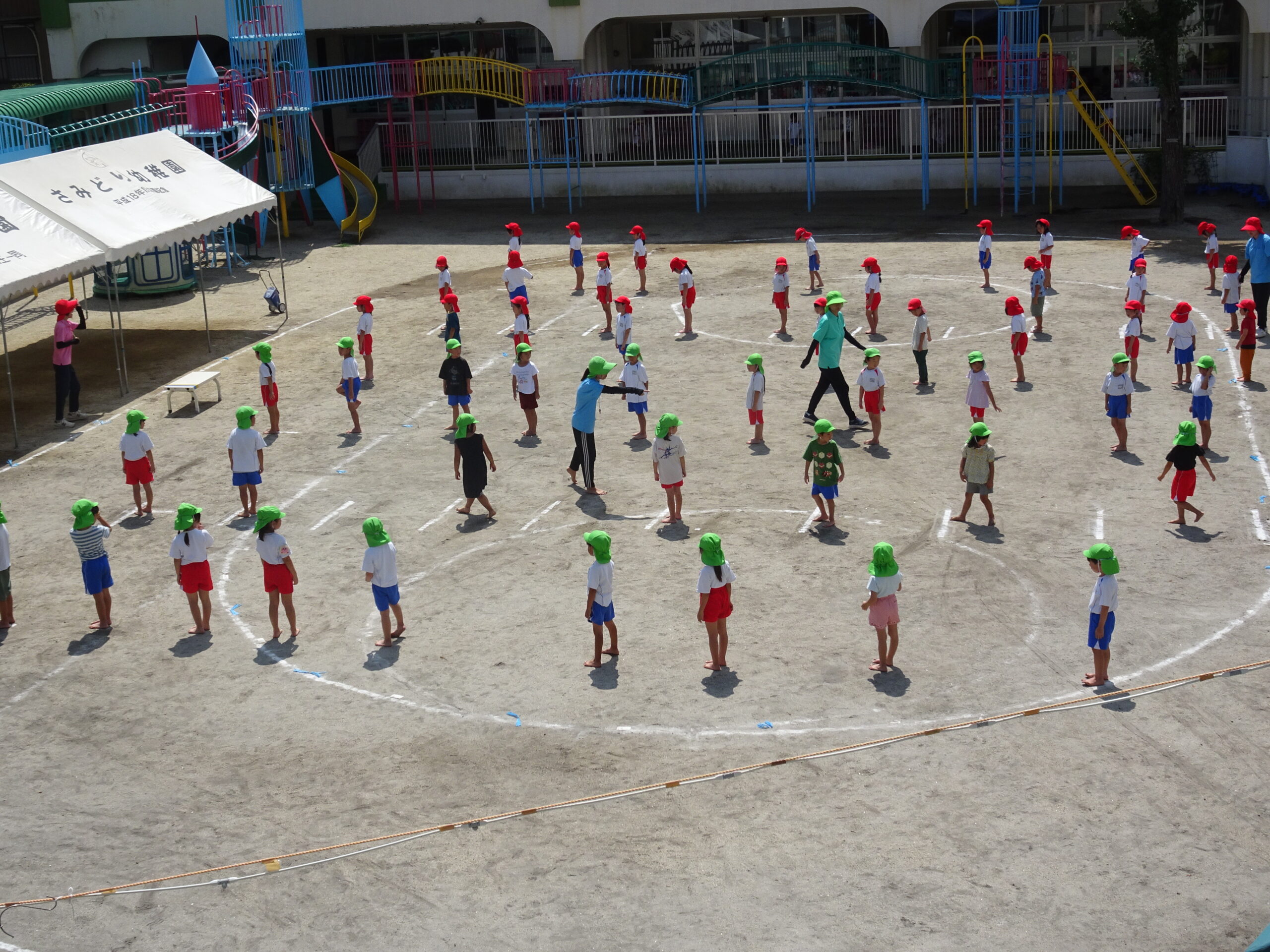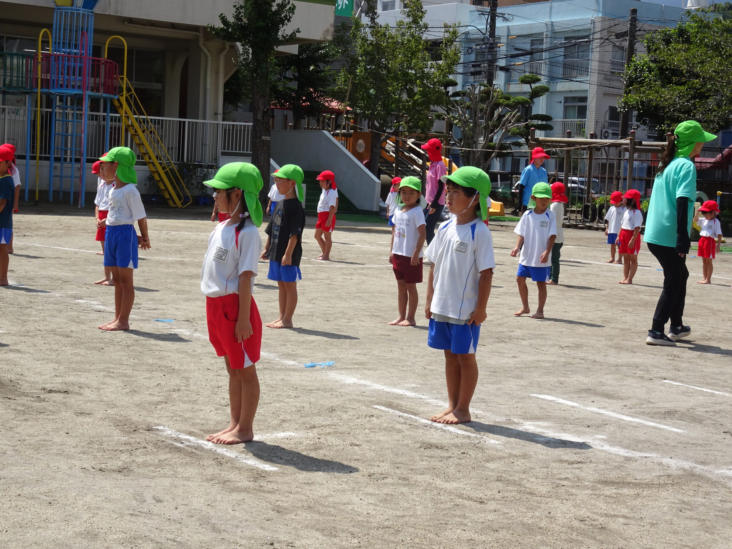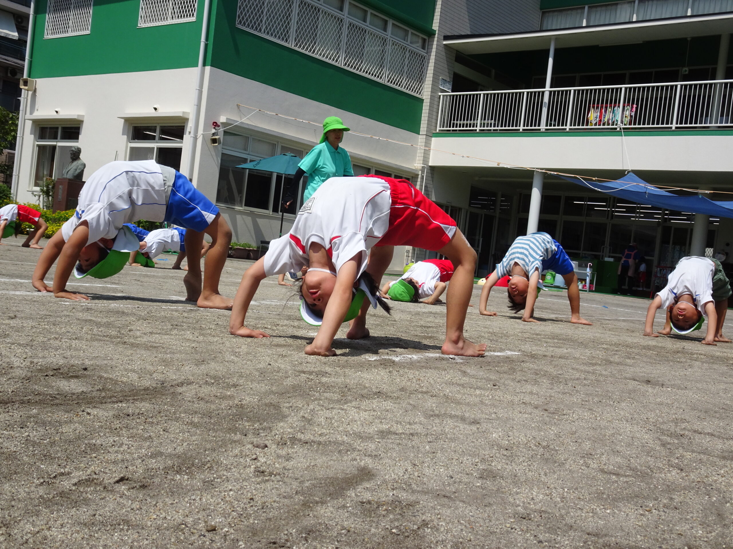 年長さんの組み体操の練習の様子です。給水・練習・日陰での練習の反省と。きびきびした動きで、練習に取り組んでいます。