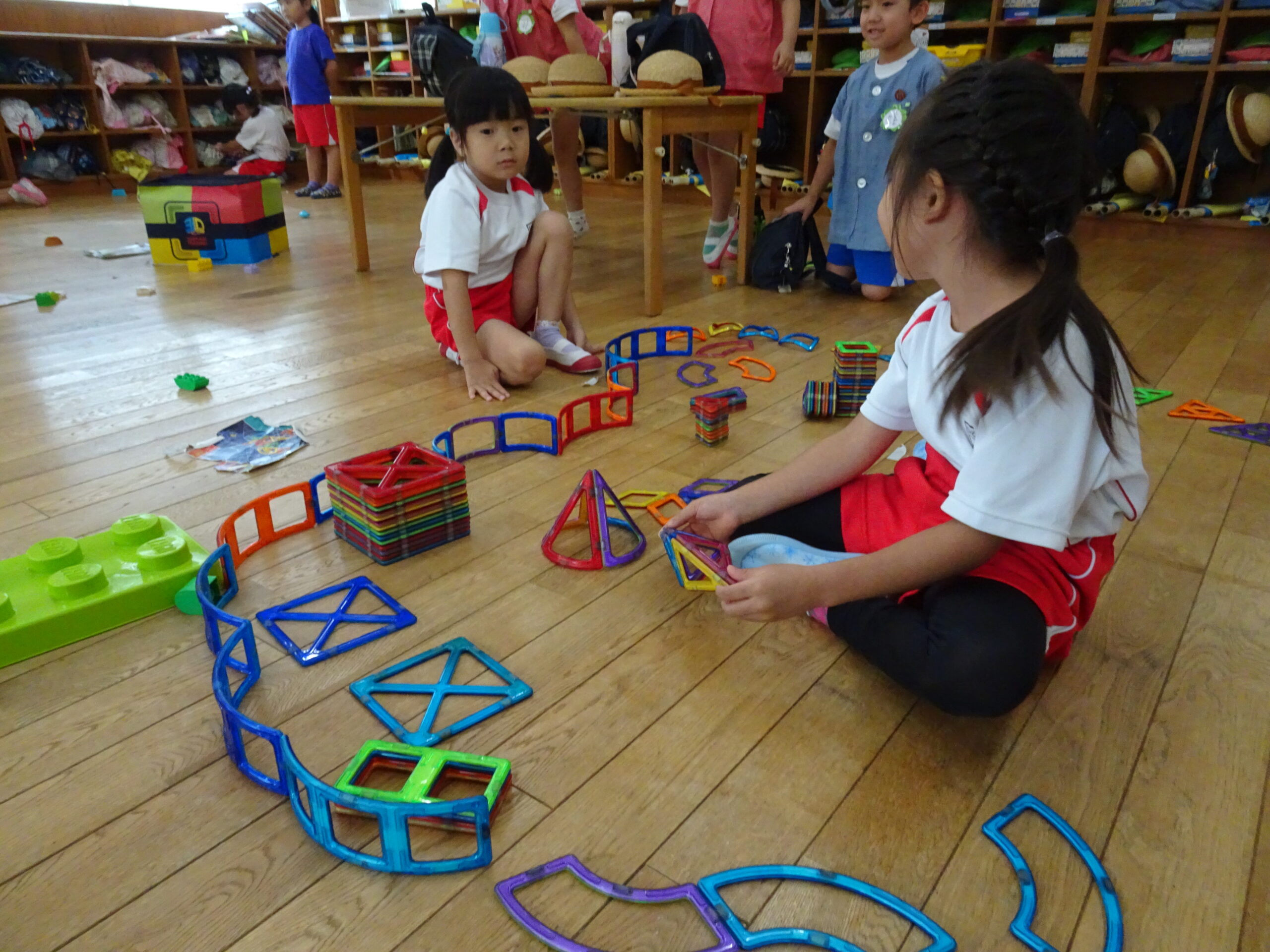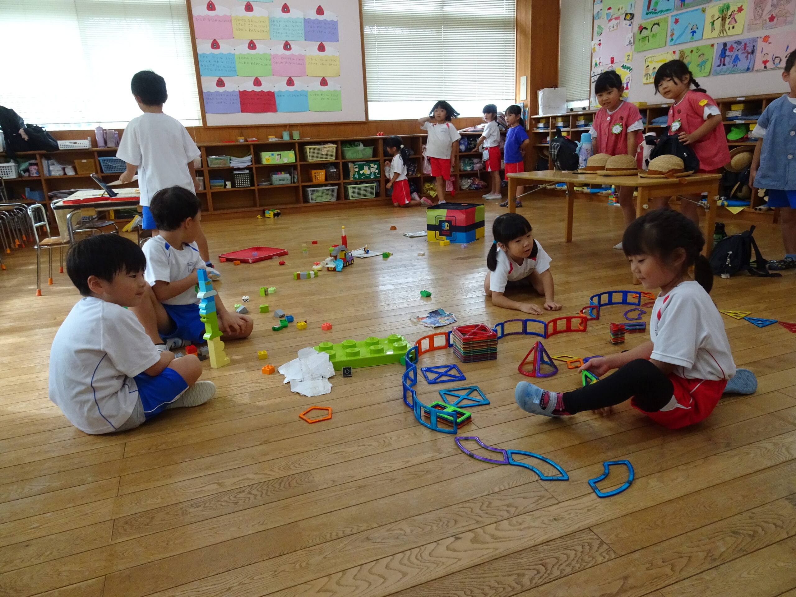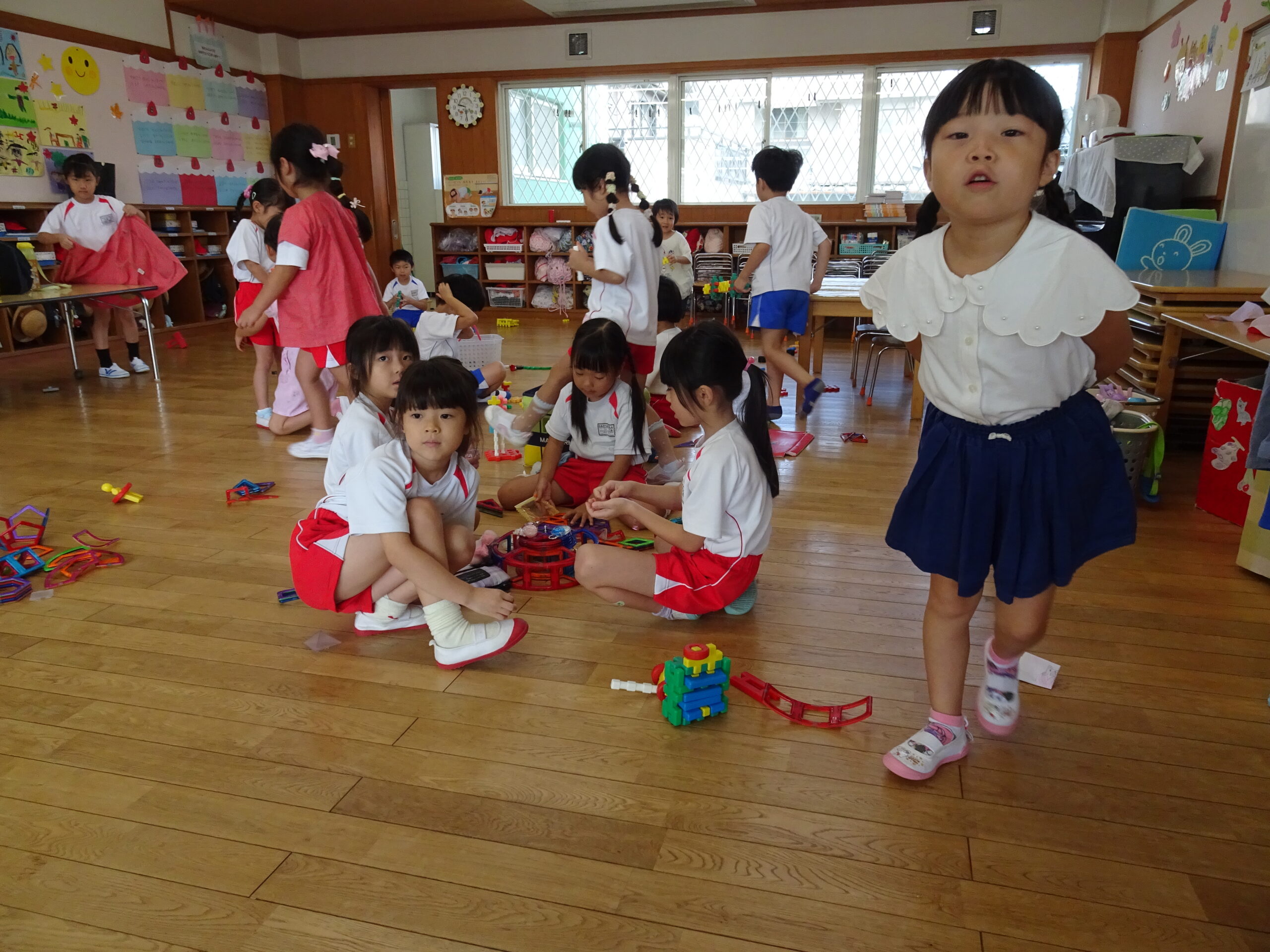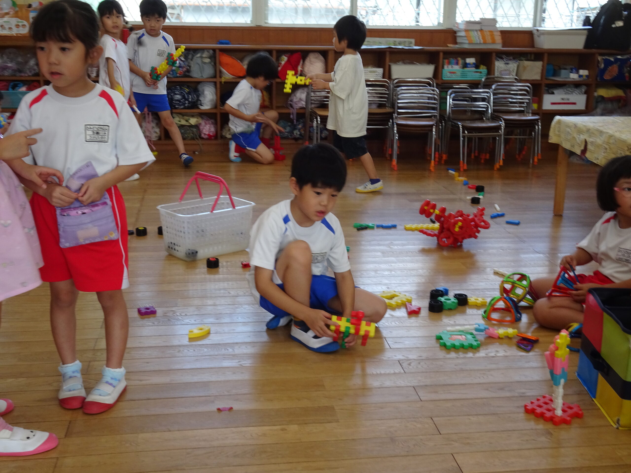 活動Ⅰの時間(登園後~9:50)は、遊ぶ場所や遊ぶ種類を自分で選んで遊ぶ時間帯です。今日の9:15分~9:30分の子ども達の遊びの様子です。暑さのためか、年長さんは教室で遊ぶ人も多いでした。