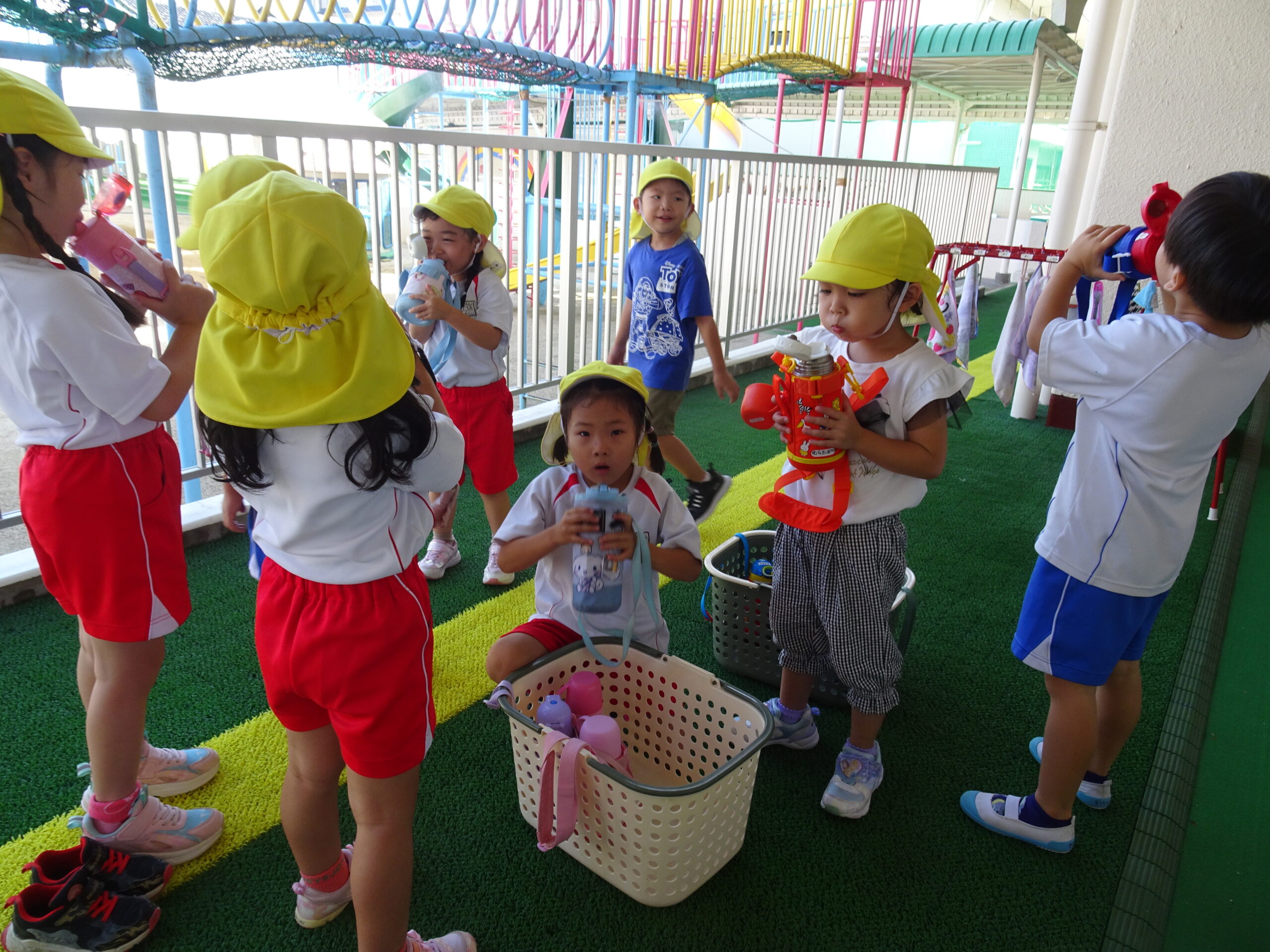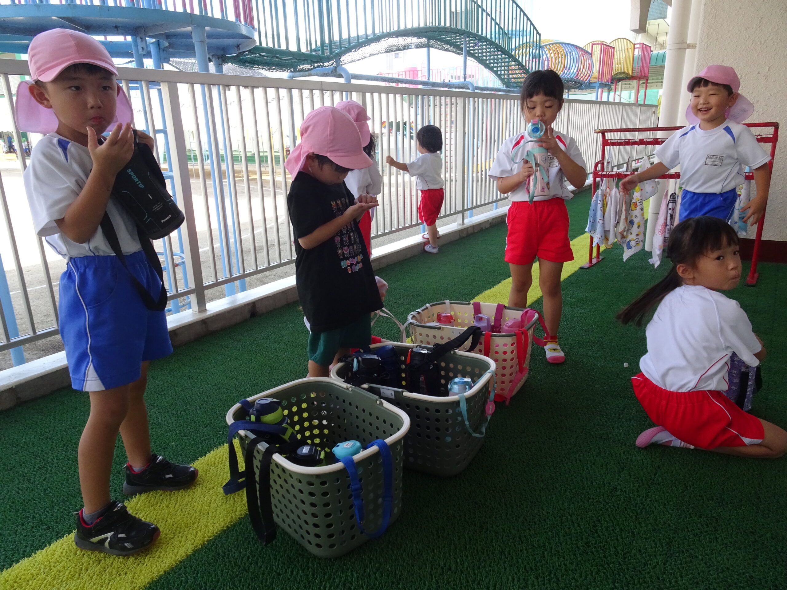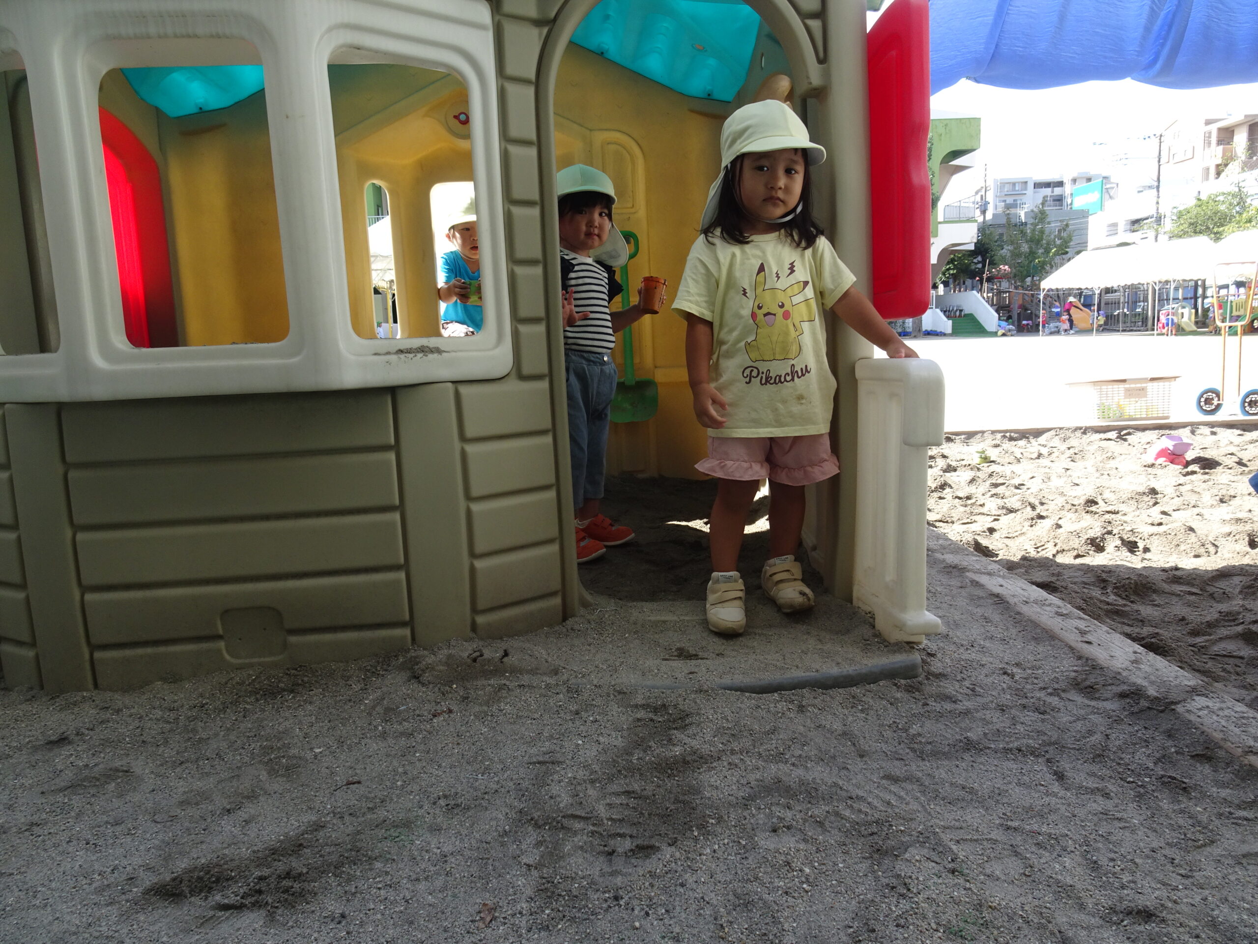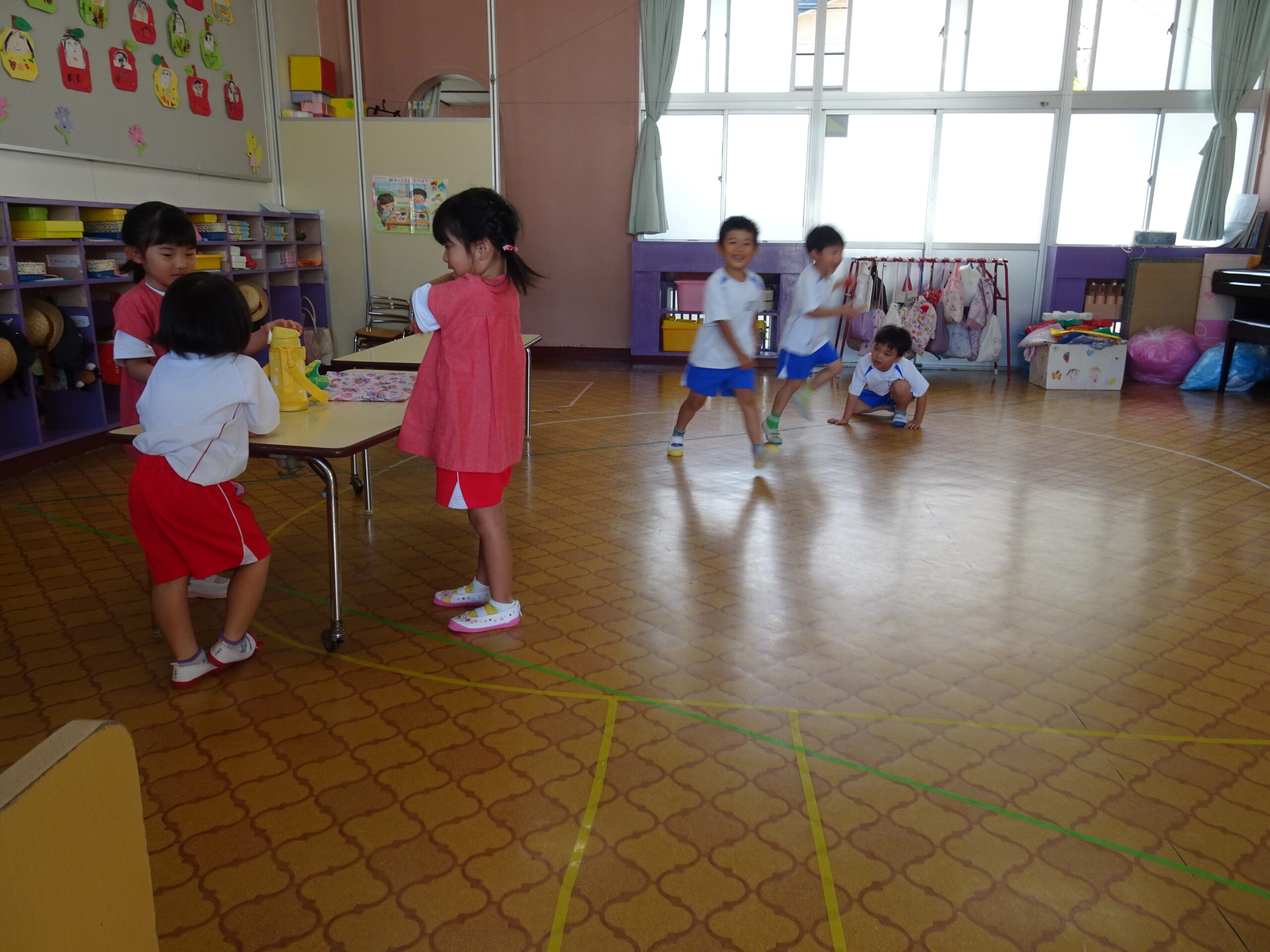 活動Ⅰの時間(登園後~9:50)は、遊ぶ場所や遊ぶ種類を自分で選んで遊ぶ時間帯です。今日の9:15分~9:30分の子ども達の遊びの様子です。暑さのためか、年長さんは教室で遊ぶ人も多いでした。