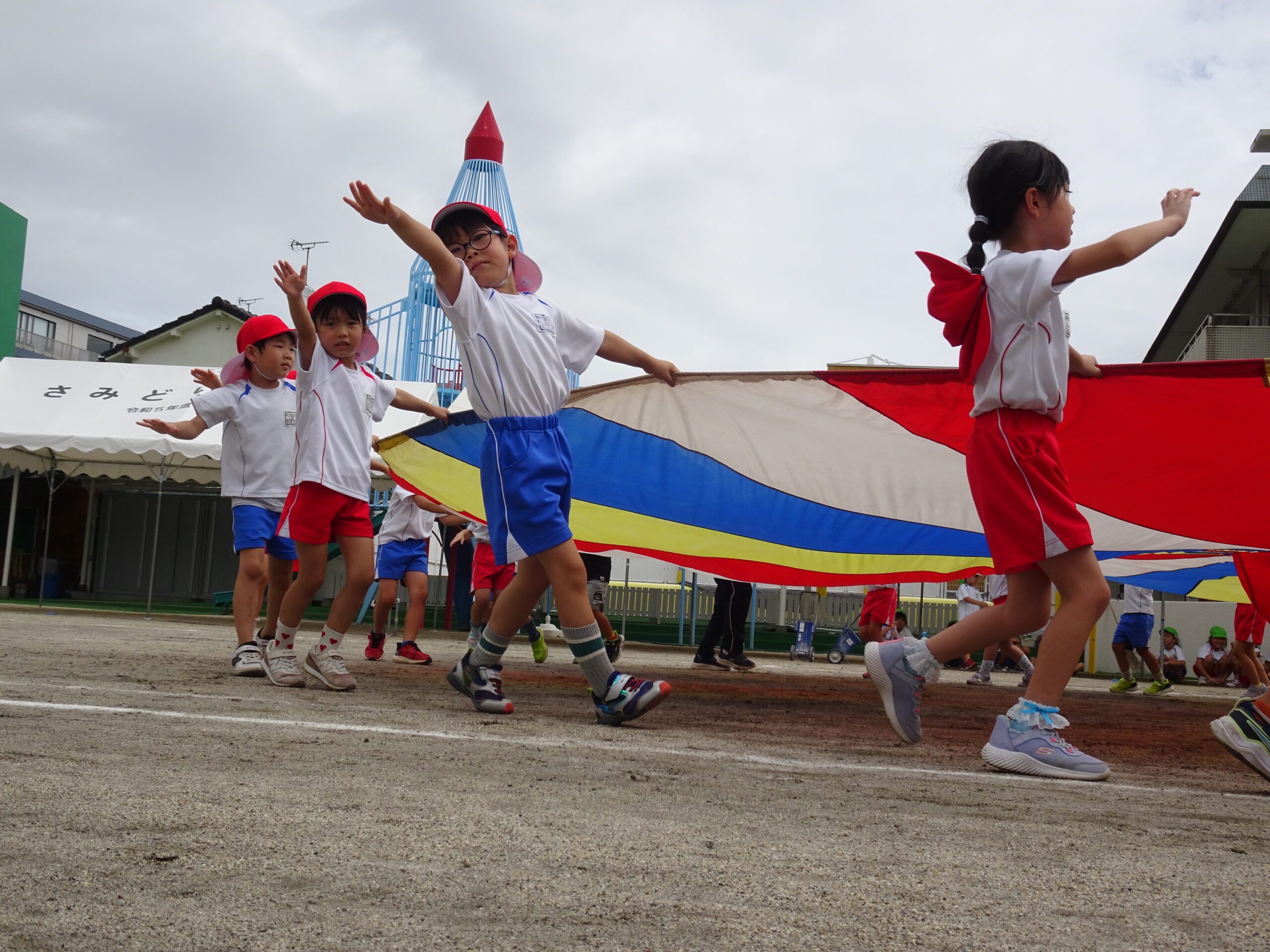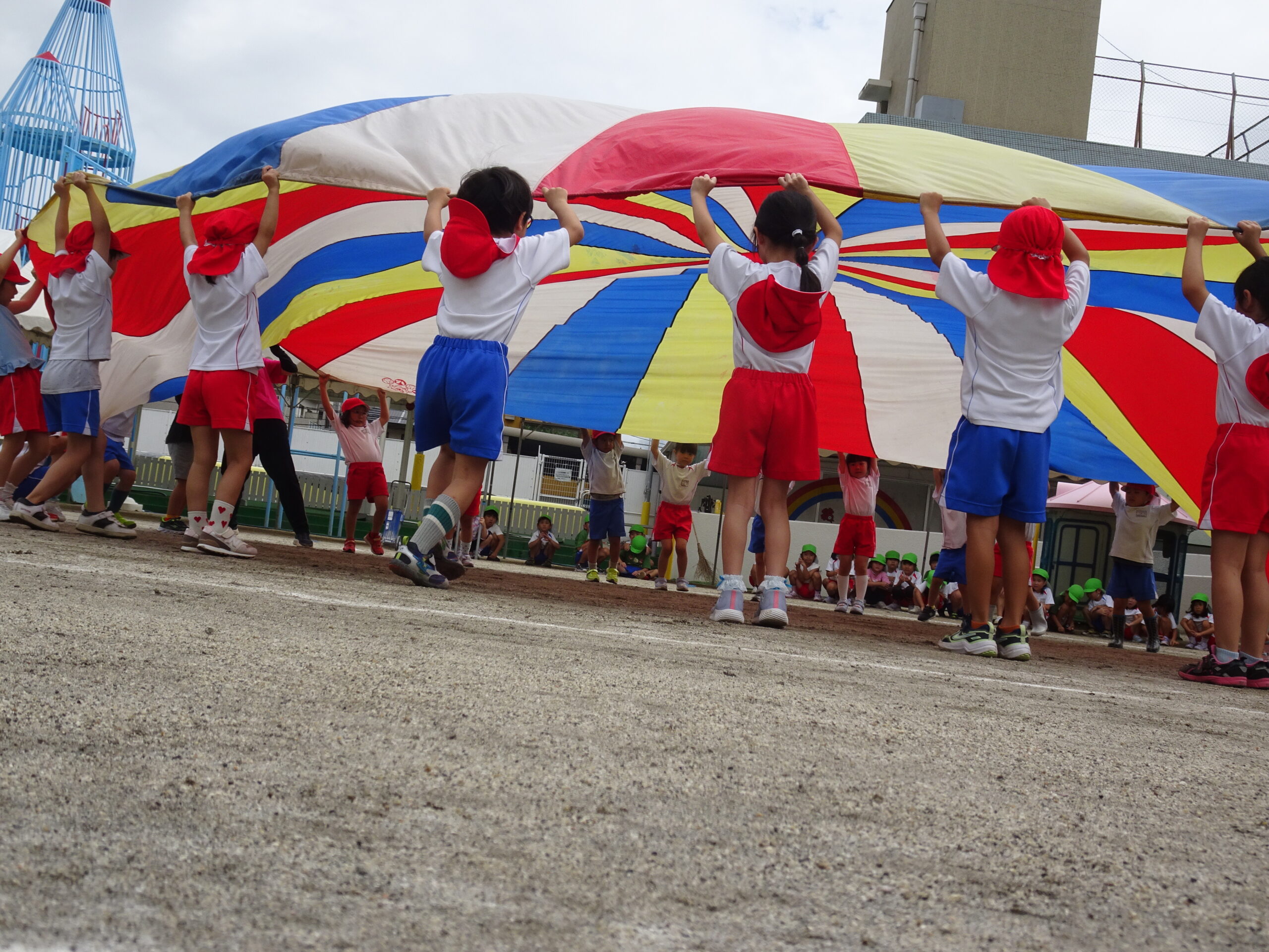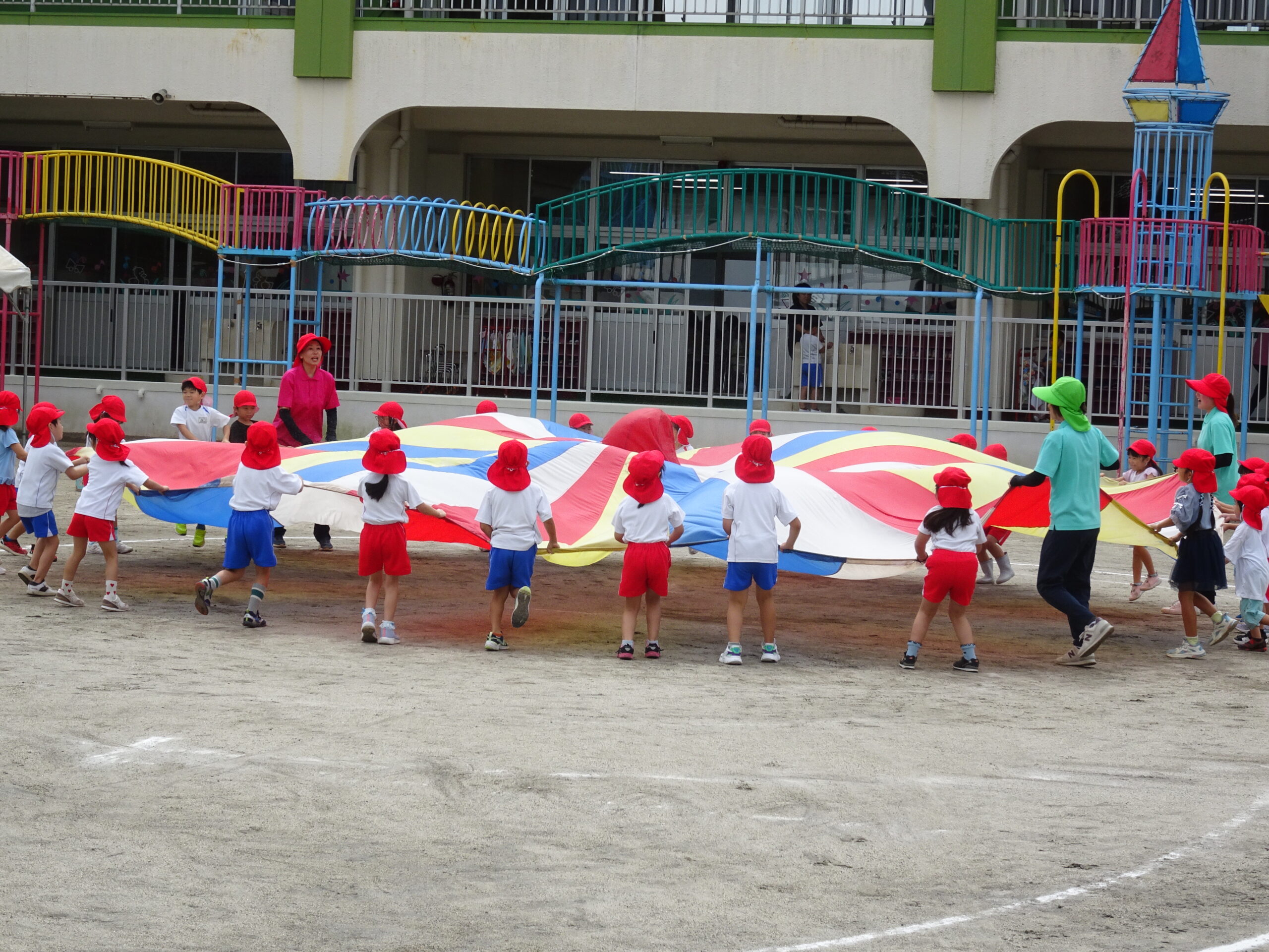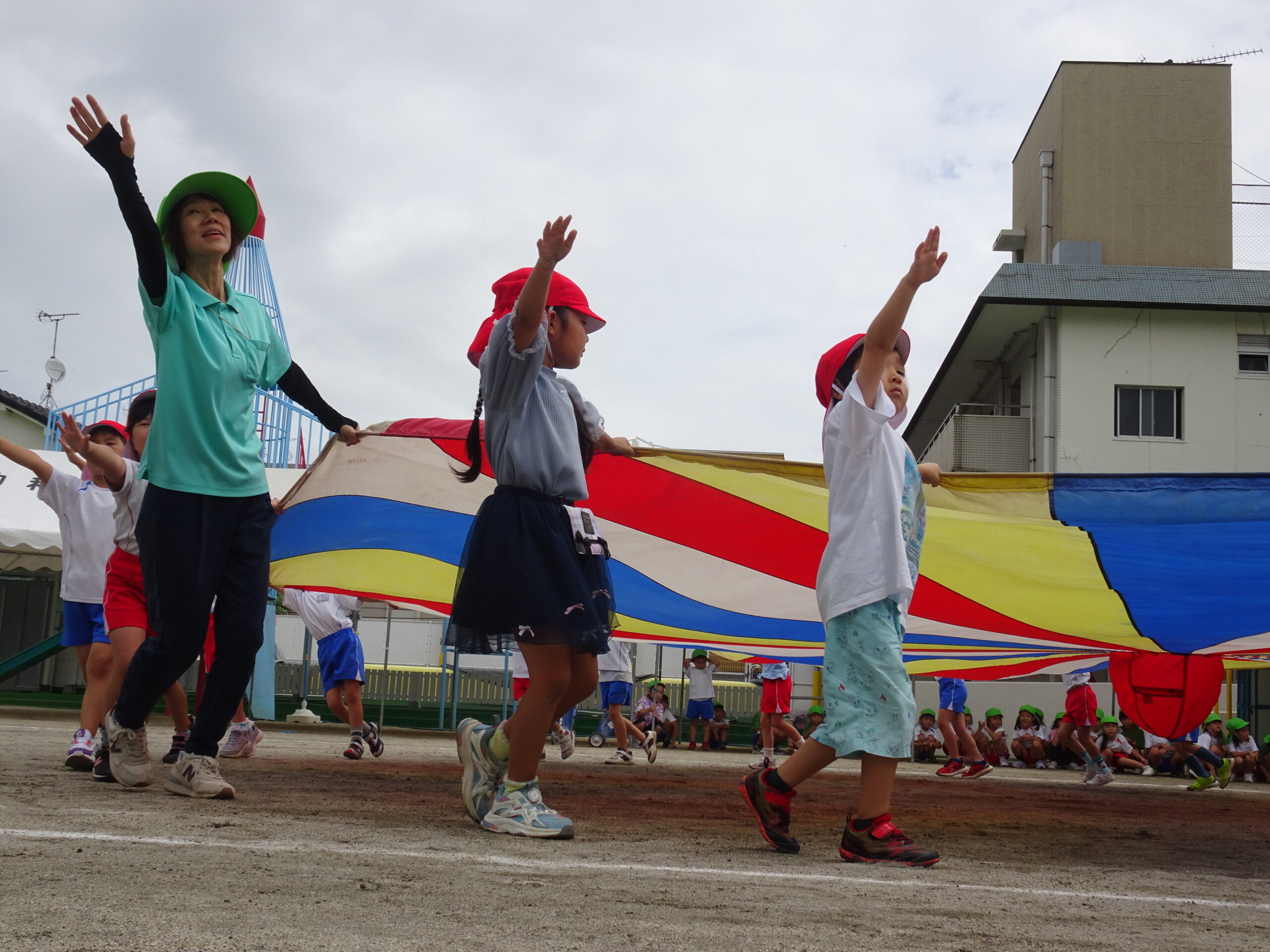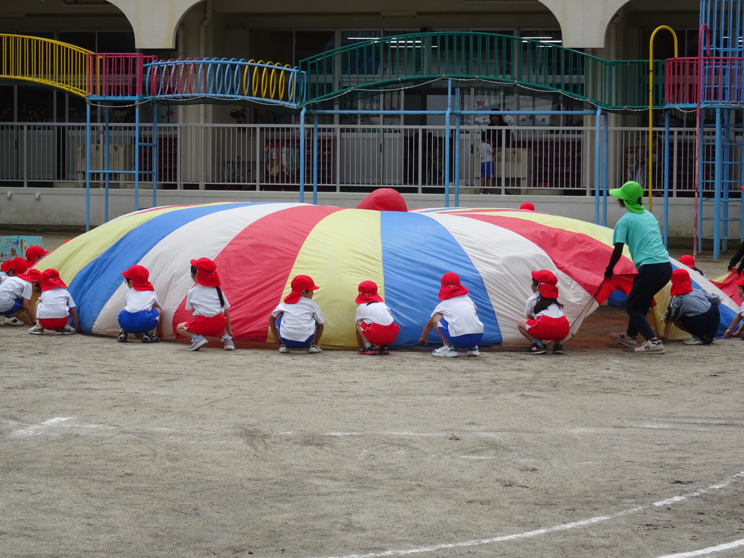 年長さんのバルーンの練習が始まりました。みんなの気持ちを一つにして、バルーンを操ります。熱中症対策として、クラスごとに練習し、お互いの演技を見合う時間として設定してありました。いろいろな指導の工夫をしながら練習していきます。