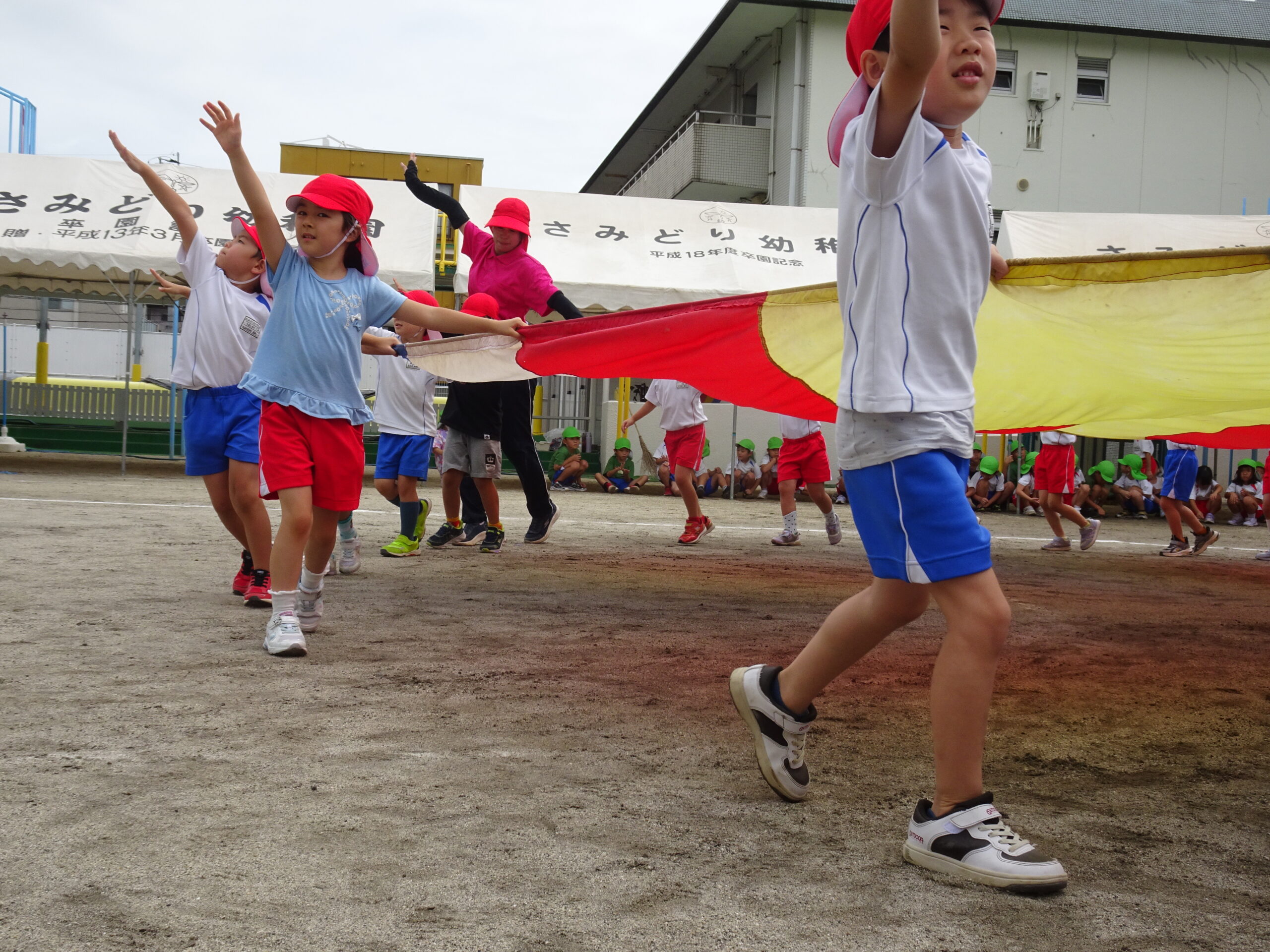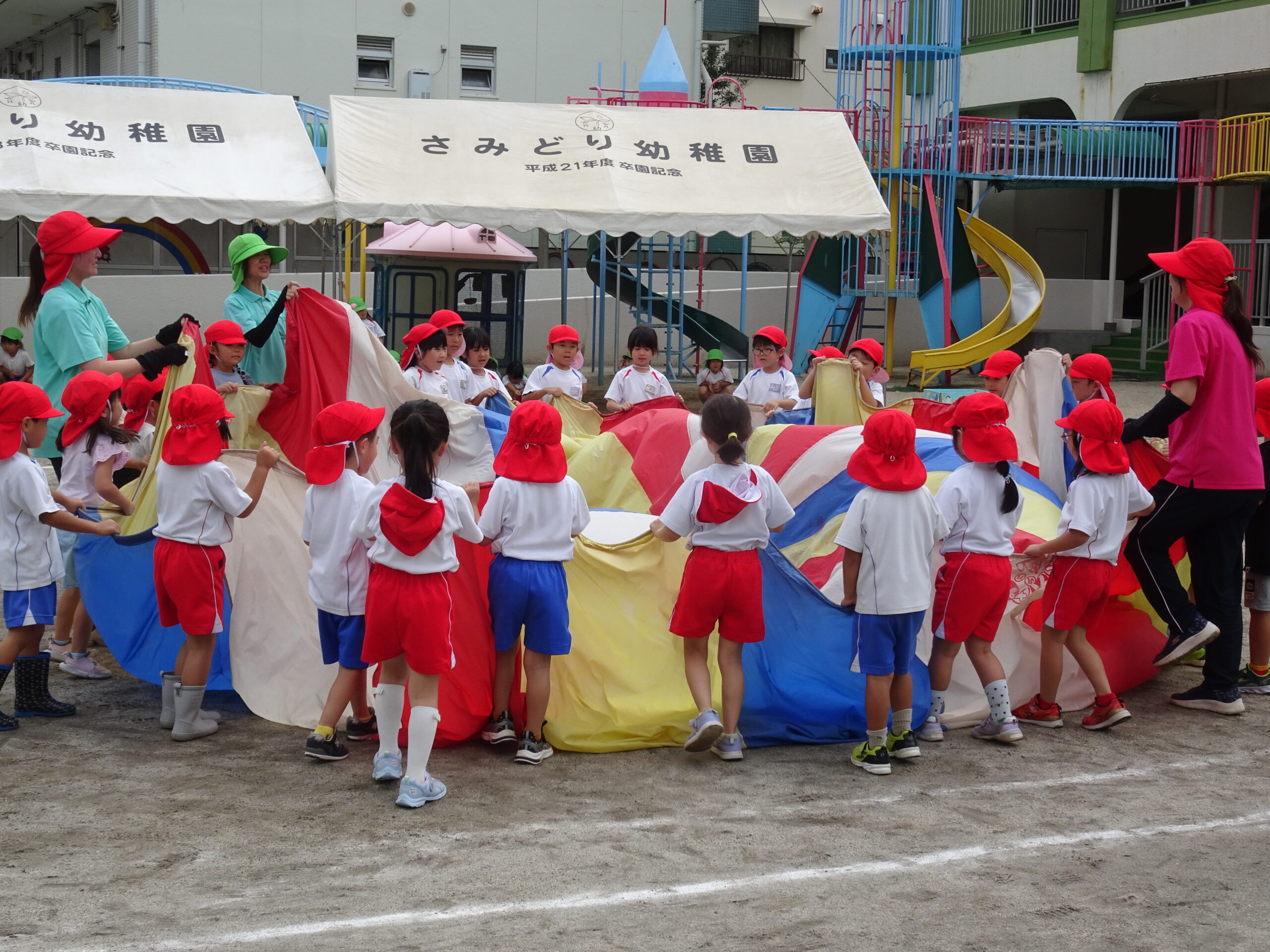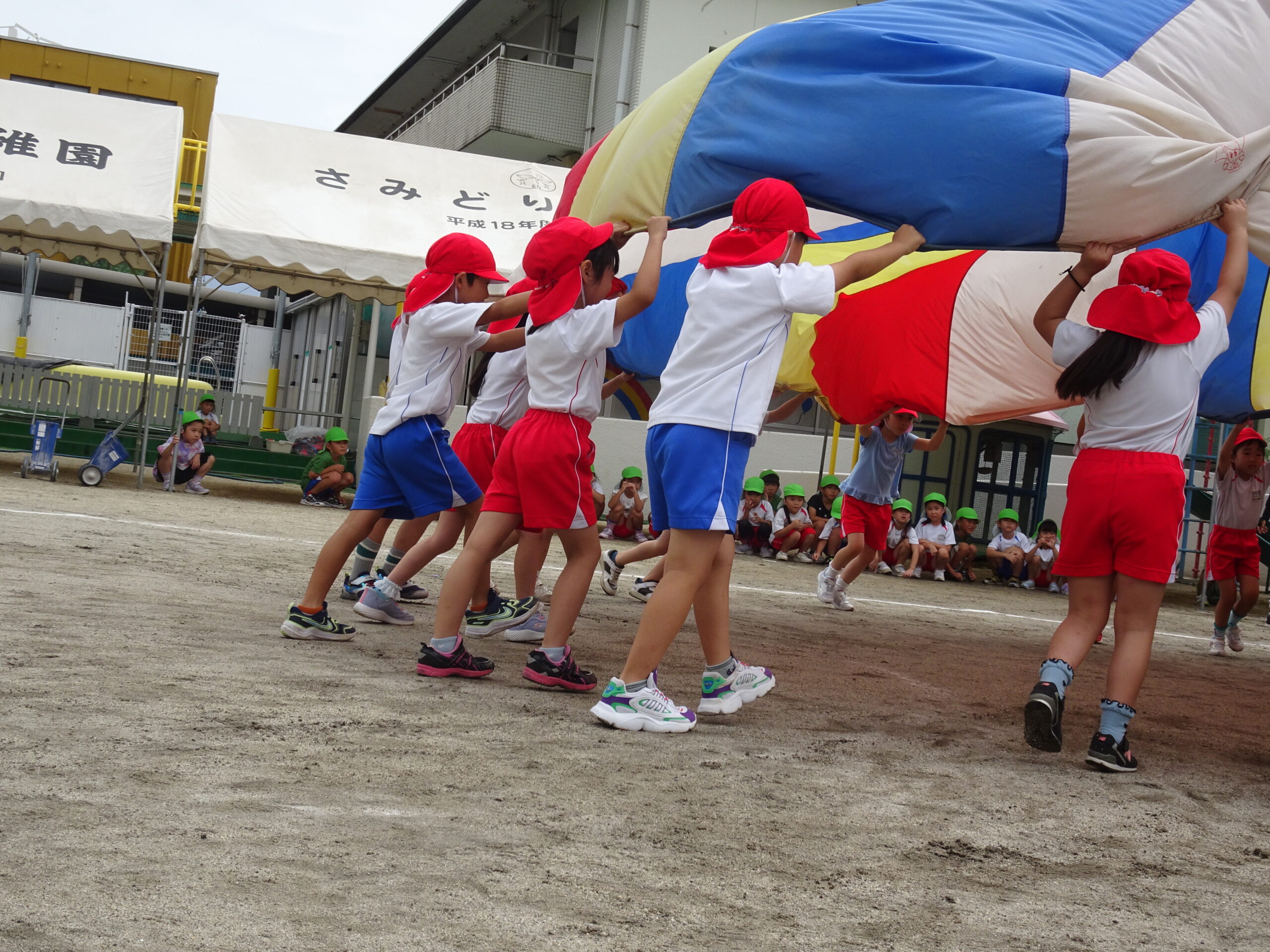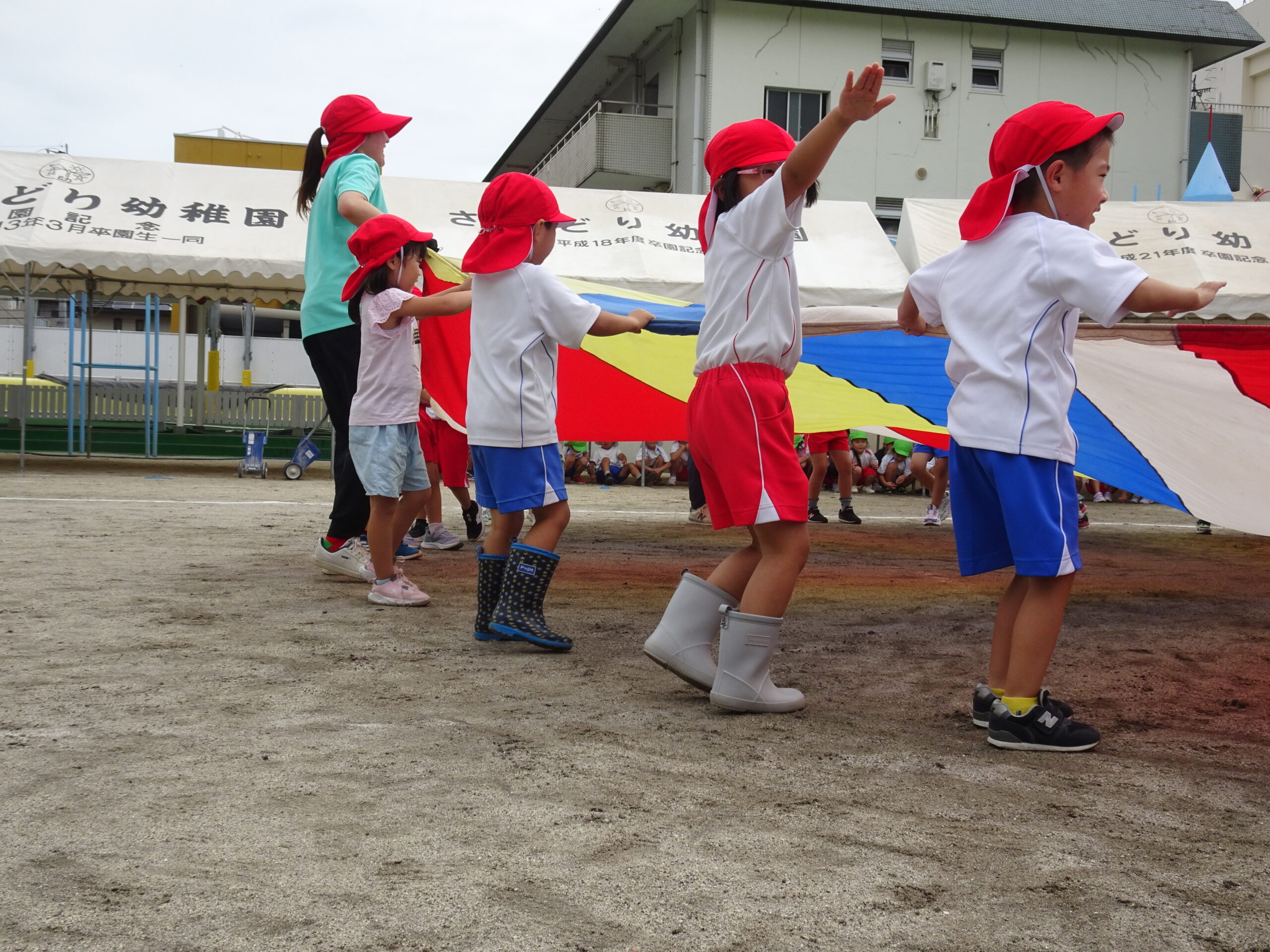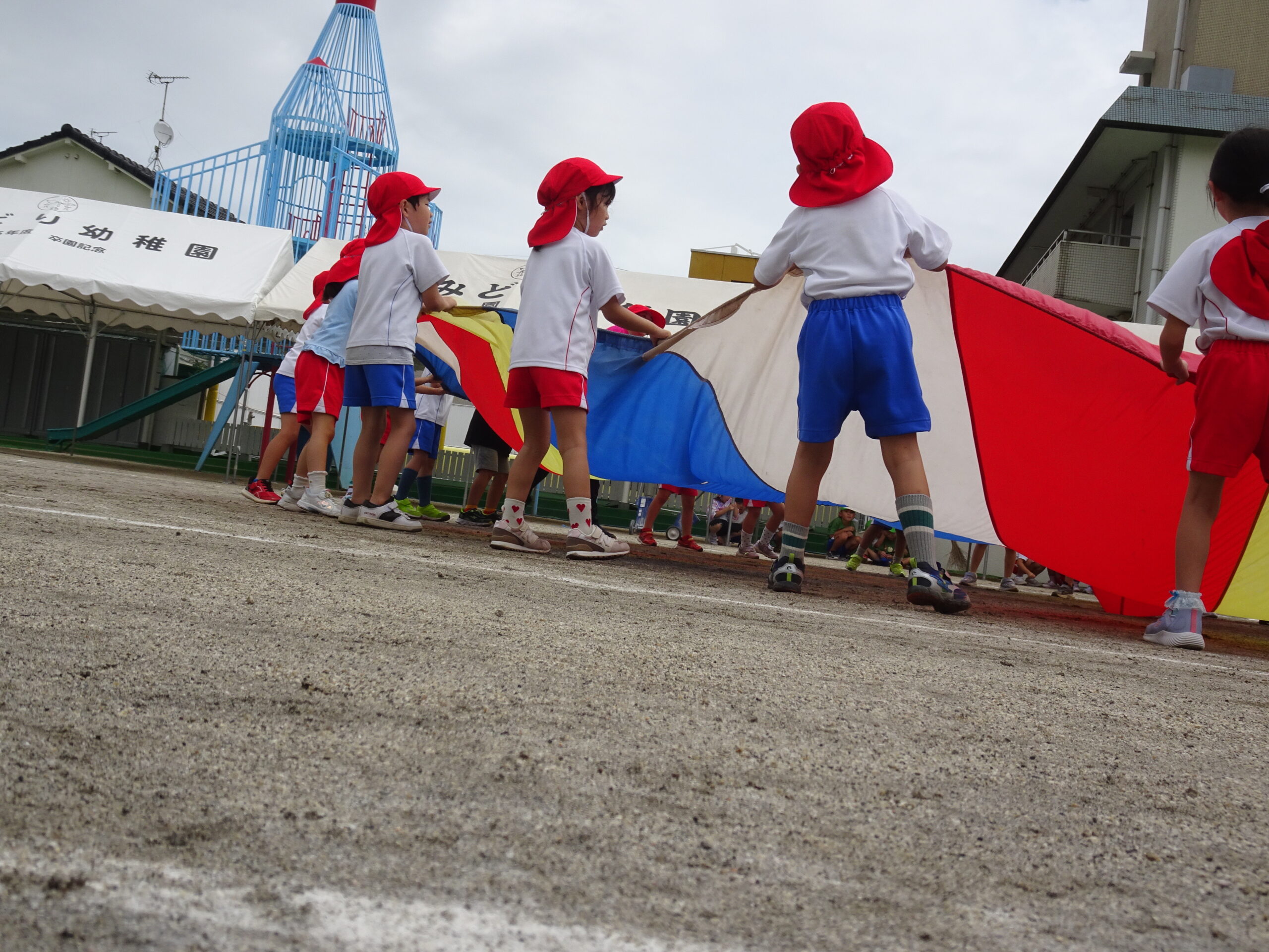 年長さんのバルーンの練習が始まりました。みんなの気持ちを一つにして、バルーンを操ります。熱中症対策として、クラスごとに練習し、お互いの演技を見合う時間として設定してありました。いろいろな指導の工夫をしながら練習していきます。