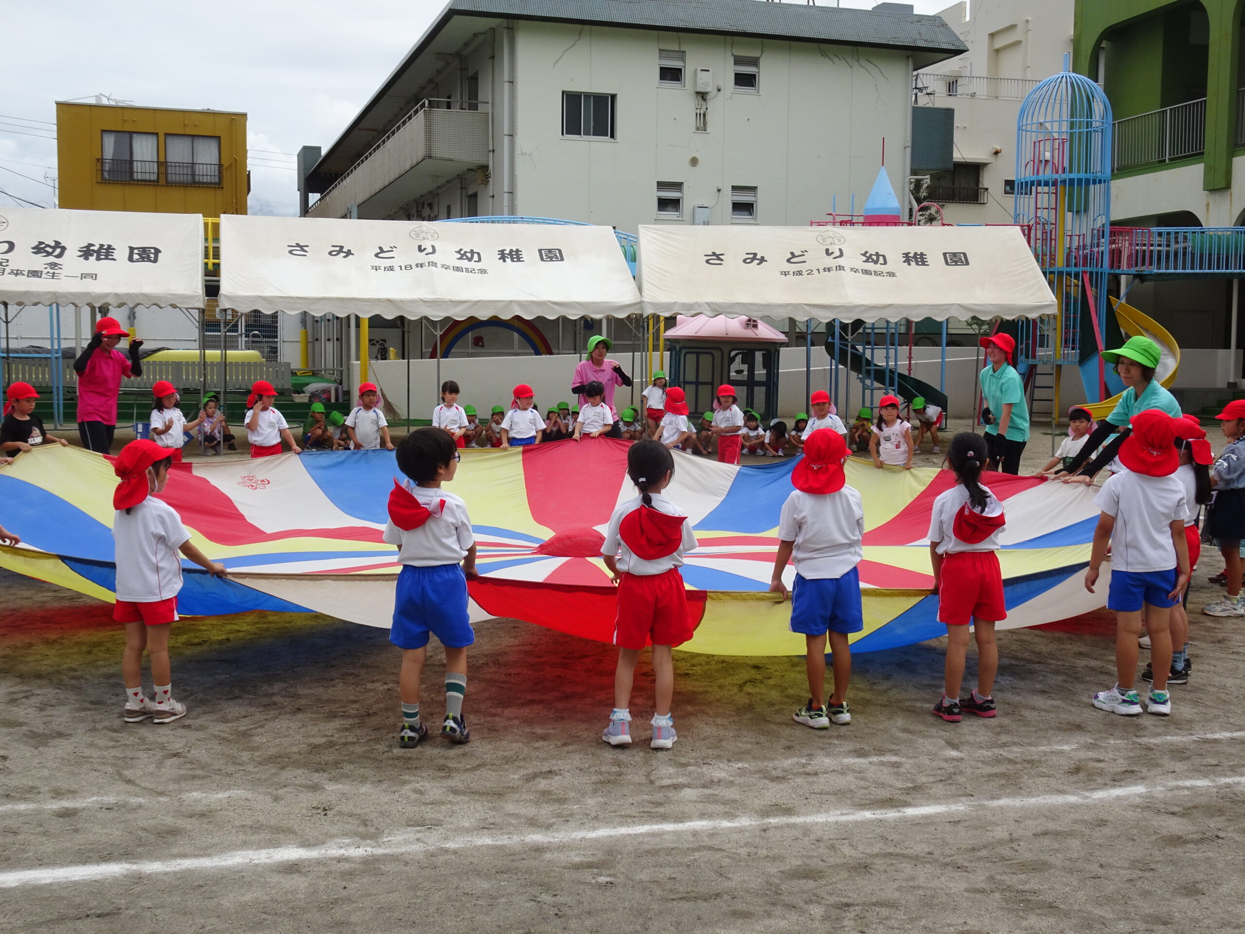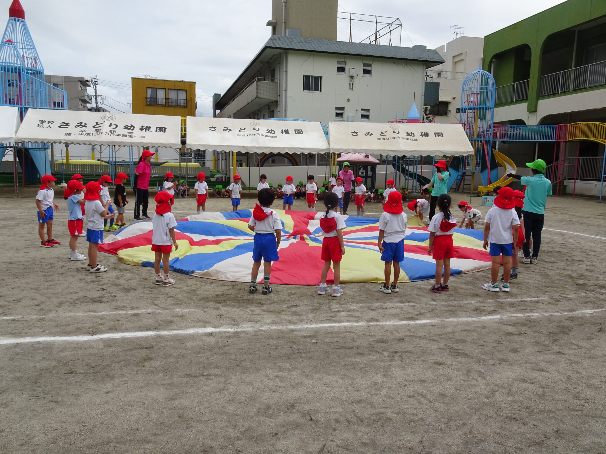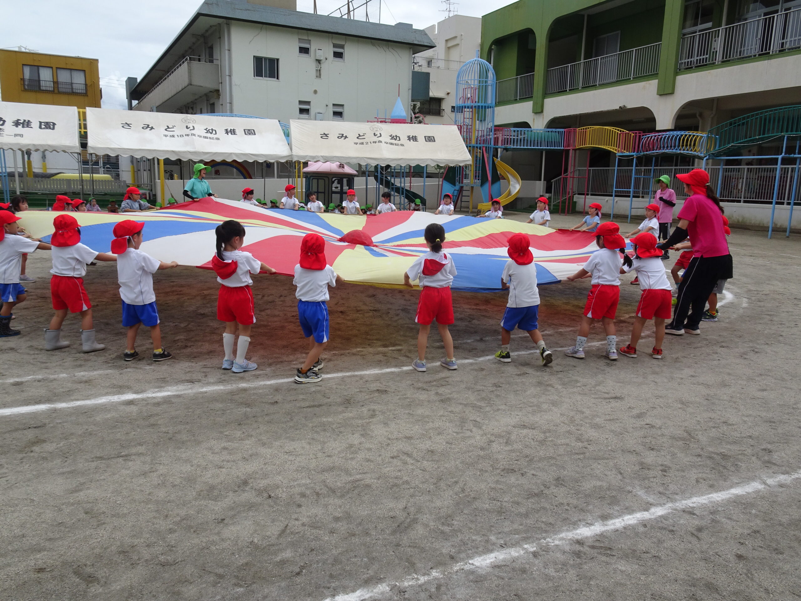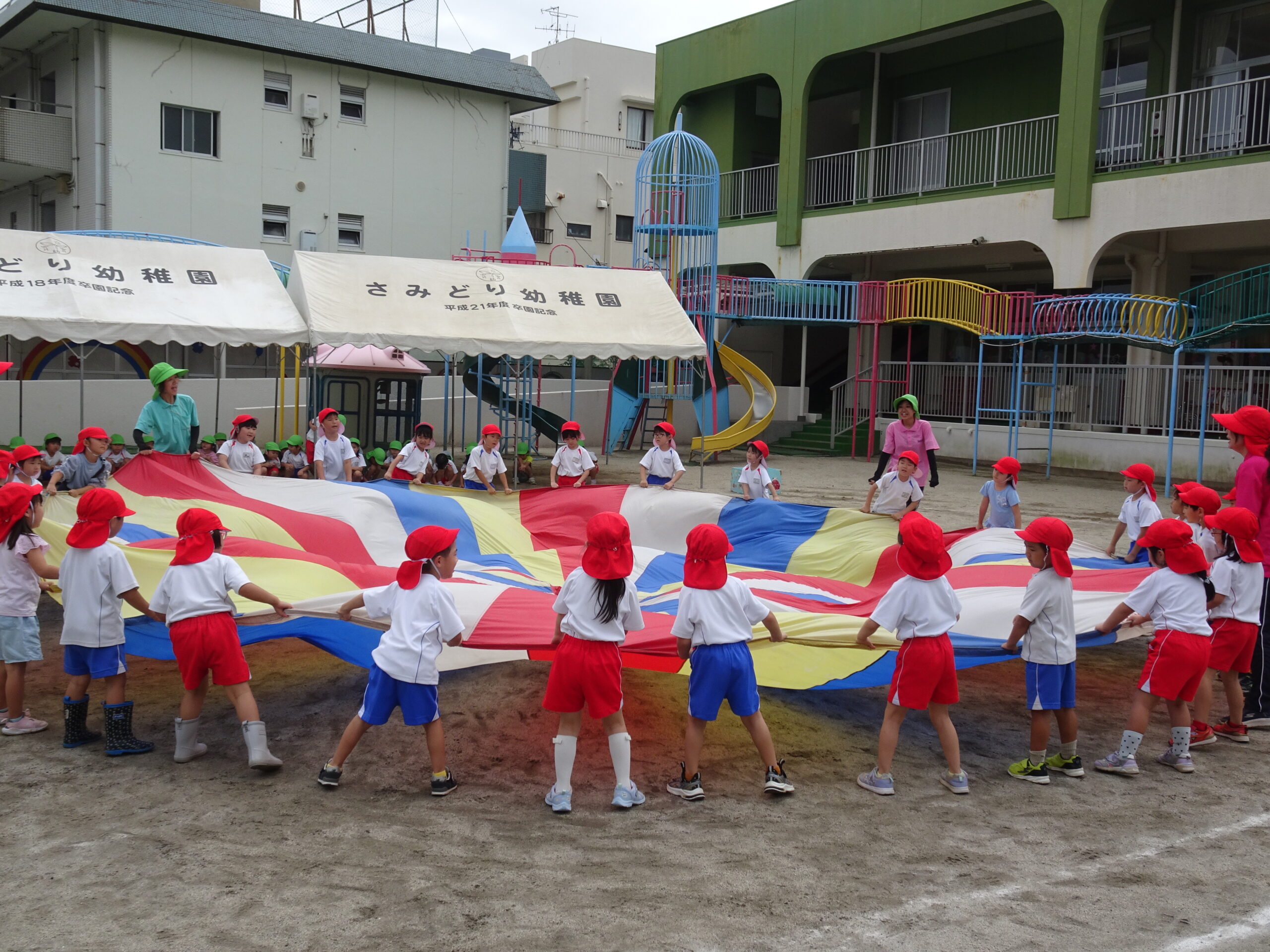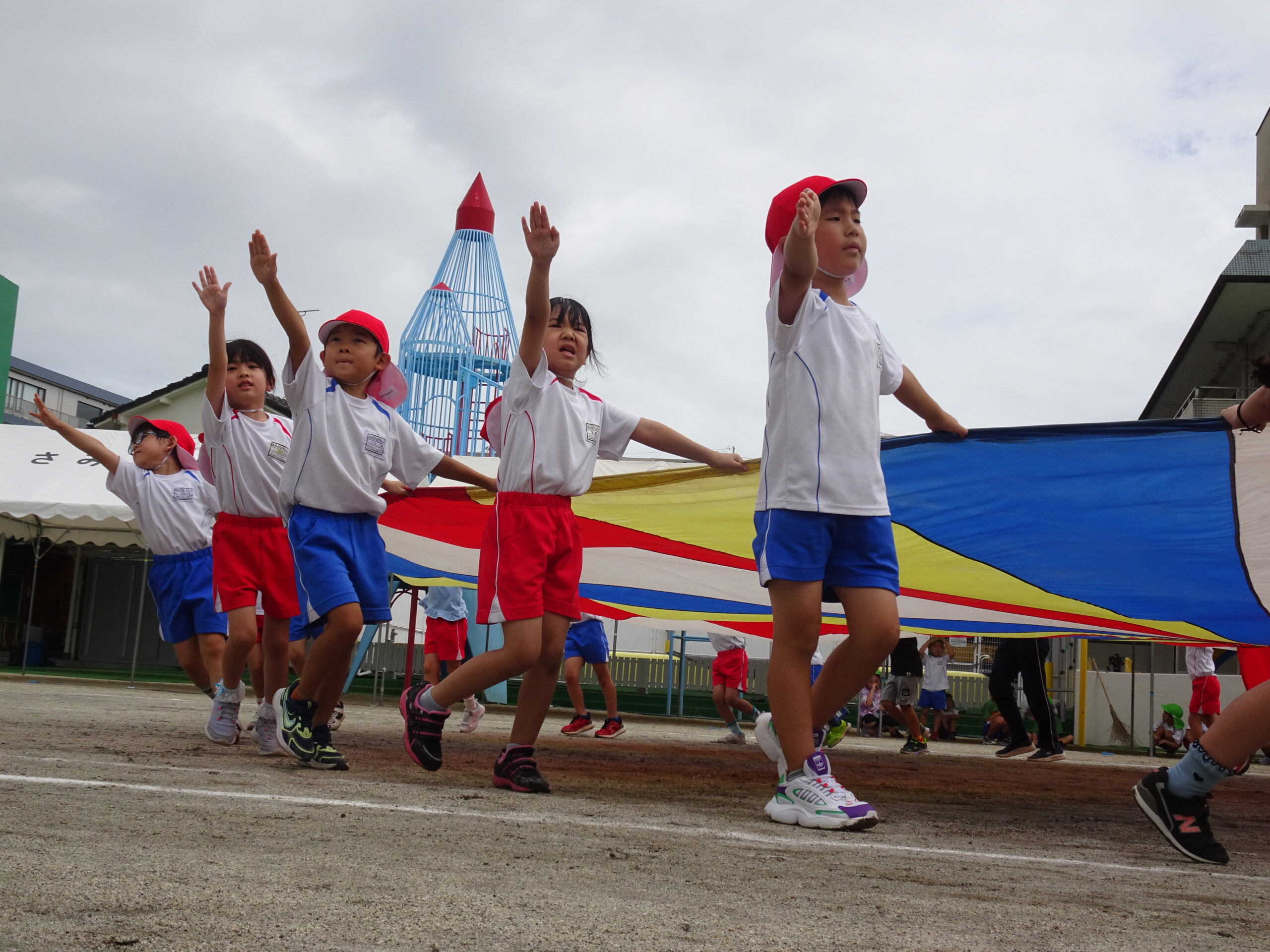 年長さんのバルーンの練習が始まりました。みんなの気持ちを一つにして、バルーンを操ります。熱中症対策として、クラスごとに練習し、お互いの演技を見合う時間として設定してありました。いろいろな指導の工夫をしながら練習していきます。