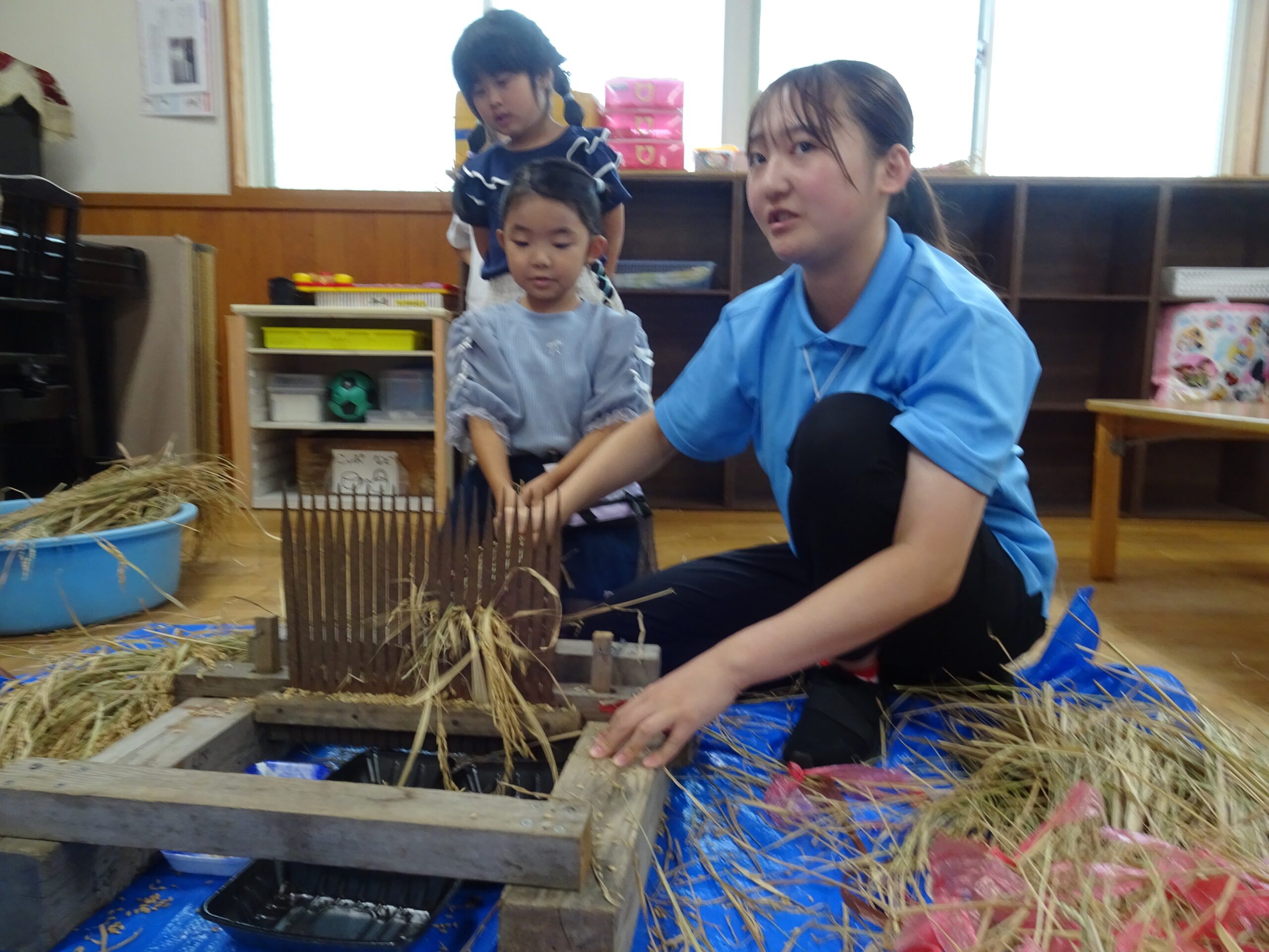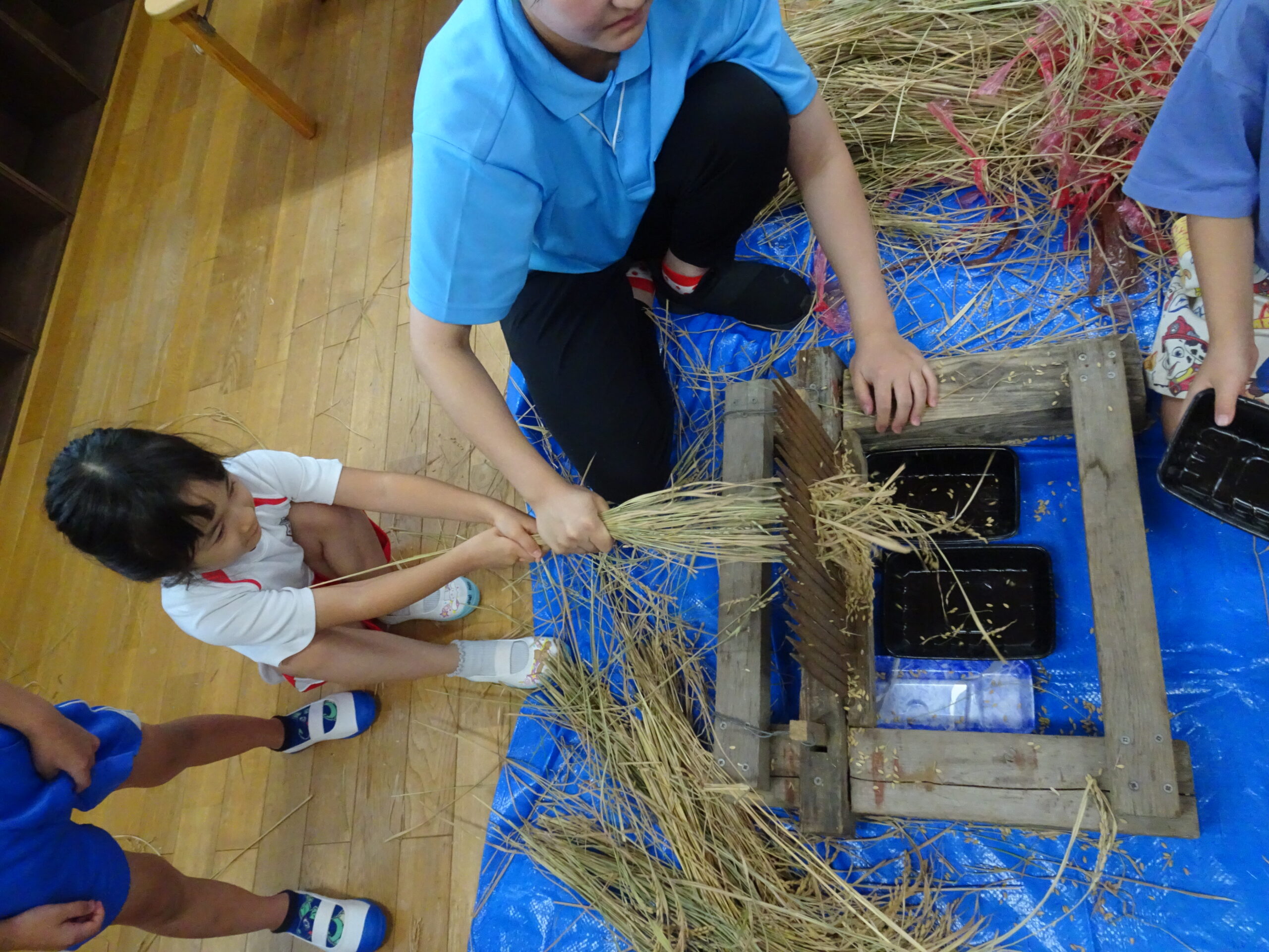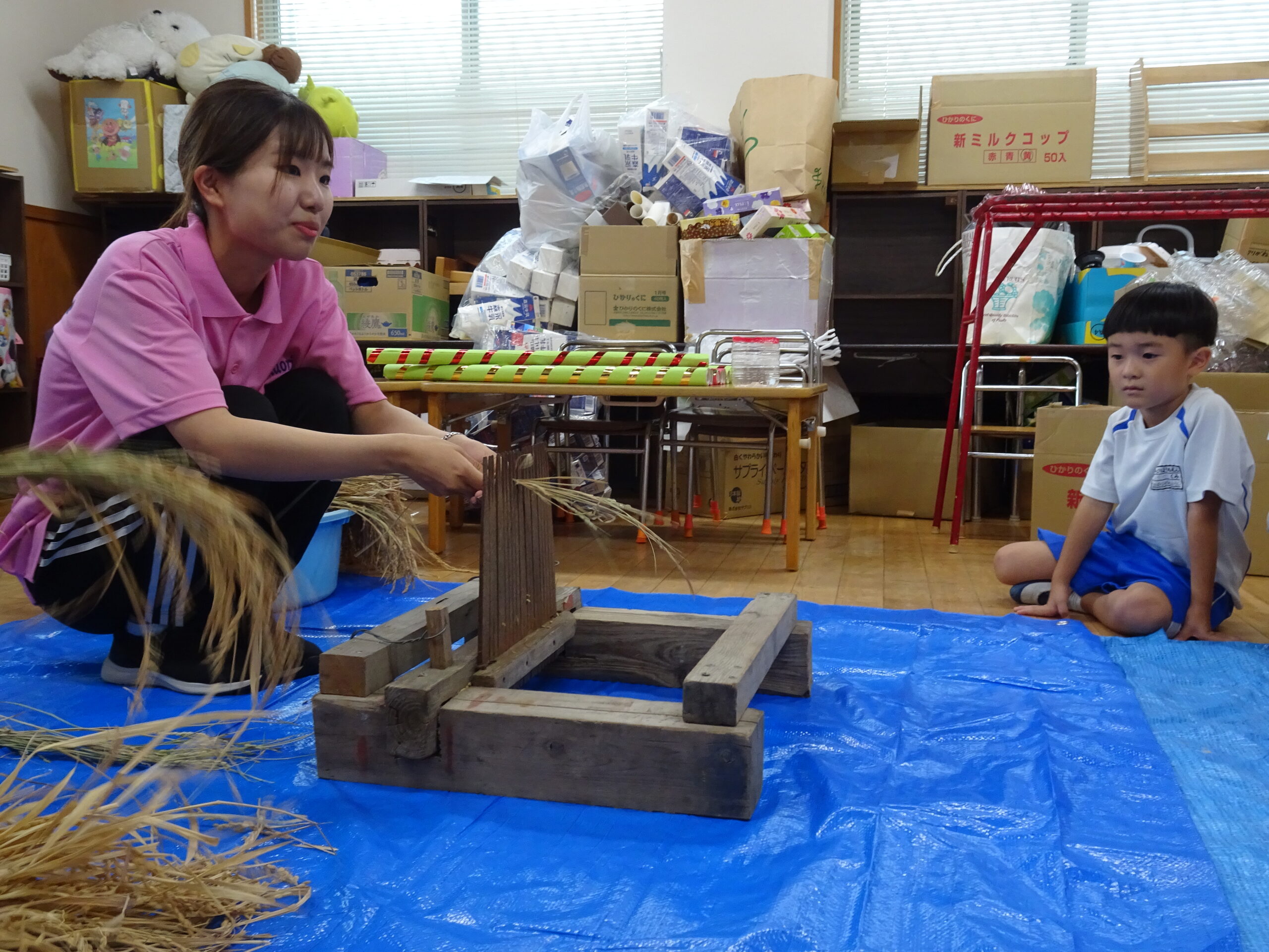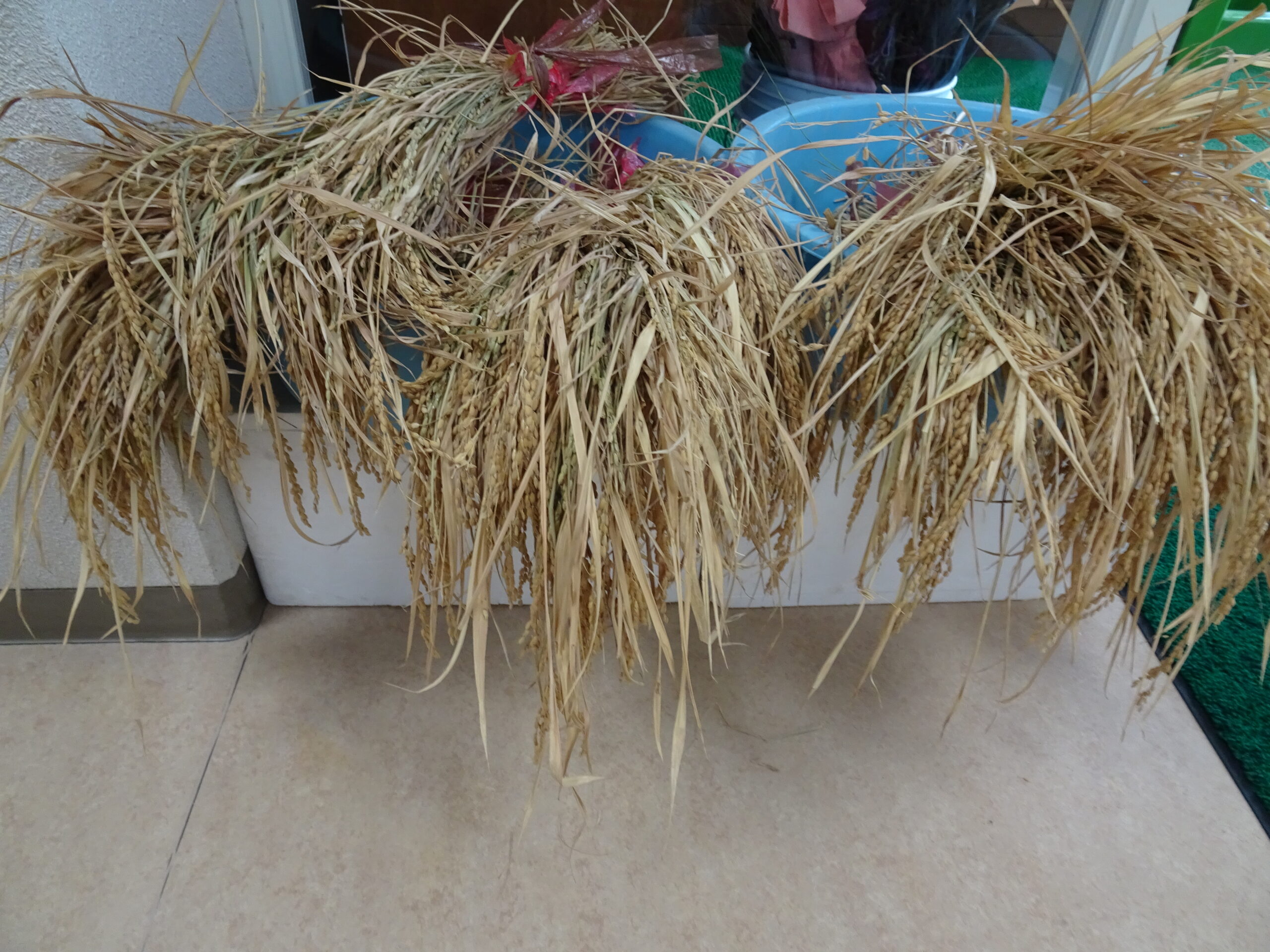 稲刈りして乾燥させておいた稲の脱穀をしました。脱穀をする機械は千歯扱きです。写真をご覧ください。これまでは割り箸に稲穂を挟んですぐいていましたが、今回は千歯扱きを使いました。あっという間に脱穀が終わりました。「十五夜」の集会にも稲穂とお米を飾ります。