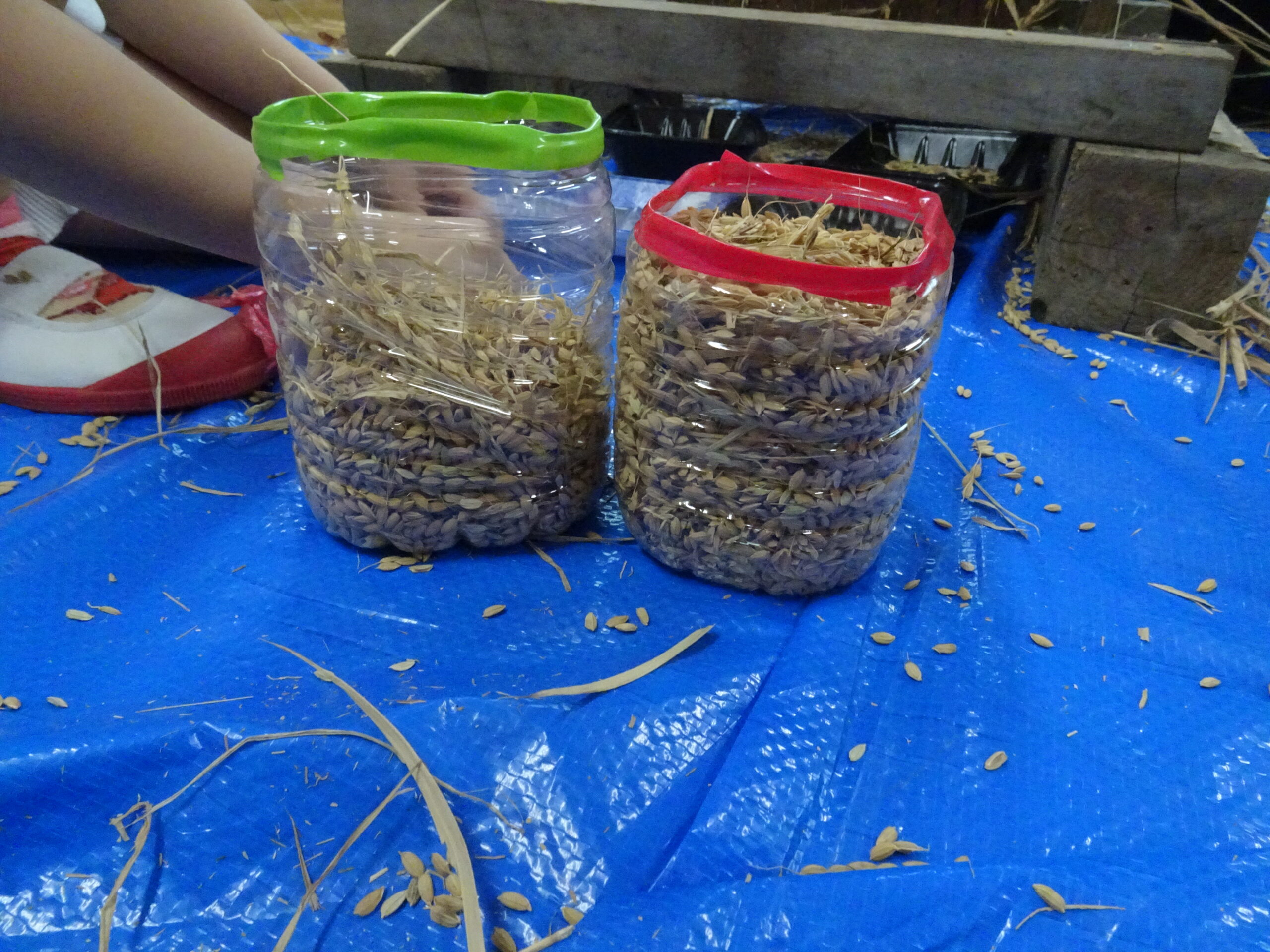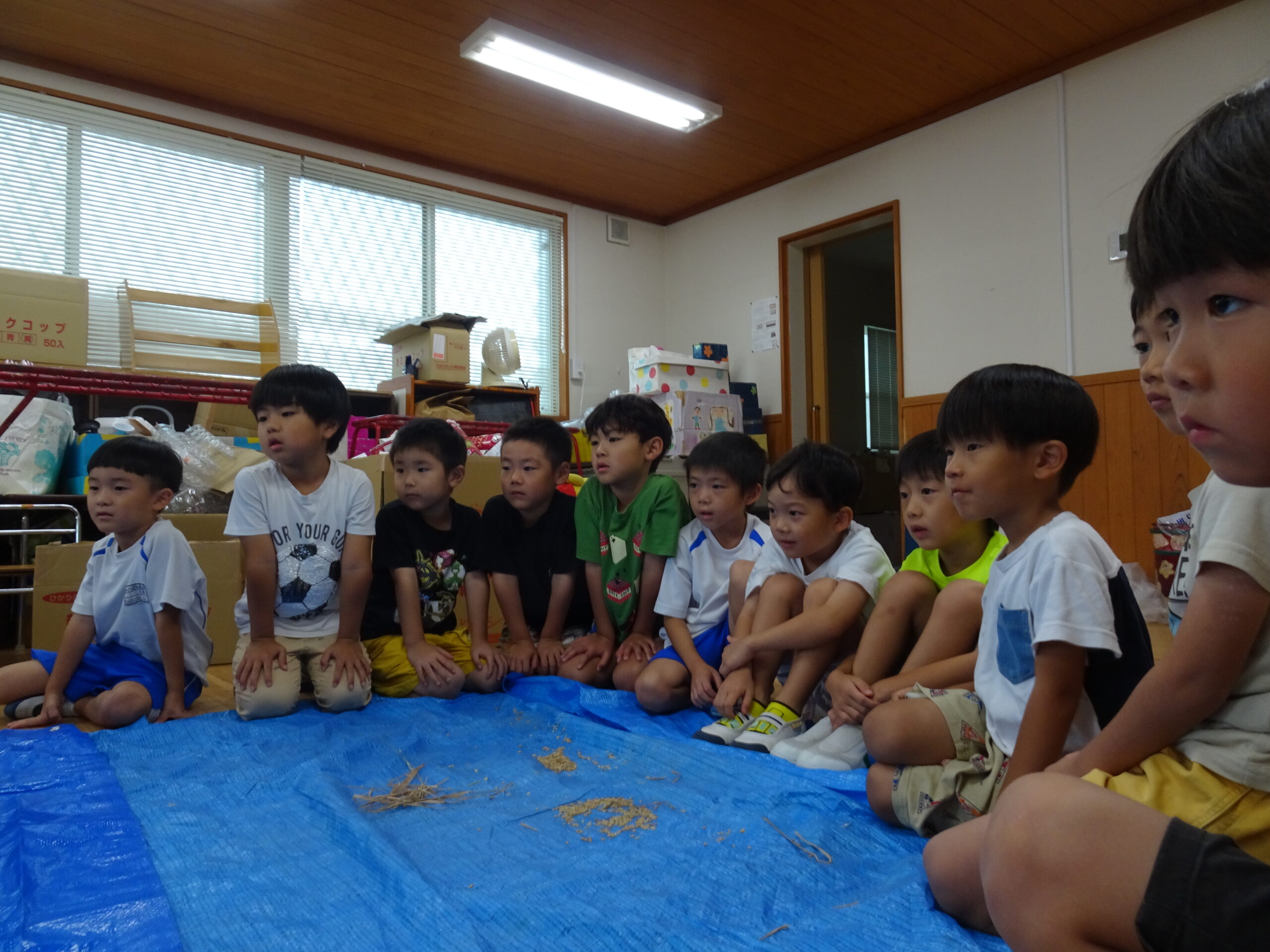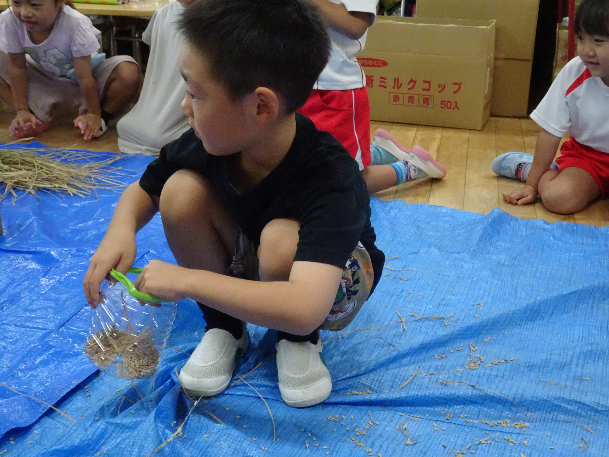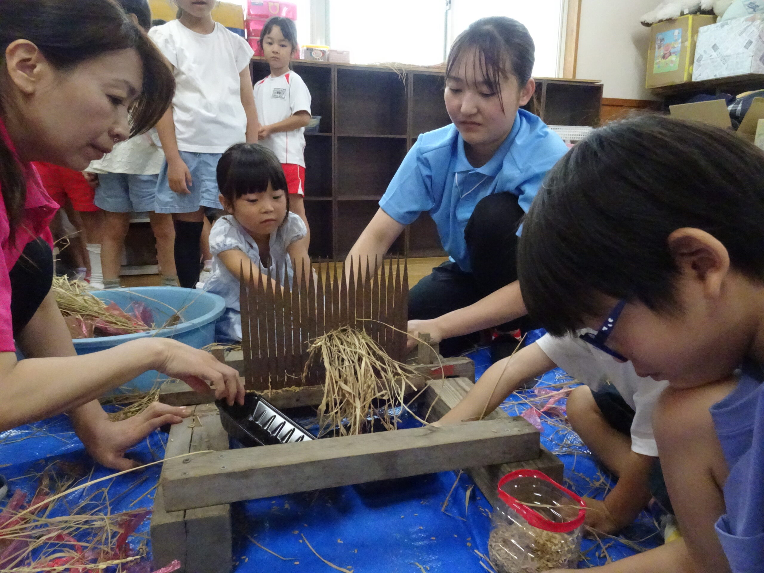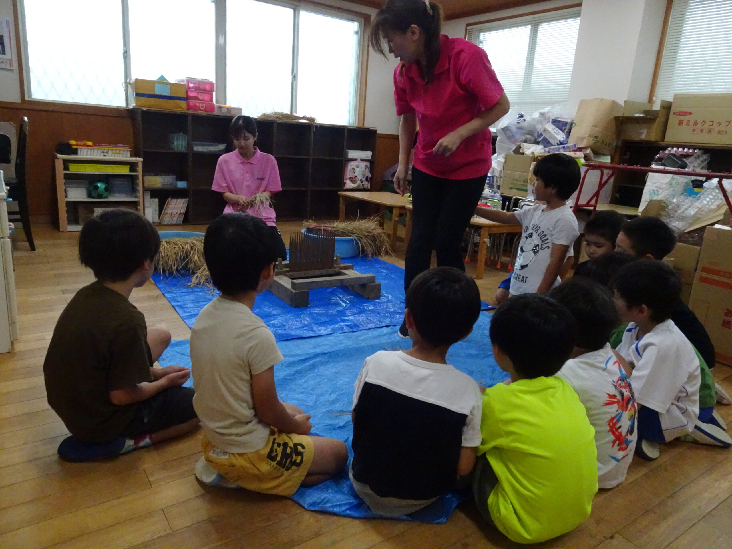 稲刈りして乾燥させておいた稲の脱穀をしました。脱穀をする機械は千歯扱きです。写真をご覧ください。これまでは割り箸に稲穂を挟んですぐいていましたが、今回は千歯扱きを使いました。あっという間に脱穀が終わりました。「十五夜」の集会にも稲穂とお米を飾ります。