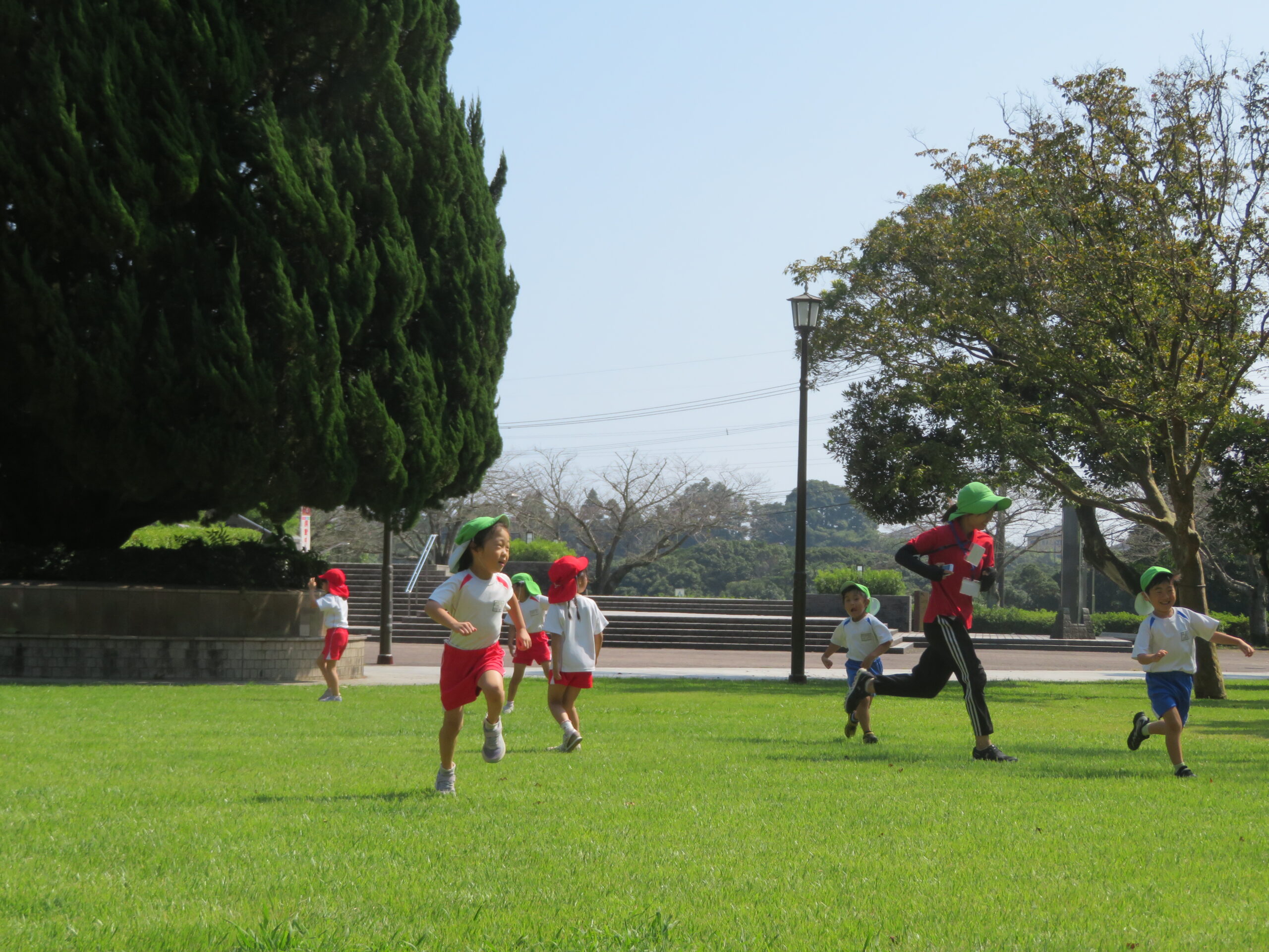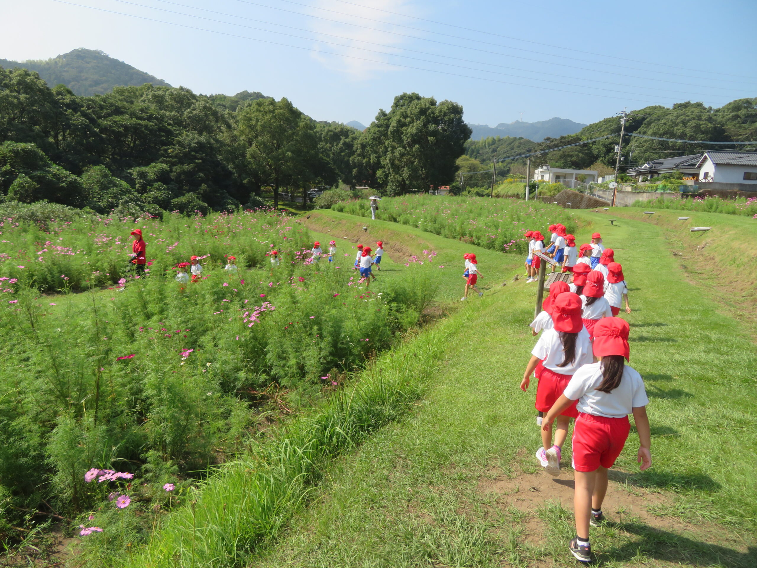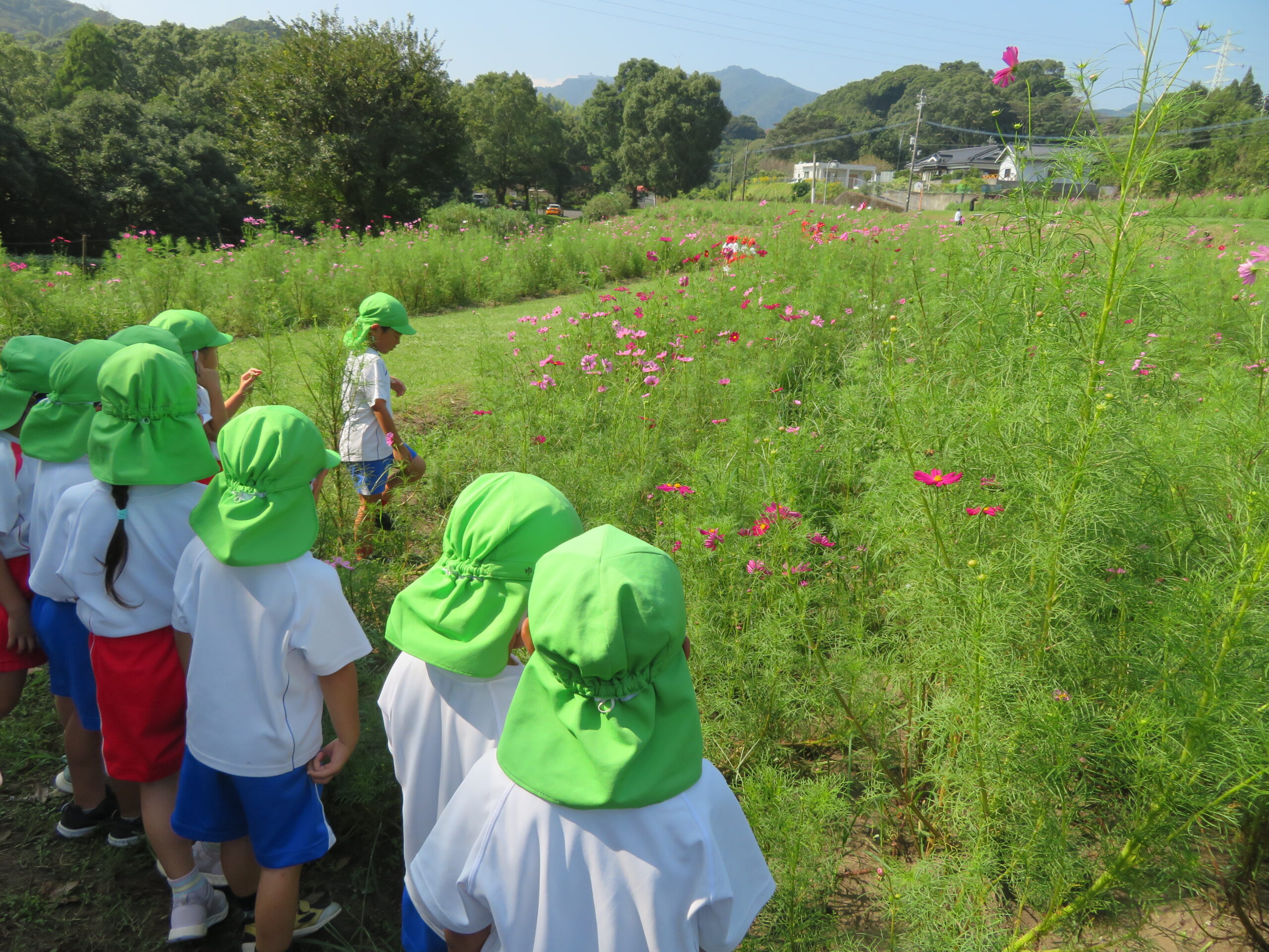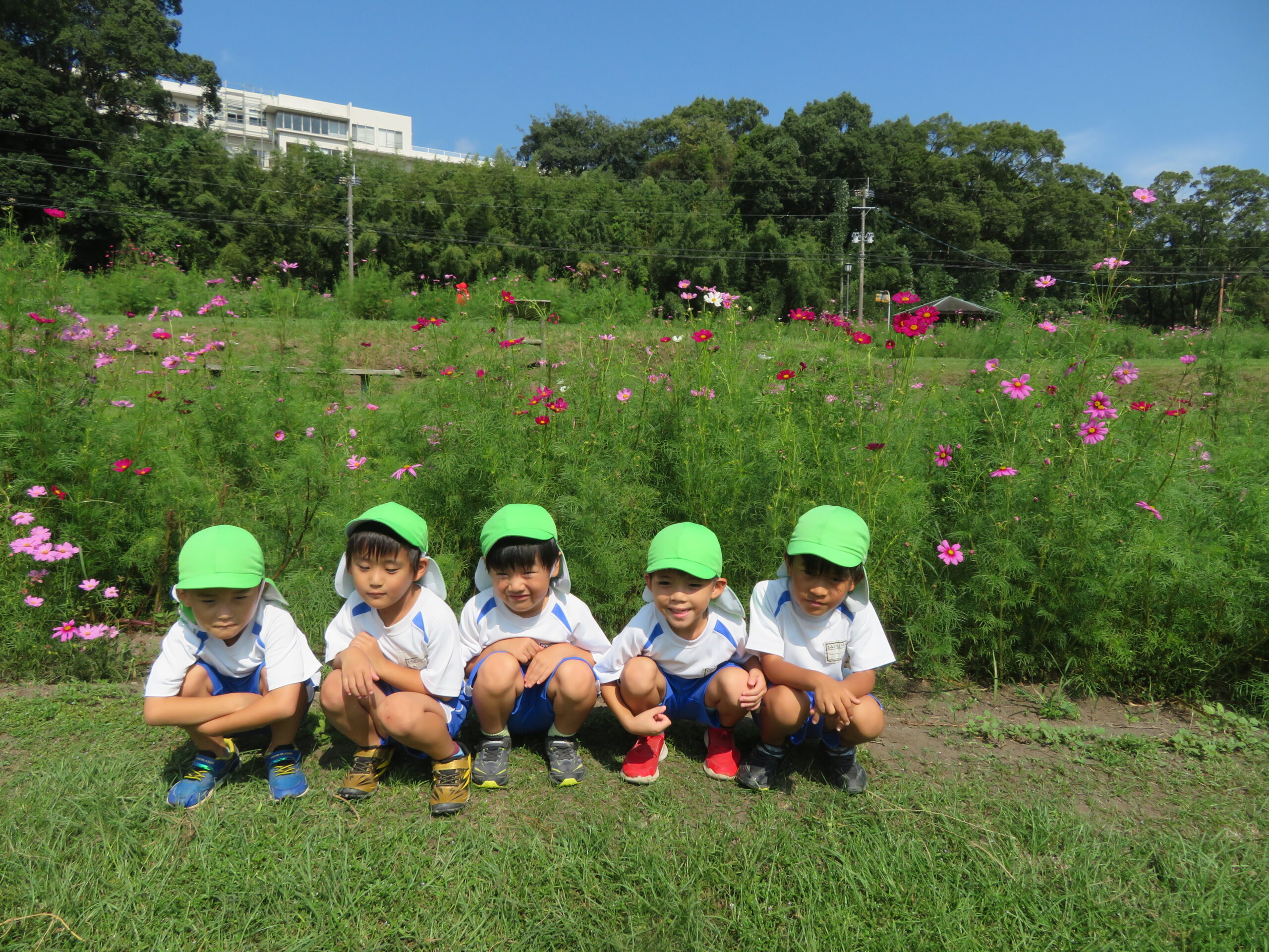 10月17日(金)、年長さんの園外保育「秋の自然を探しに行こう」がありました。慈眼寺公園の木々や草花に触れ、木の実や葉を集めたり、コスモス畑を散策したりして秋の自然に親しみました。