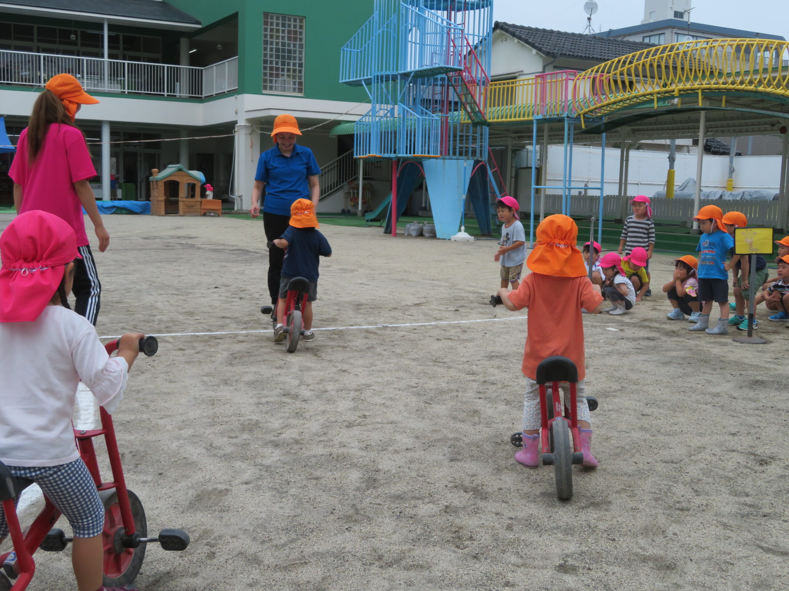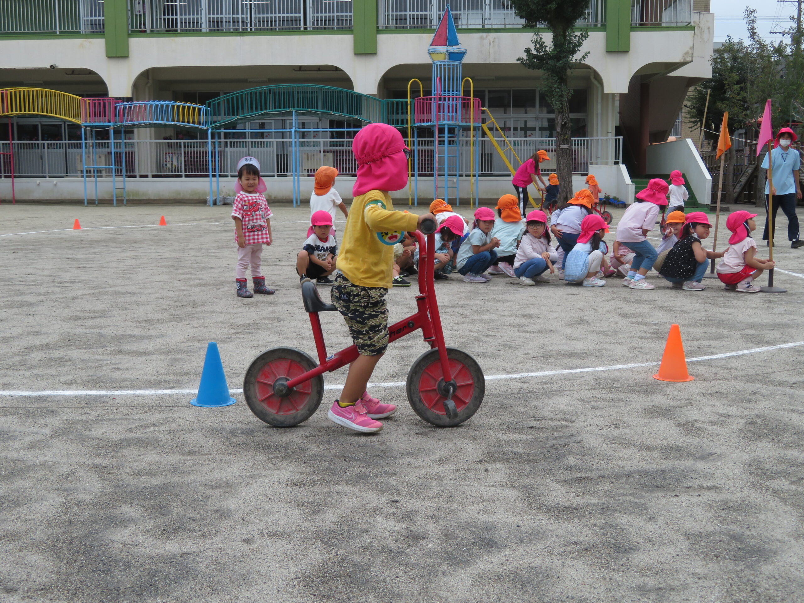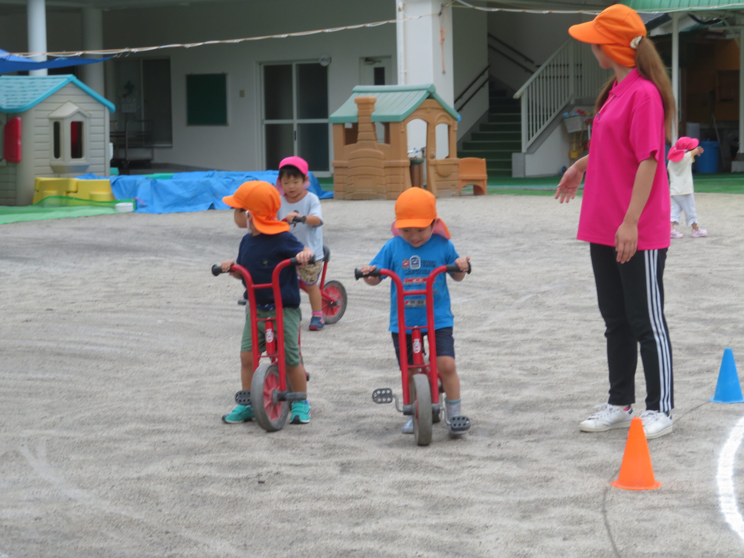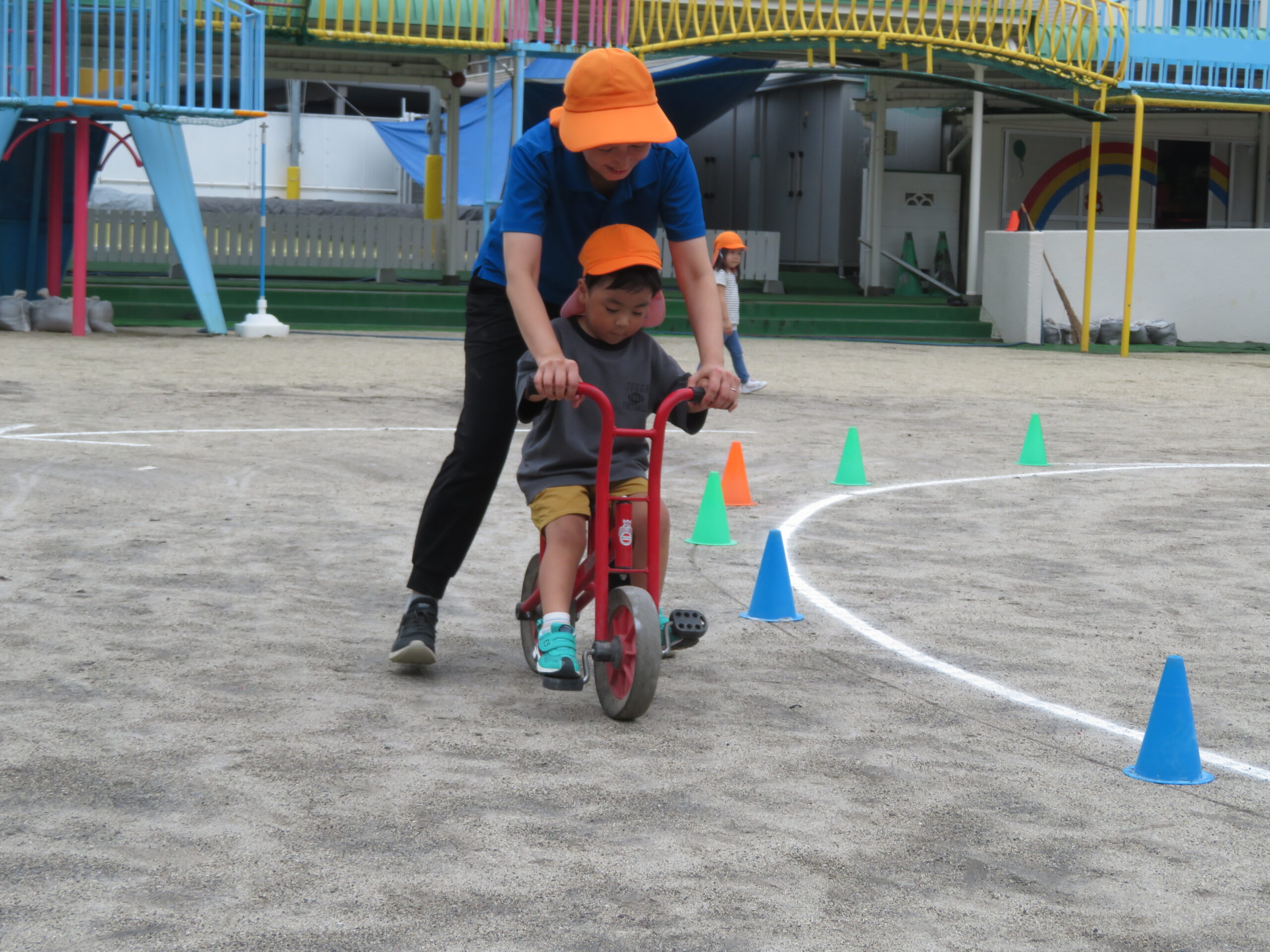 年少さんが初めての二輪車の練習をしました。次回から、活動Ⅰの時間に、二輪車が配置されます。そのための練習です。