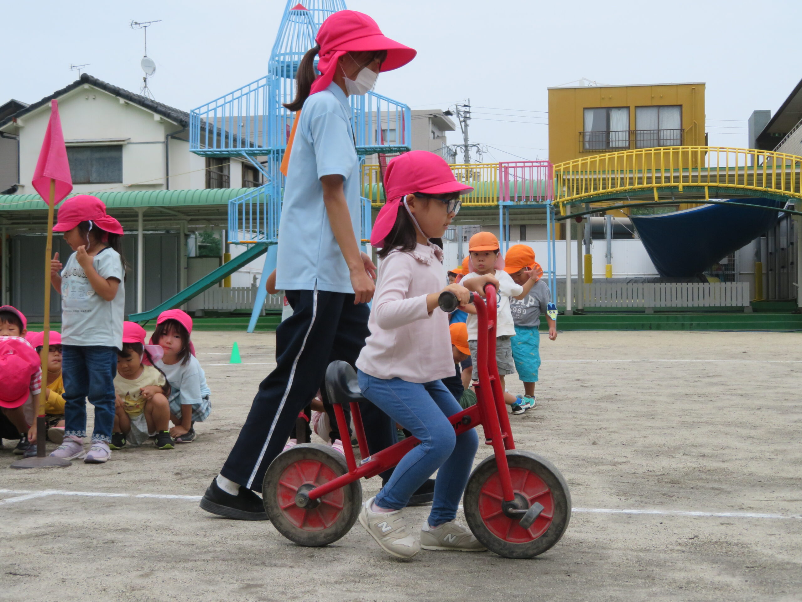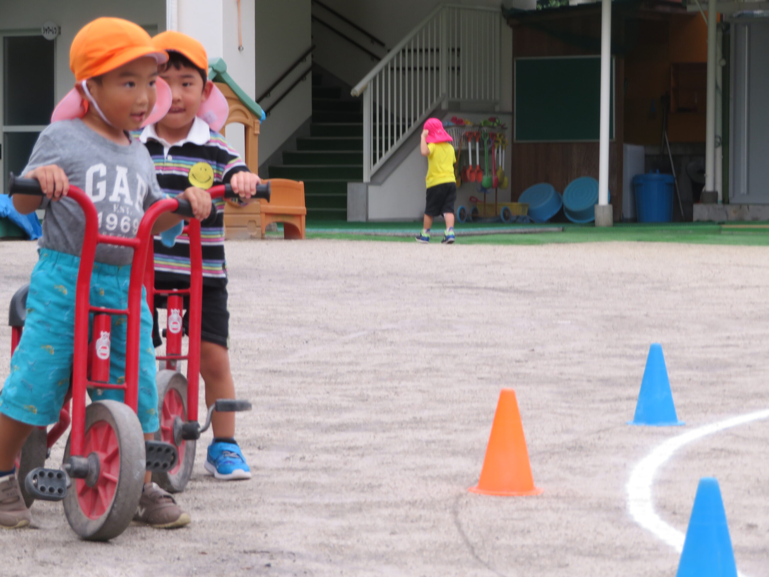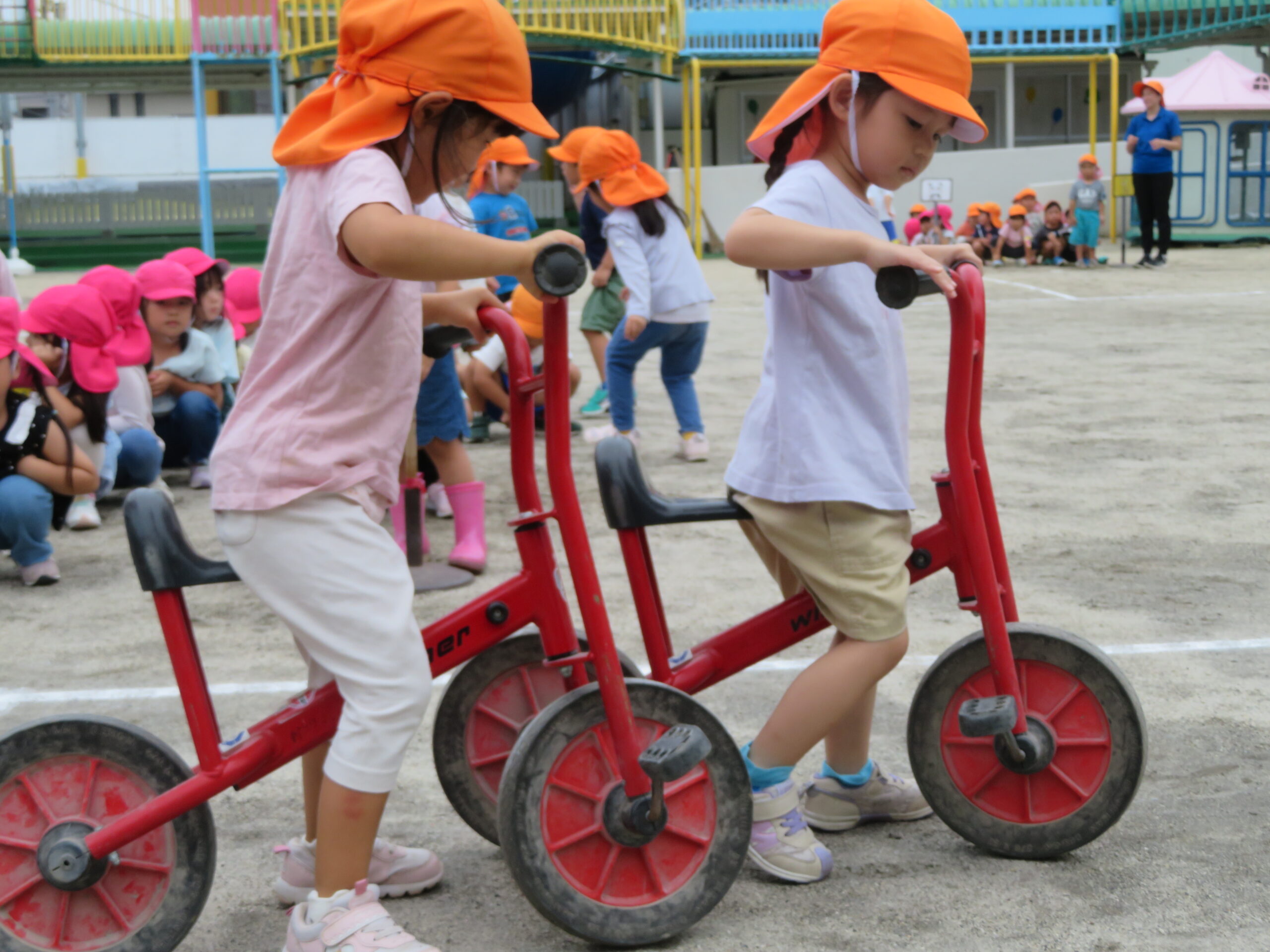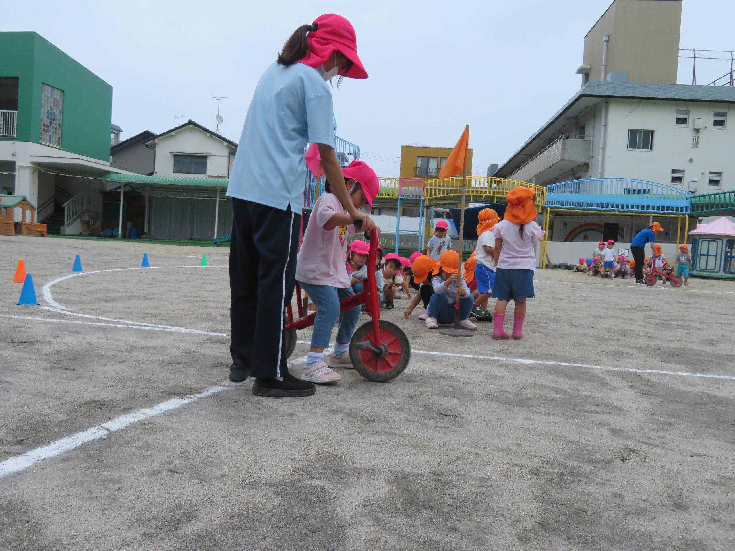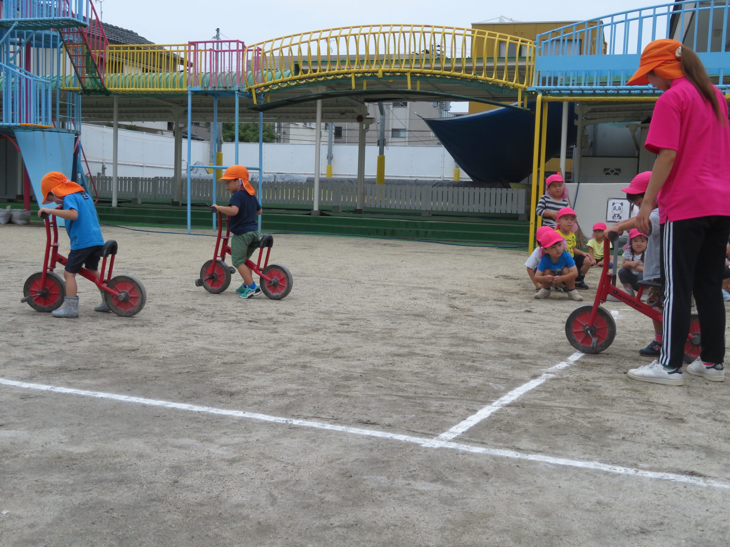 年少さんが初めての二輪車の練習をしました。次回から、活動Ⅰの時間に、二輪車が配置されます。そのための練習です。