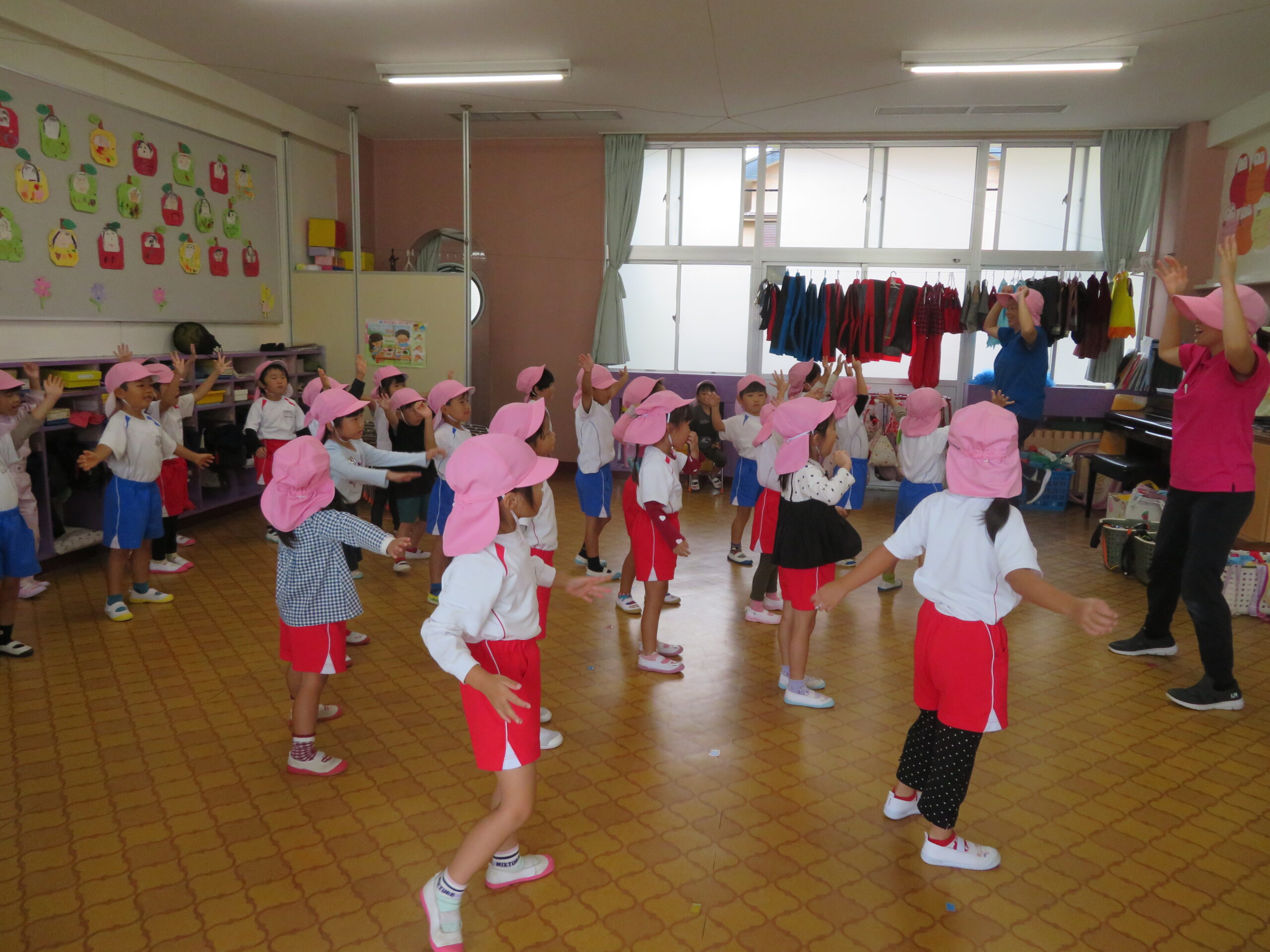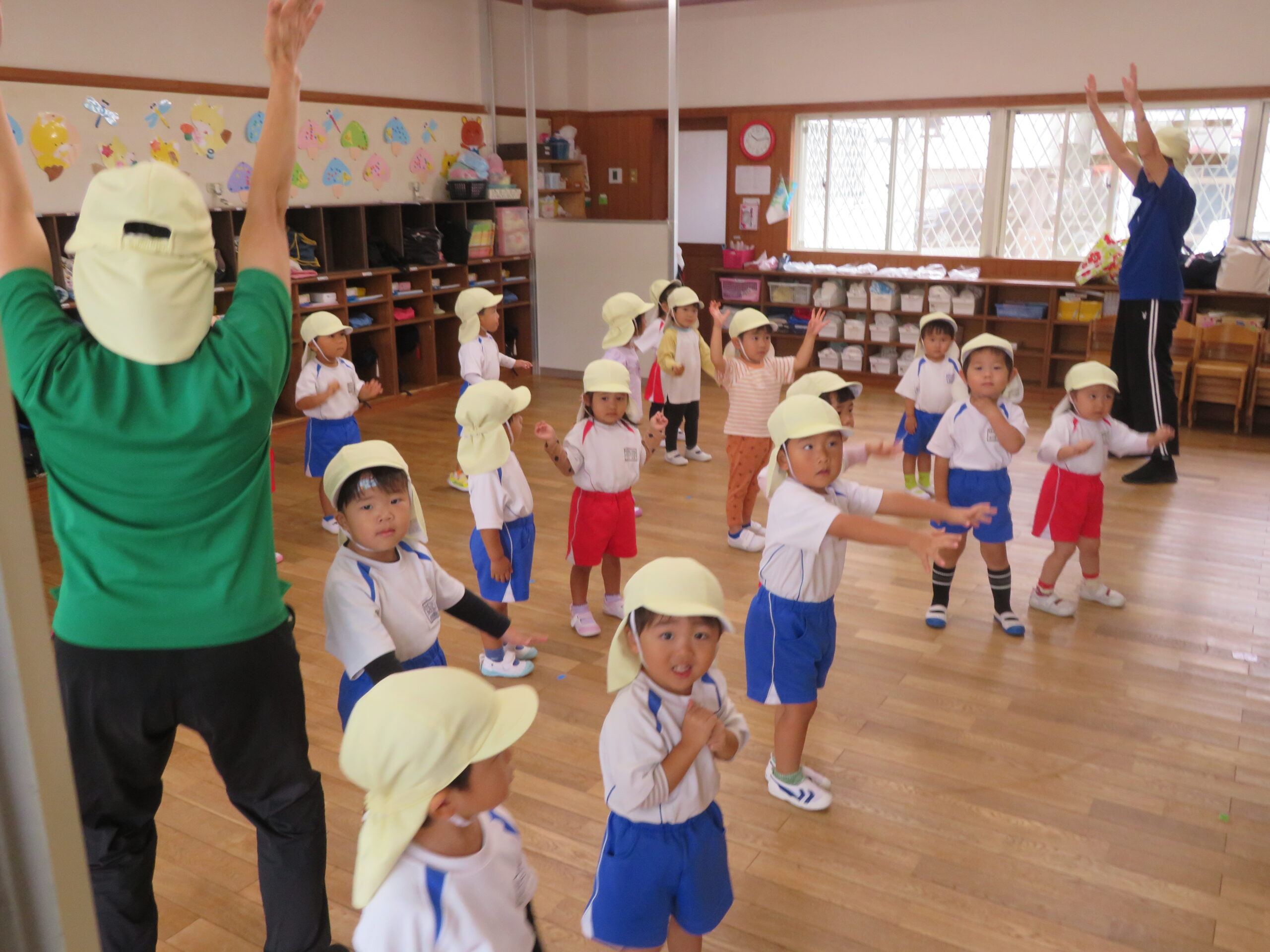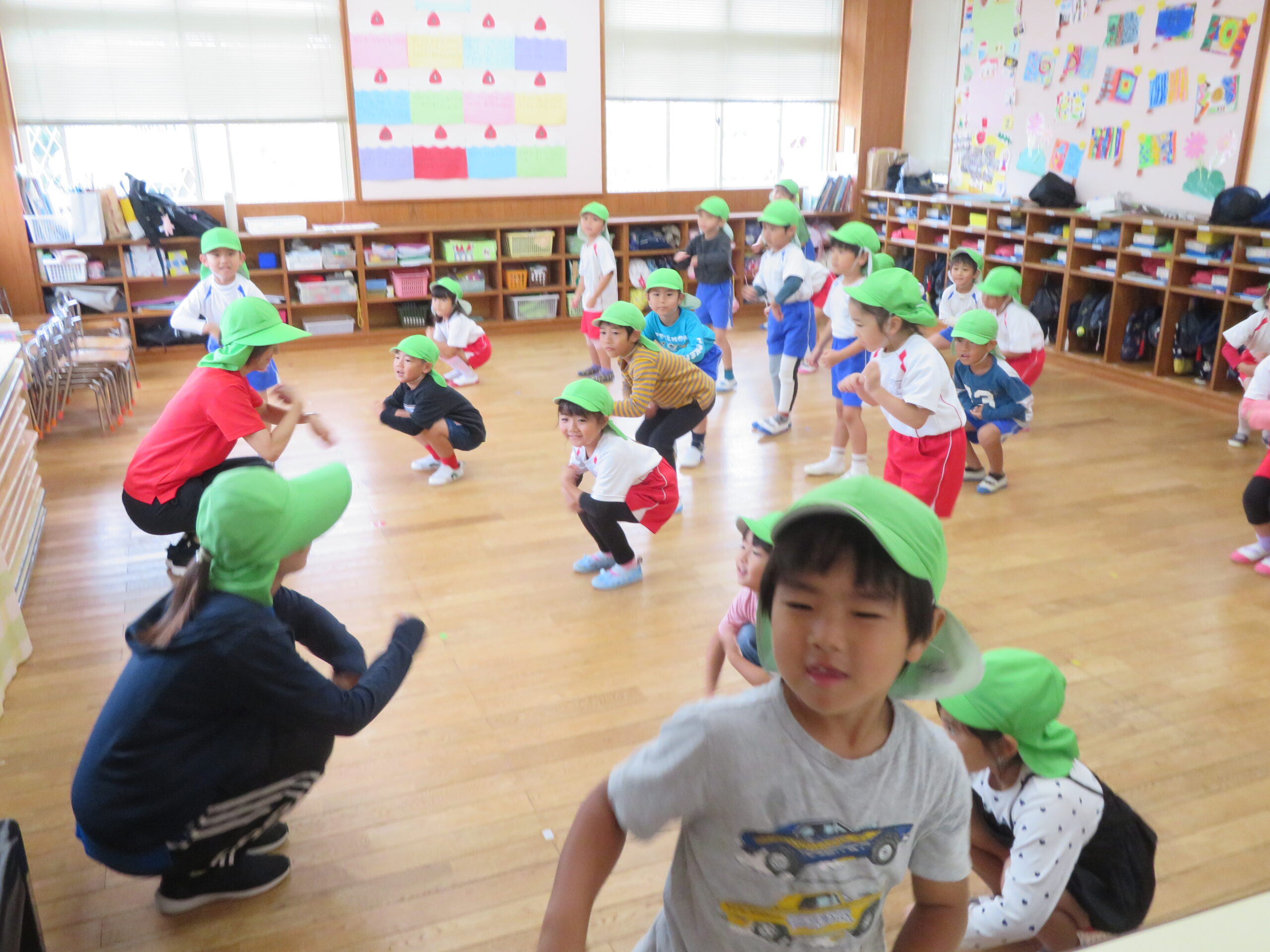 10月23日(木)の合同リズム運動は、小雨のため室内での運動になりました。子どもたちは教室の中で元気よく「もぐらっちょ」のユニークな踊りを楽しんでいました。