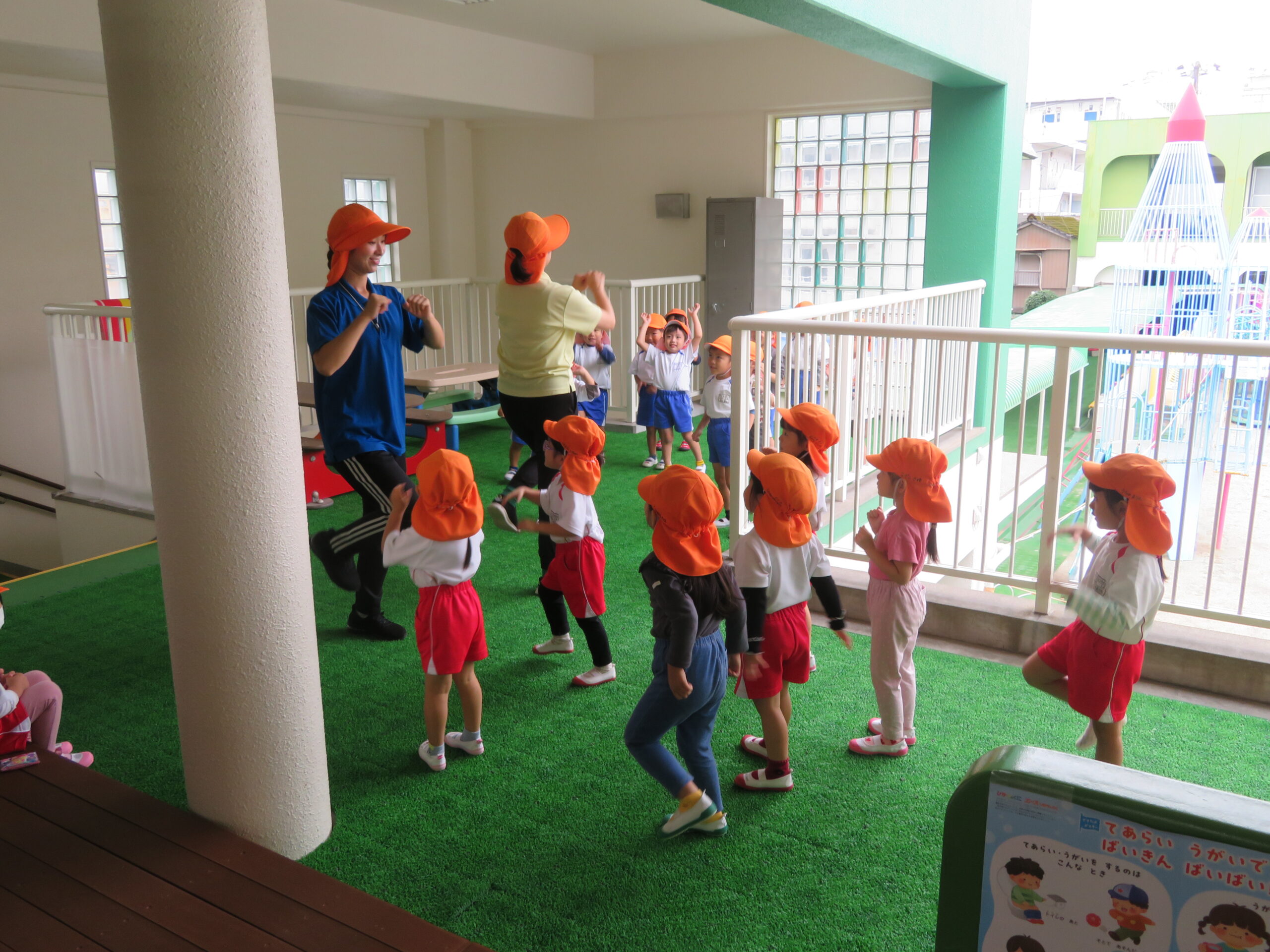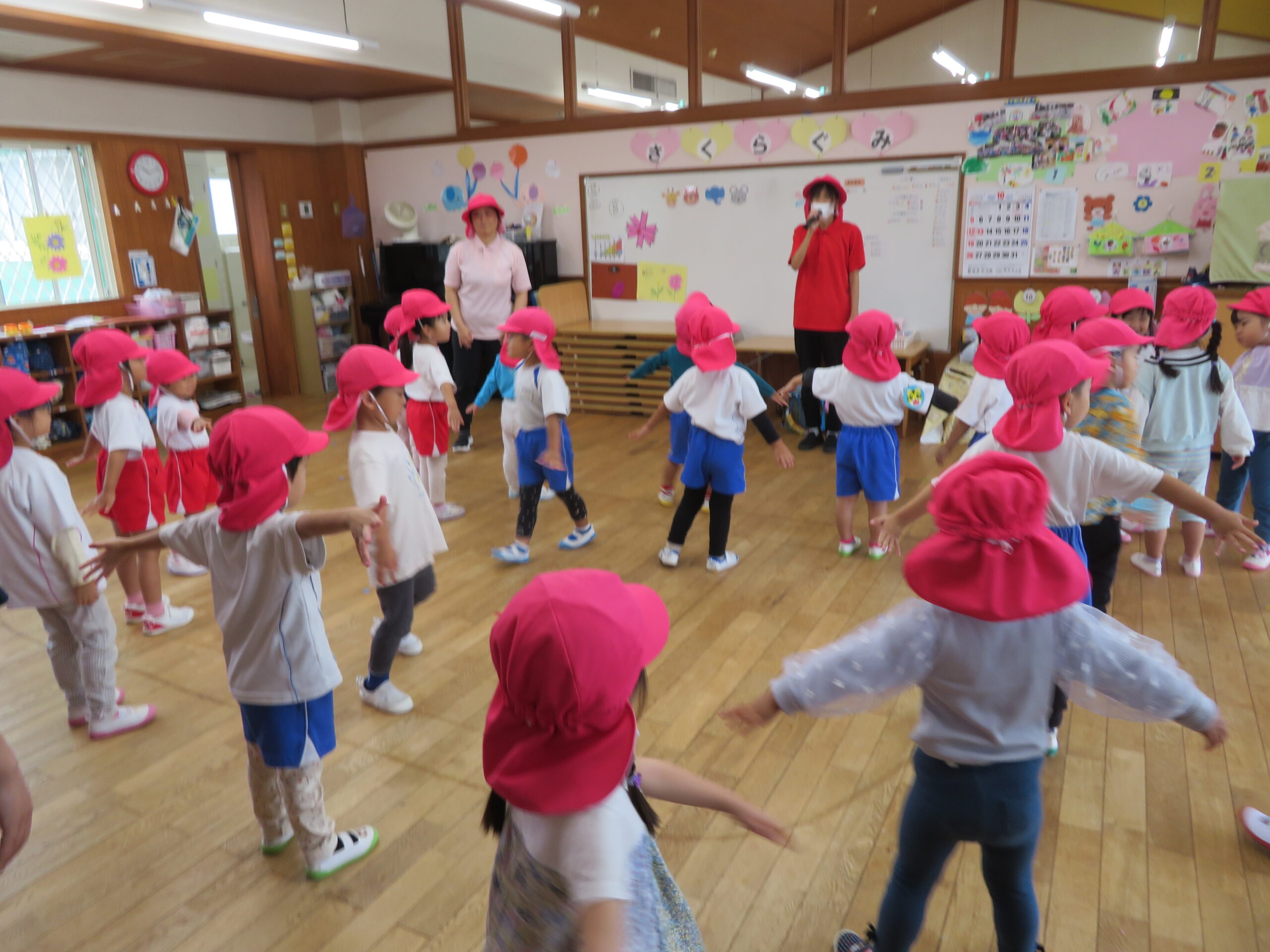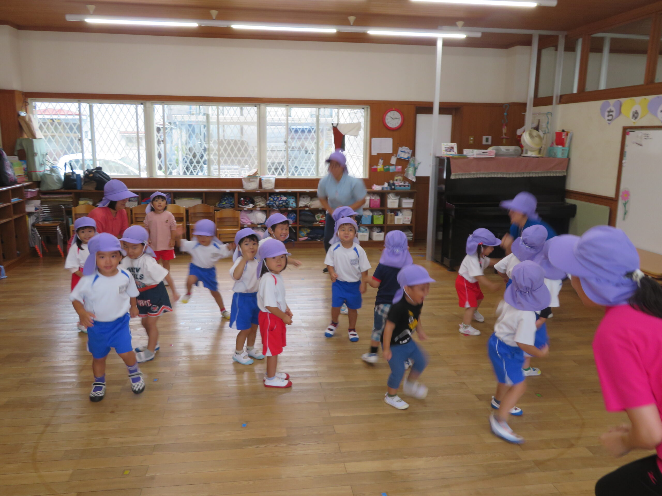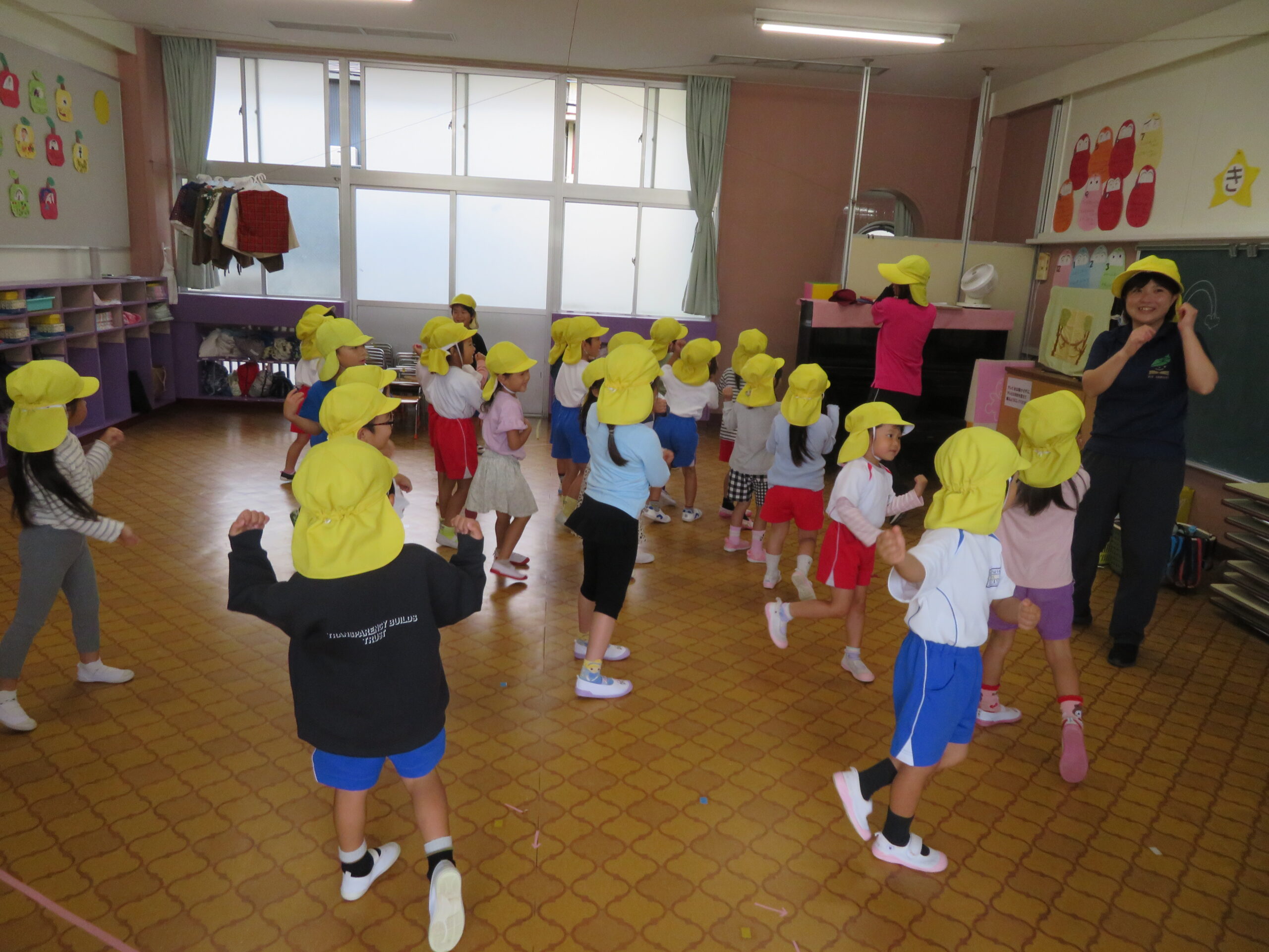 10月23日(木)の合同リズム運動は、小雨のため室内での運動になりました。子どもたちは教室の中で元気よく「もぐらっちょ」のユニークな踊りを楽しんでいました。