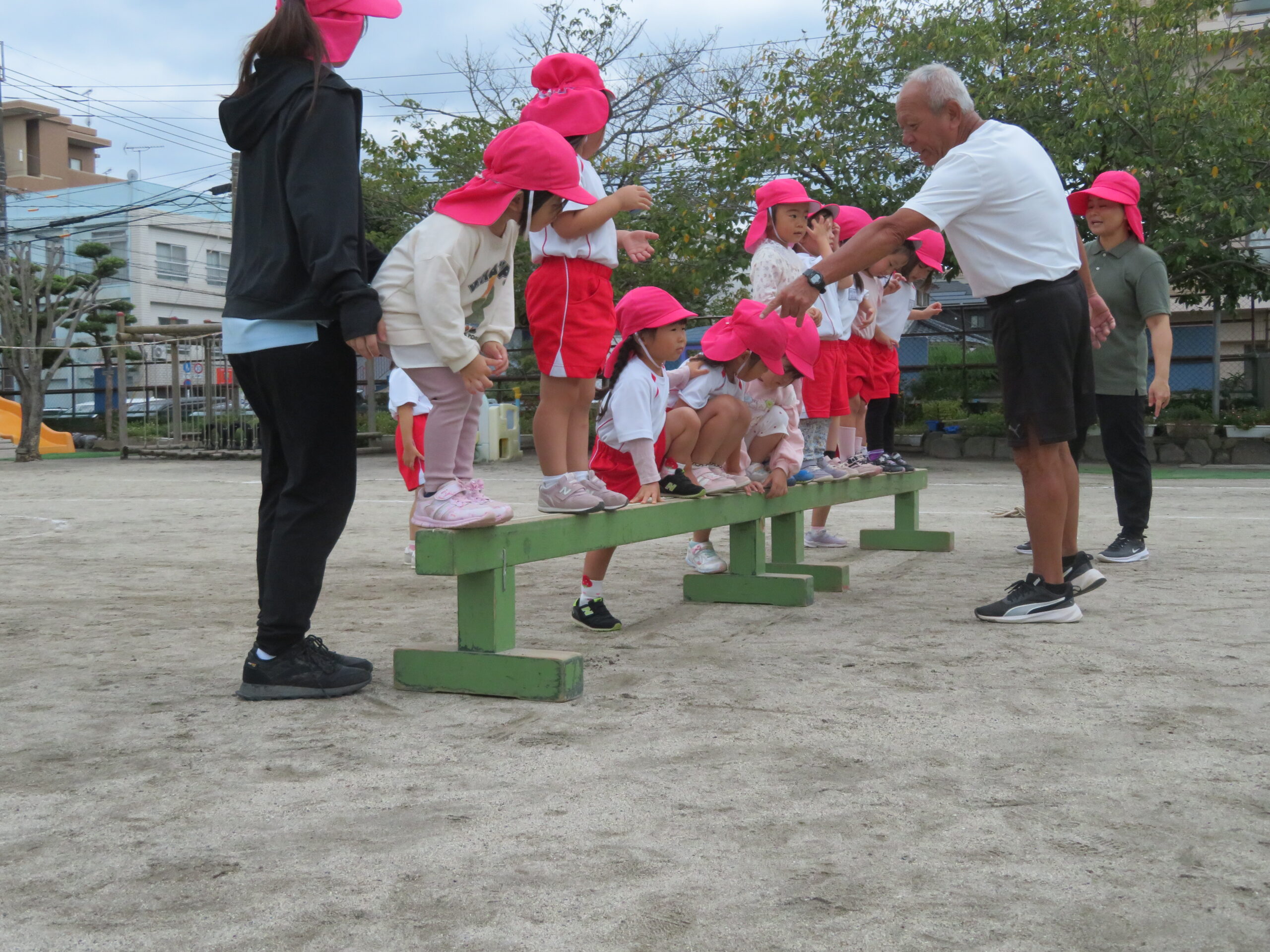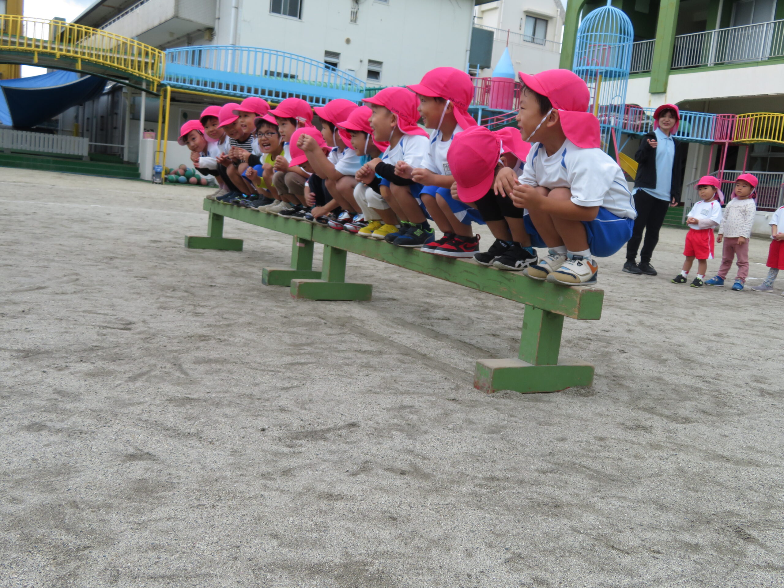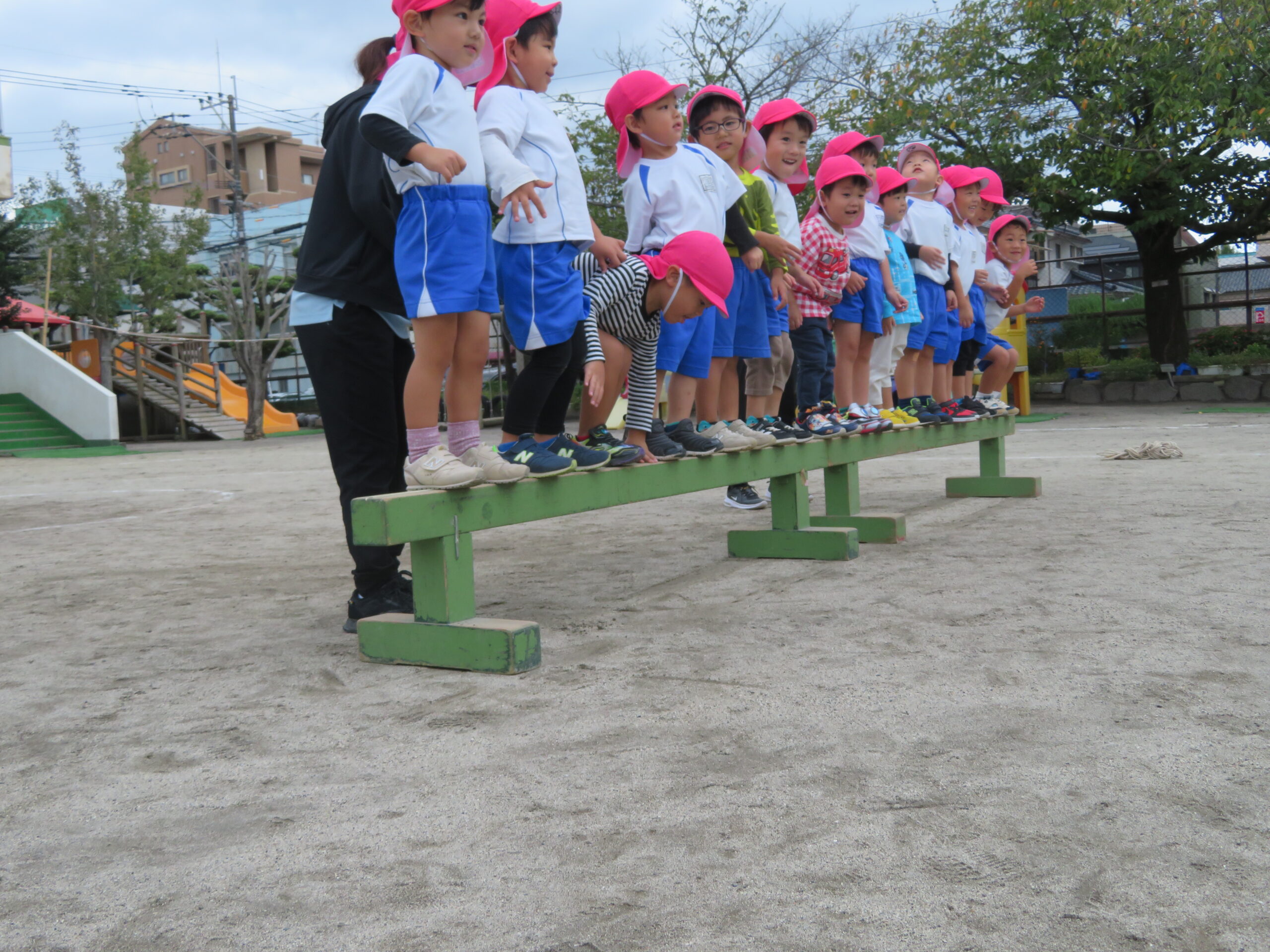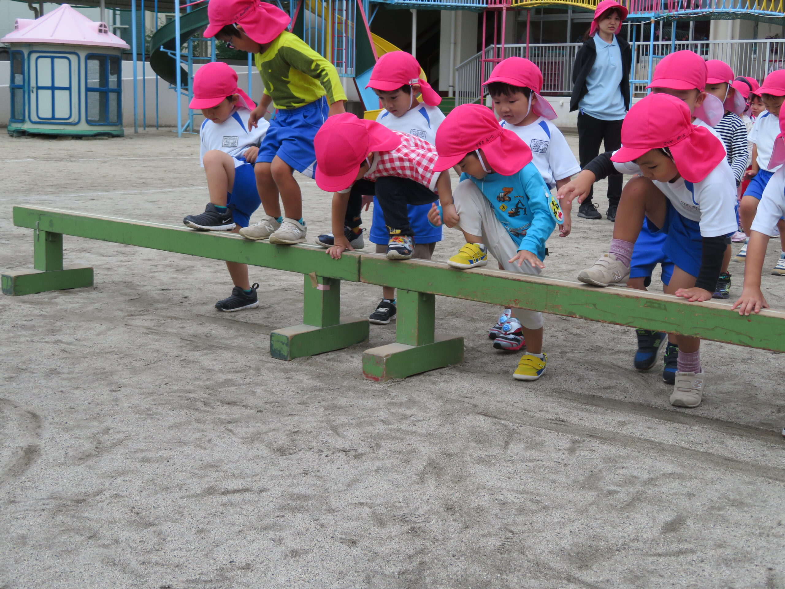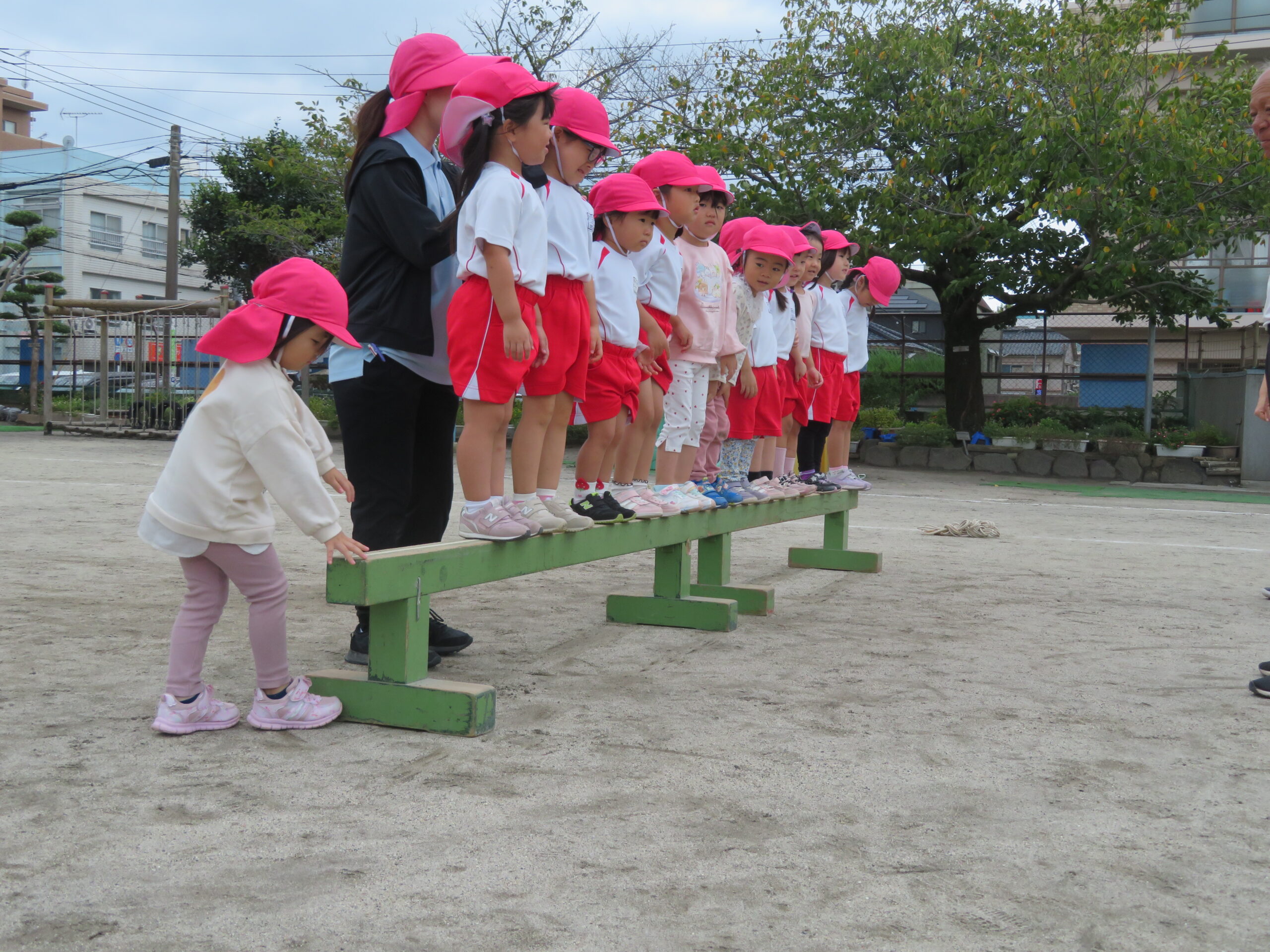 さくら組さんの運動遊びがありました。男女別に分かれての鬼ごっご、5本の縄の綱渡り、そして、平均台のわたり遊びなどの運動でした。一番難しかったのは平均台わたりのようでした。