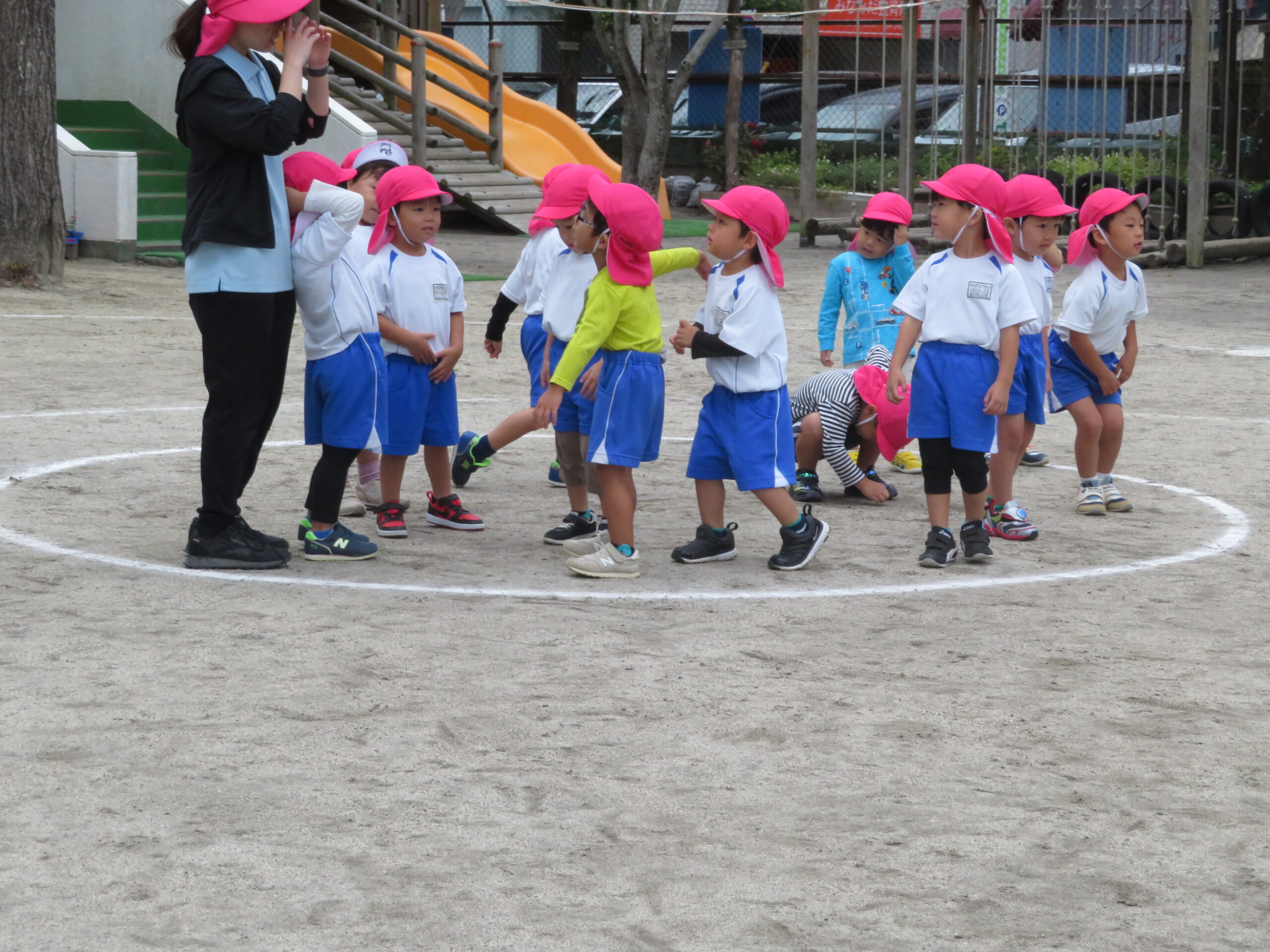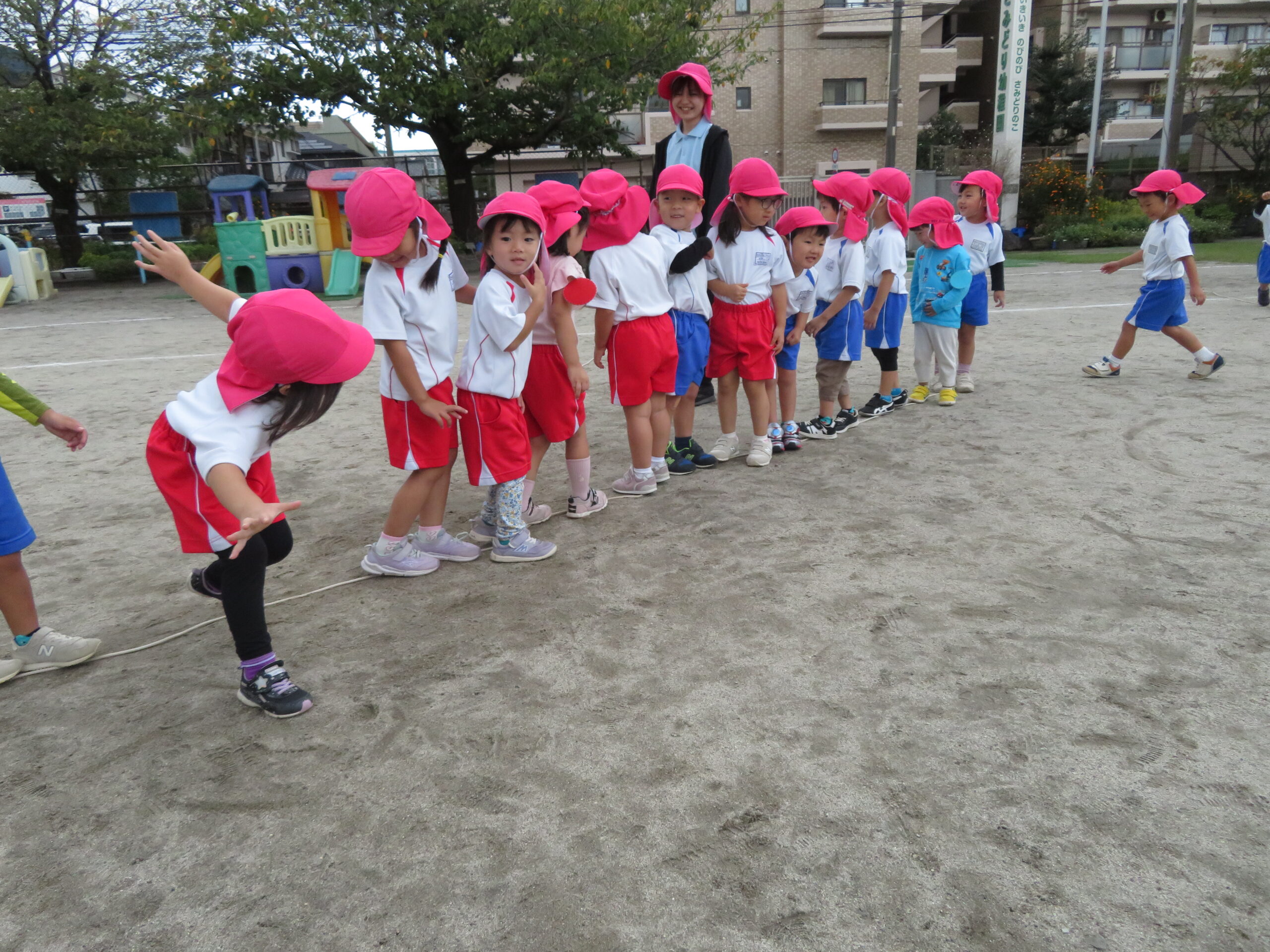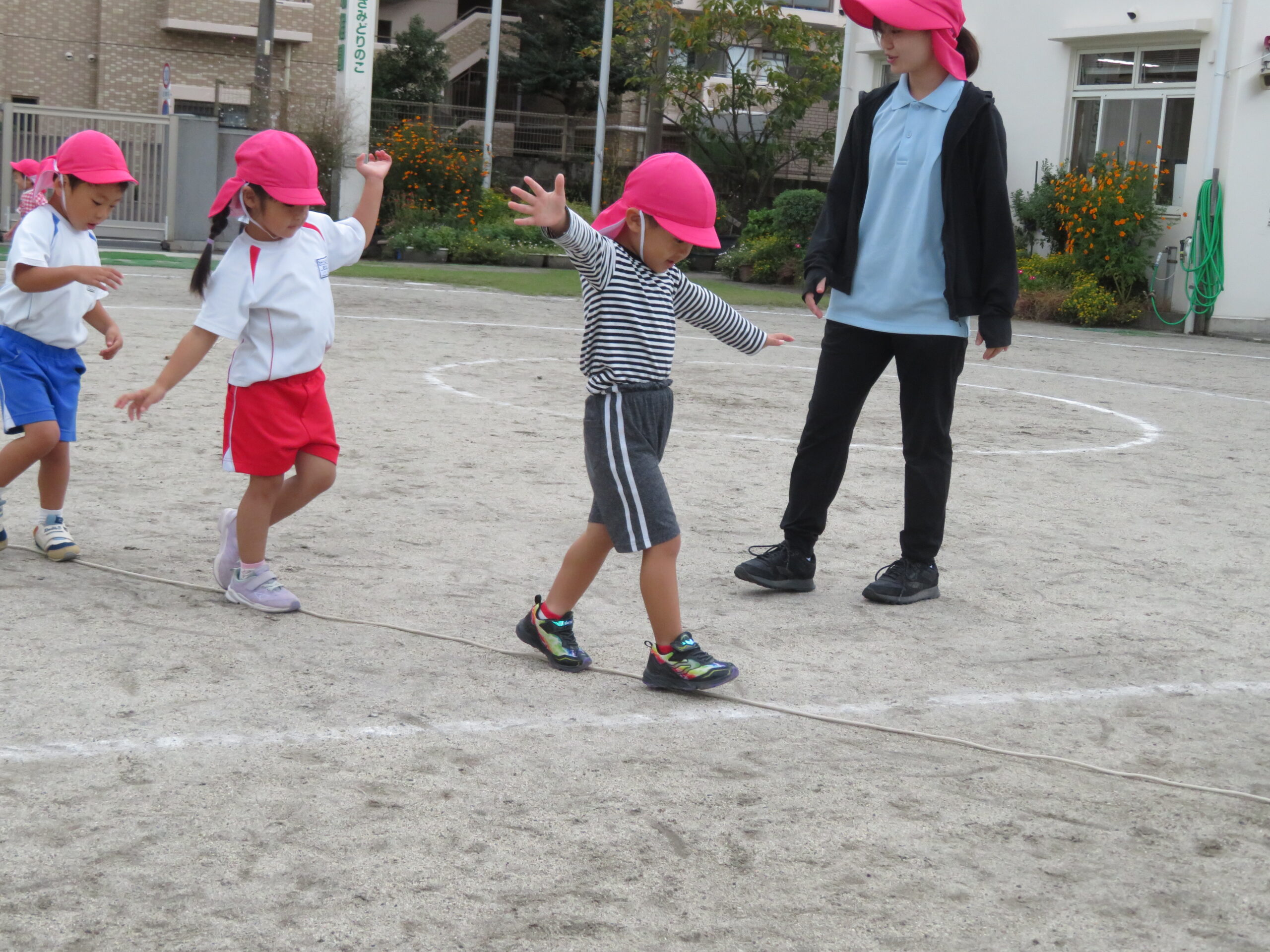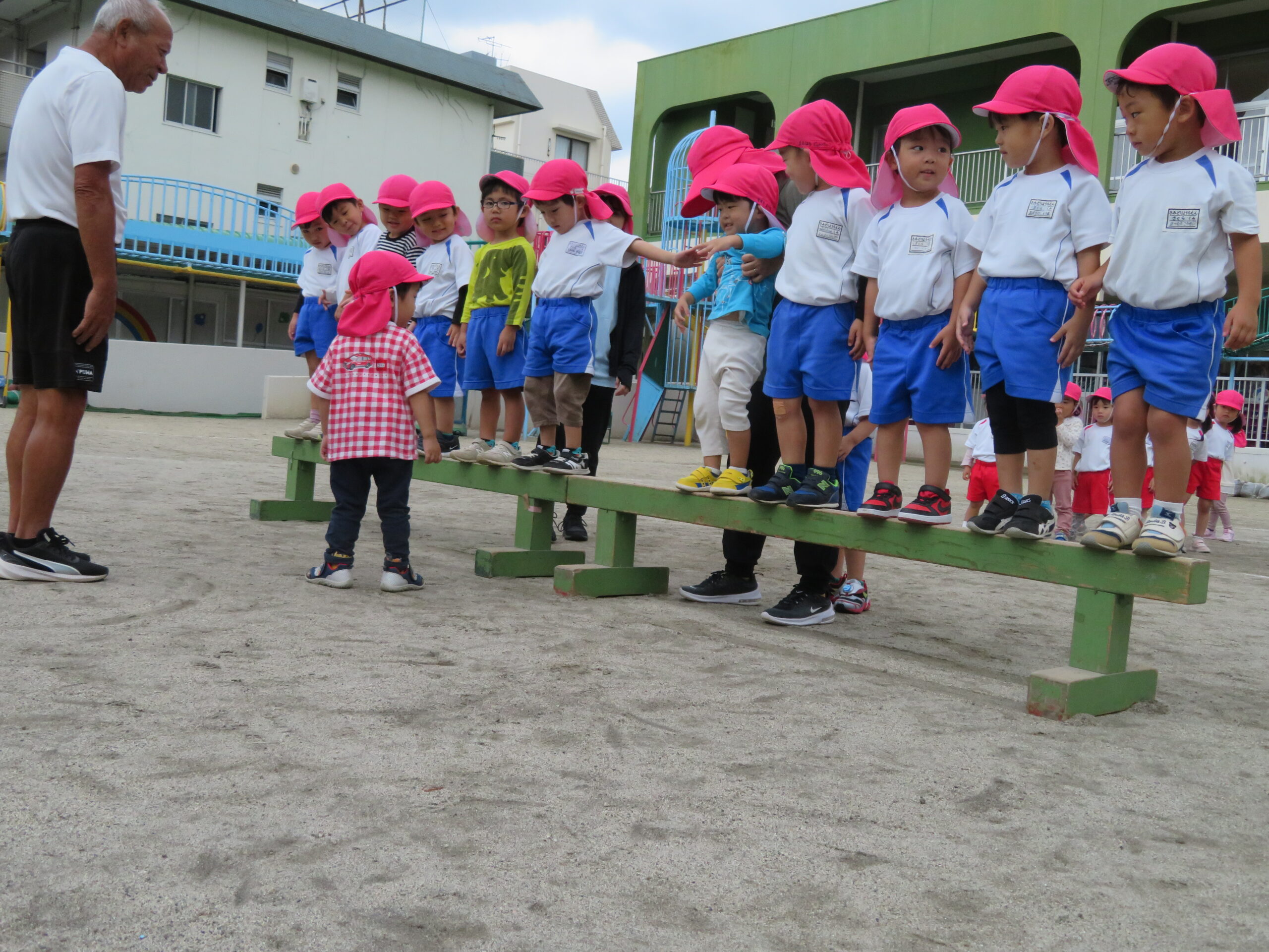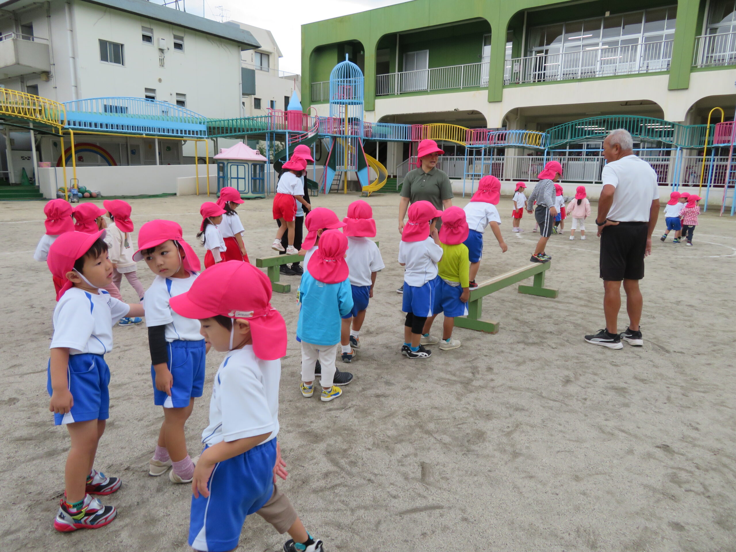 さくら組さんの運動遊びがありました。男女別に分かれての鬼ごっご、5本の縄の綱渡り、そして、平均台のわたり遊びなどの運動でした。一番難しかったのは平均台わたりのようでした。