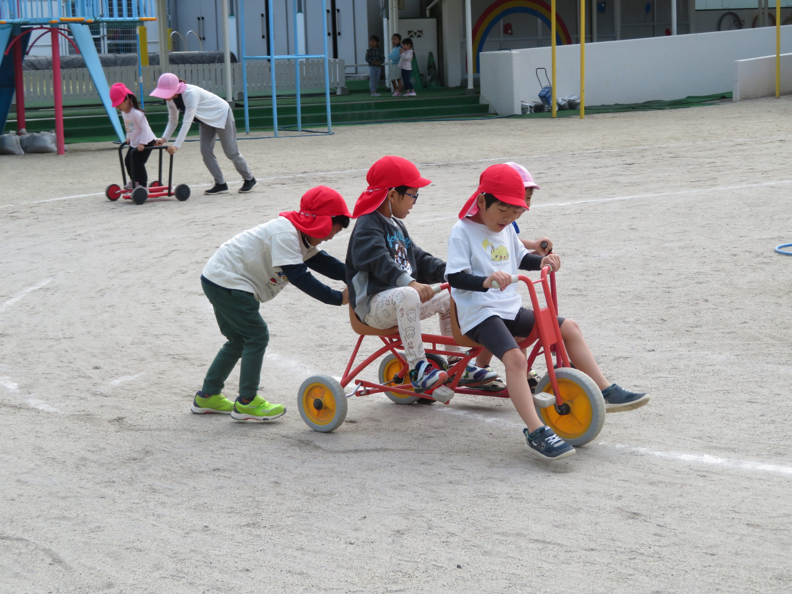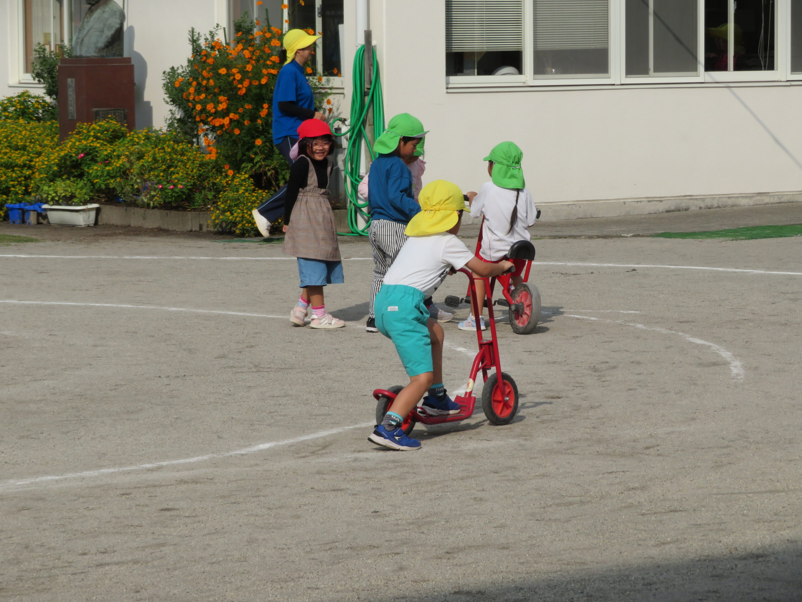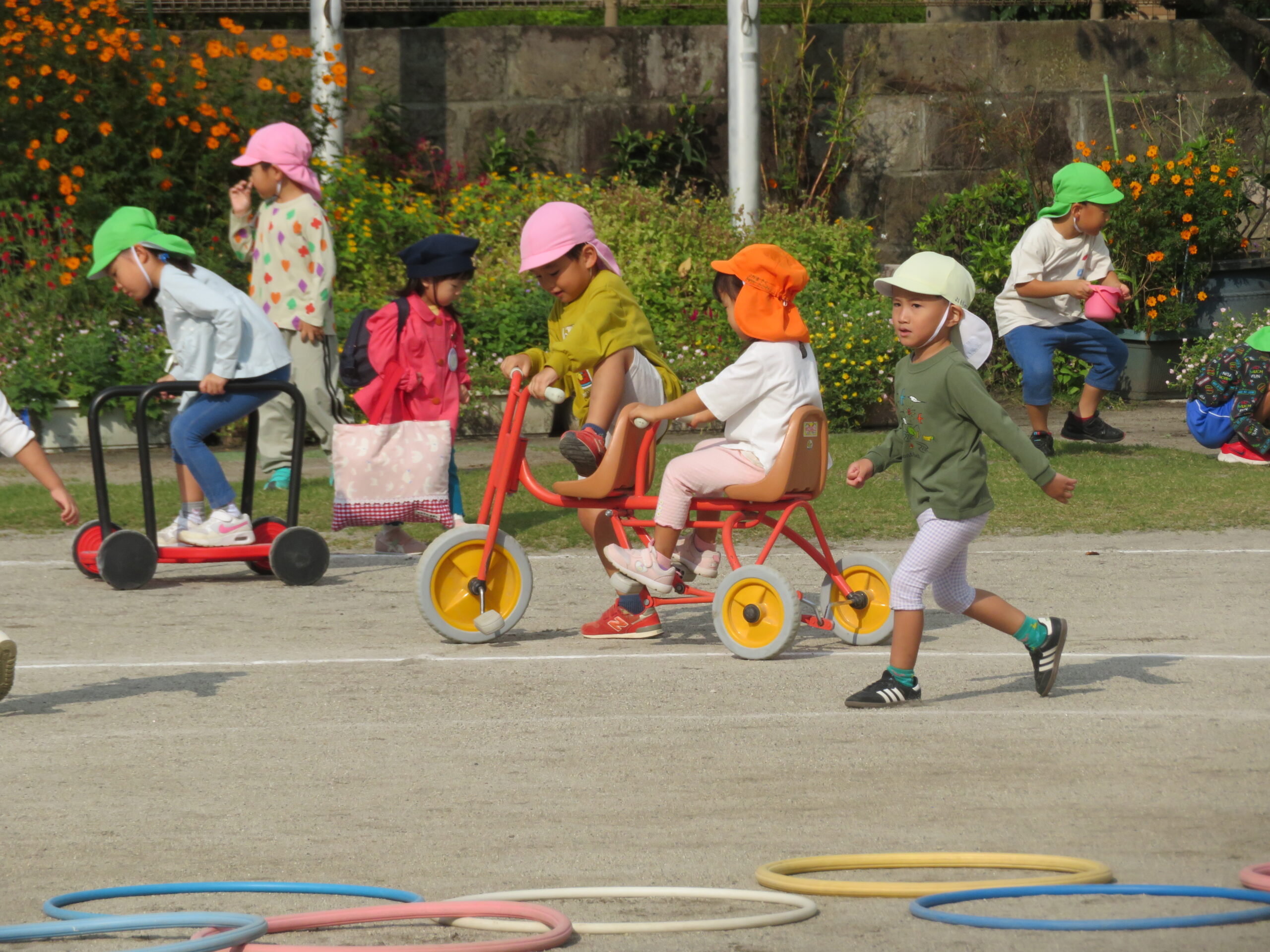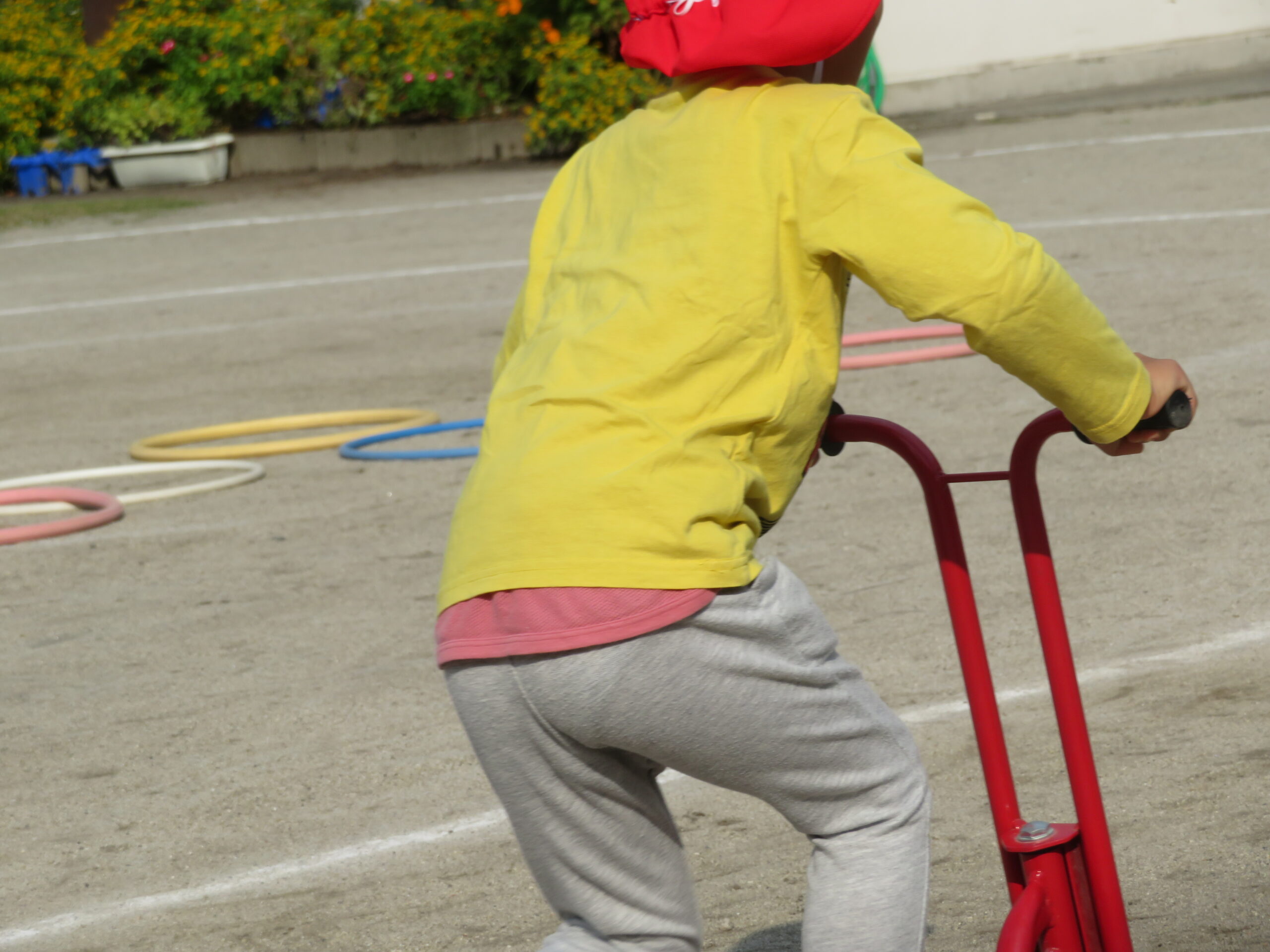 活動Ⅰの時間帯の自転車コーナーが大人気です。年少々さんから年長さんまで並んでいます。年少々さんは、年中さんや年長さんの自転車に一緒に乗っている姿も見られます。