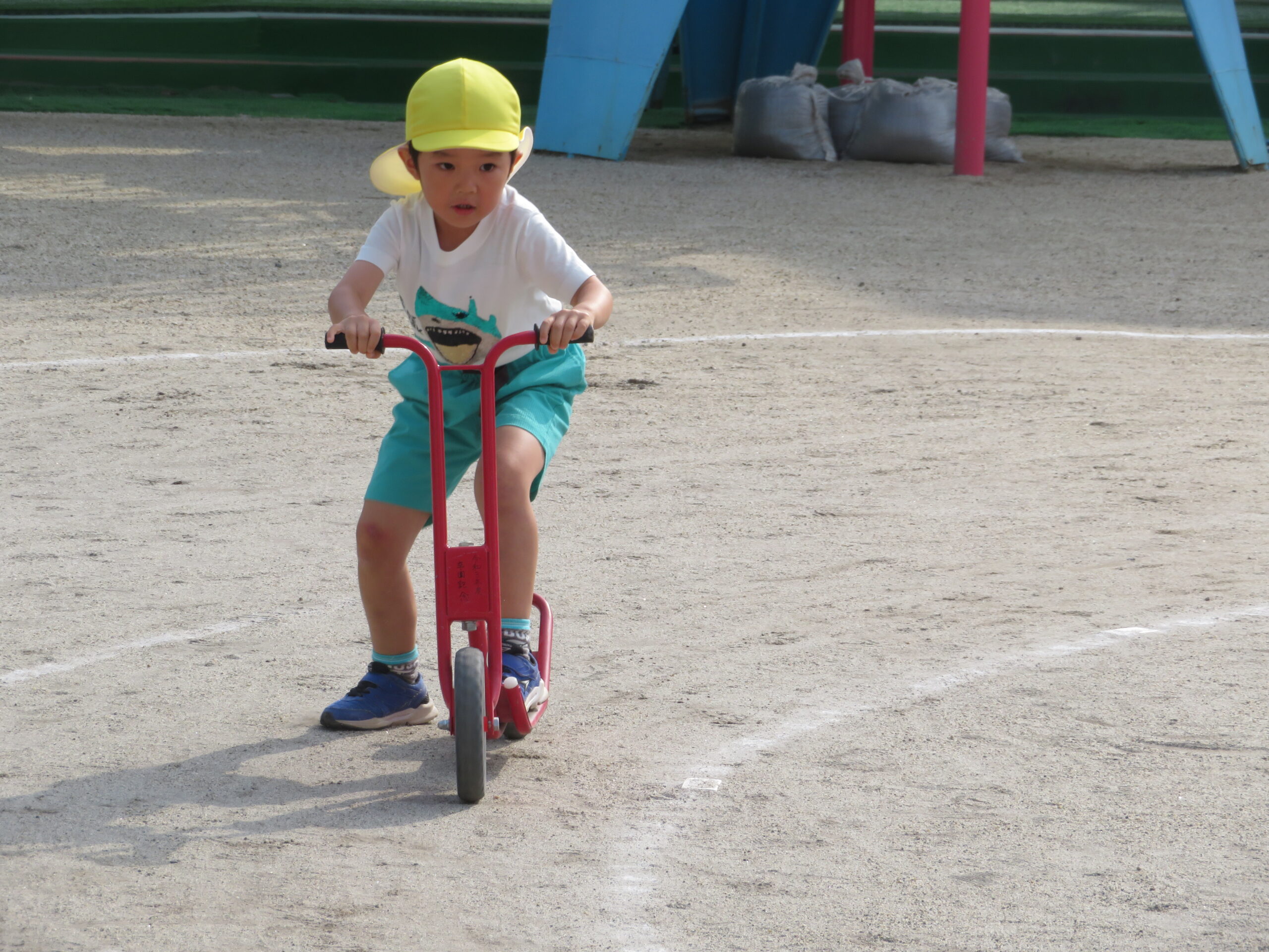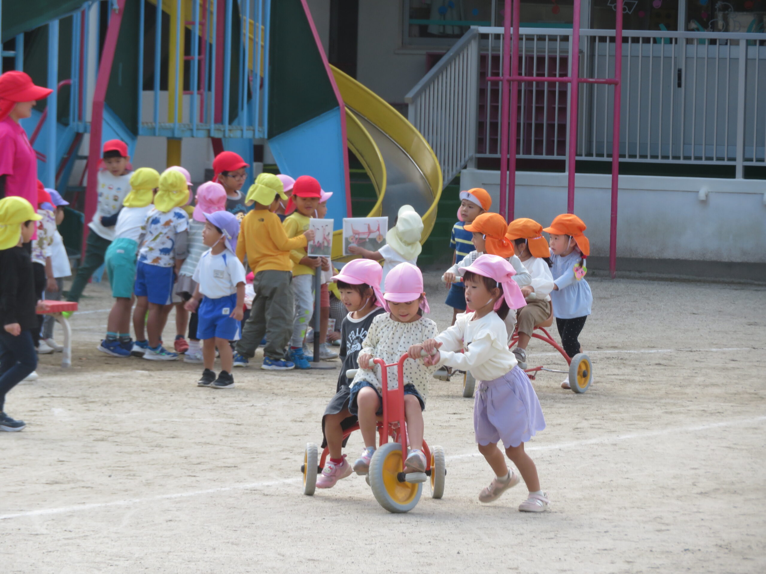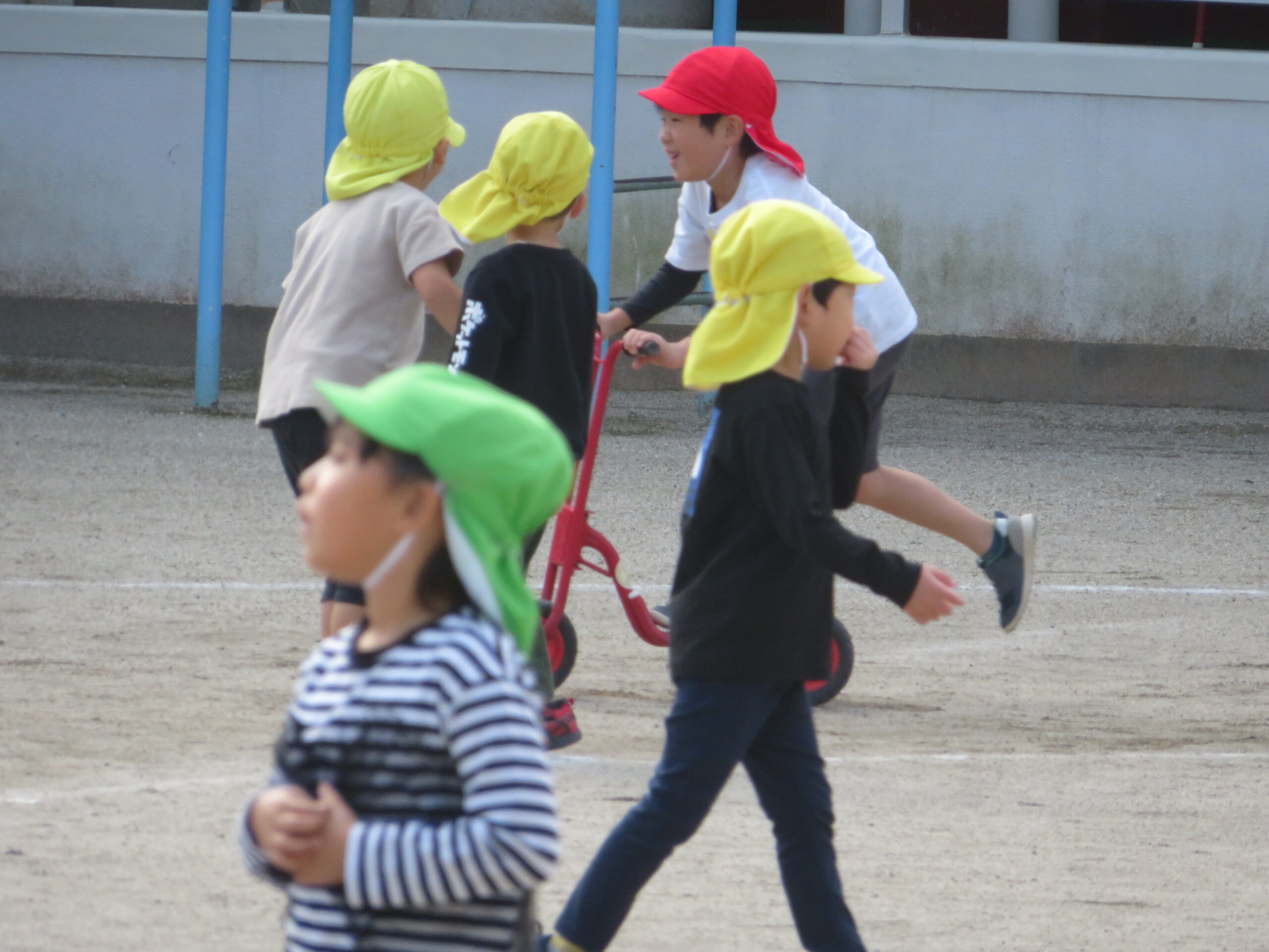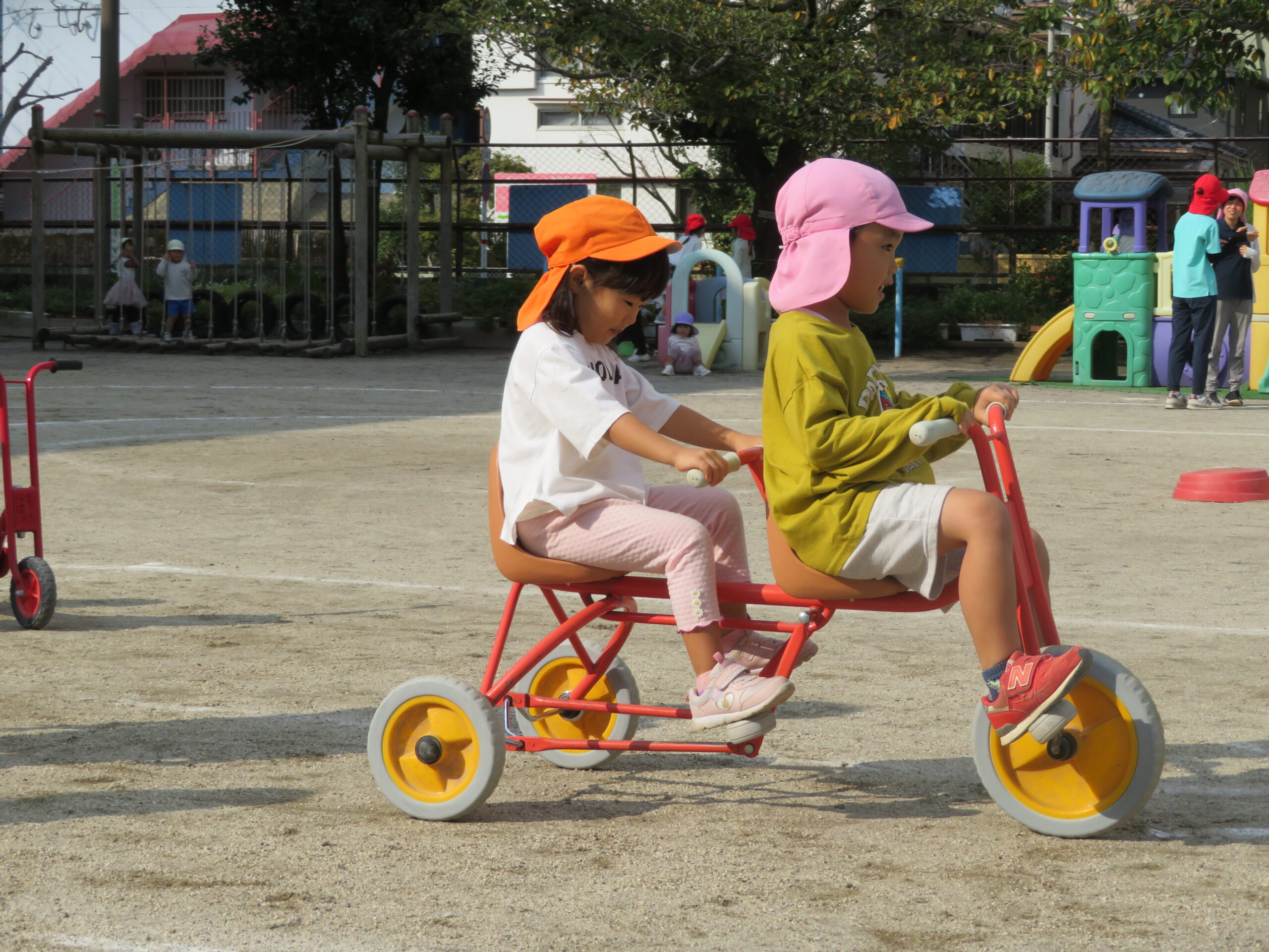 活動Ⅰの時間帯の自転車コーナーが大人気です。年少々さんから年長さんまで並んでいます。年少々さんは、年中さんや年長さんの自転車に一緒に乗っている姿も見られます。