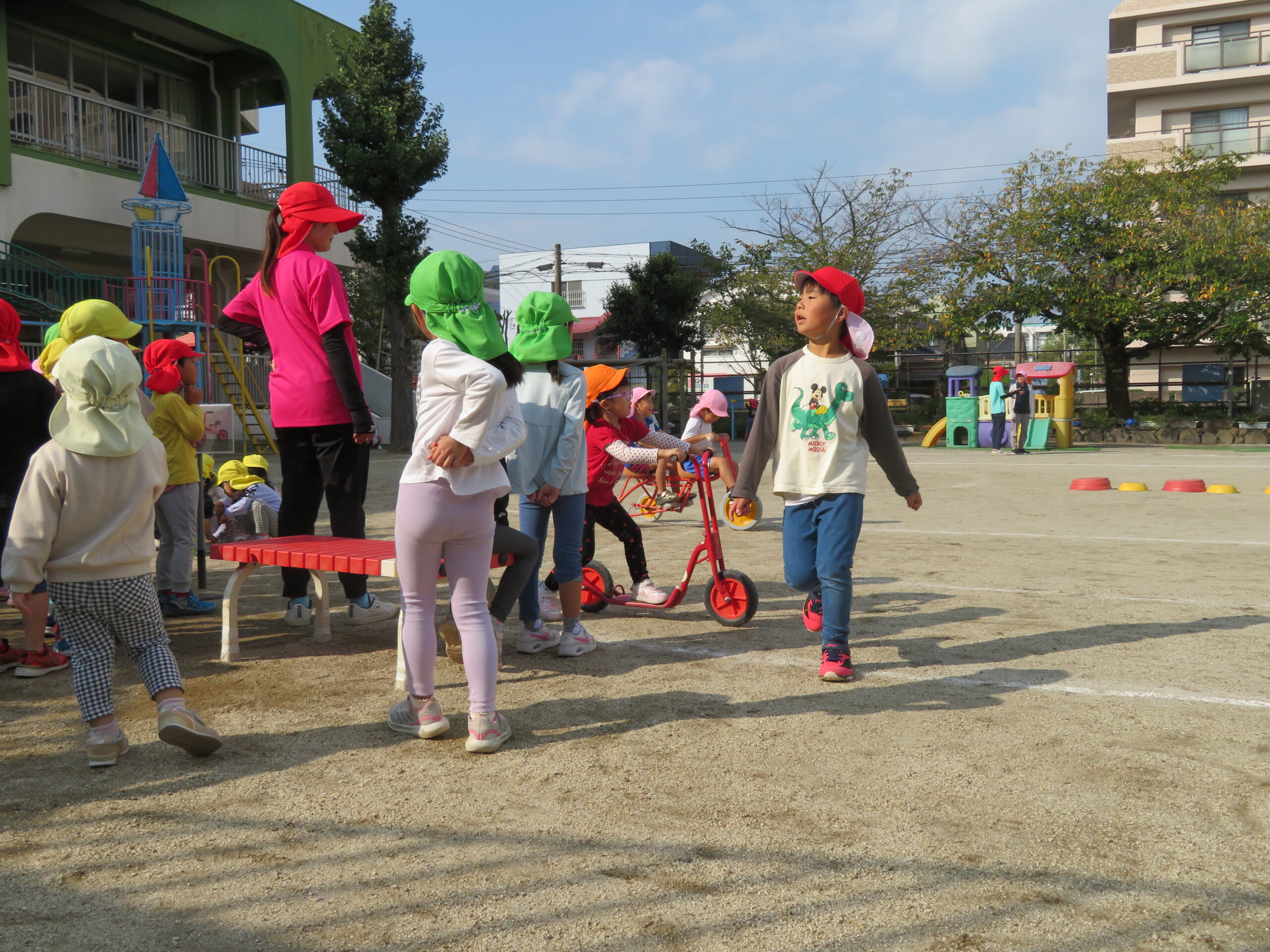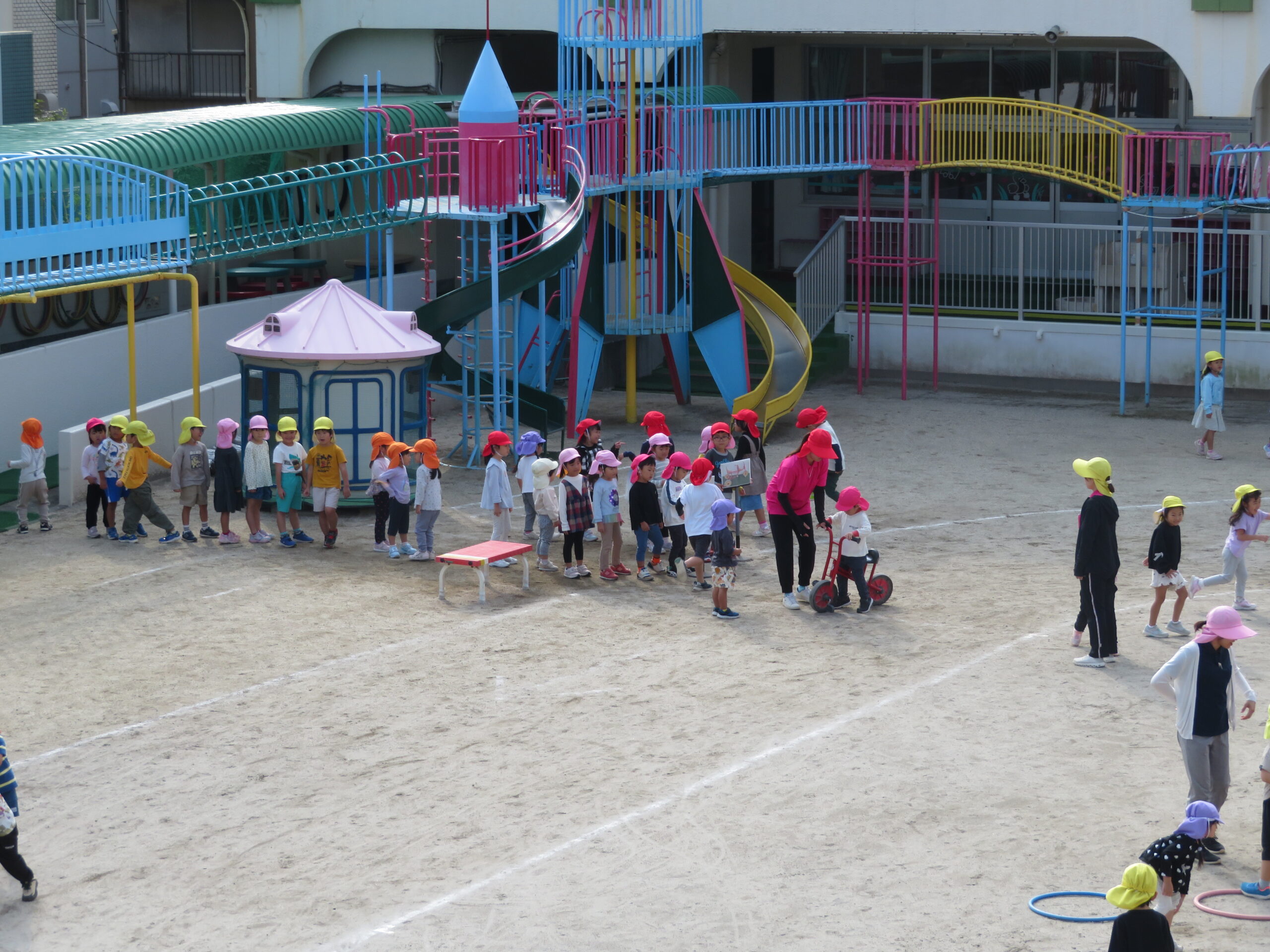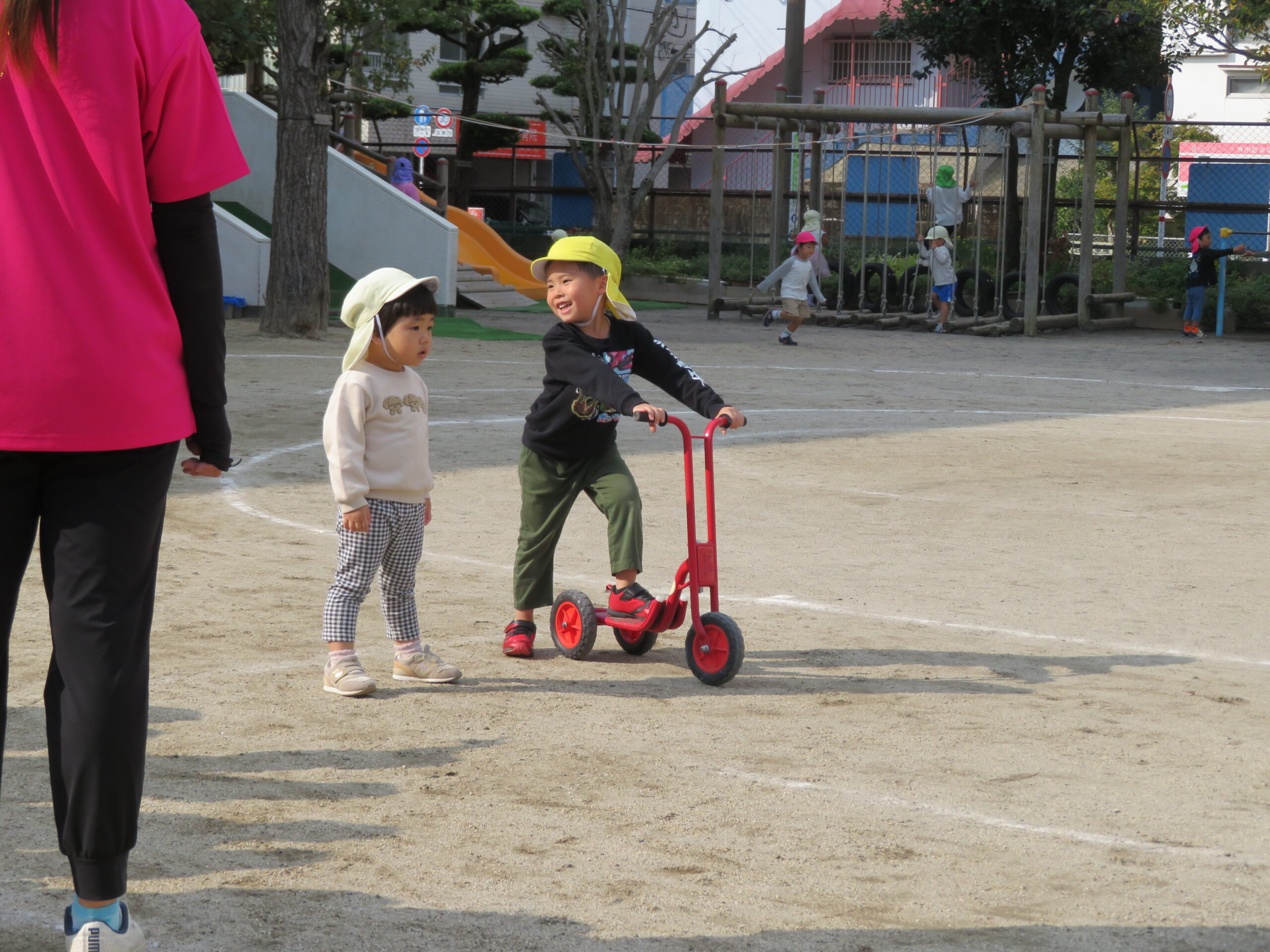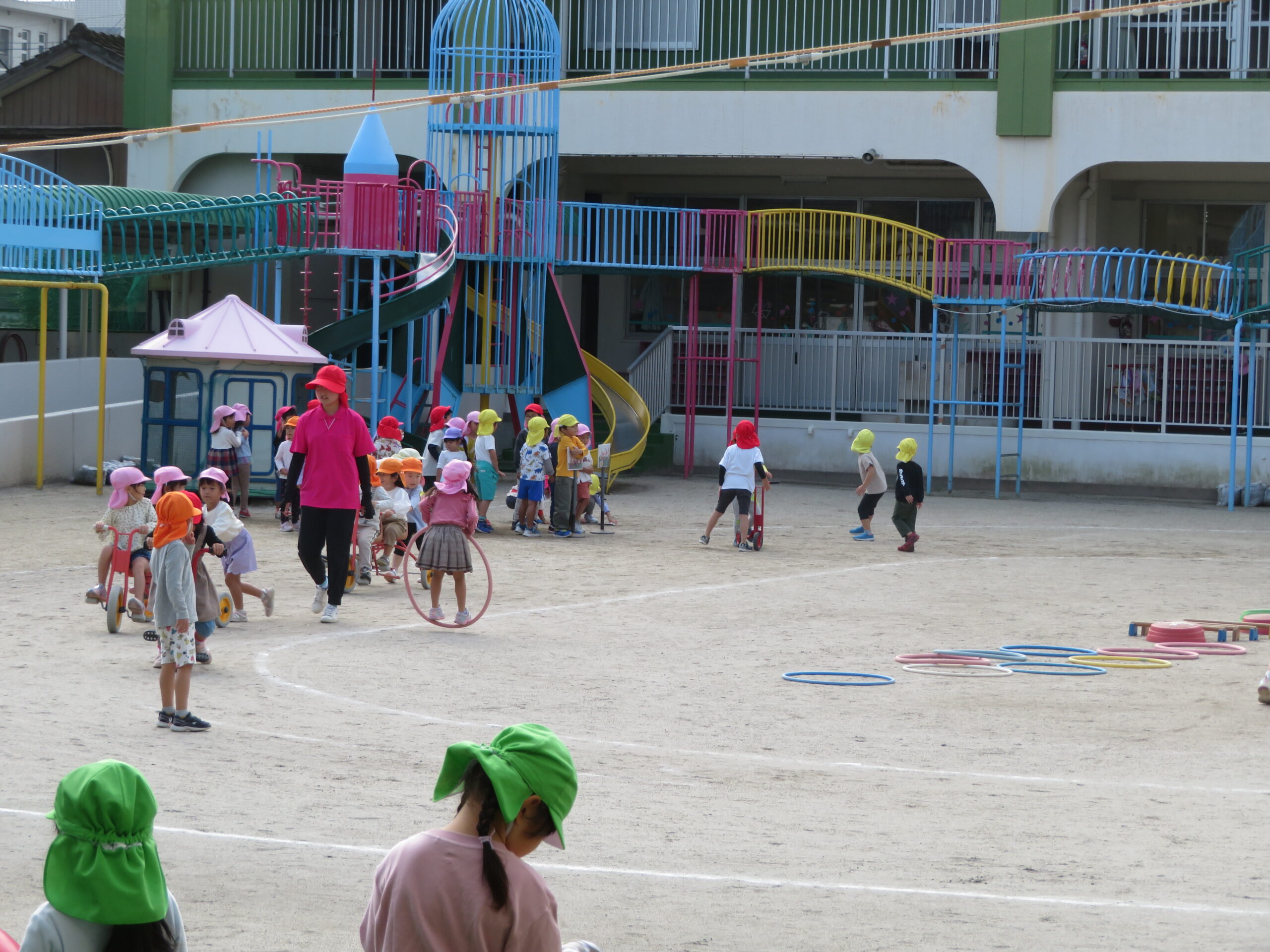 活動Ⅰの時間帯の自転車コーナーが大人気です。年少々さんから年長さんまで並んでいます。年少々さんは、年中さんや年長さんの自転車に一緒に乗っている姿も見られます。