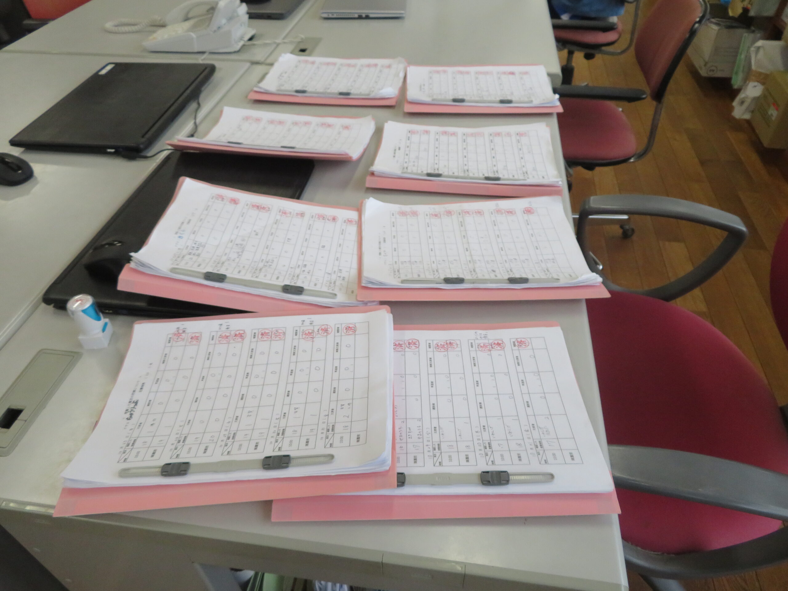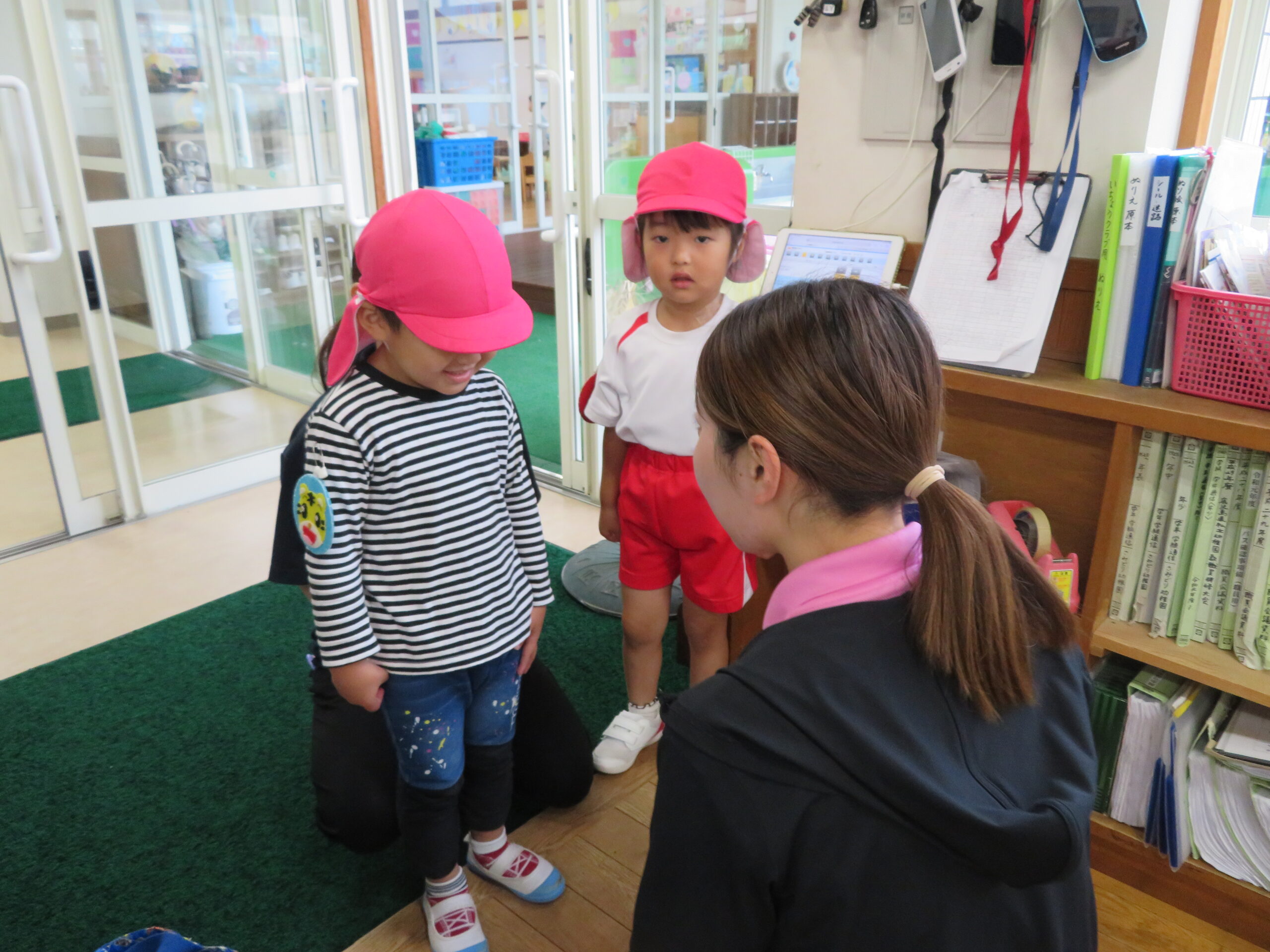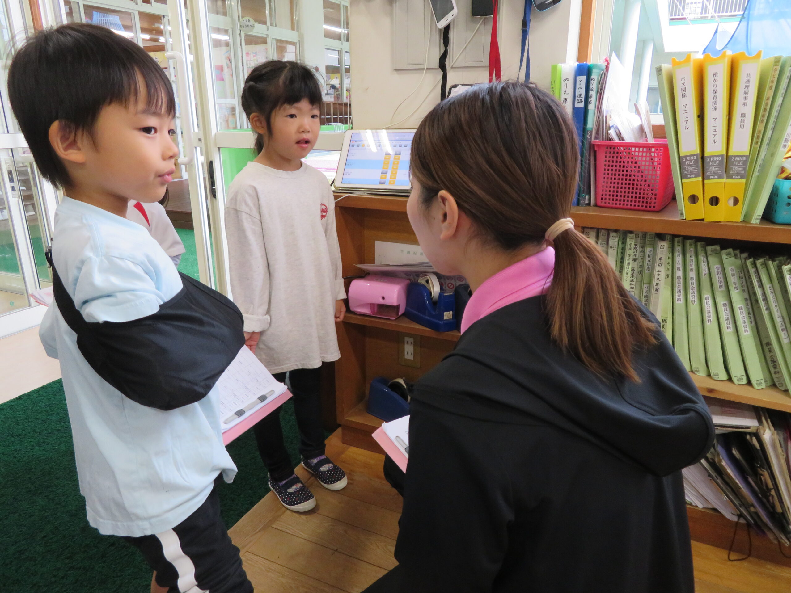 子どもたちには、当番活動があります。当番になると給食の食器を先生と一緒に持って行ったりといろいろな仕事があります。その中の一つに、各クラスで調べた出席状況を職員室に届ける仕事もあります。各クラス2人で持ってきます。係の子どもたちは職員室にはいると、係の先生に「出席調べを持ってきました。わたしは○○組の○○○です」と言って、出席調べを渡します。帰るときには、「失礼しました」と言います。こどもたちは、当番バッジをつけることが大好きです。