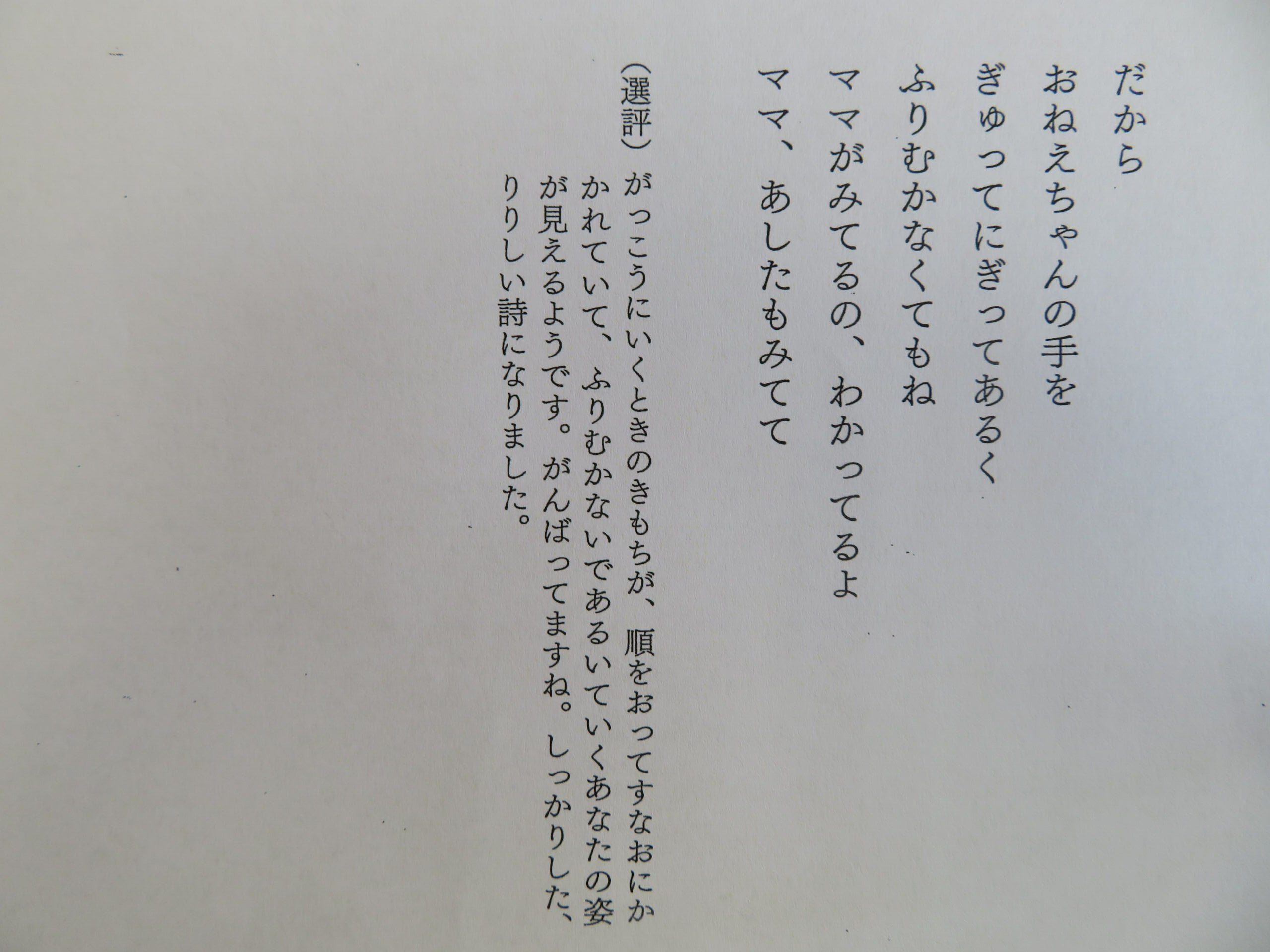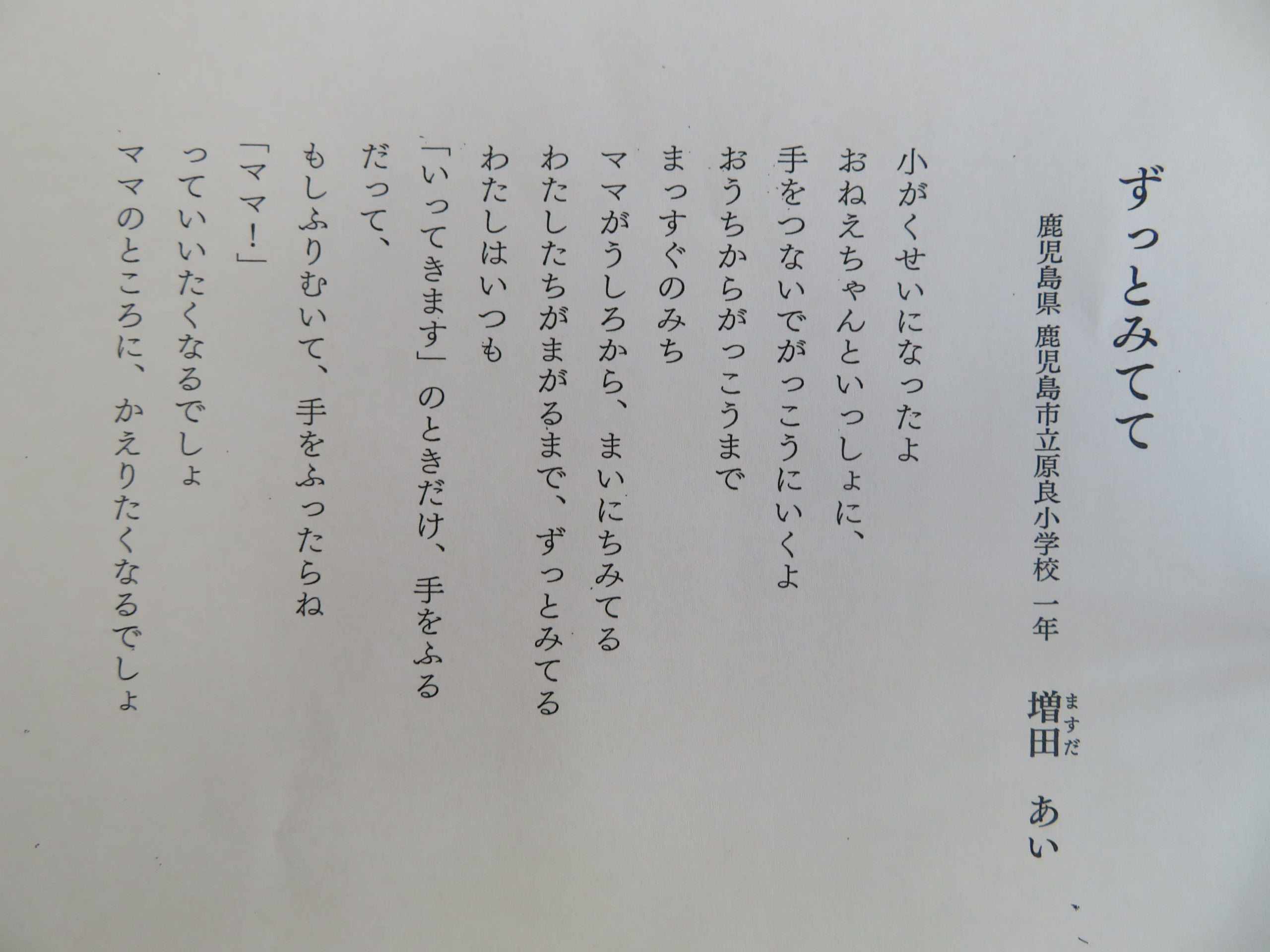 現在、原良小学2年生で、一昨年、卒園した増田あいさんから「ずっとみてて」という作文の入ったお手紙を頂きました。保護者や本人の了解を得て、手紙を紹介します。「ずっとみてて」の作品は、「おかあさんの詩全国コンクール」で優秀賞を受賞した作品です。あいさんは幼稚園の年長さんから、このコンクールに応募しています。