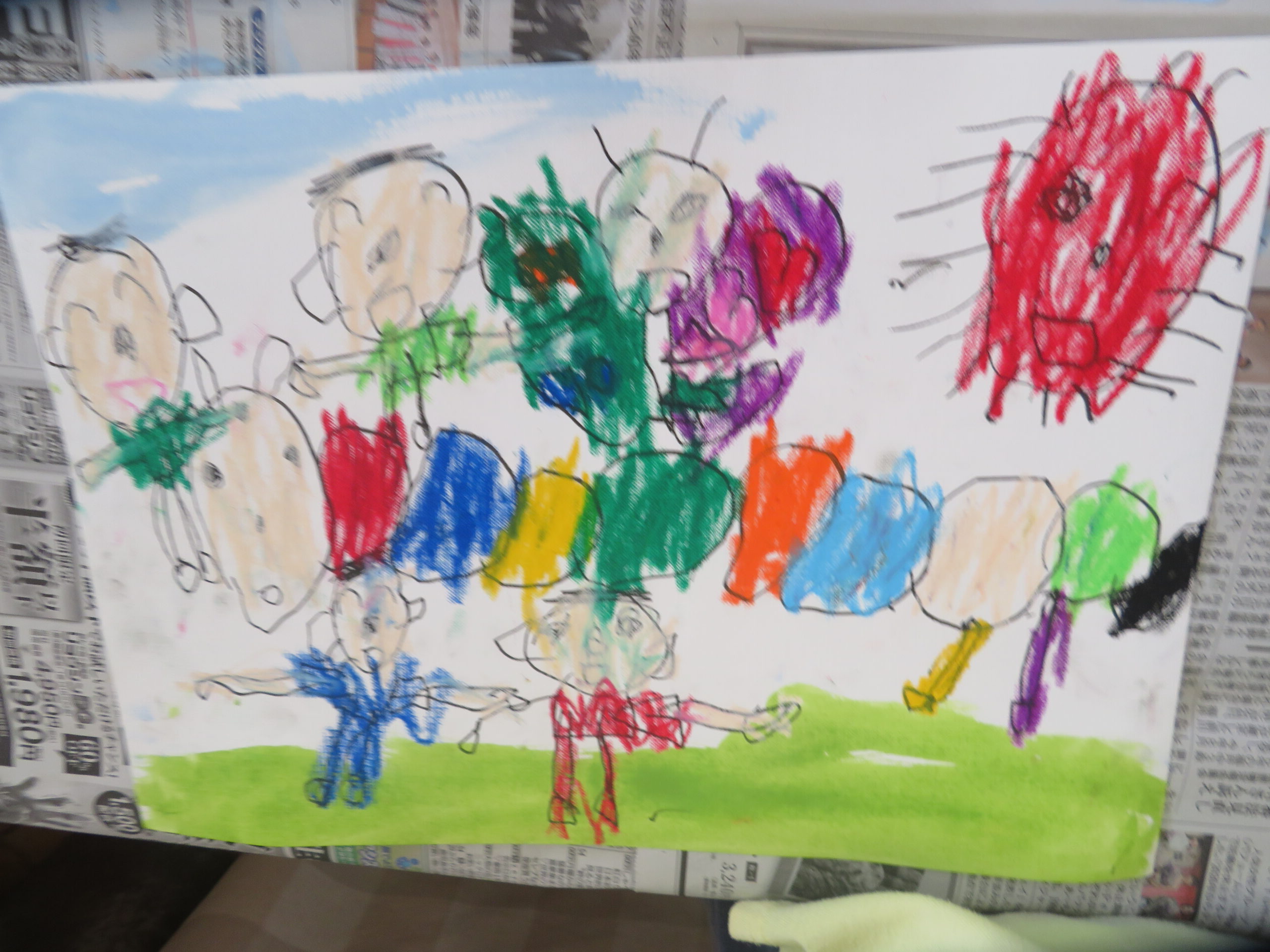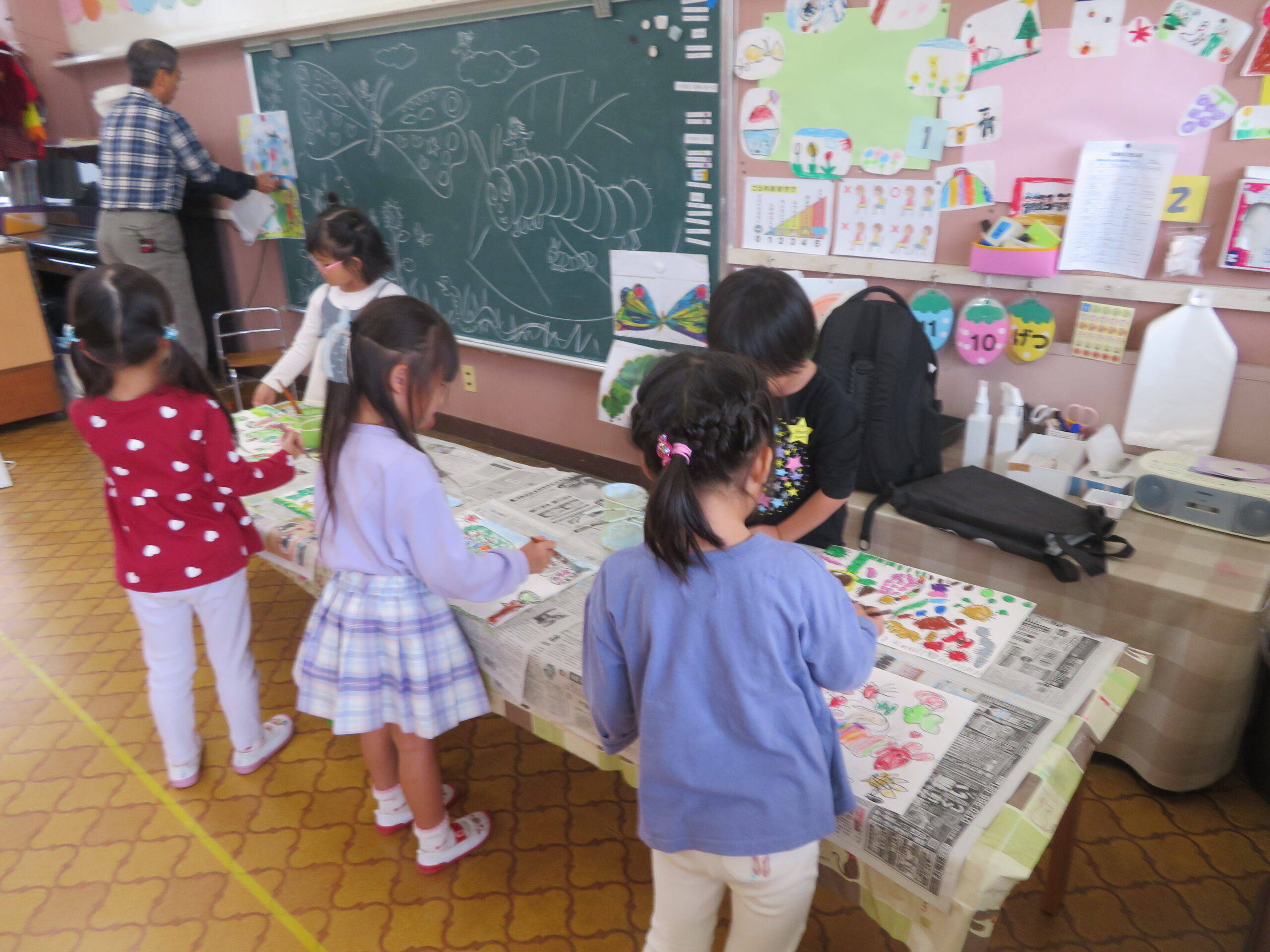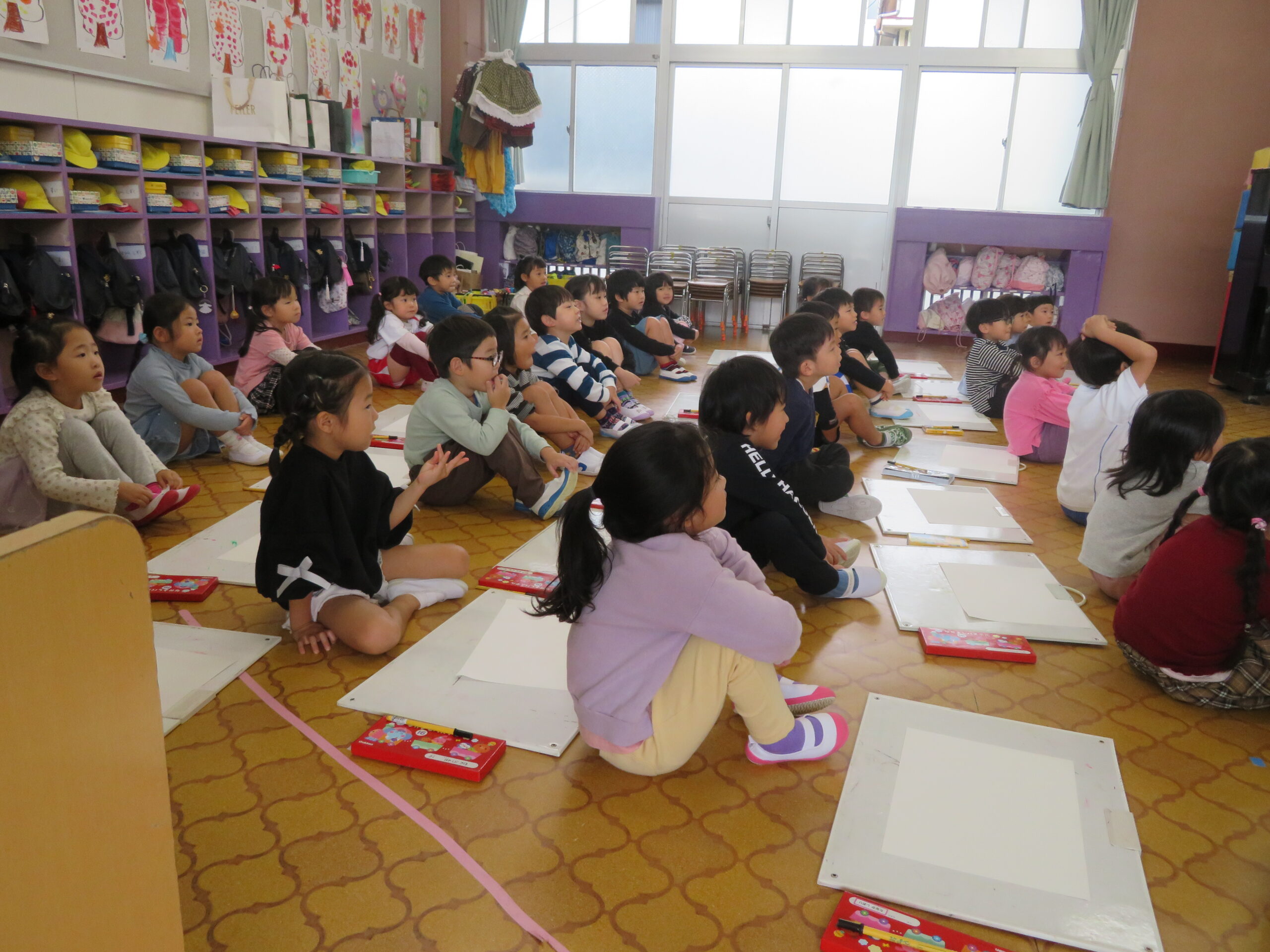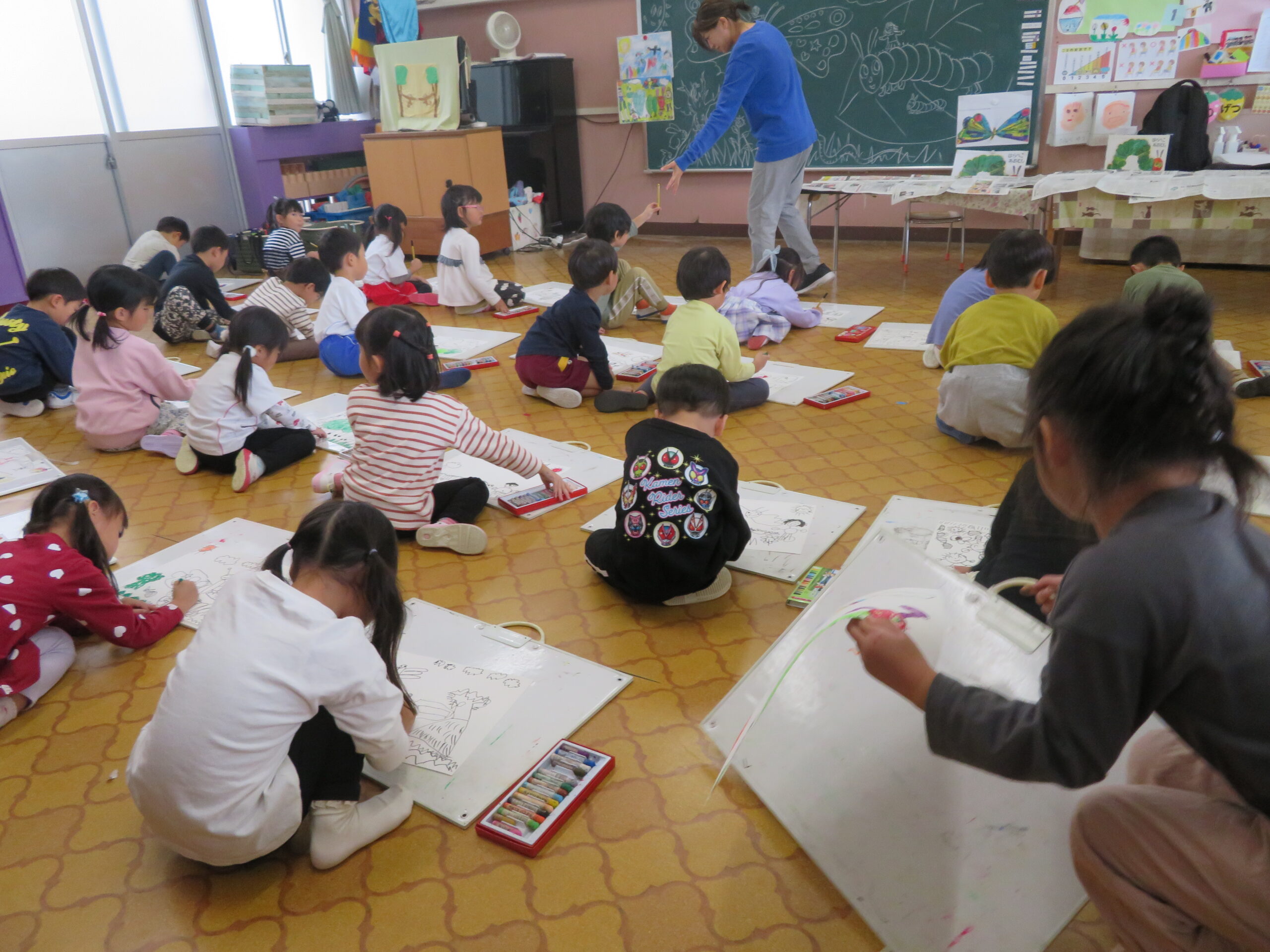第85回全国教育美術展鹿児島県地区審査に応募しました。おめでとうございます。その中で次の子どもたちが入選し、全国審査に応募します。特選 年長 太田陽翔、年中 川崎葵斗 、入選 年長 上谷洸太、福田智也、中山 尚、年中 七田ちづる、内村羽桜 。写真は、今日の年中さんの絵画指導の様子です。