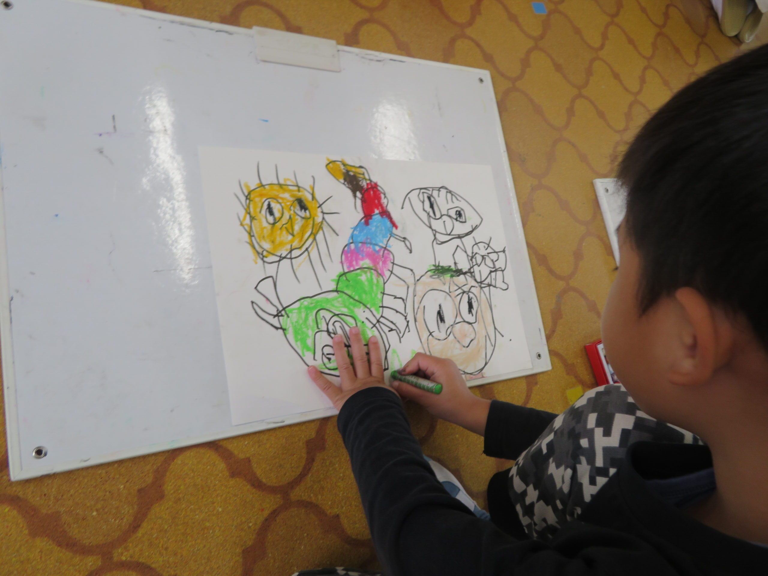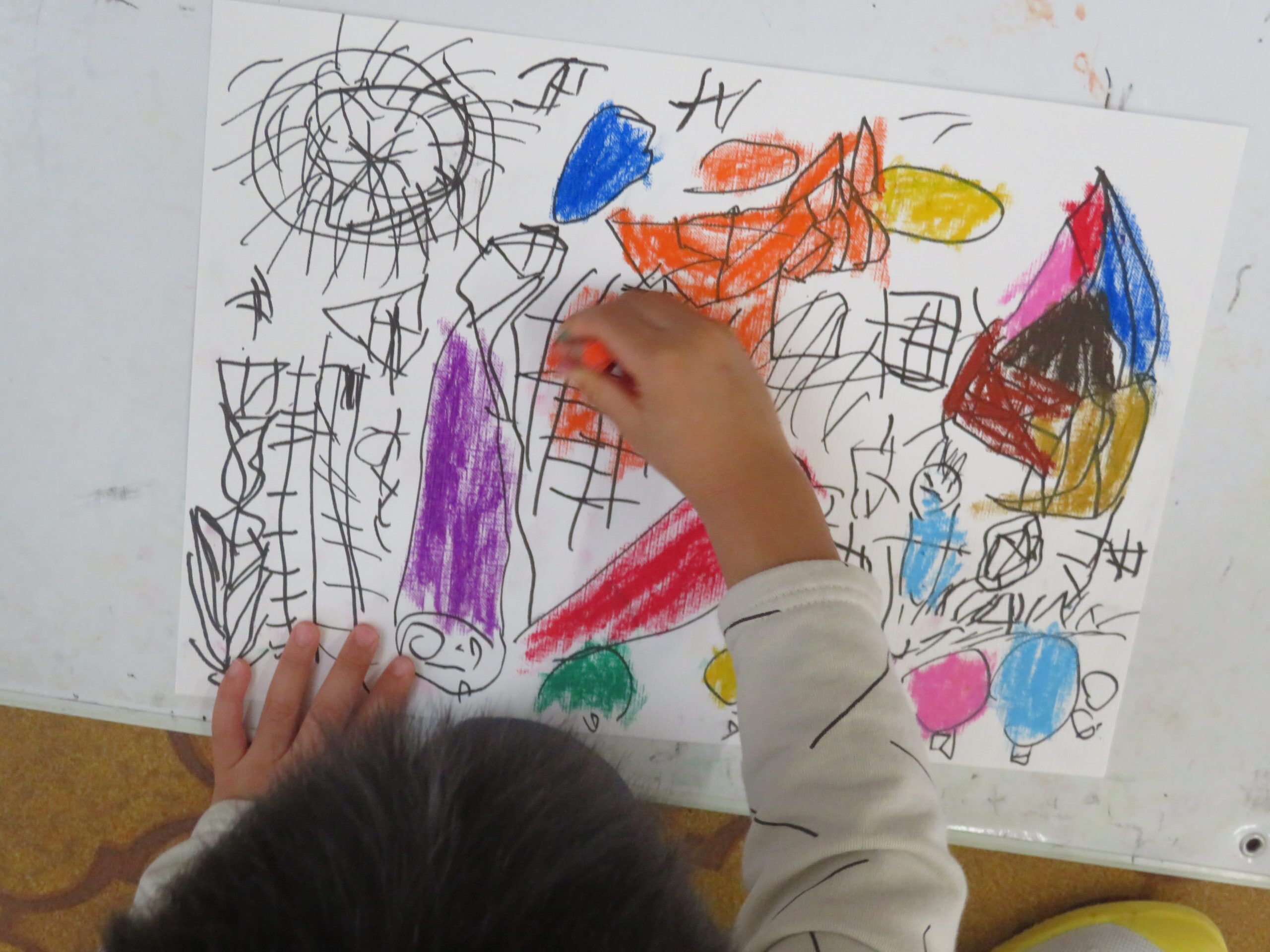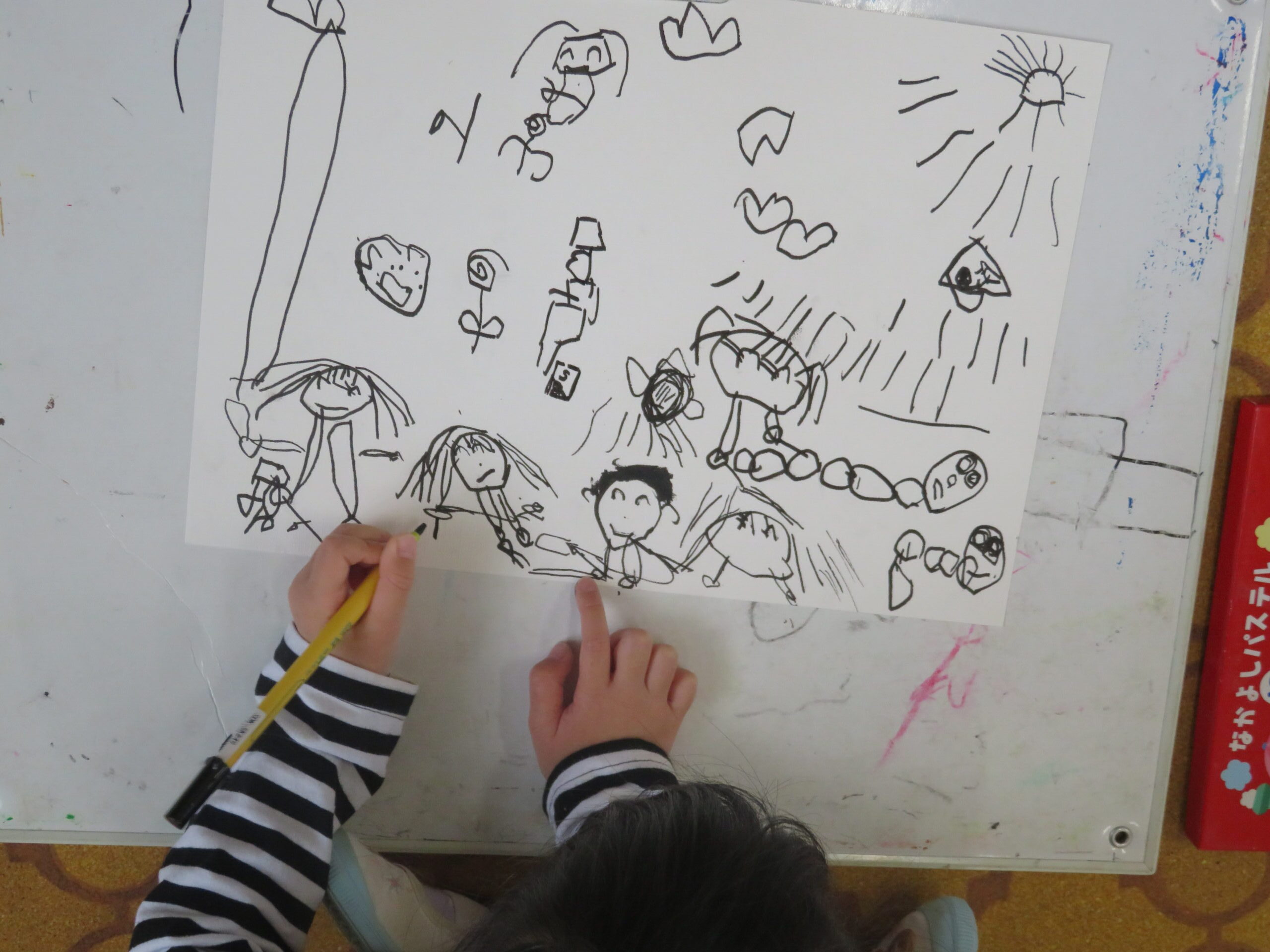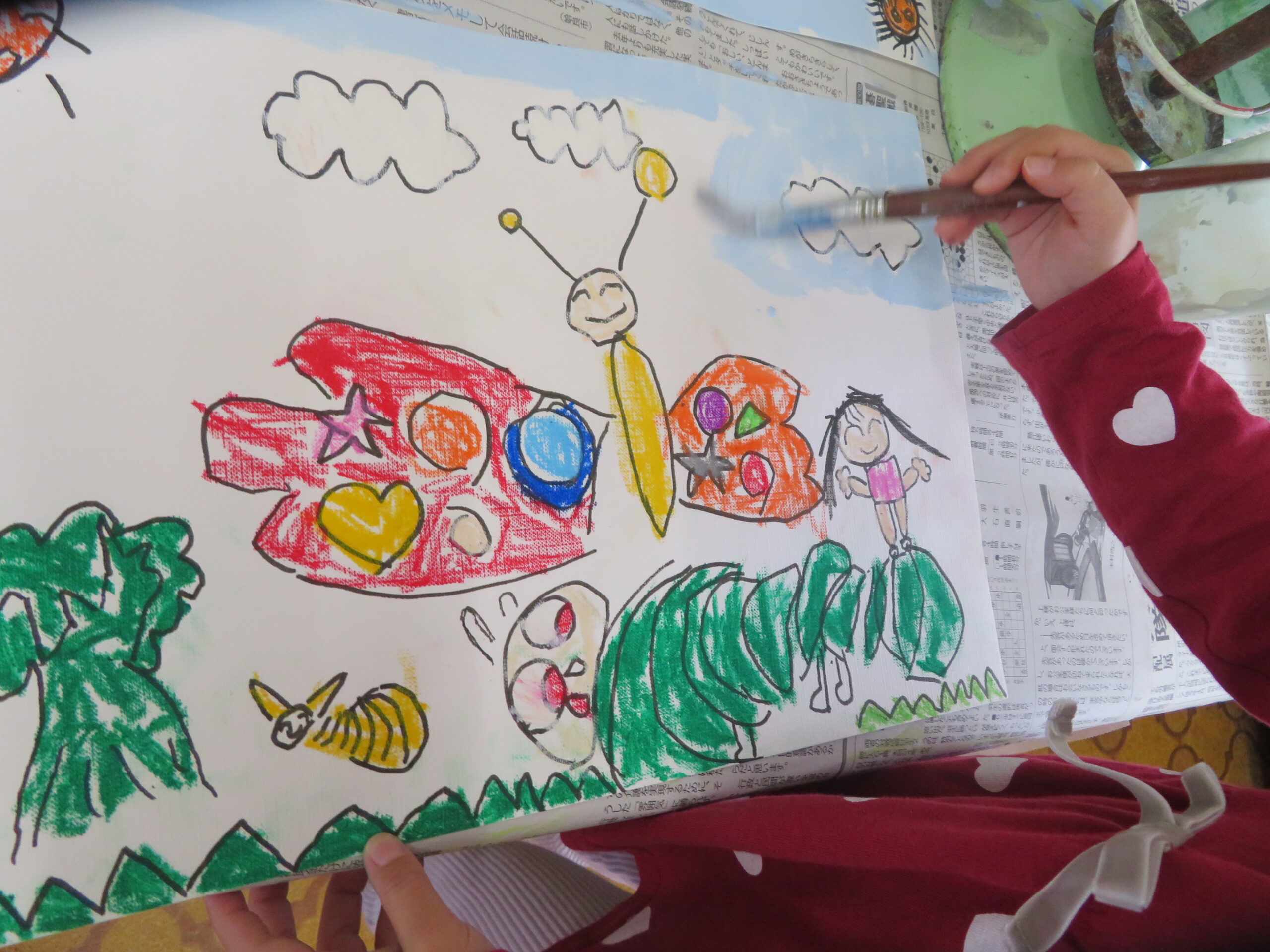 第85回全国教育美術展鹿児島県地区審査に応募しました。おめでとうございます。その中で次の子どもたちが入選し、全国審査に応募します。特選 年長 太田陽翔、年中 川崎葵斗 、入選 年長 上谷洸太、福田智也、中山 尚、年中 七田ちづる、内村羽桜 。写真は、今日の年中さんの絵画指導の様子です。