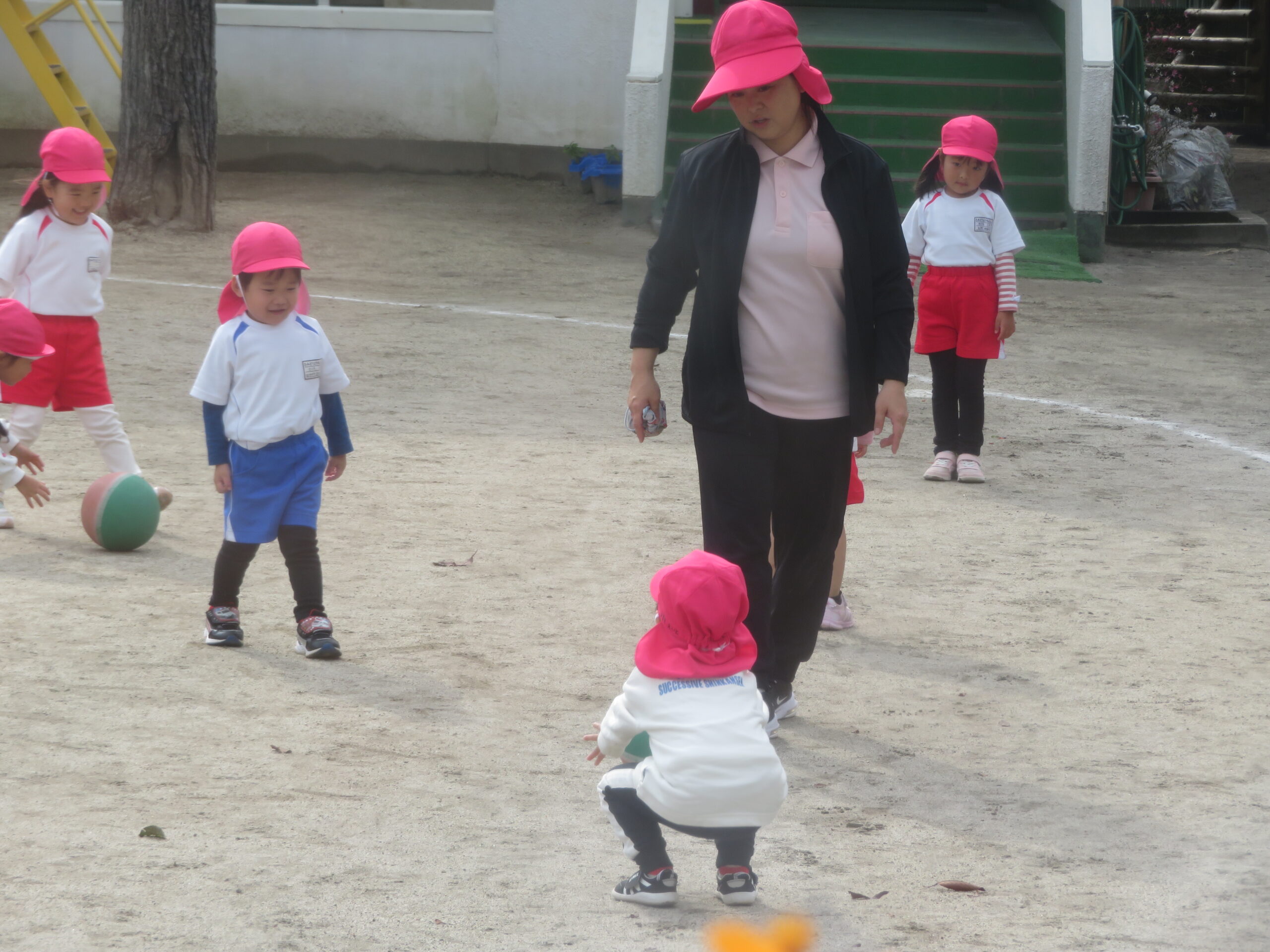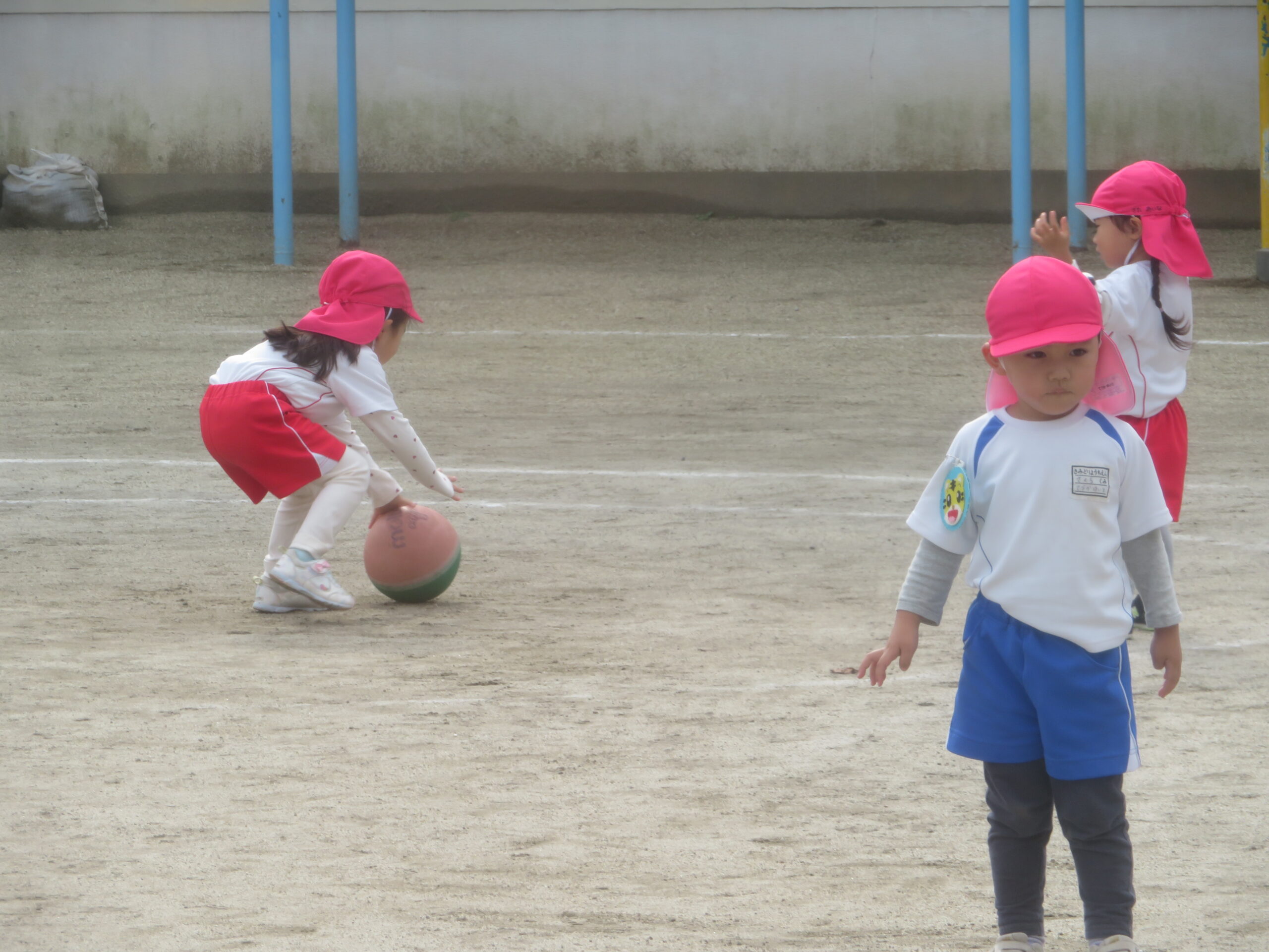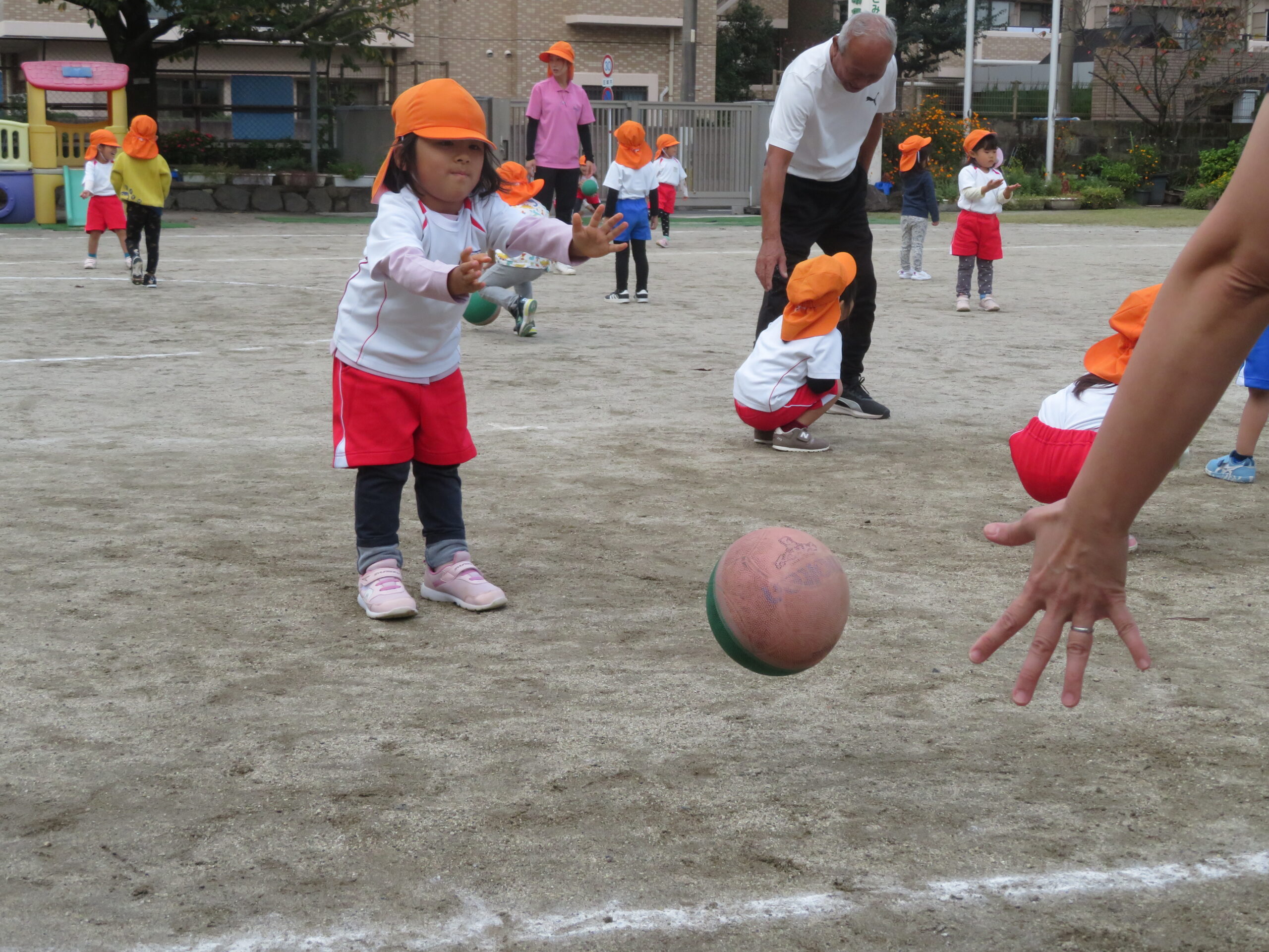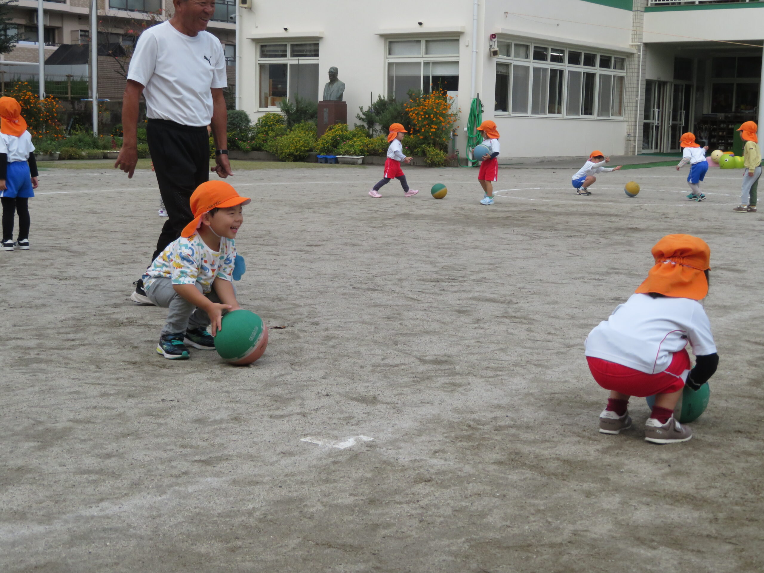 11月17日(月)年少さんのボール遊びの運動がありました。大きなボールを二人向かい合って転がす運動です。両手で相手をめがけて転がし、相手はボールをつかみます。上手になると二人の距離を長くして転がします。