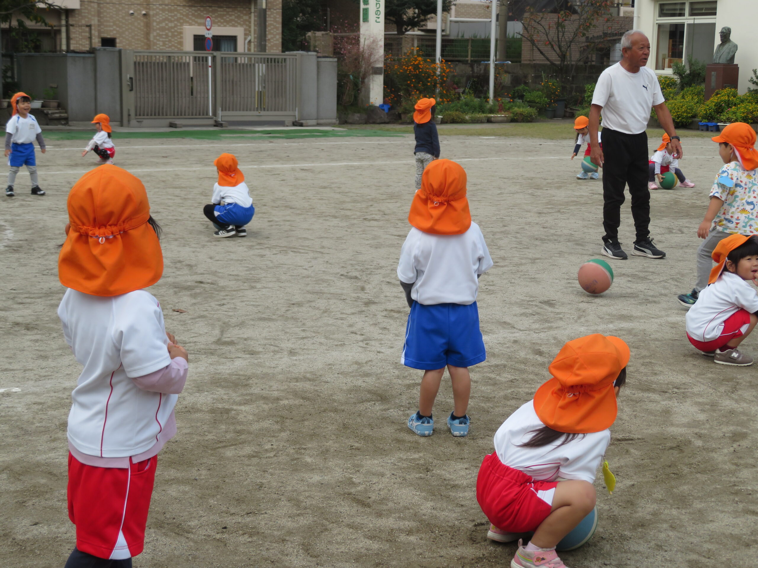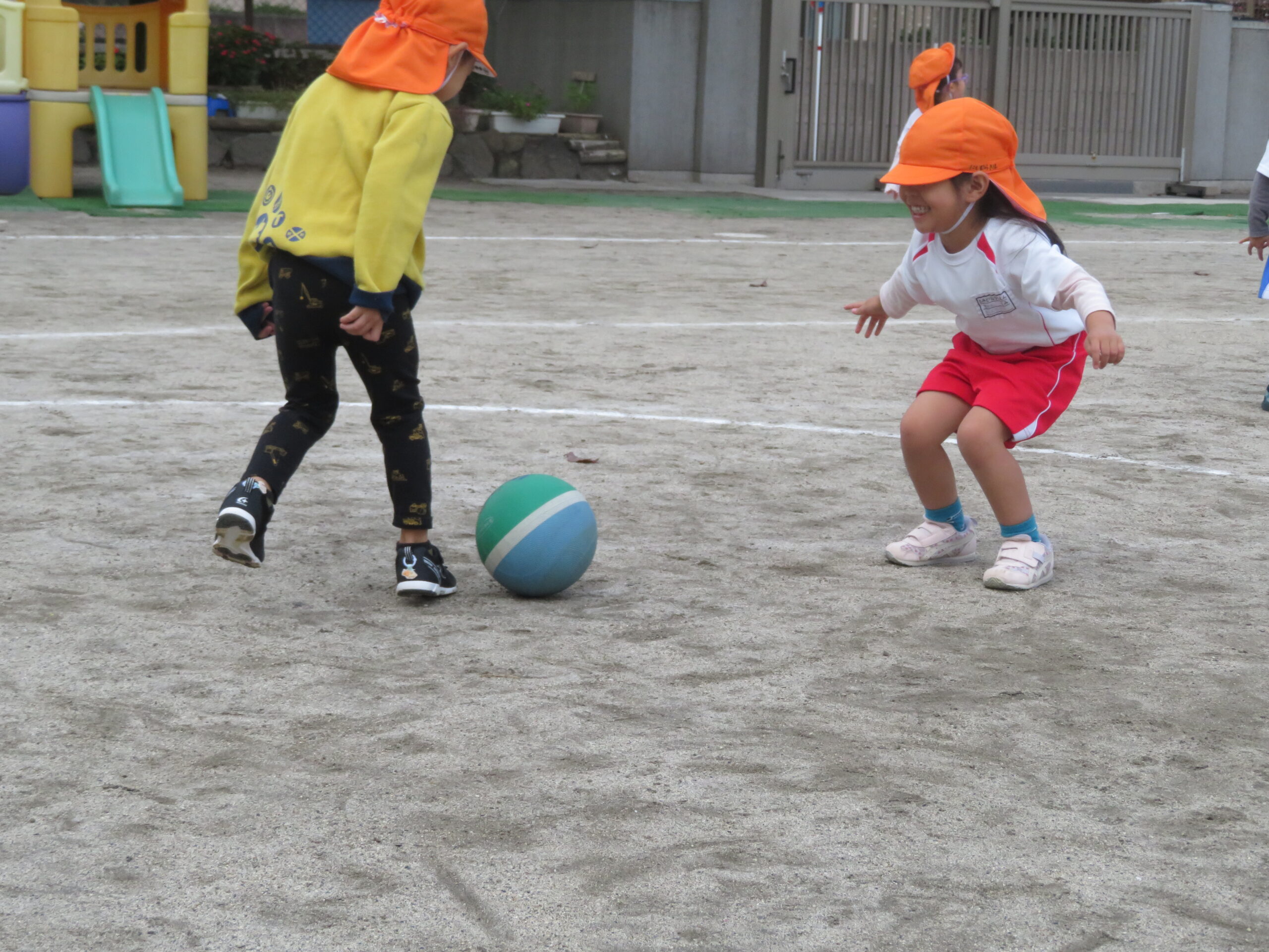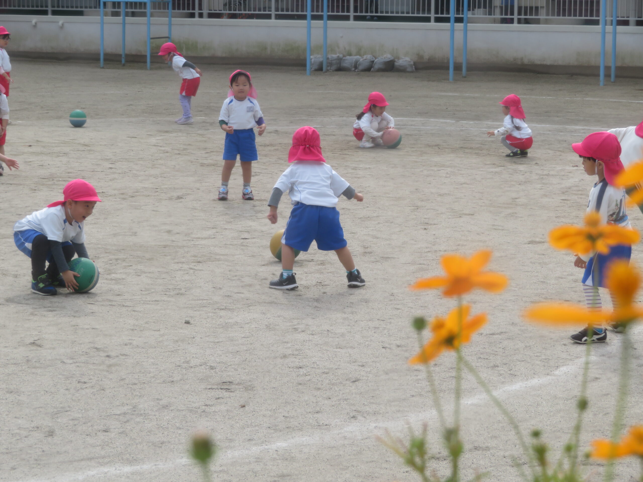 11月17日(月)年少さんのボール遊びの運動がありました。大きなボールを二人向かい合って転がす運動です。両手で相手をめがけて転がし、相手はボールをつかみます。上手になると二人の距離を長くして転がします。